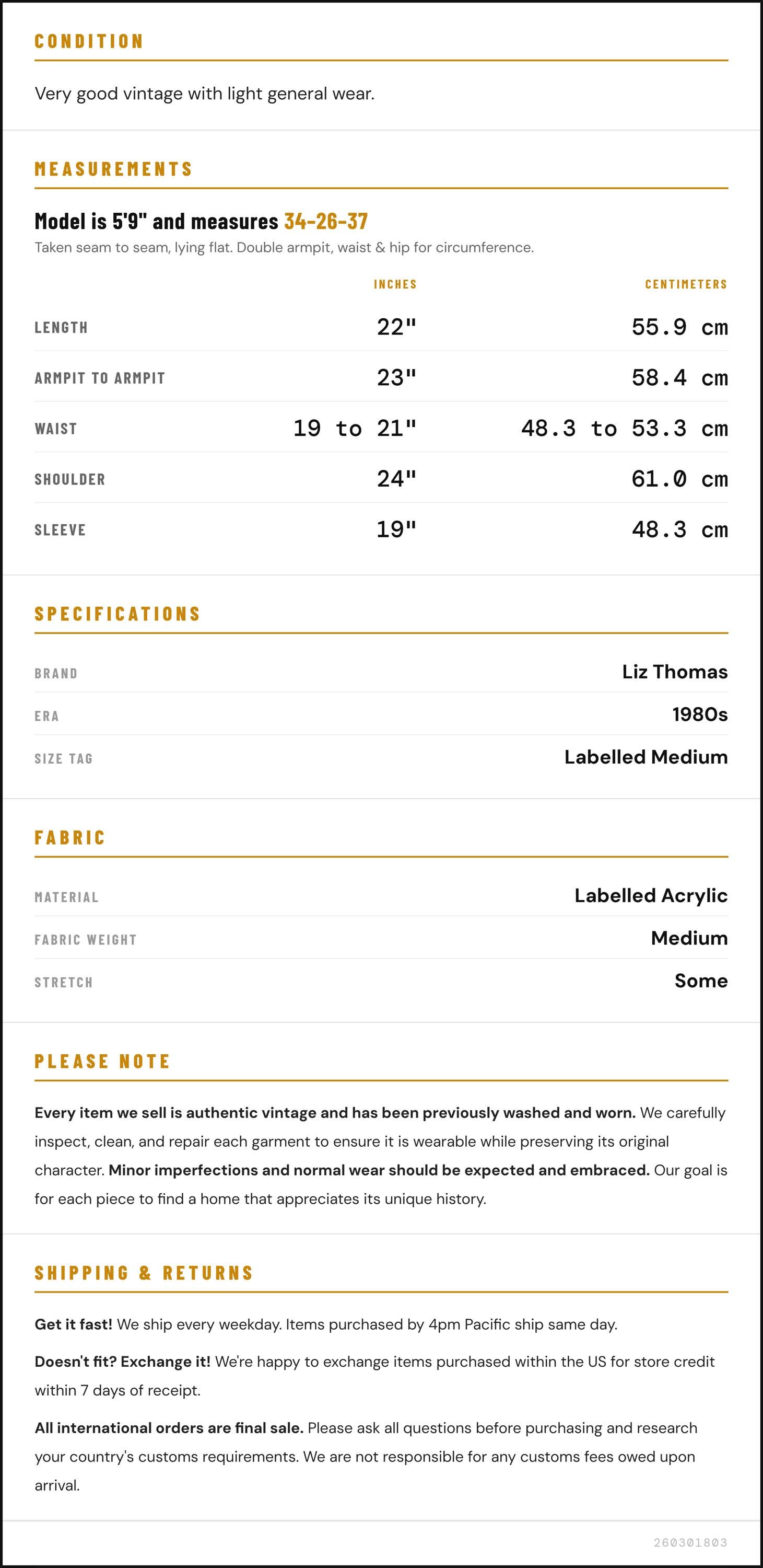 ✨ Please see measurements and condition below. Every garment we sell is authentic vintage and one-of-a-kind! You will receive the exact item photographed.