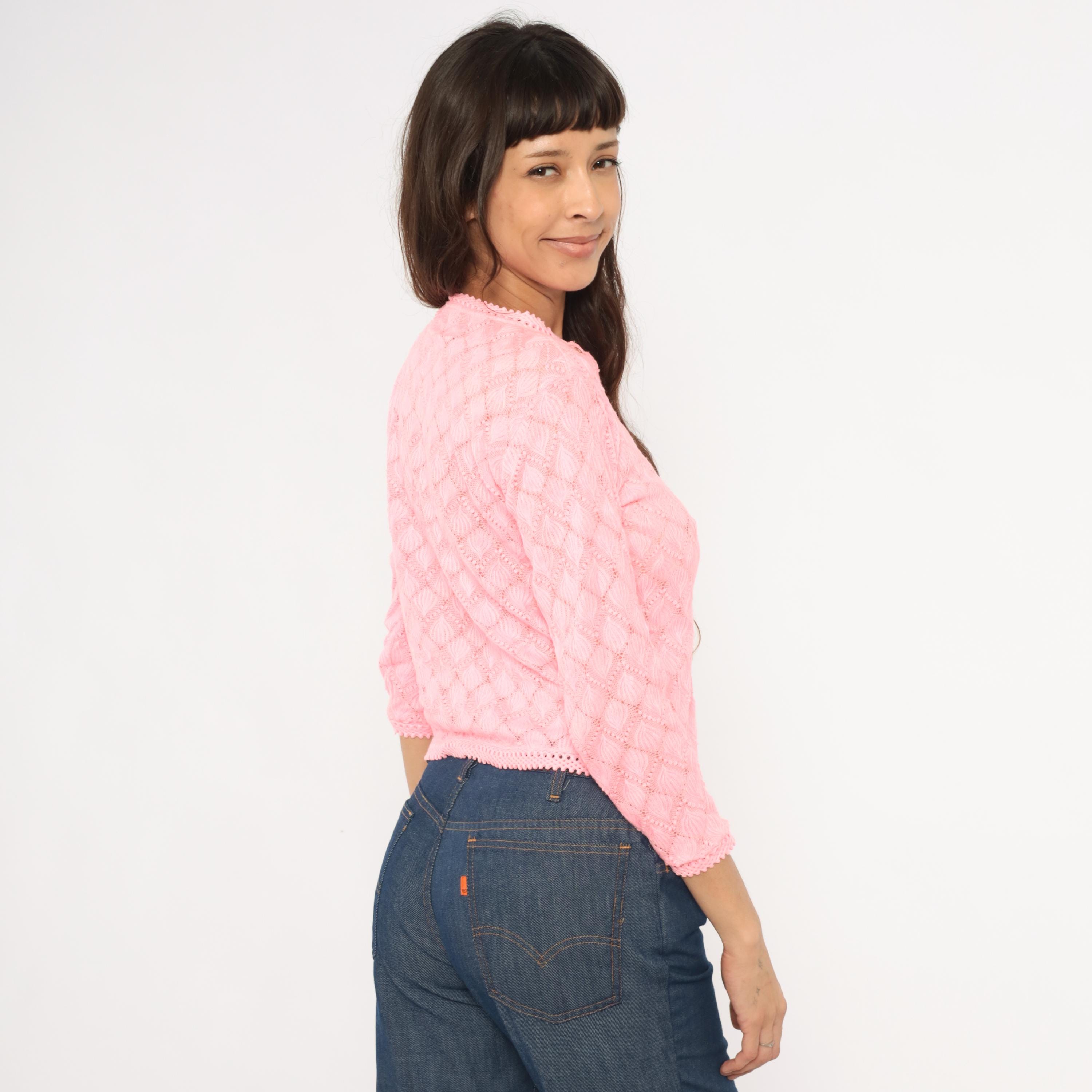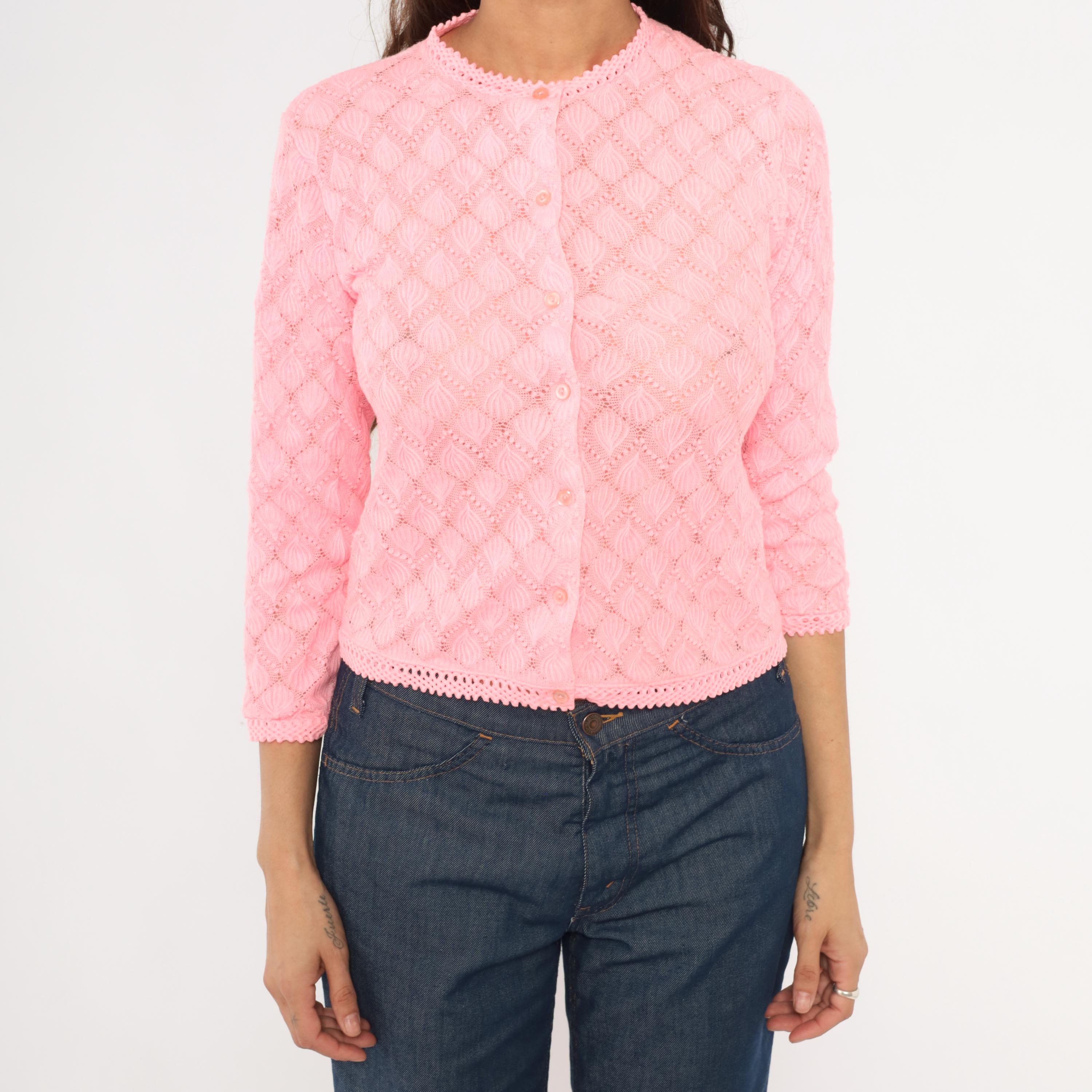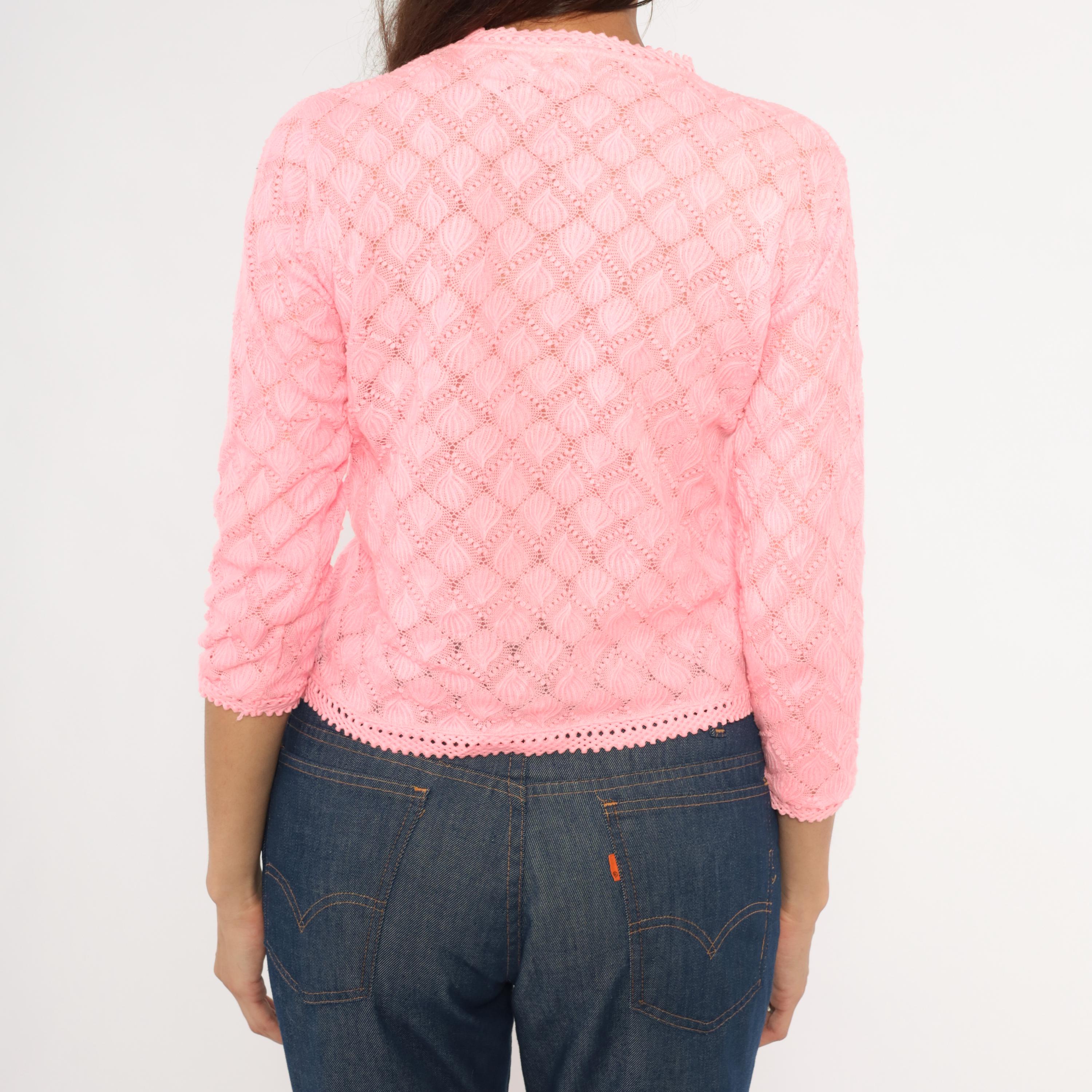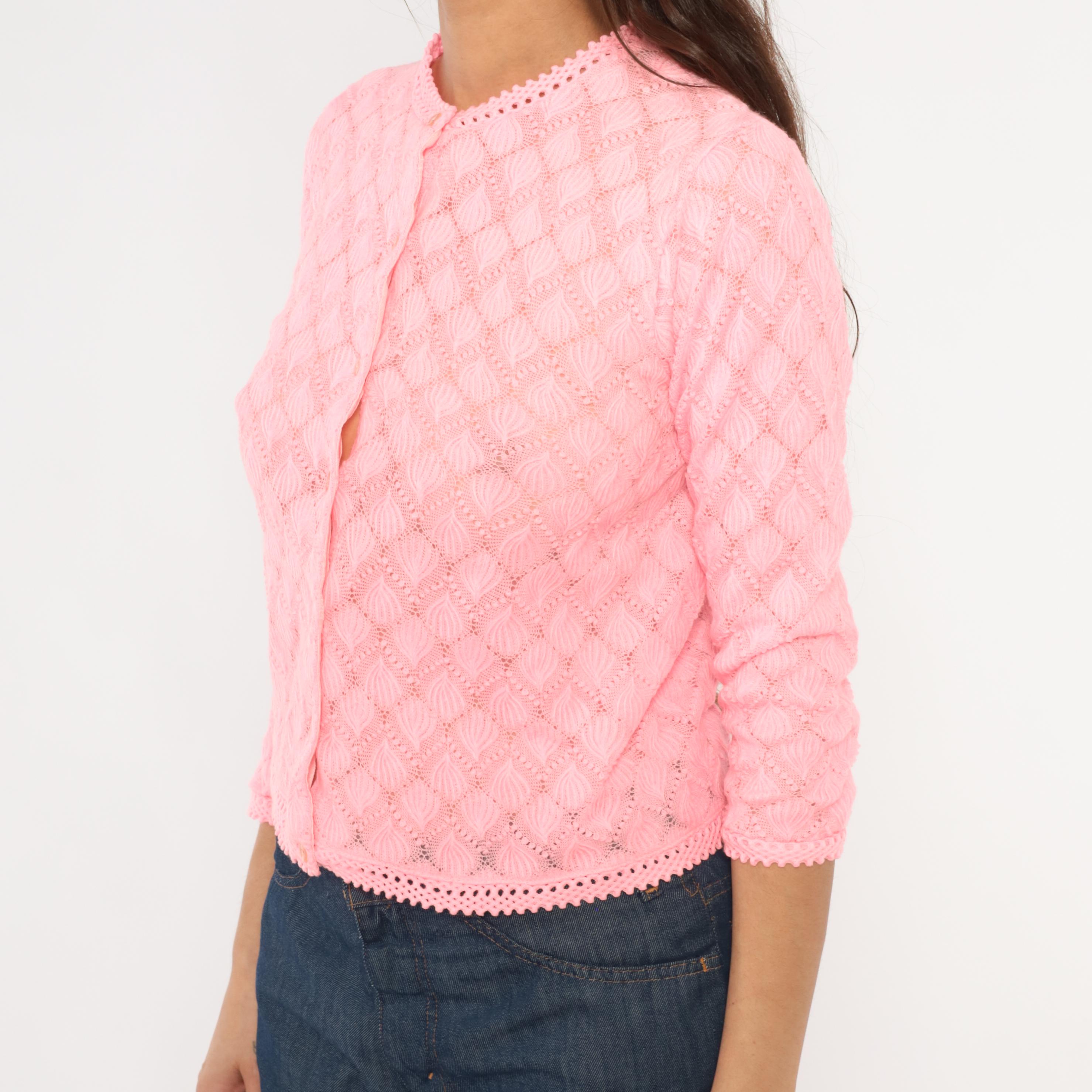 70s pink pointelle cardigan with an allover diamond-shaped leaf motif in open lace knit, button front closure with small round buttons, and a crew neckline with scalloped edging. Three-quarter length sleeves with scalloped cuffs and a matching scalloped hem band.