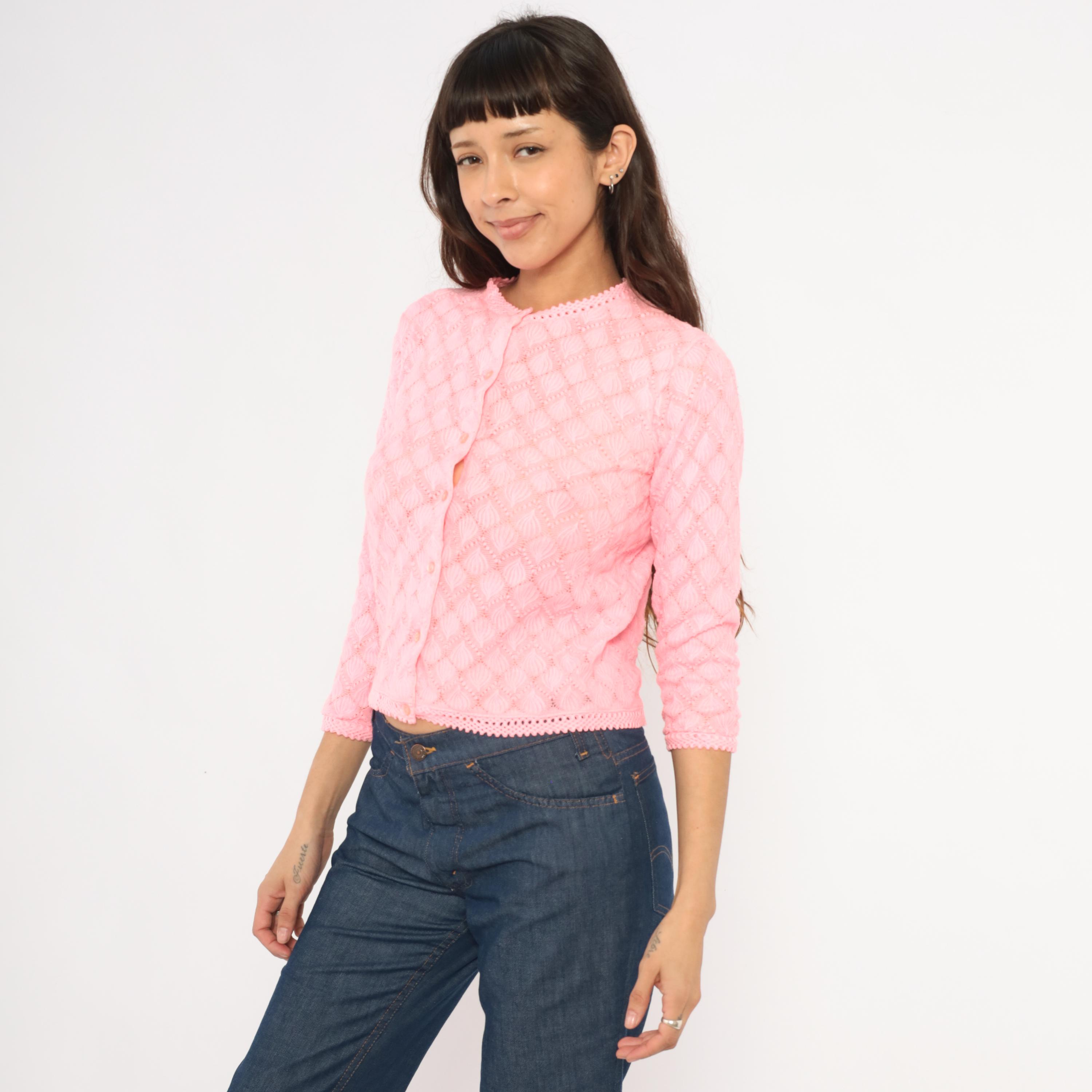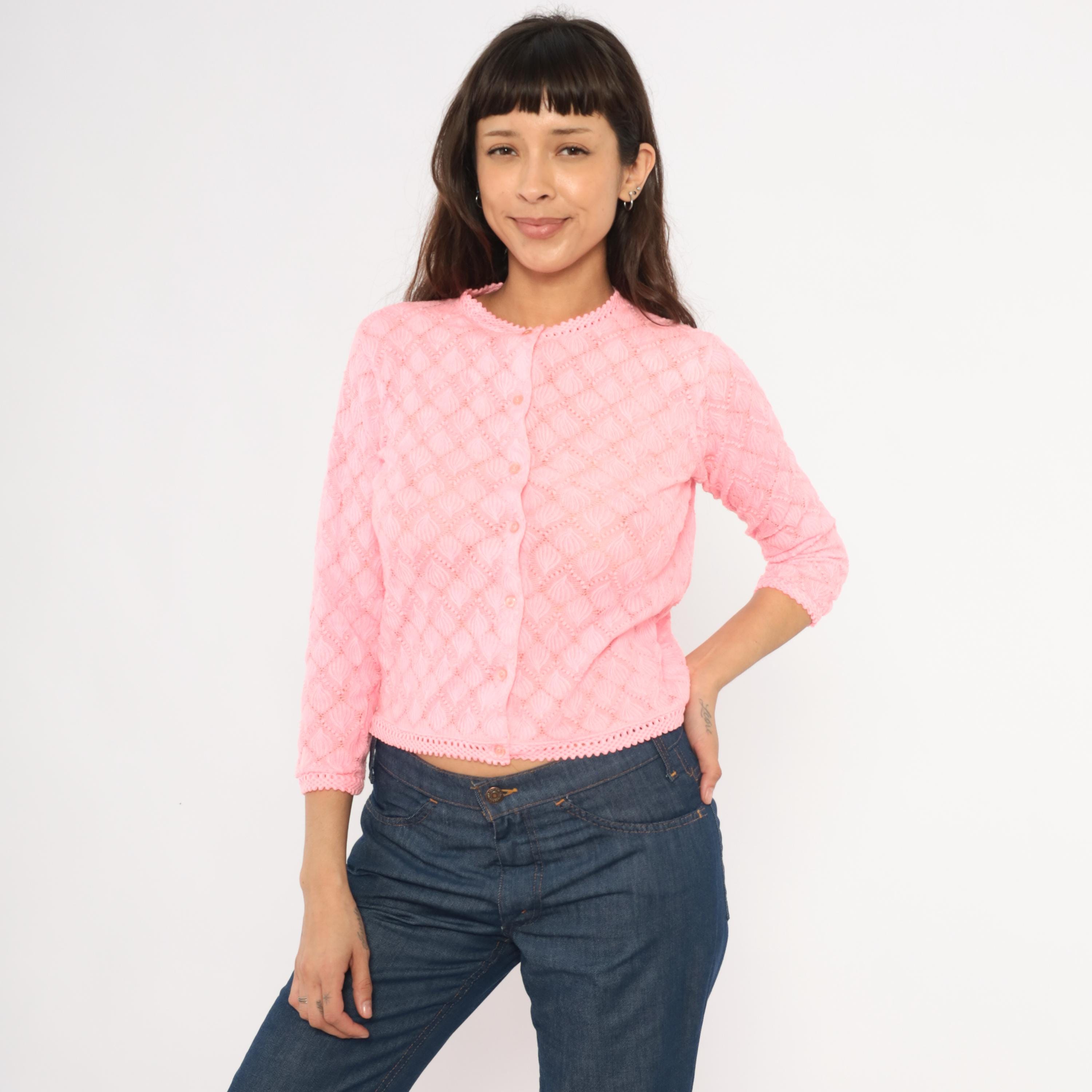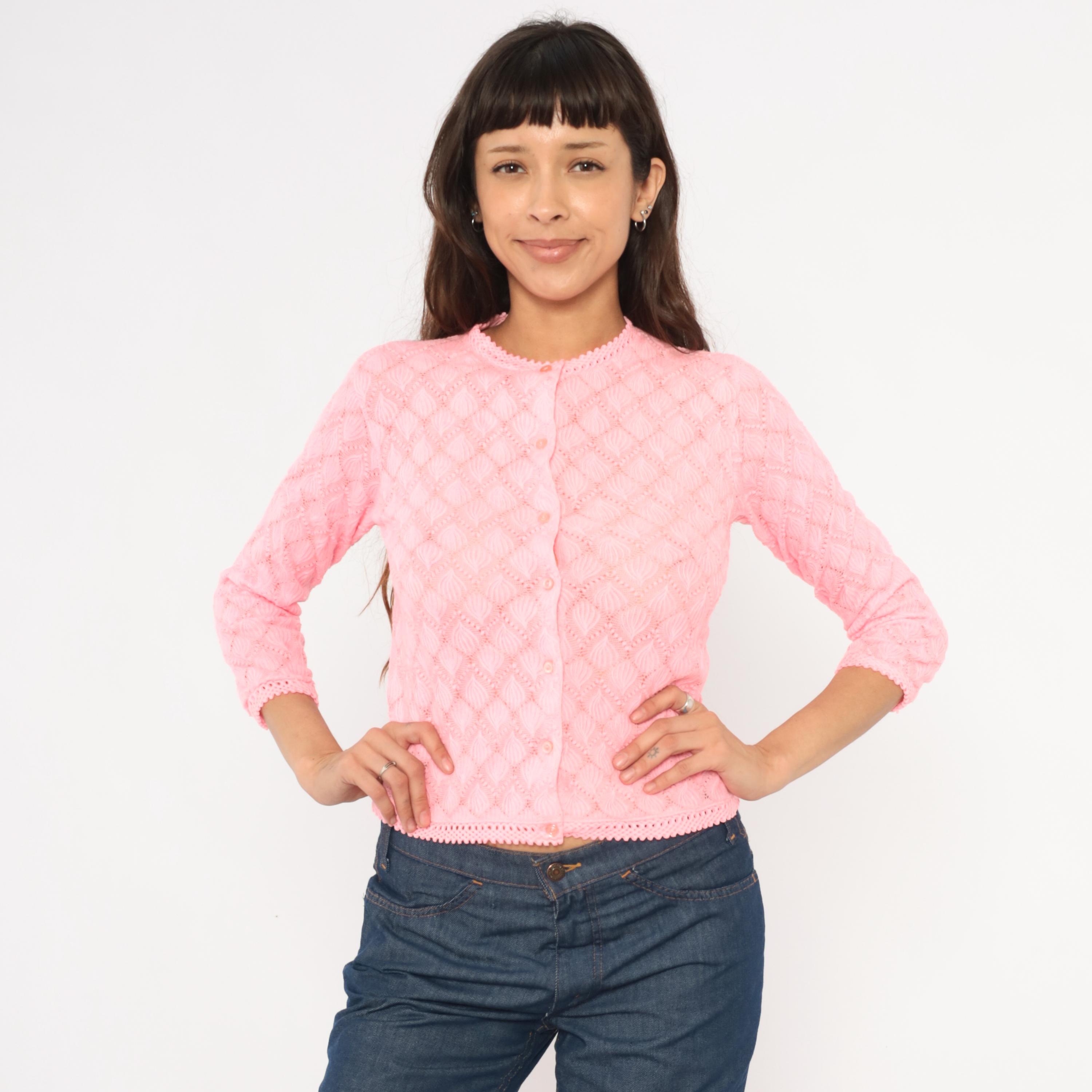 70s pink pointelle cardigan with an allover diamond-shaped leaf motif in open lace knit, button front closure with small round buttons, and a crew neckline with scalloped edging. Three-quarter length sleeves with scalloped cuffs and a matching scalloped hem band.
