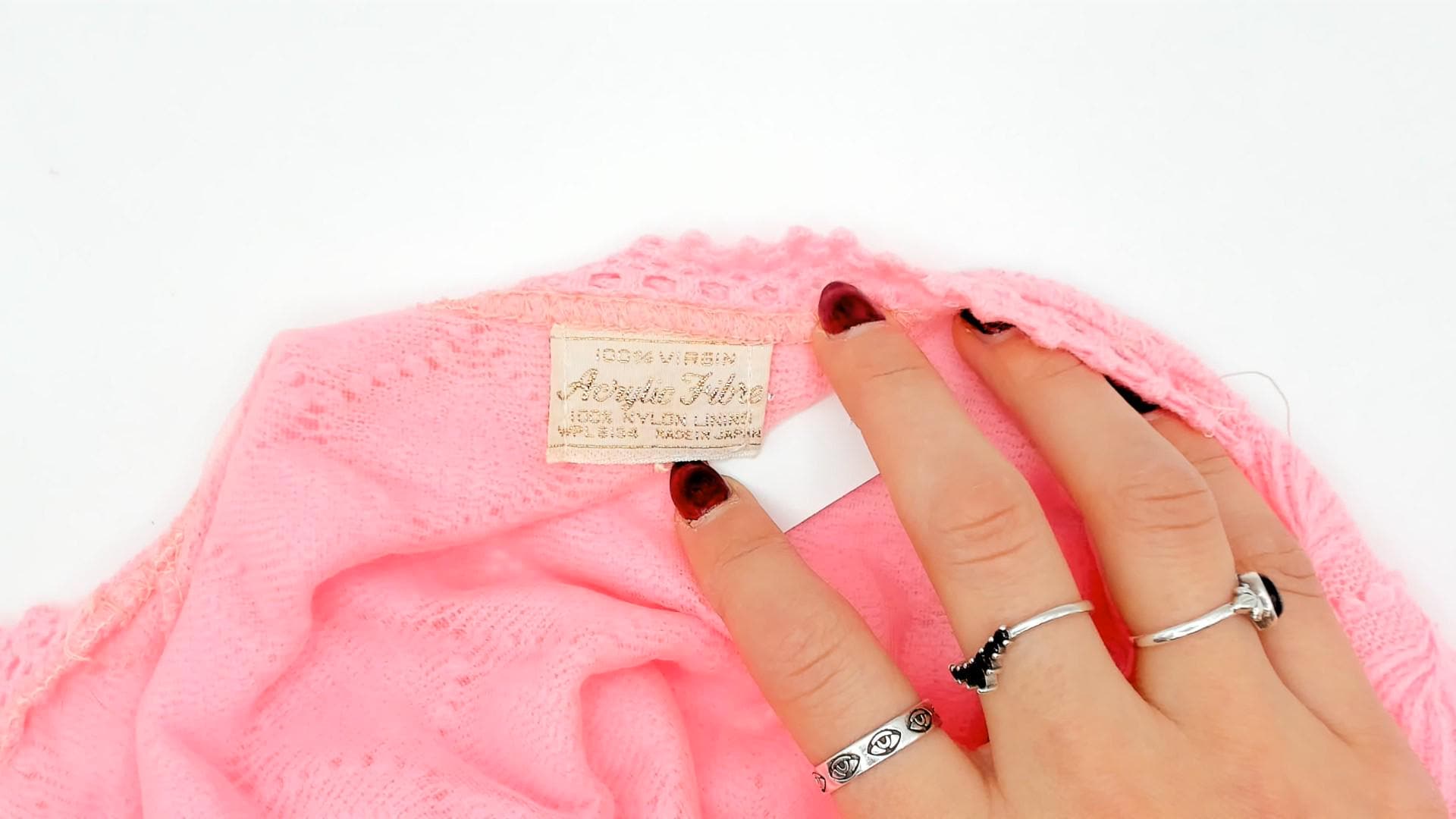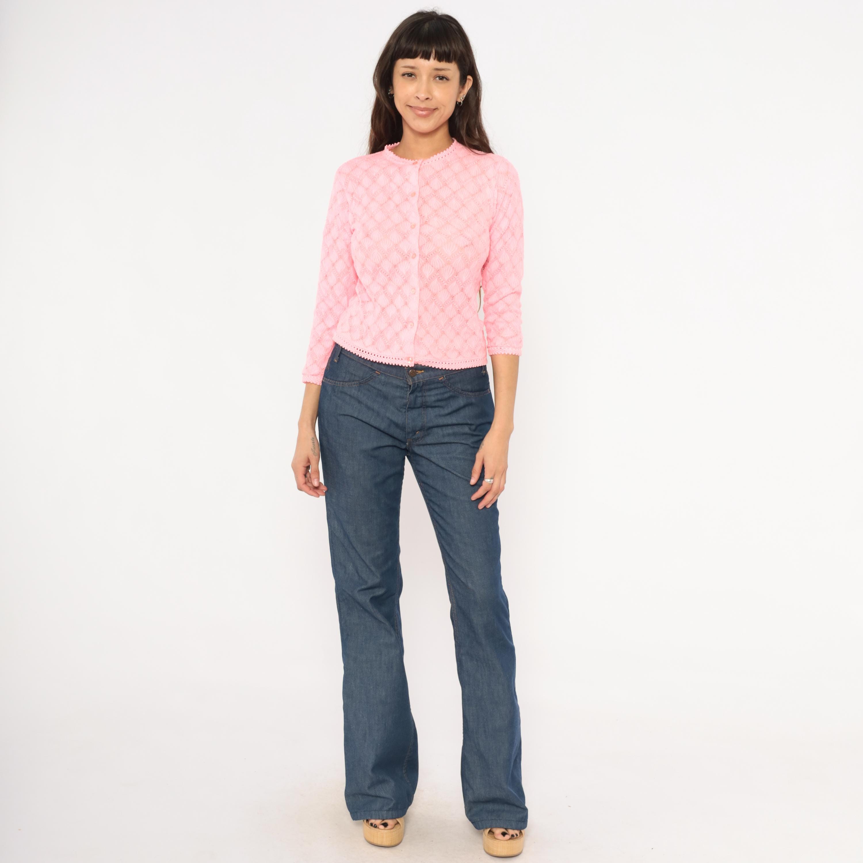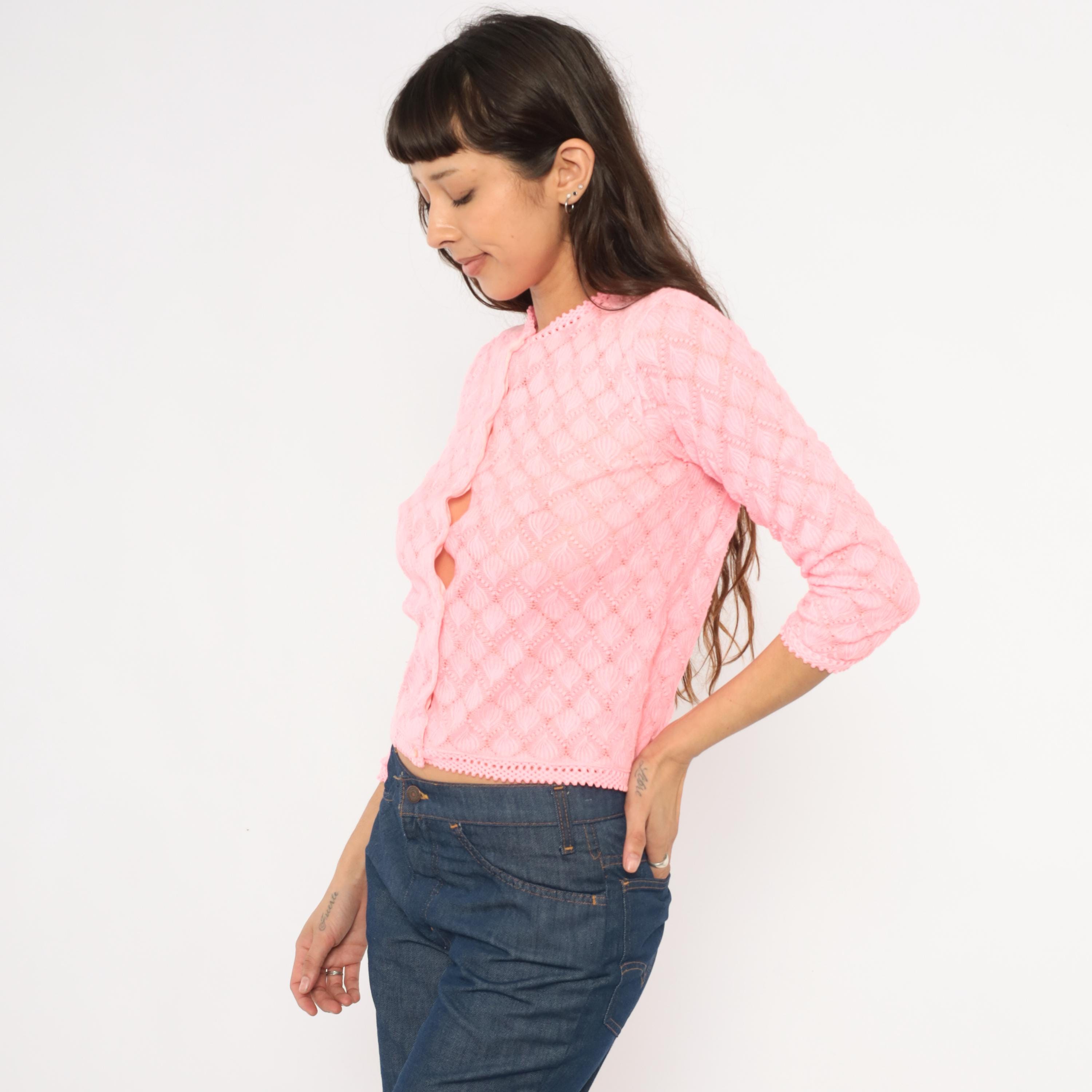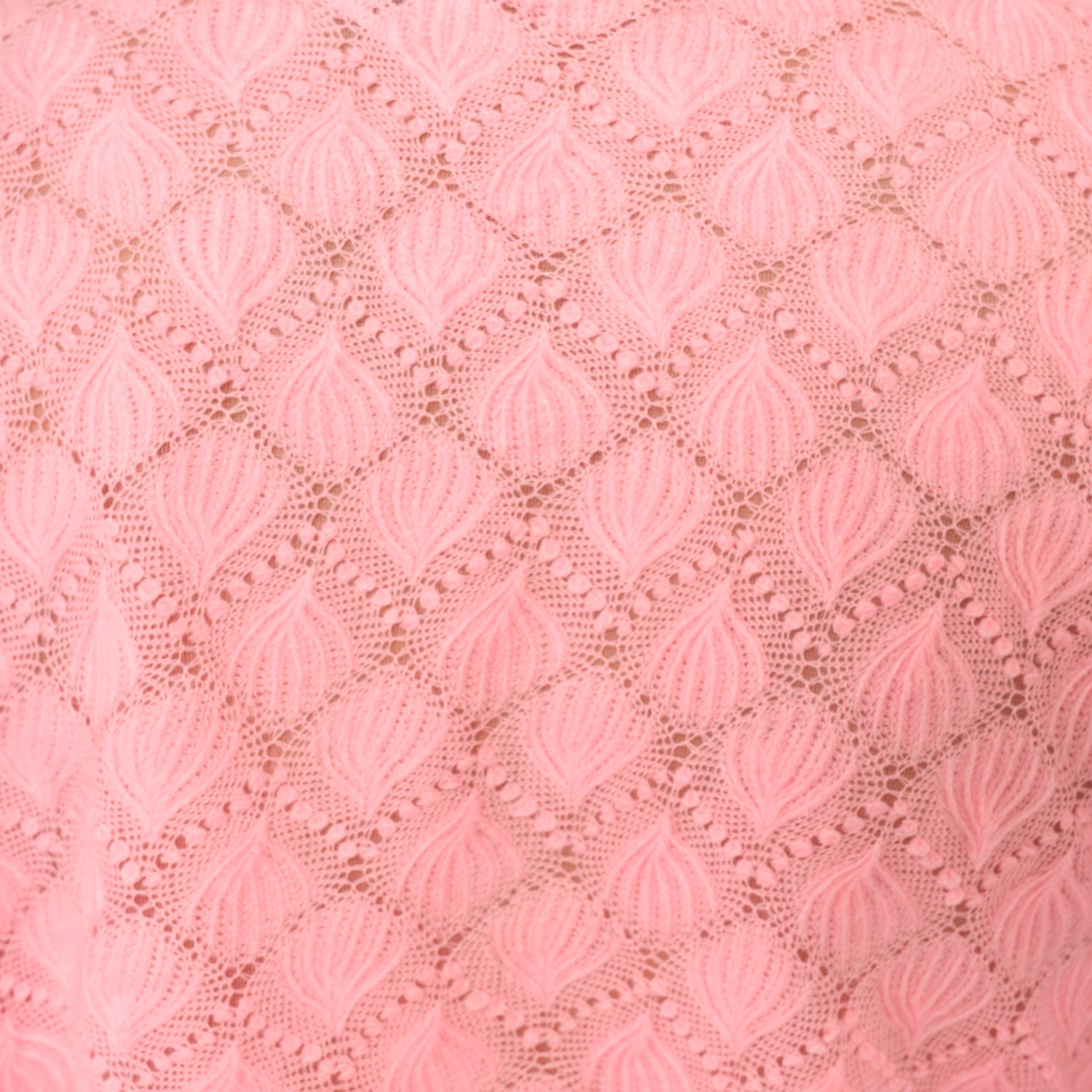 70s pink pointelle cardigan with an allover diamond-shaped leaf motif in open lace knit, button front closure with small round buttons, and a crew neckline with scalloped edging. Three-quarter length sleeves with scalloped cuffs and a matching scalloped hem band.