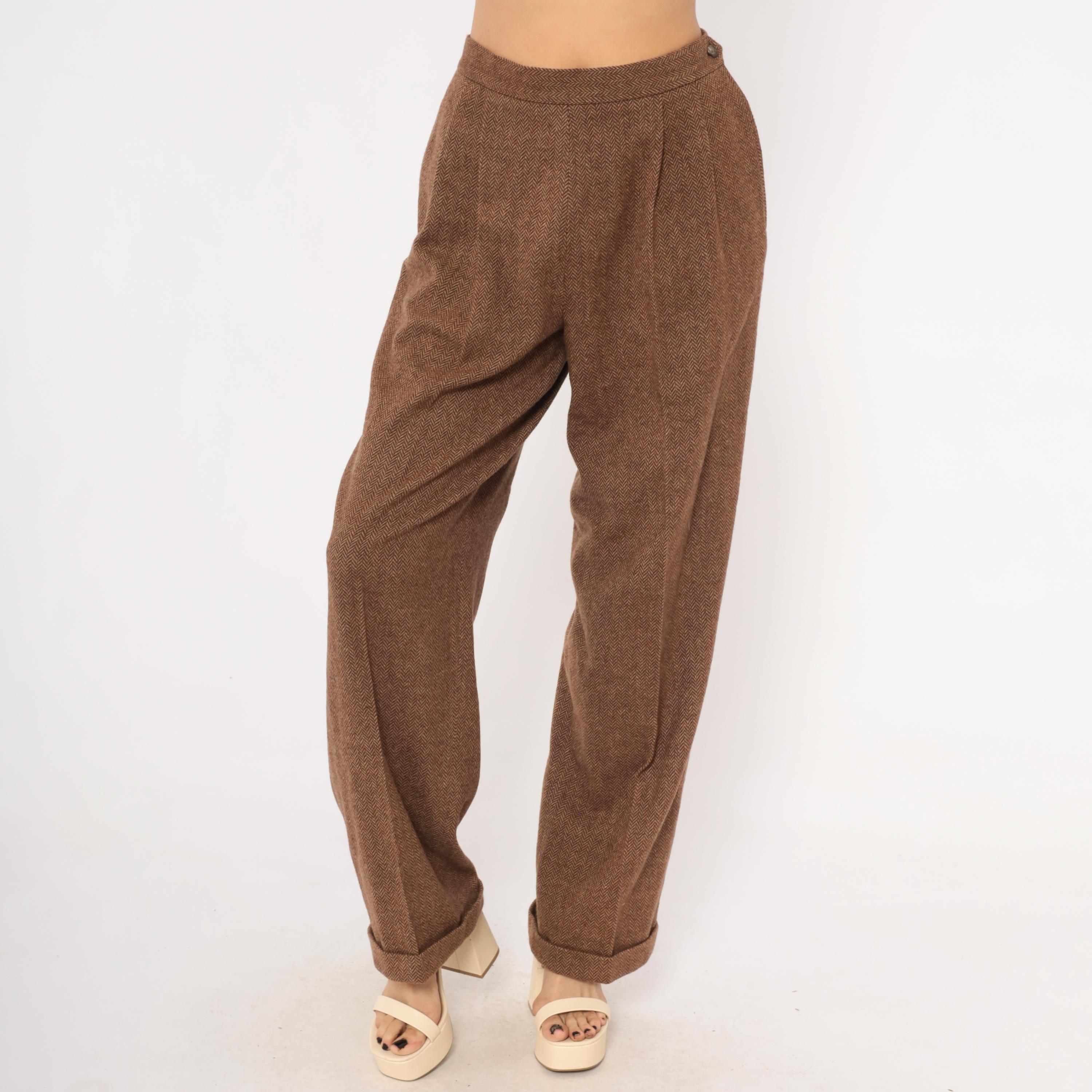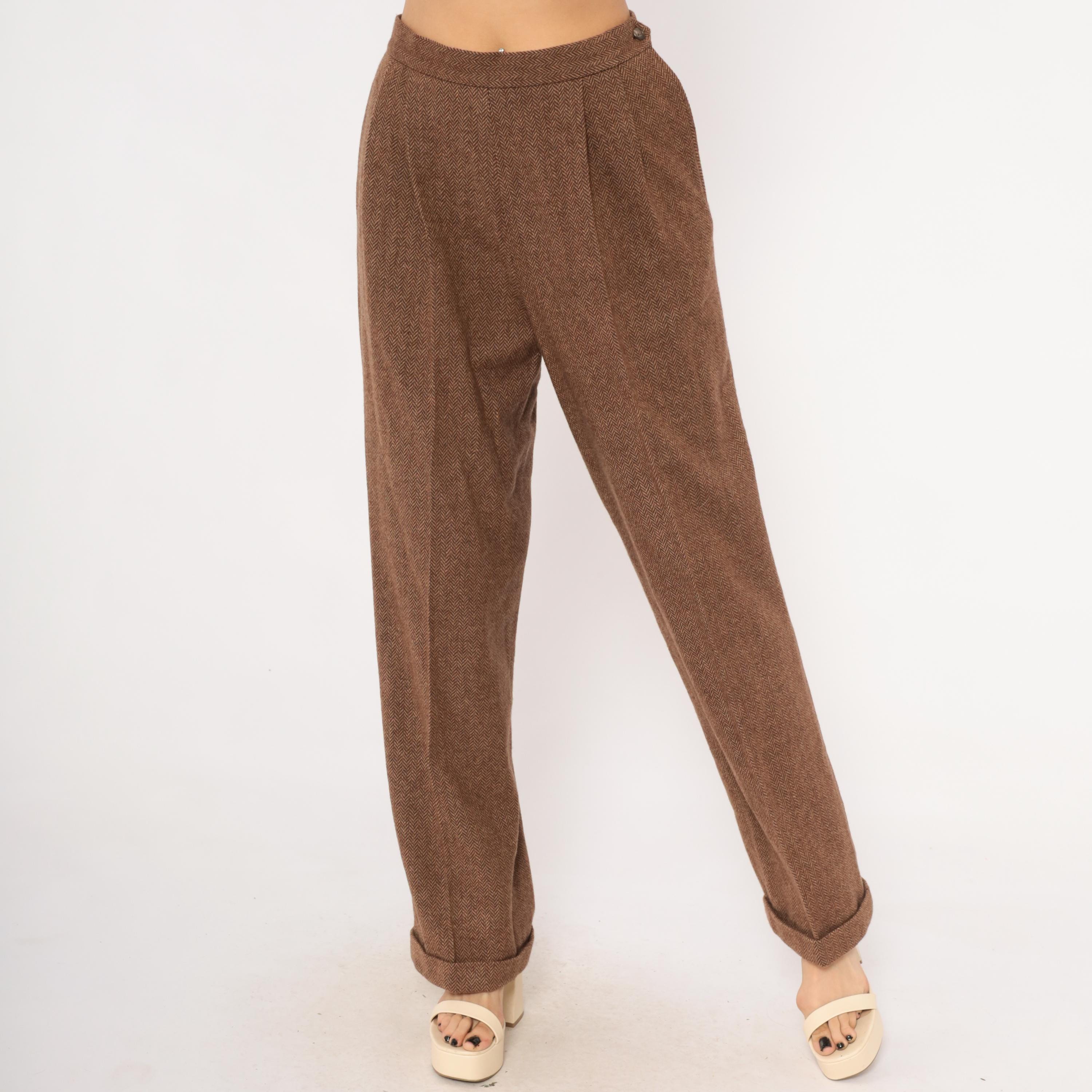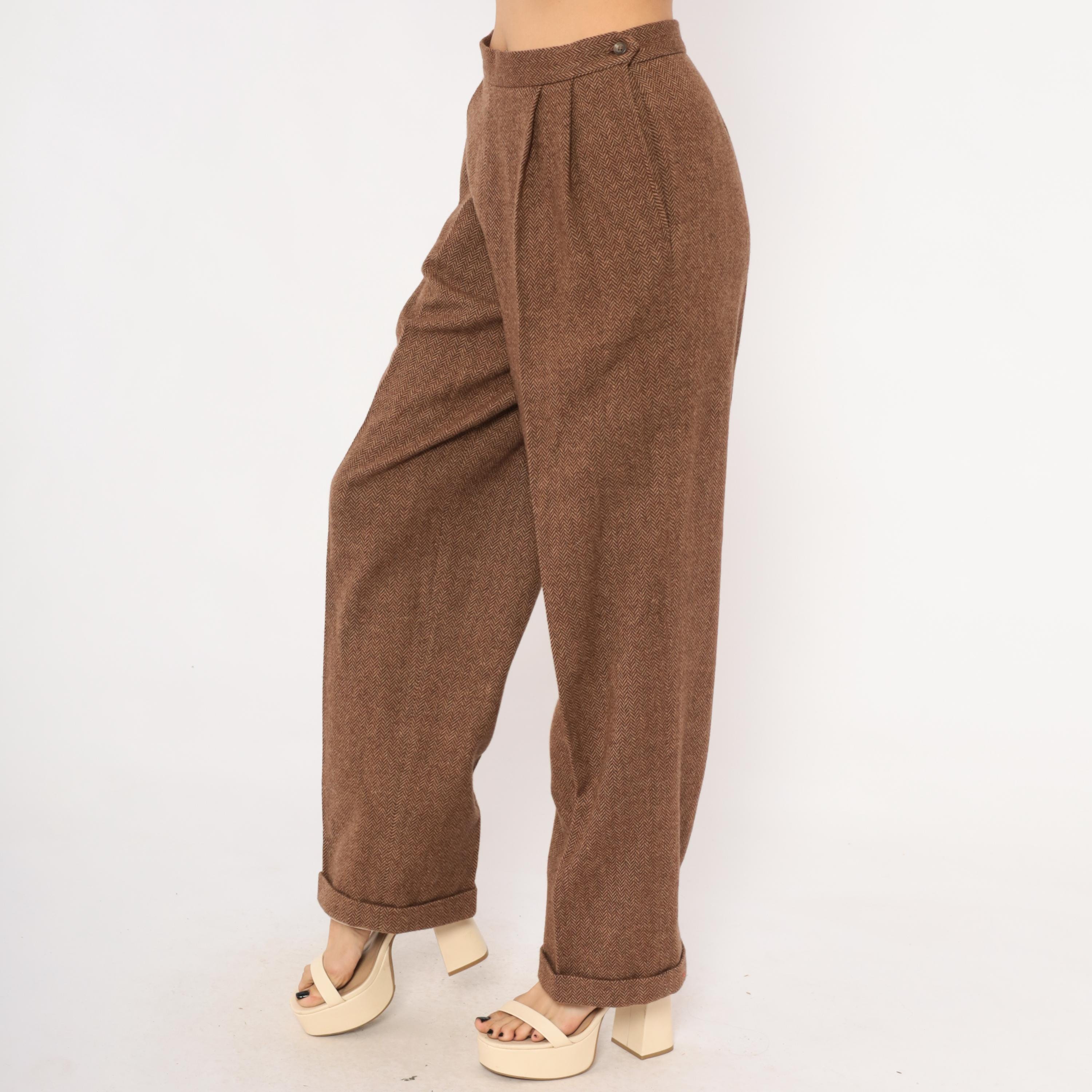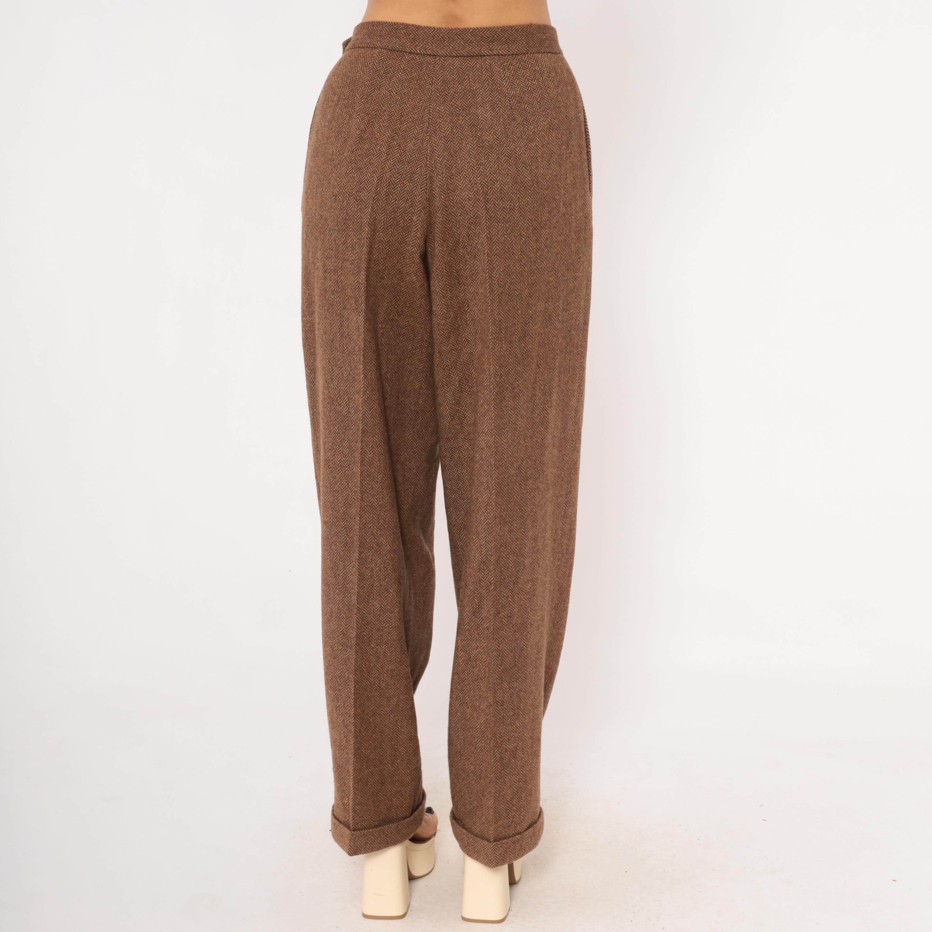 90s Ralph Lauren herringbone wool trousers in brown and tan with front pleats and a high waist. Side zipper closure, side seam pockets, and cuffed hems. Straight tapered leg with a center crease down each leg.