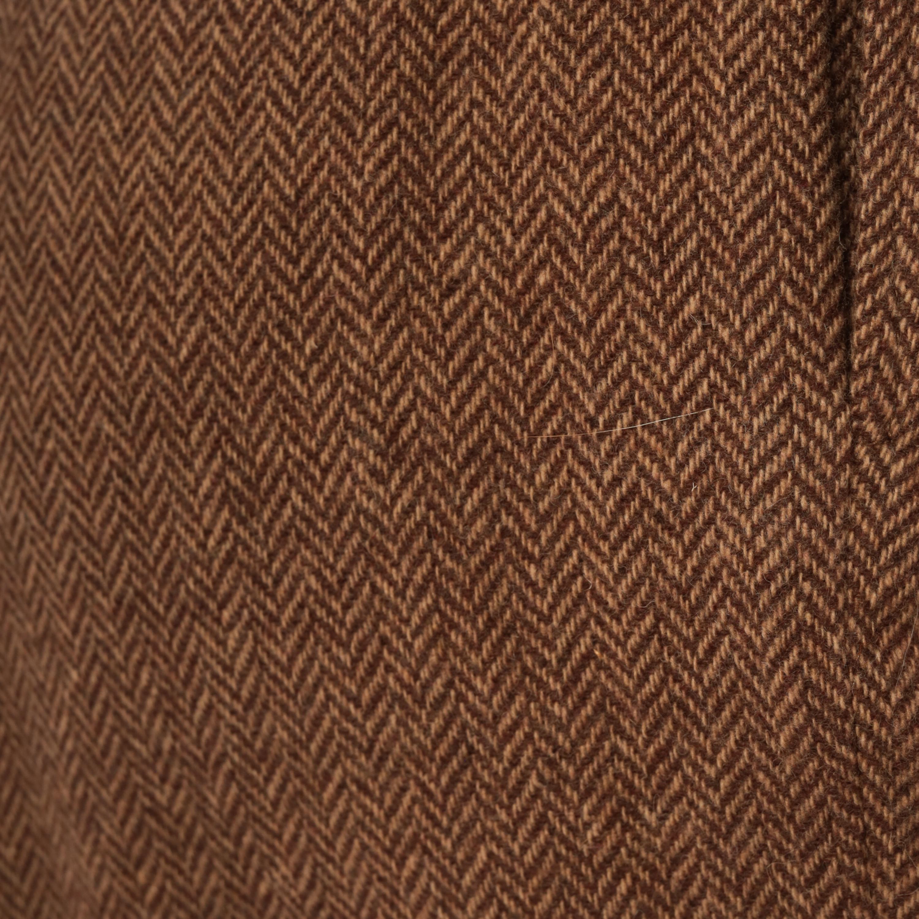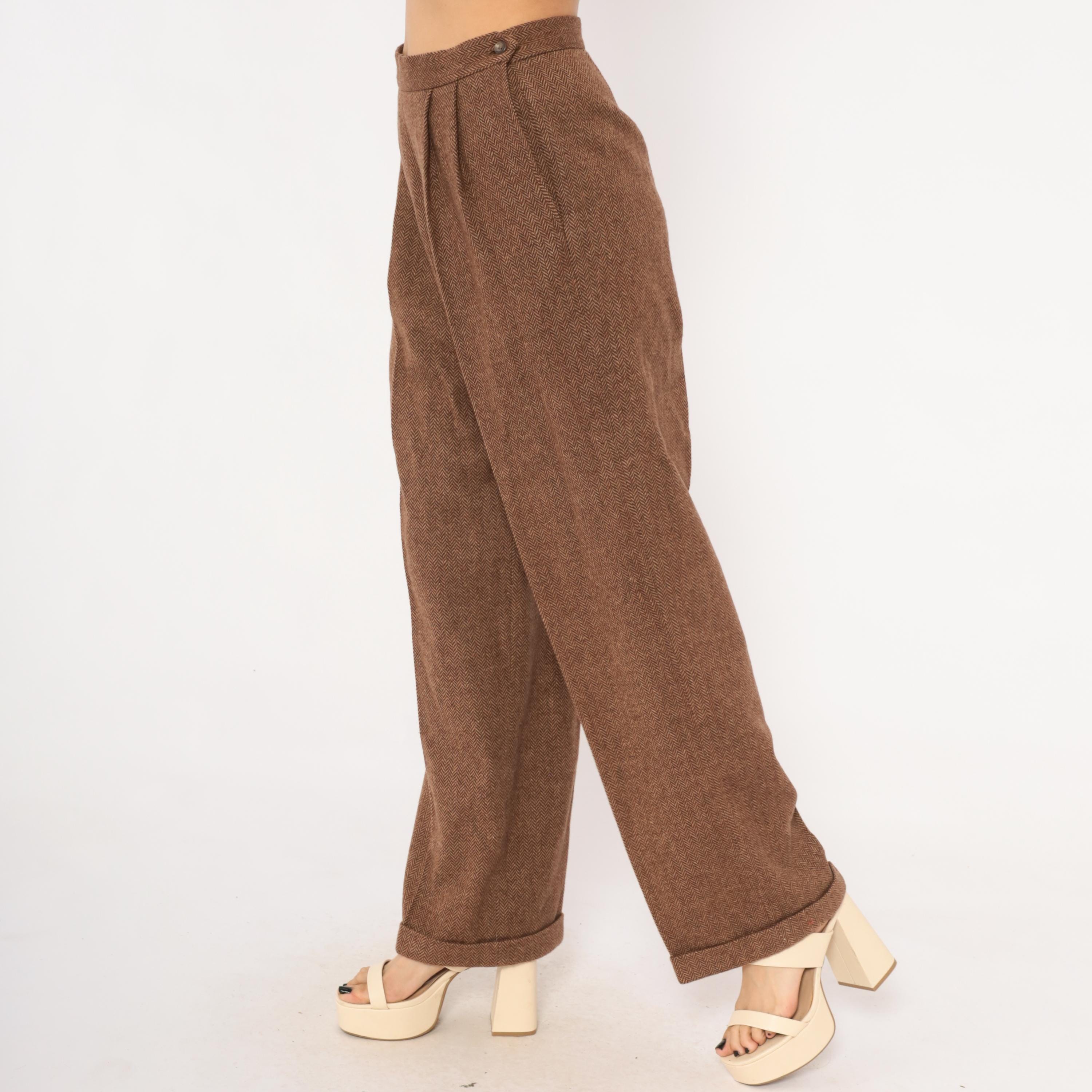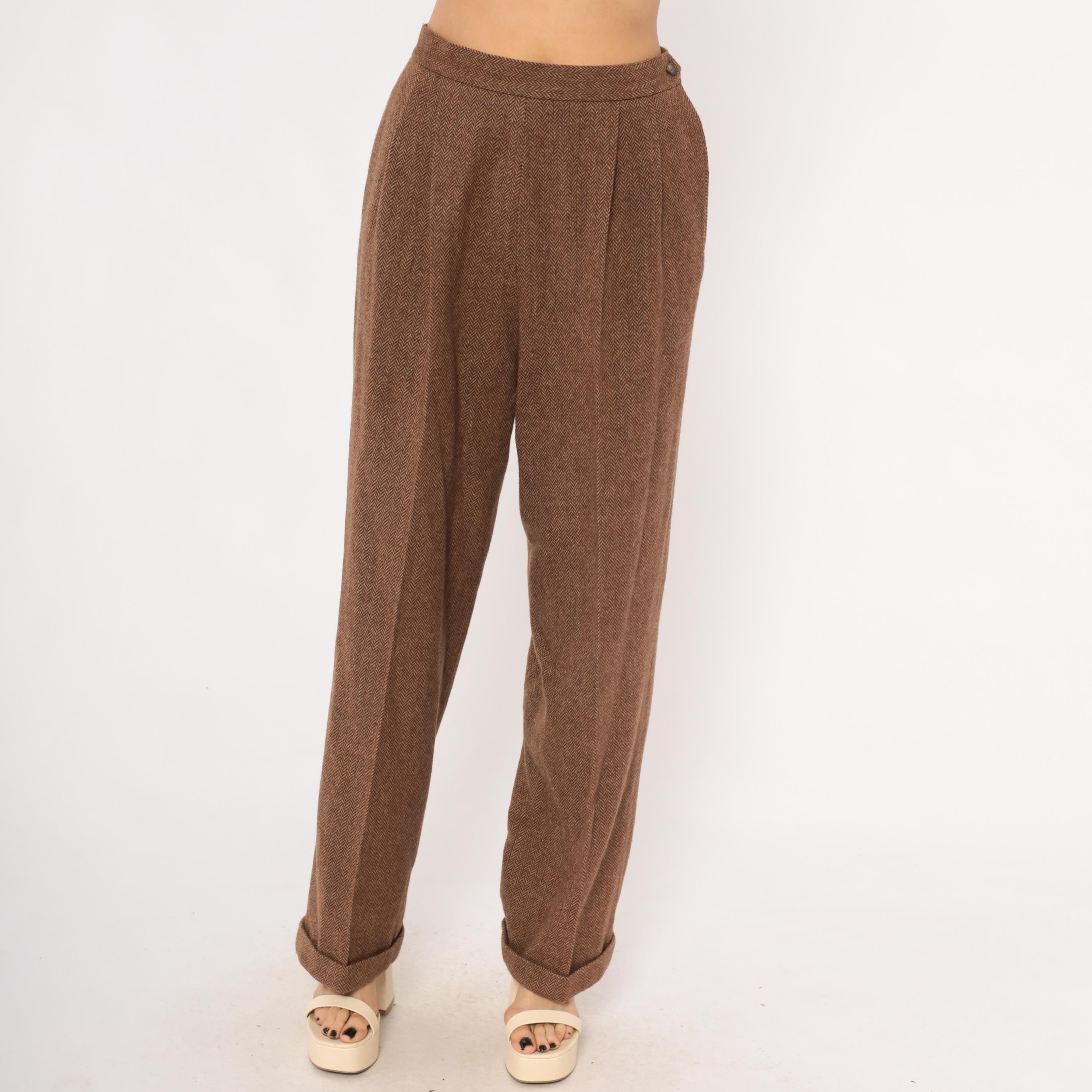 90s Ralph Lauren herringbone wool trousers in brown and tan with front pleats and a high waist. Side zipper closure, side seam pockets, and cuffed hems. Straight tapered leg with a center crease down each leg.