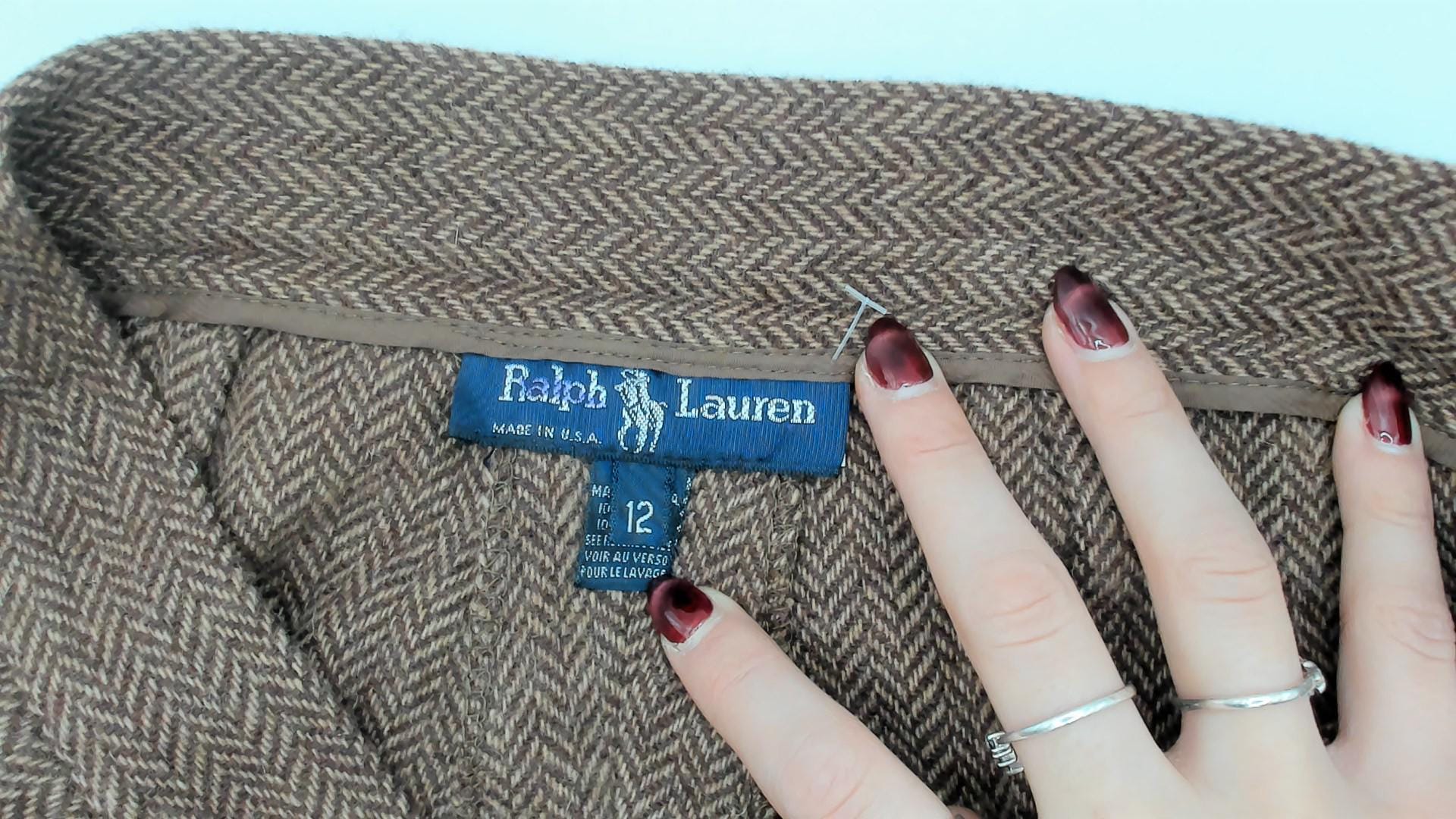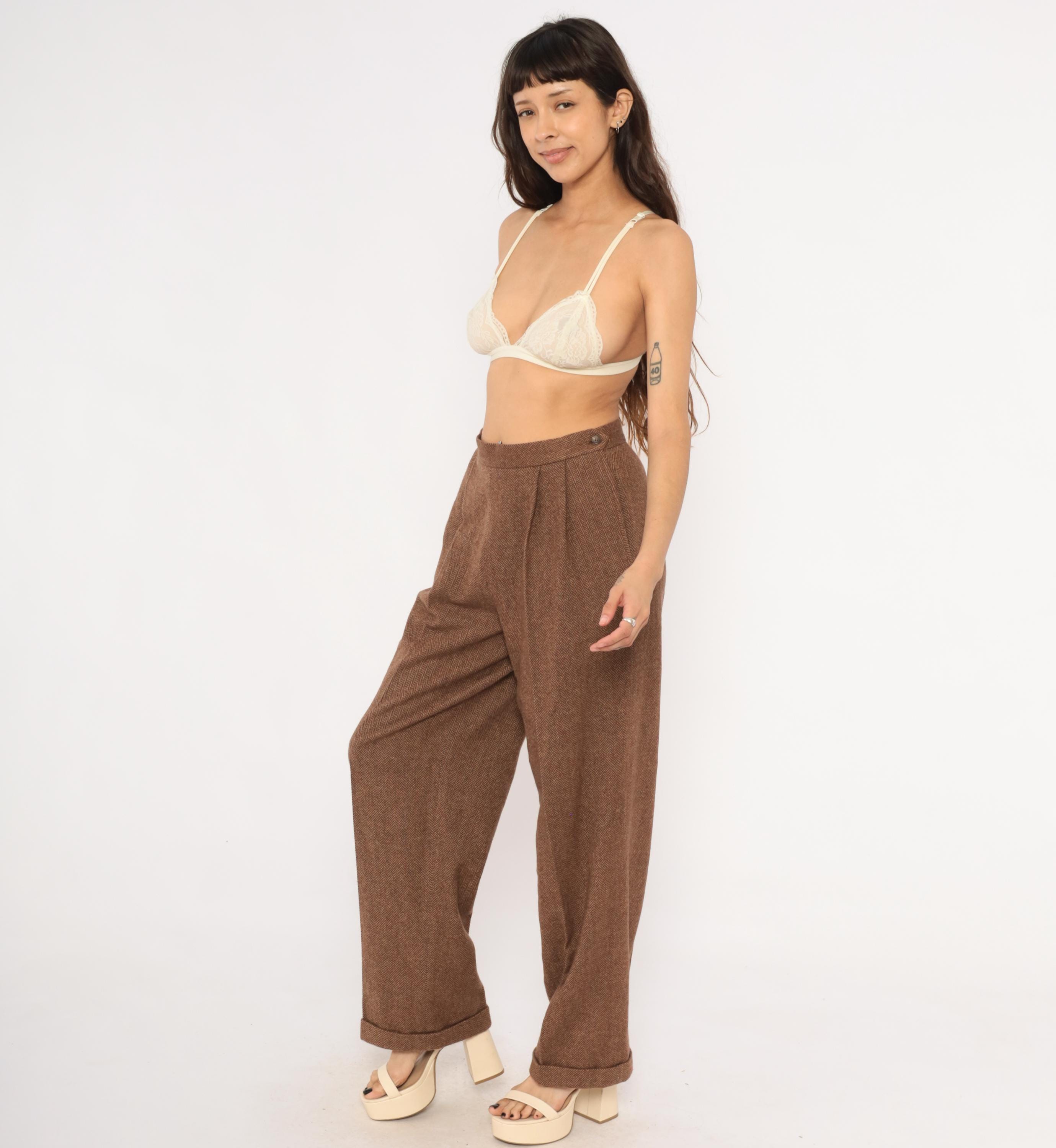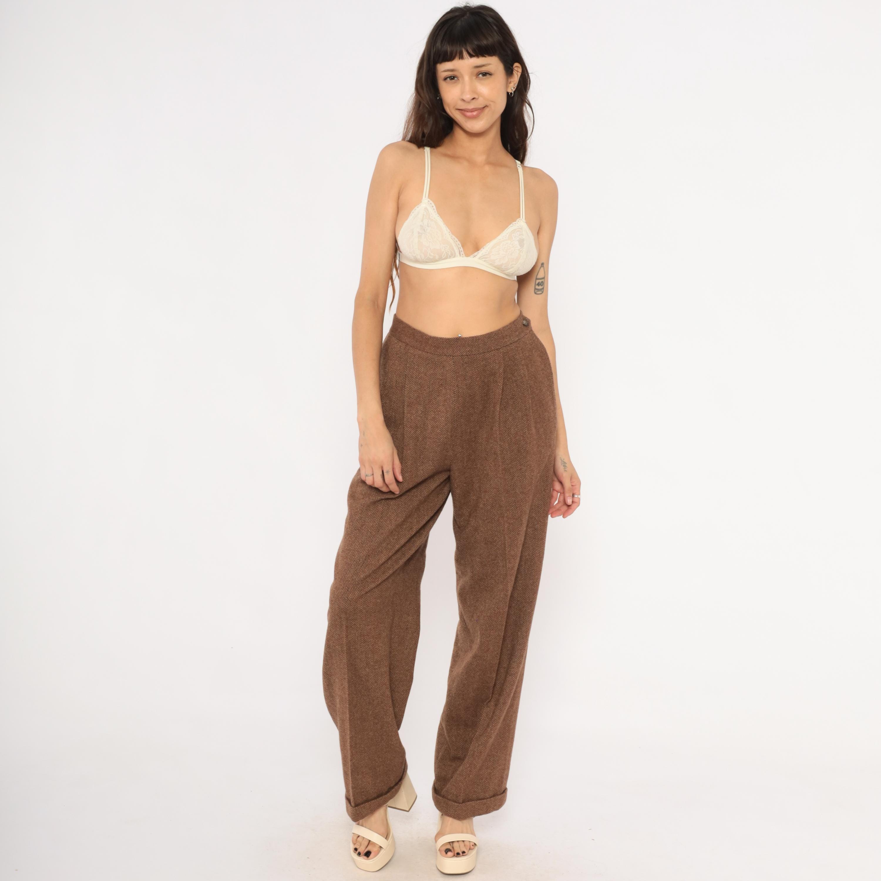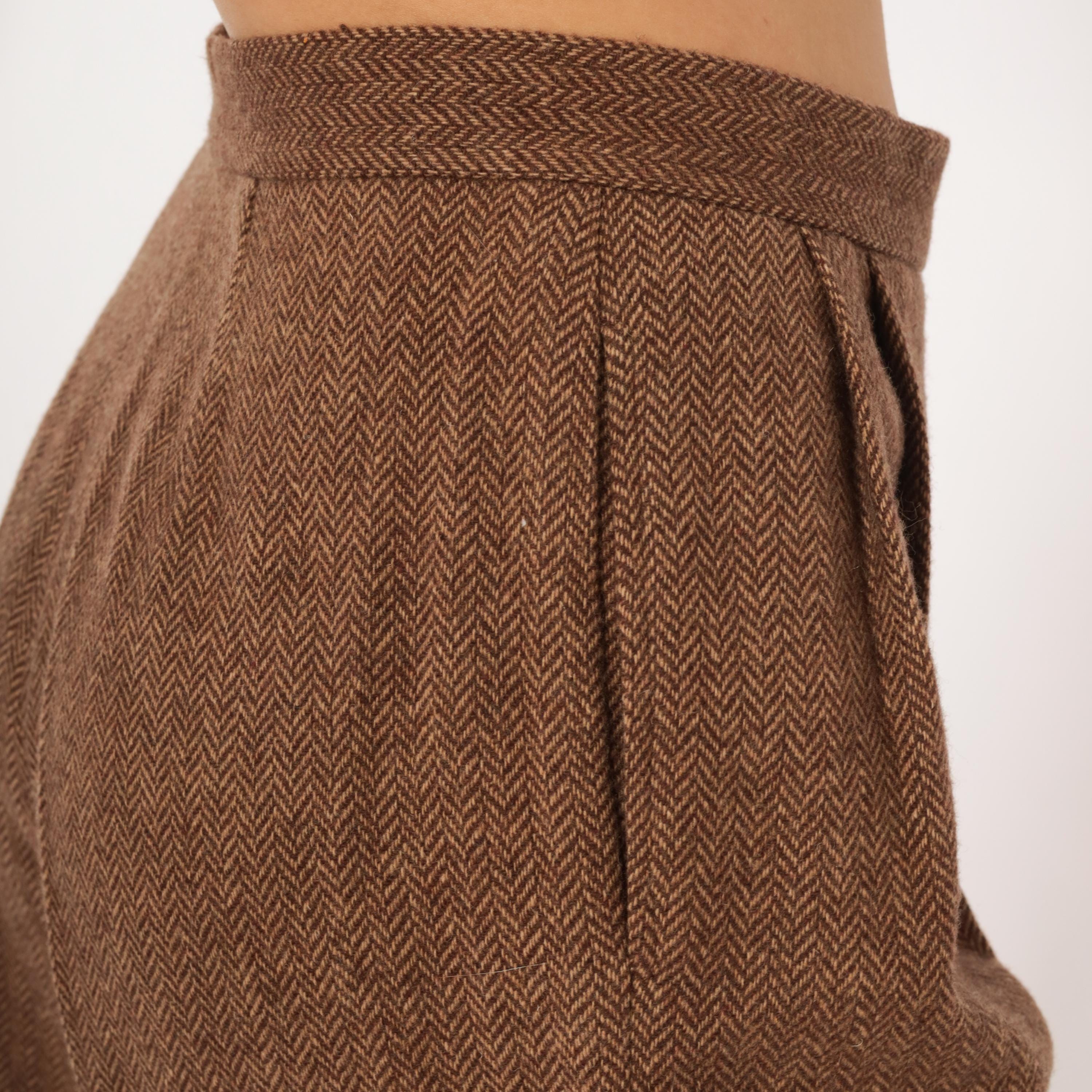 90s Ralph Lauren herringbone wool trousers in brown and tan with front pleats and a high waist. Side zipper closure, side seam pockets, and cuffed hems. Straight tapered leg with a center crease down each leg.