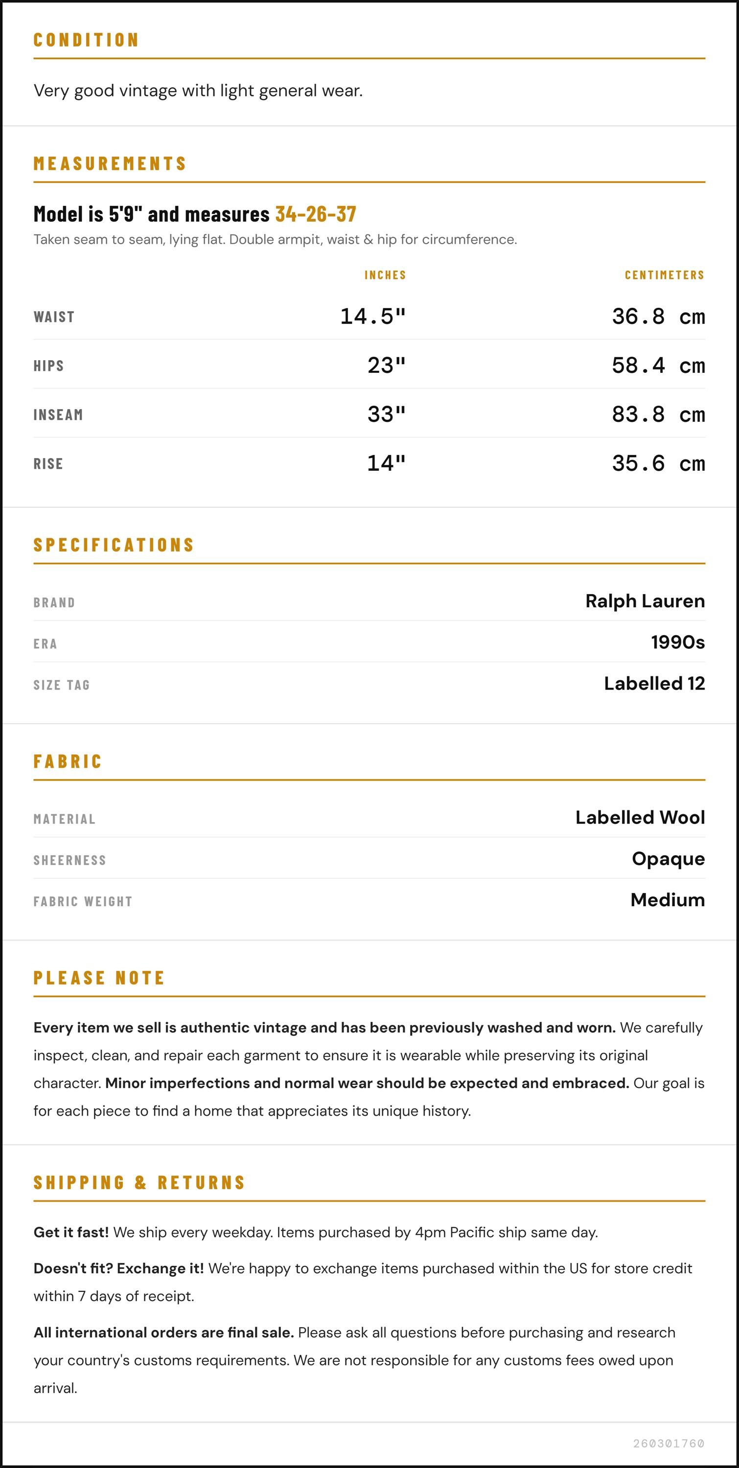 Vintage denim was usually made without any stretch, unlike modern jeans. Check the measurements to ensure proper fit, and remember to give yourself a little wiggle room in the waist and hips, depending on your preferred fit.