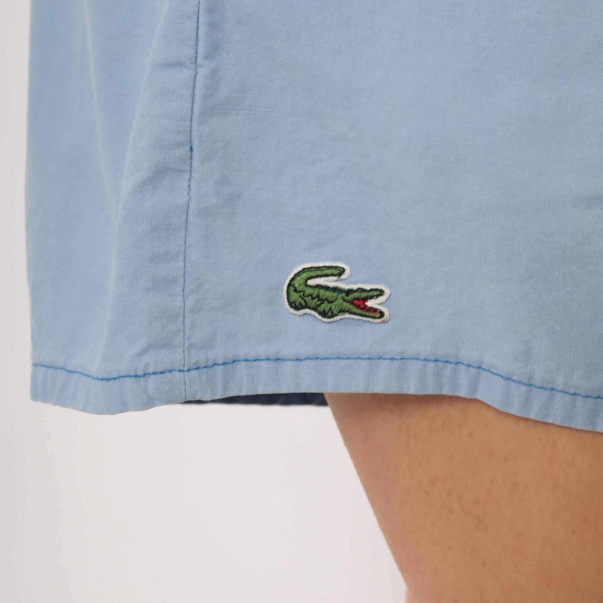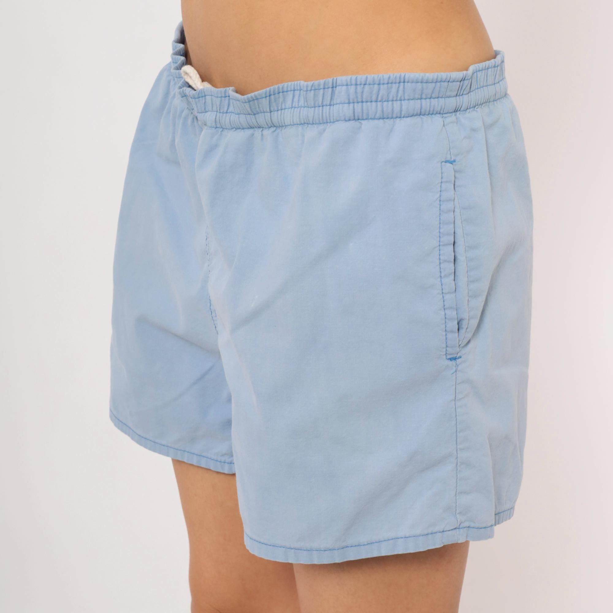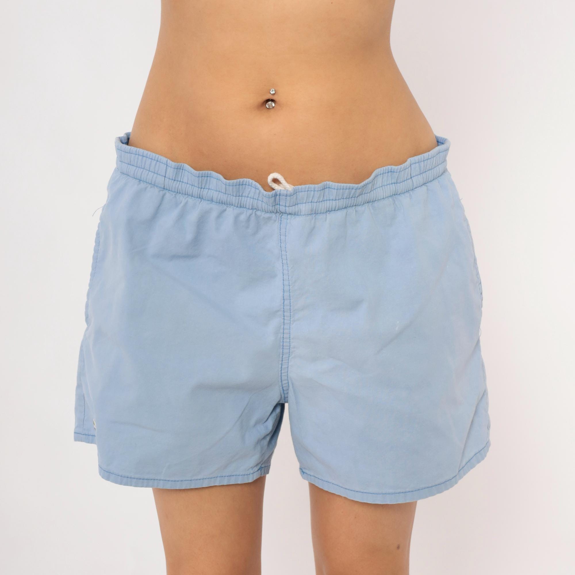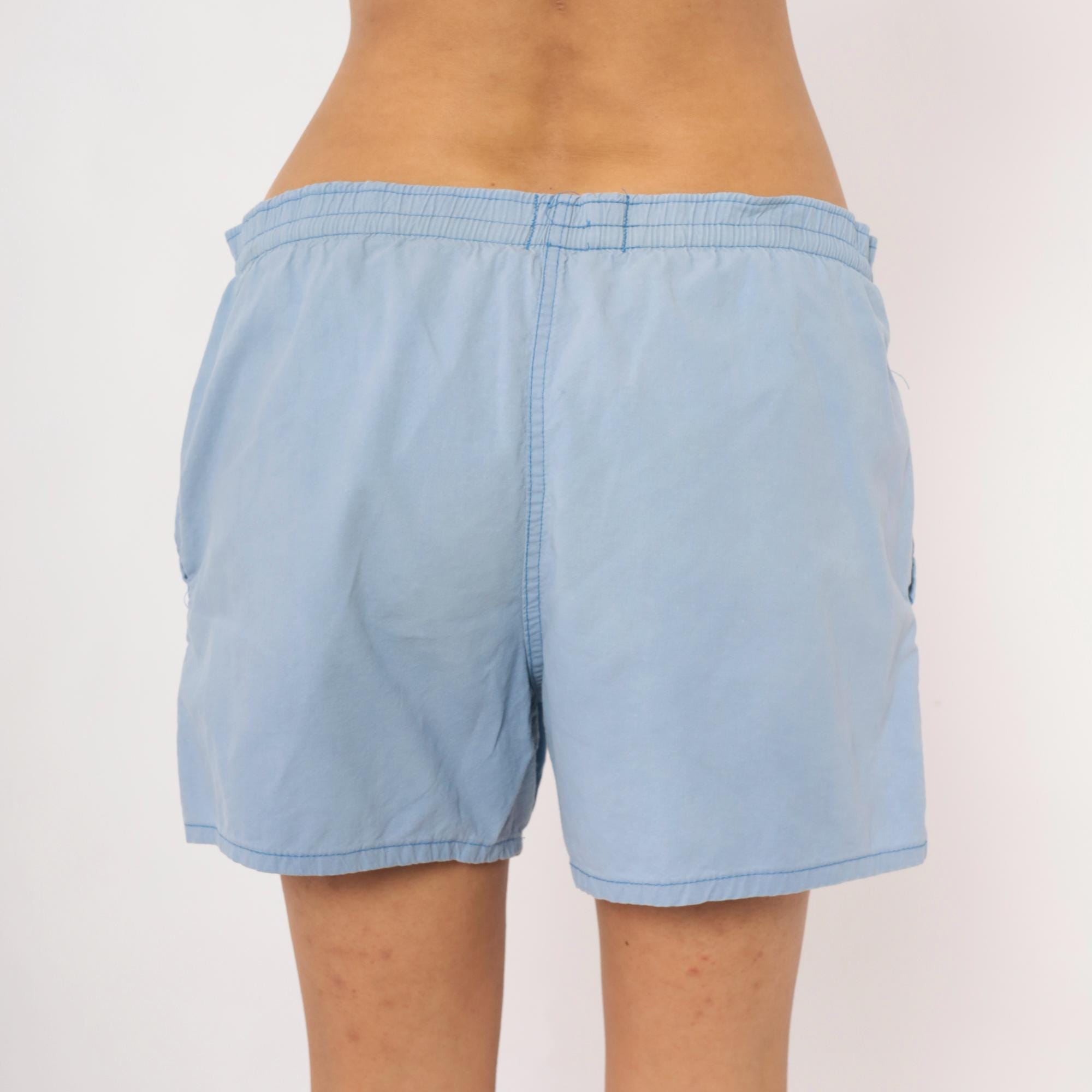 80s light blue swim shorts from Izod Lacoste with elastic waistband and white drawstring tie closure. Embroidered green crocodile logo on the lower left leg, side seam pockets on both sides. Relaxed fit with a short inseam and clean stitching throughout.