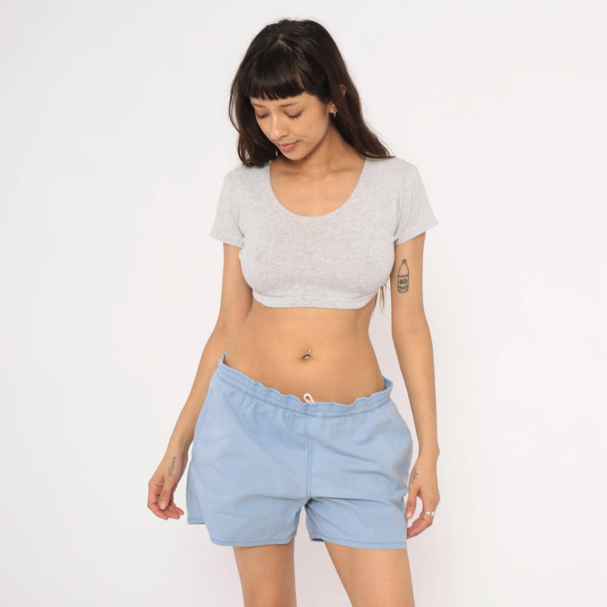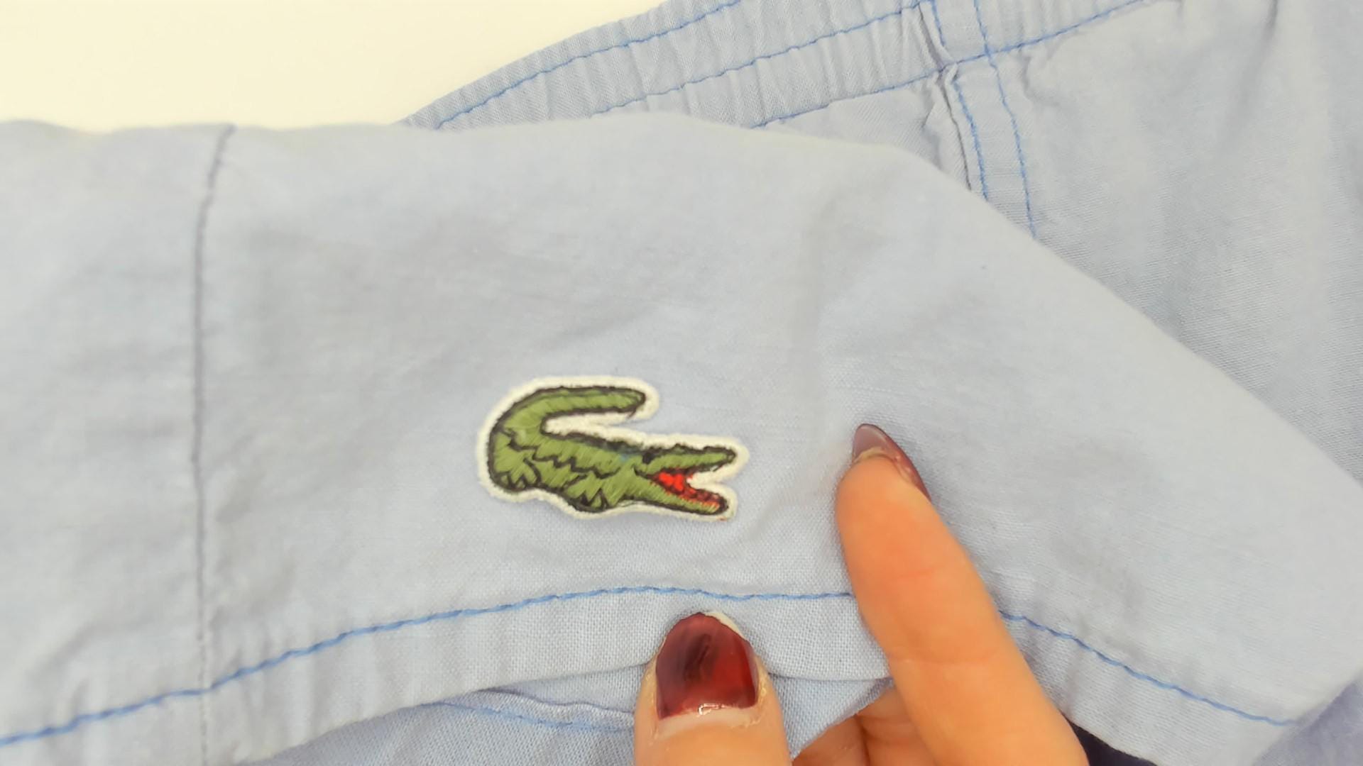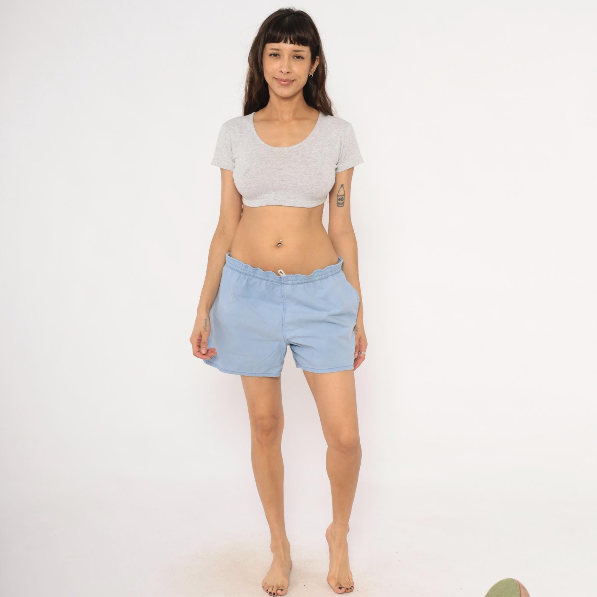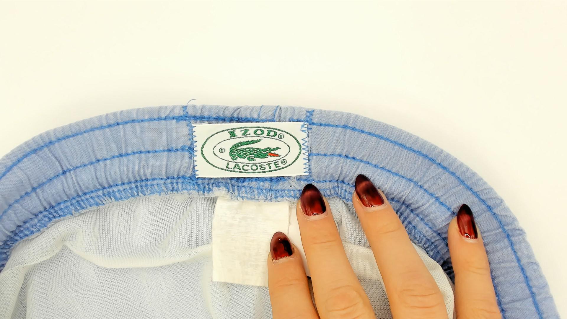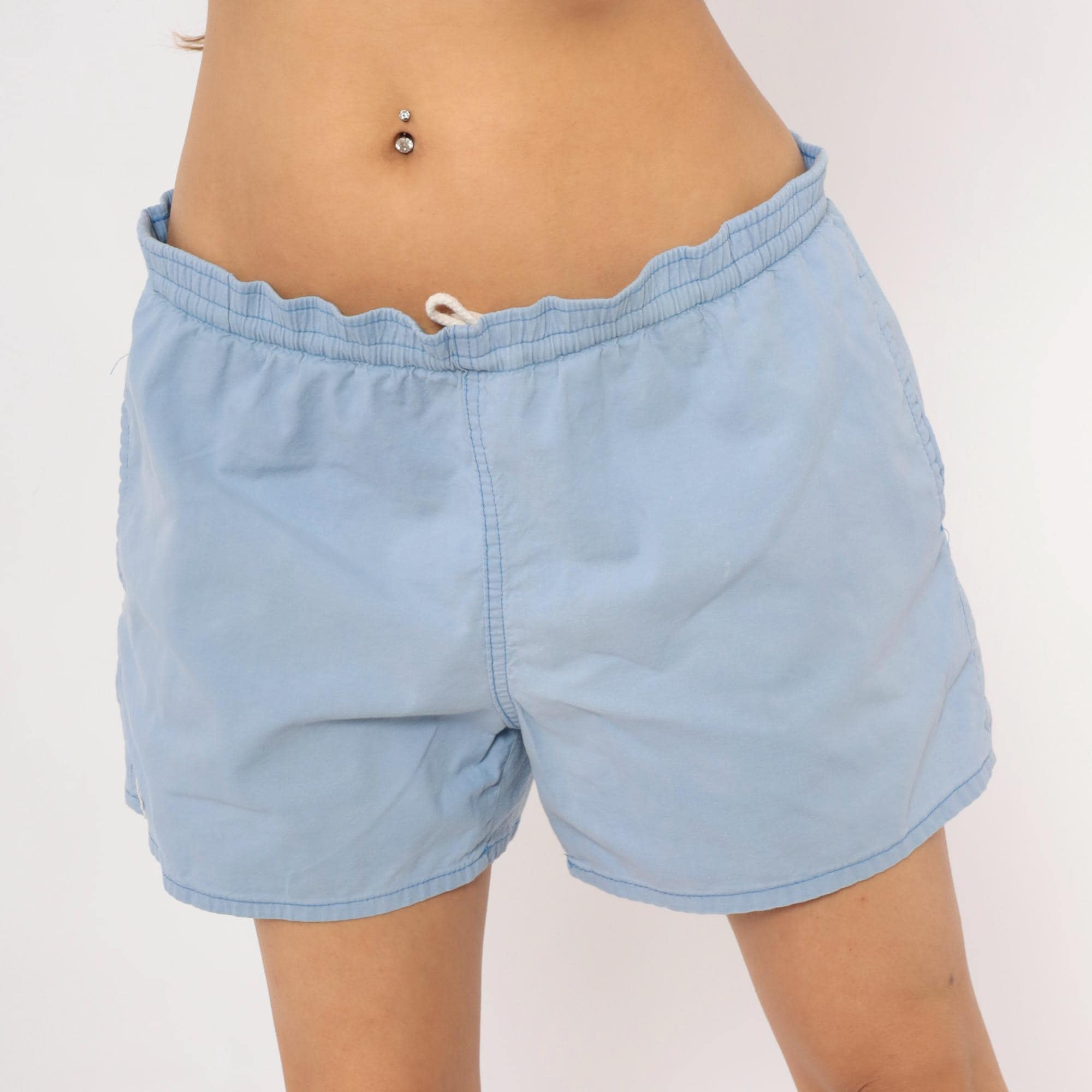 80s light blue swim shorts from Izod Lacoste with elastic waistband and white drawstring tie closure. Embroidered green crocodile logo on the lower left leg, side seam pockets on both sides. Relaxed fit with a short inseam and clean stitching throughout.