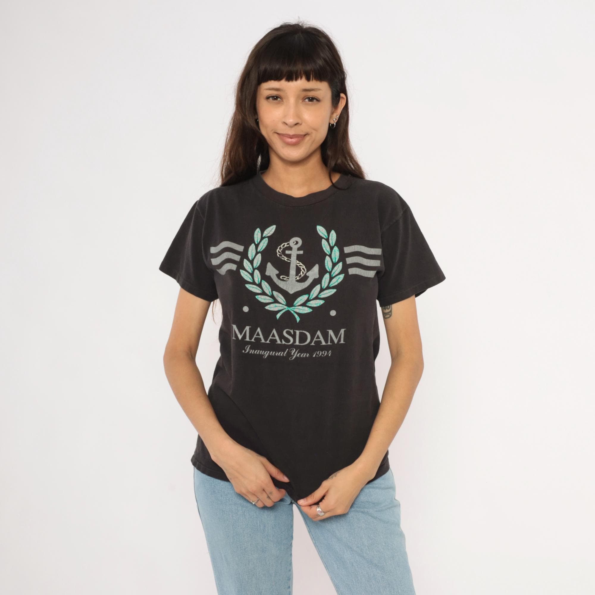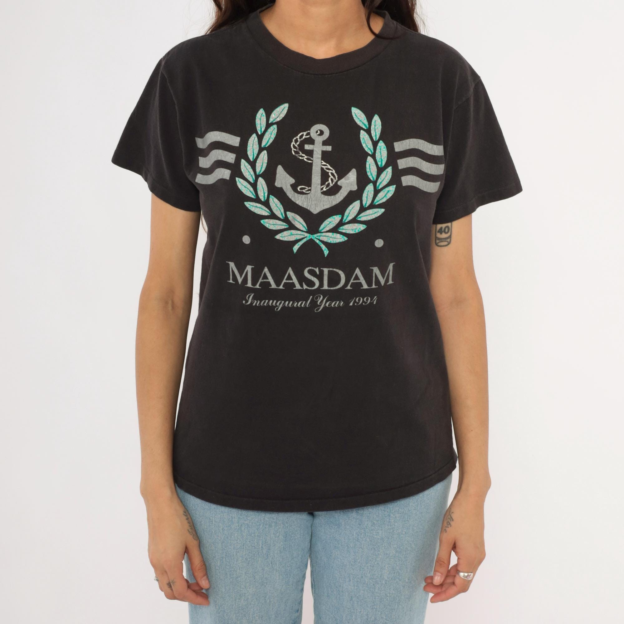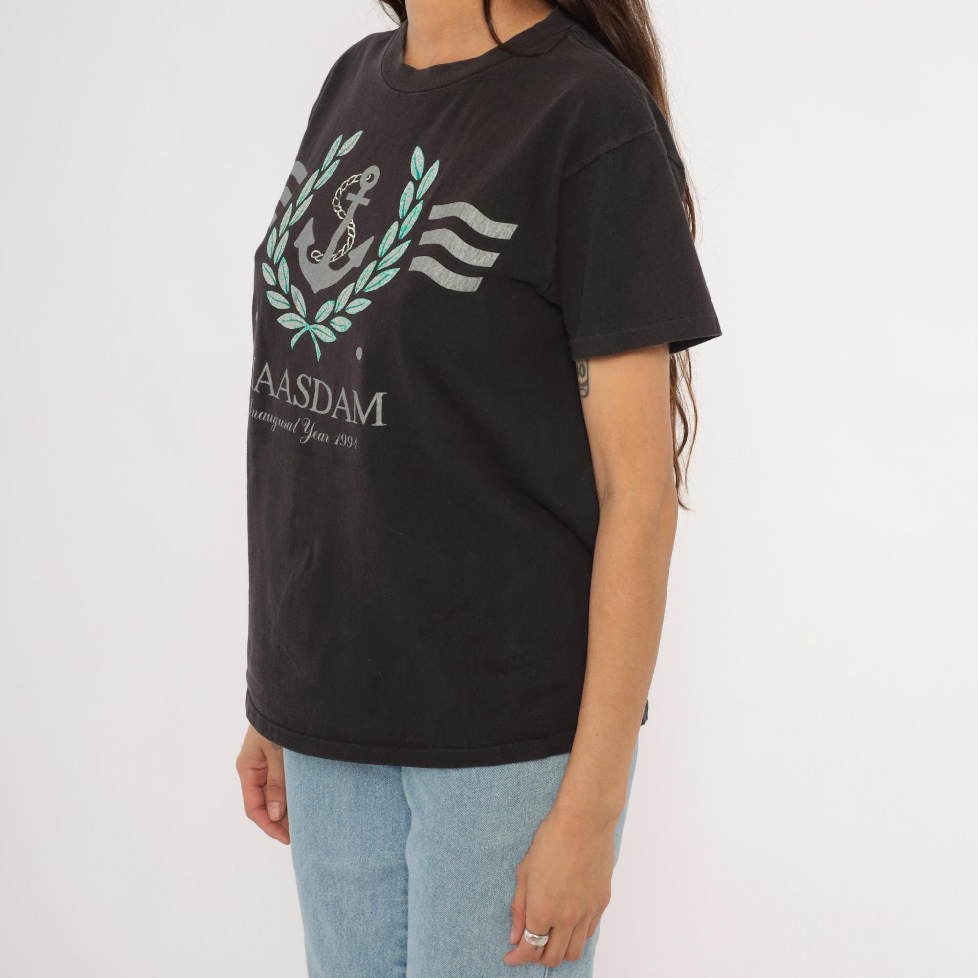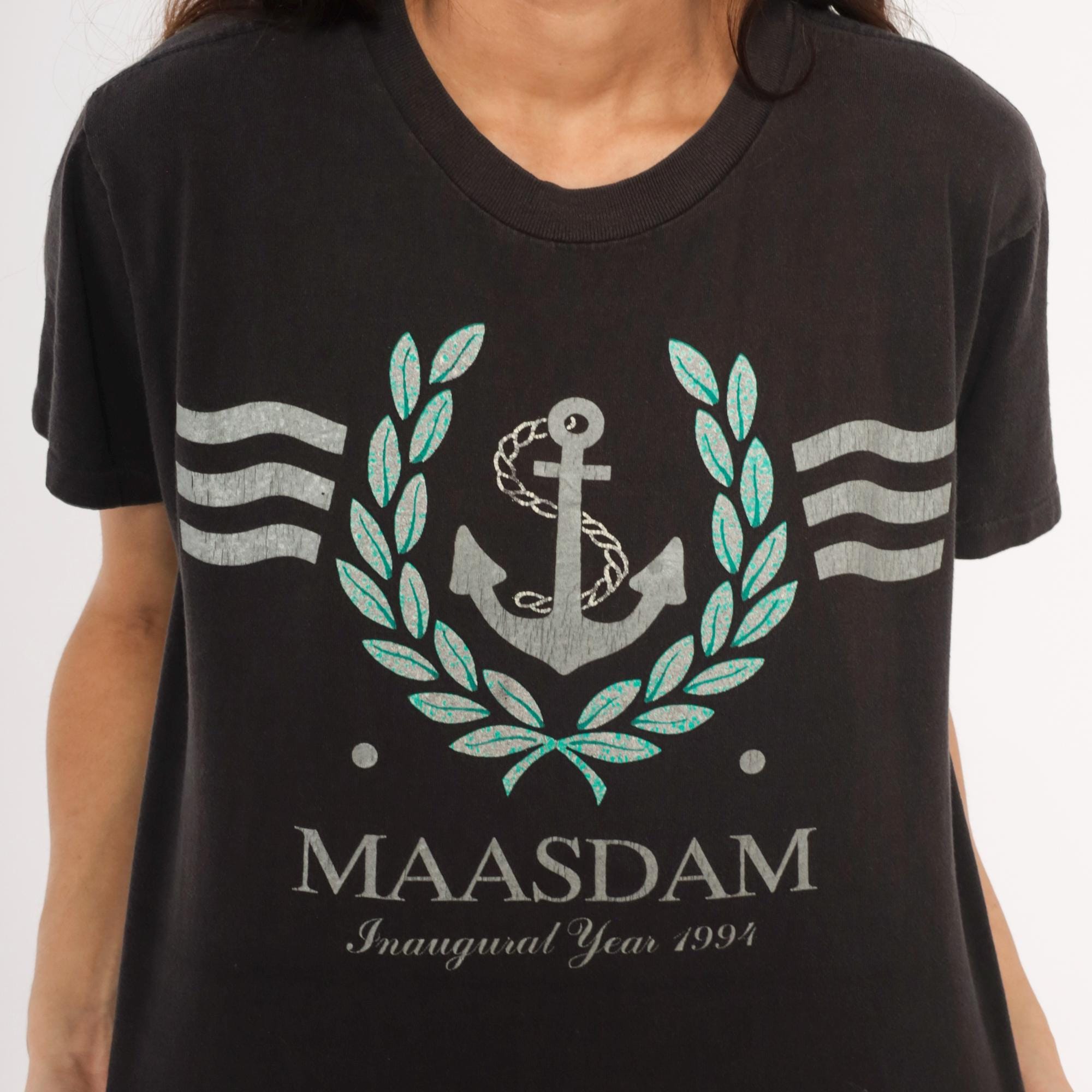 90s black graphic tee from Delta commemorating the MS Maasdam with "Inaugural Year 1993" printed below the ship name. Silver and teal anchor surrounded by a laurel wreath with wavy line accents on each side. Crew neckline, short sleeves, and a relaxed straight cut through the body.