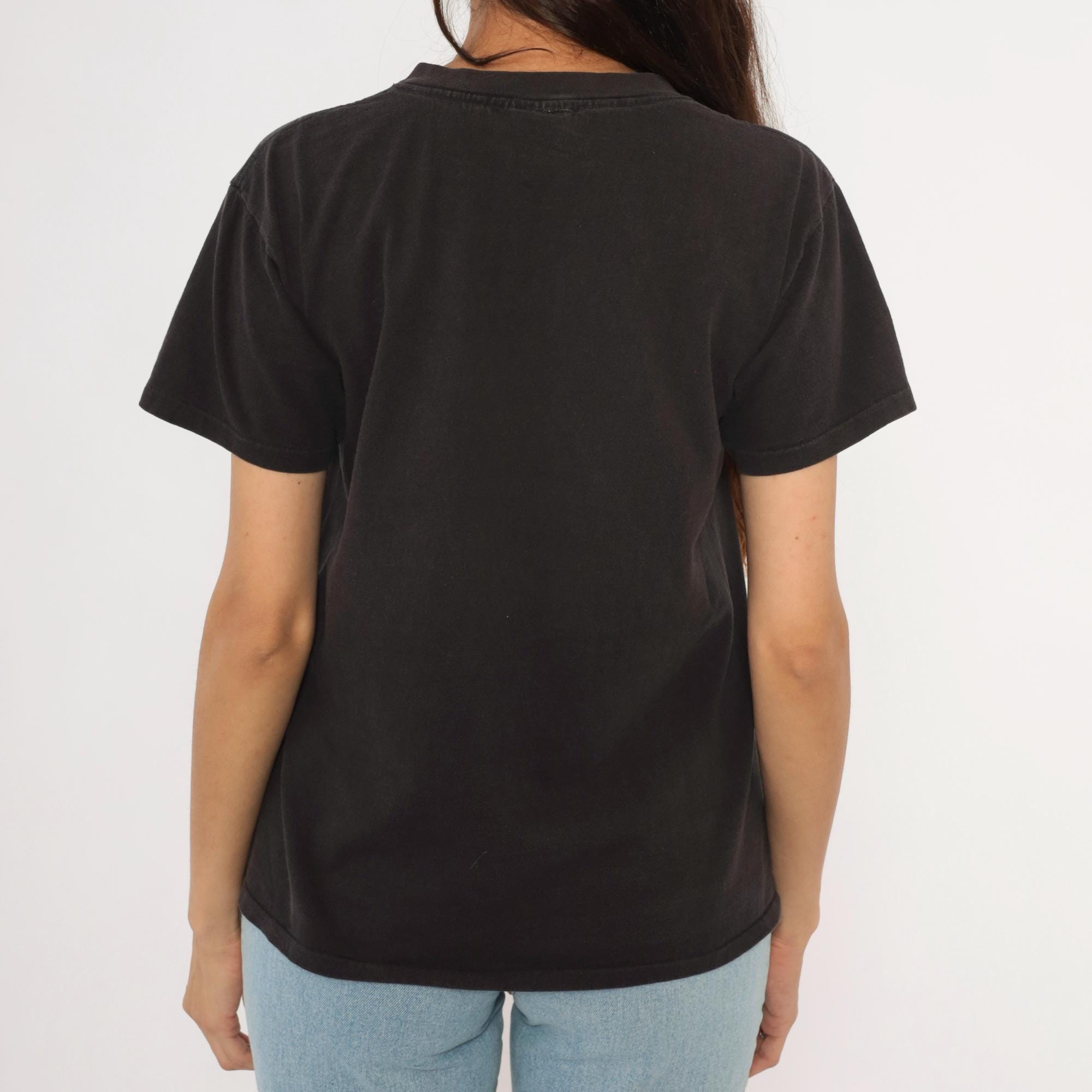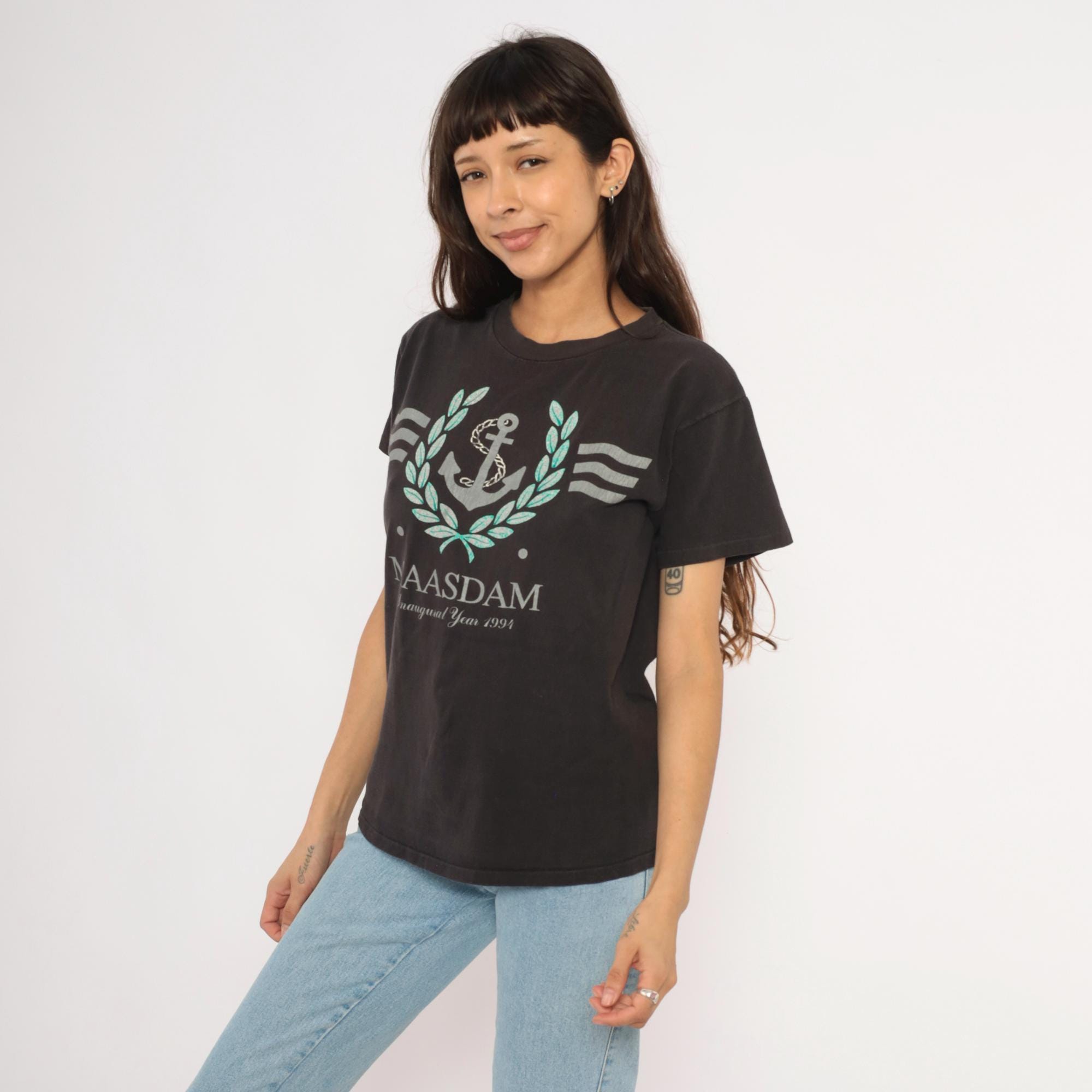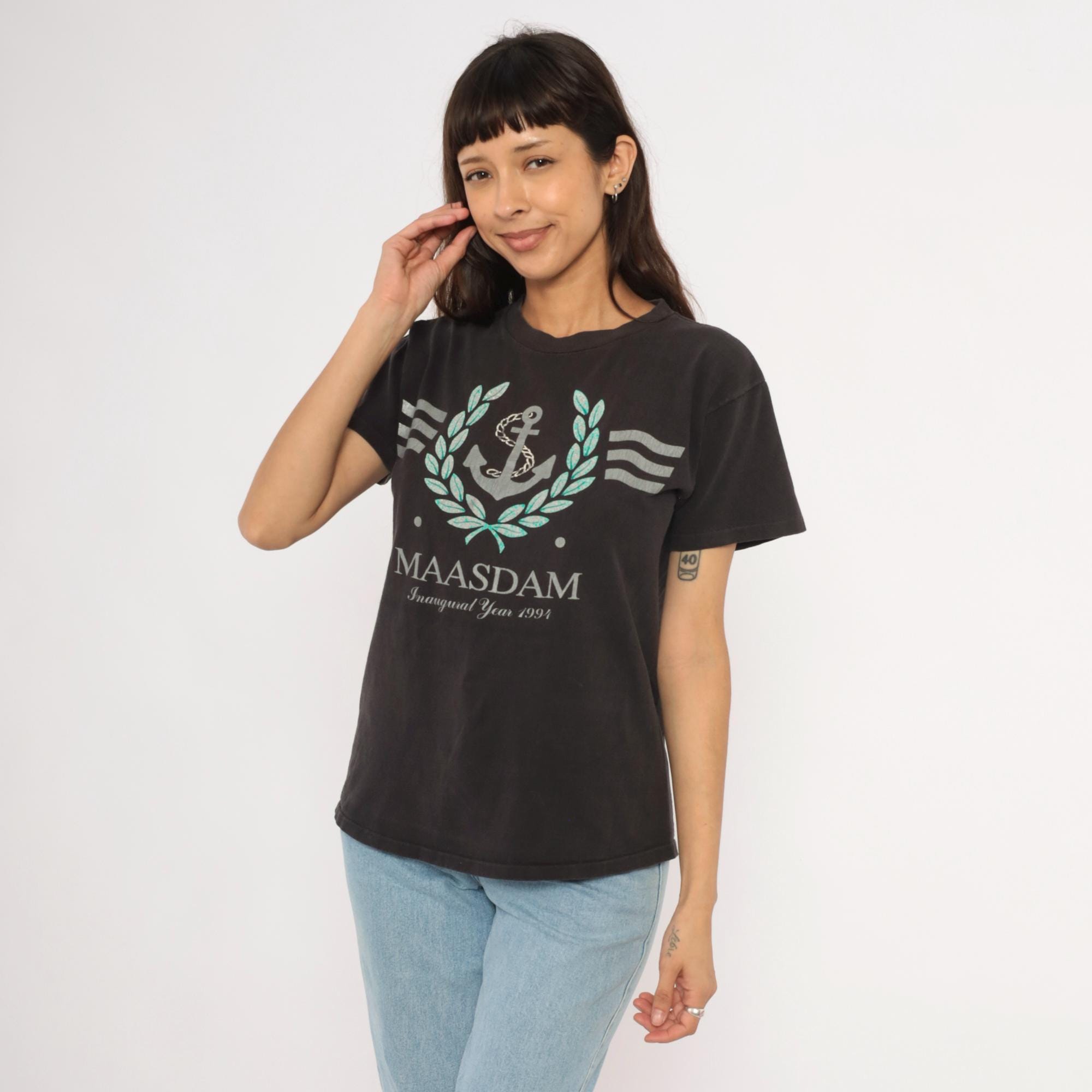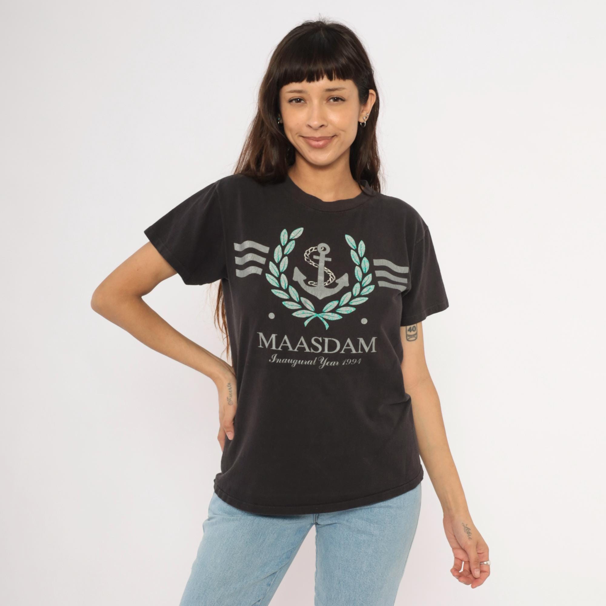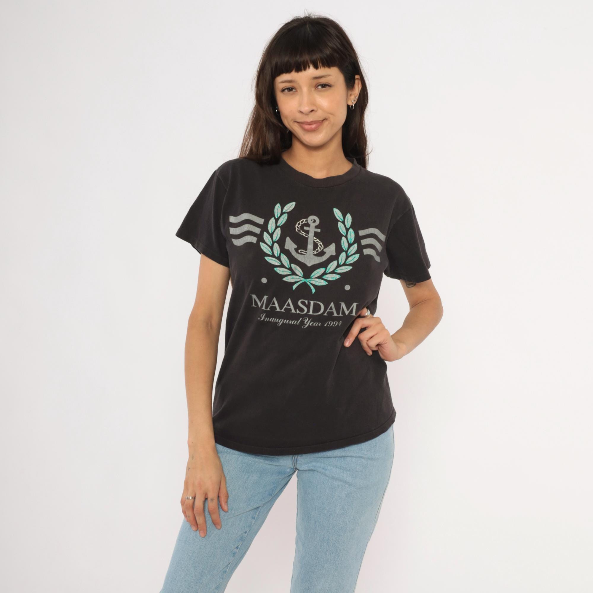 90s black graphic tee from Delta commemorating the MS Maasdam with "Inaugural Year 1993" printed below the ship name. Silver and teal anchor surrounded by a laurel wreath with wavy line accents on each side. Crew neckline, short sleeves, and a relaxed straight cut through the body.