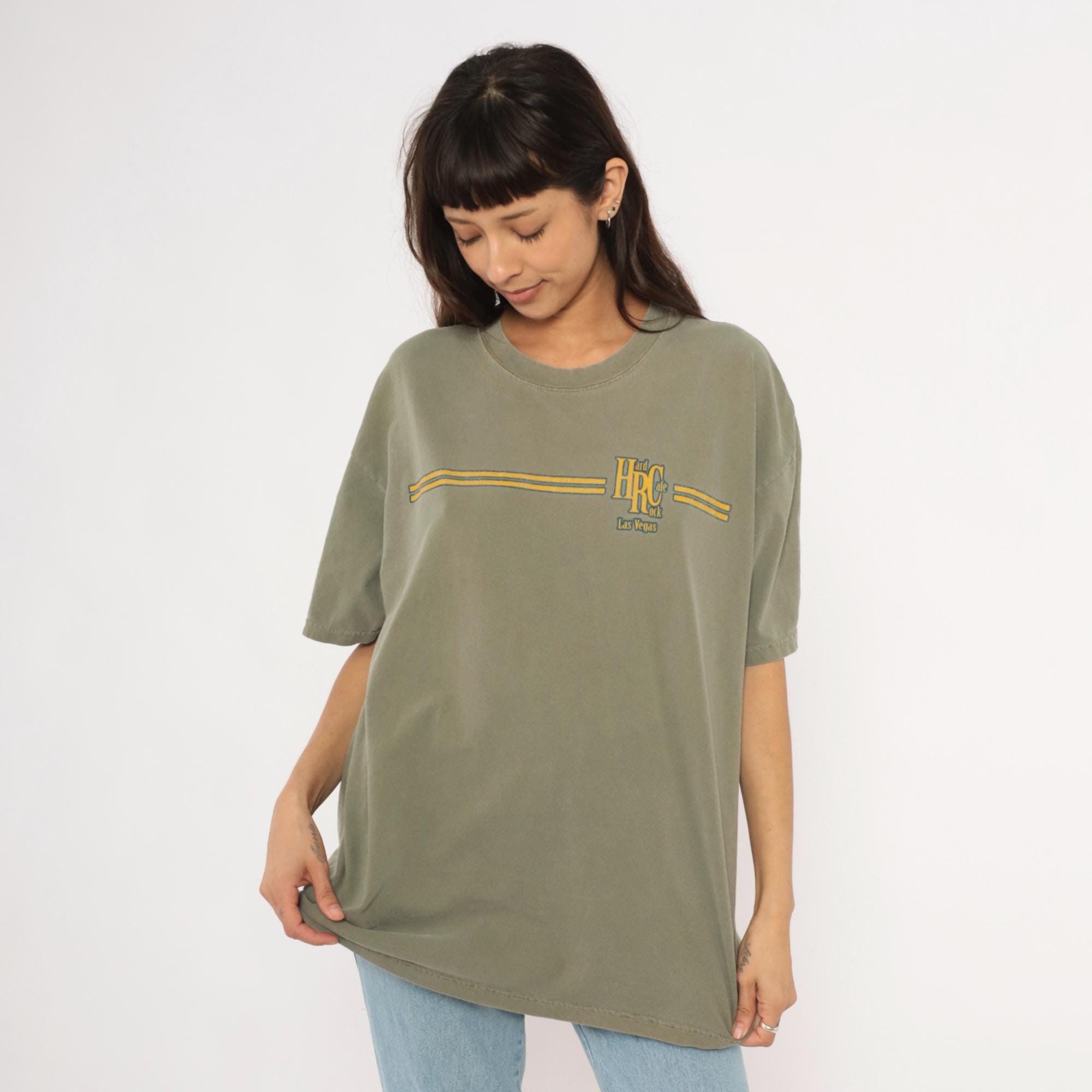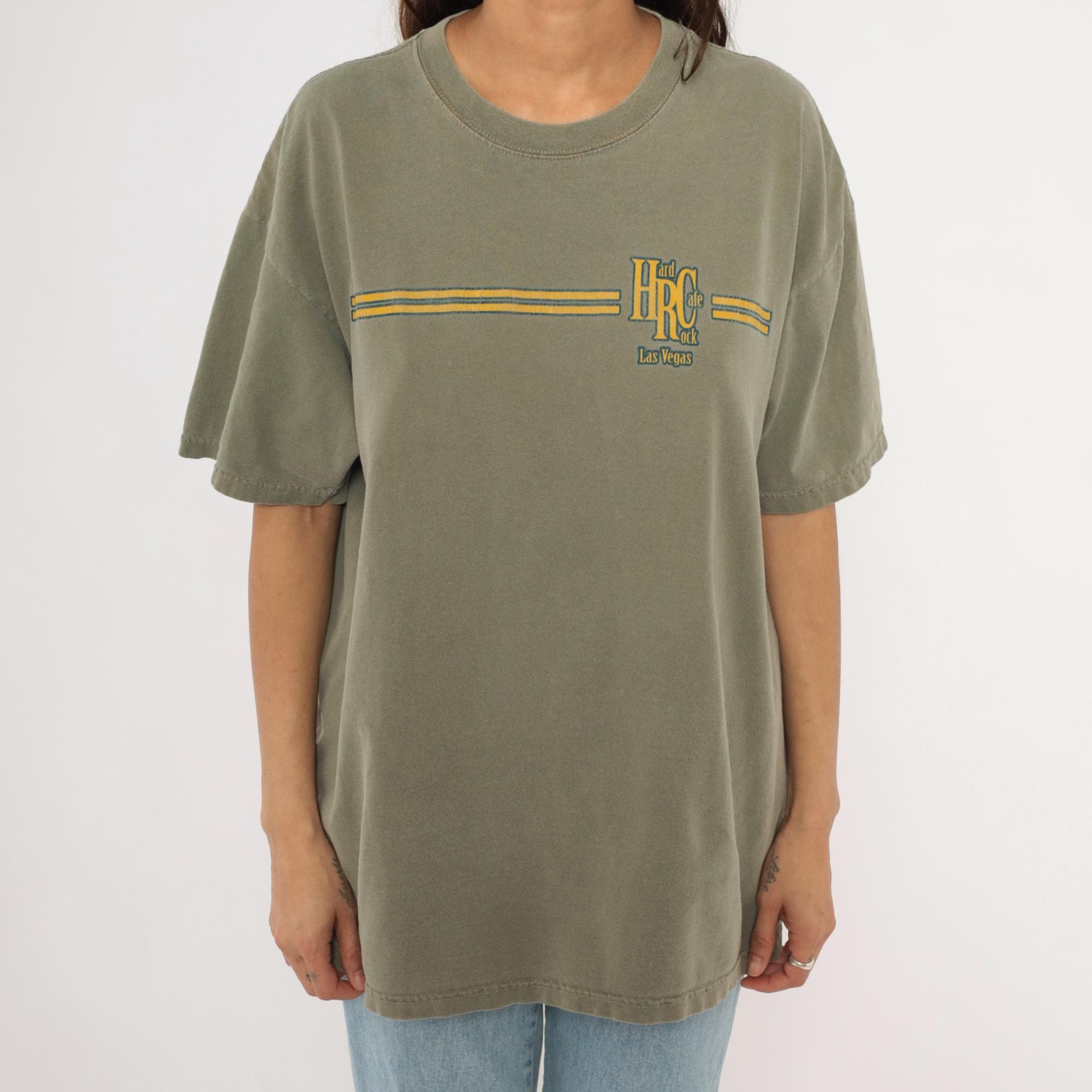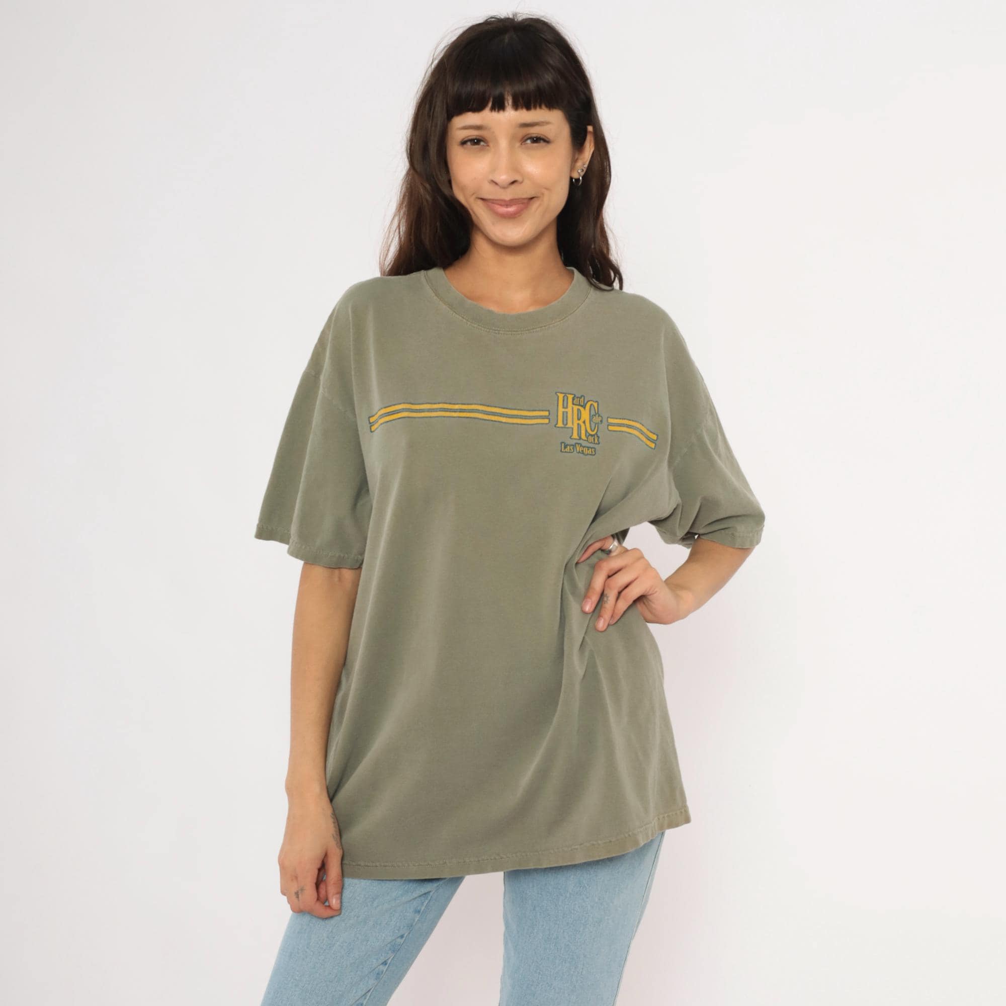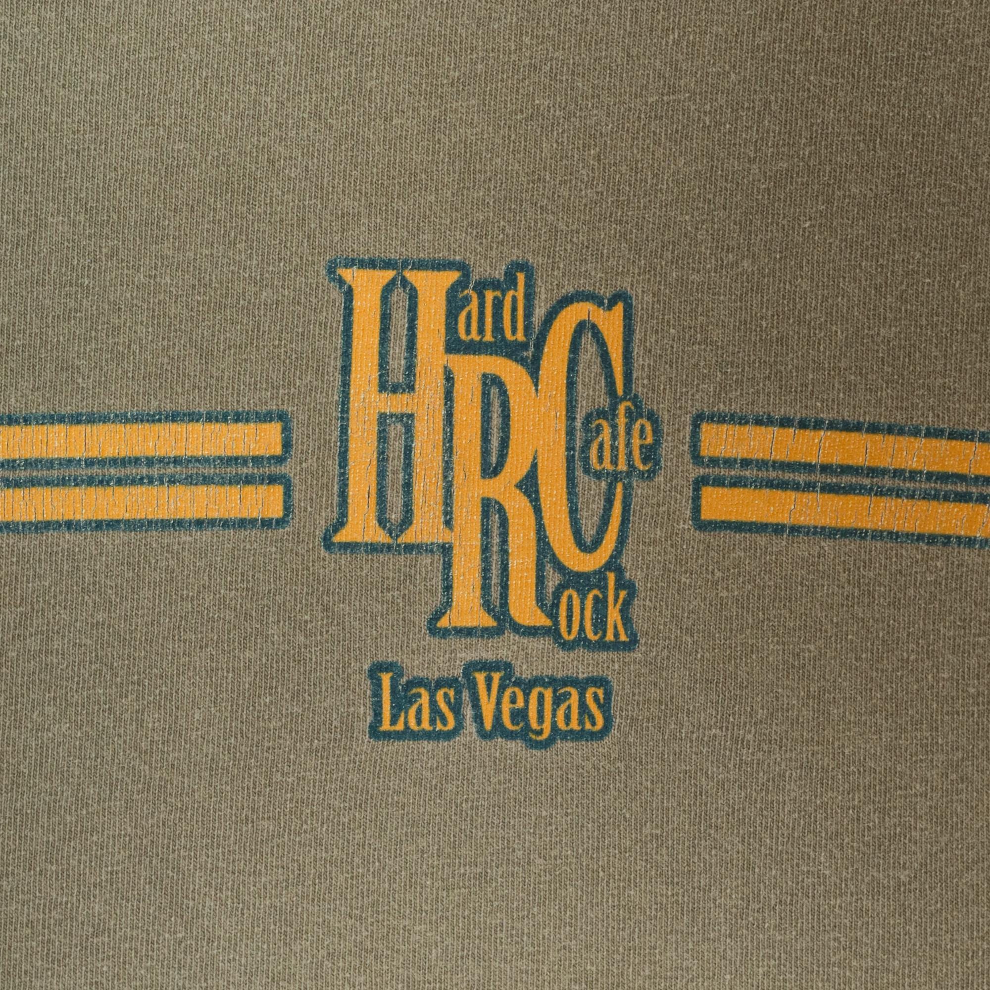 90s Hard Rock Cafe Las Vegas tee in an olive green with gold and dark green HRC graphic across the chest, flanked by horizontal racing stripes. Crew neck, short sleeves, and a boxy relaxed silhouette.