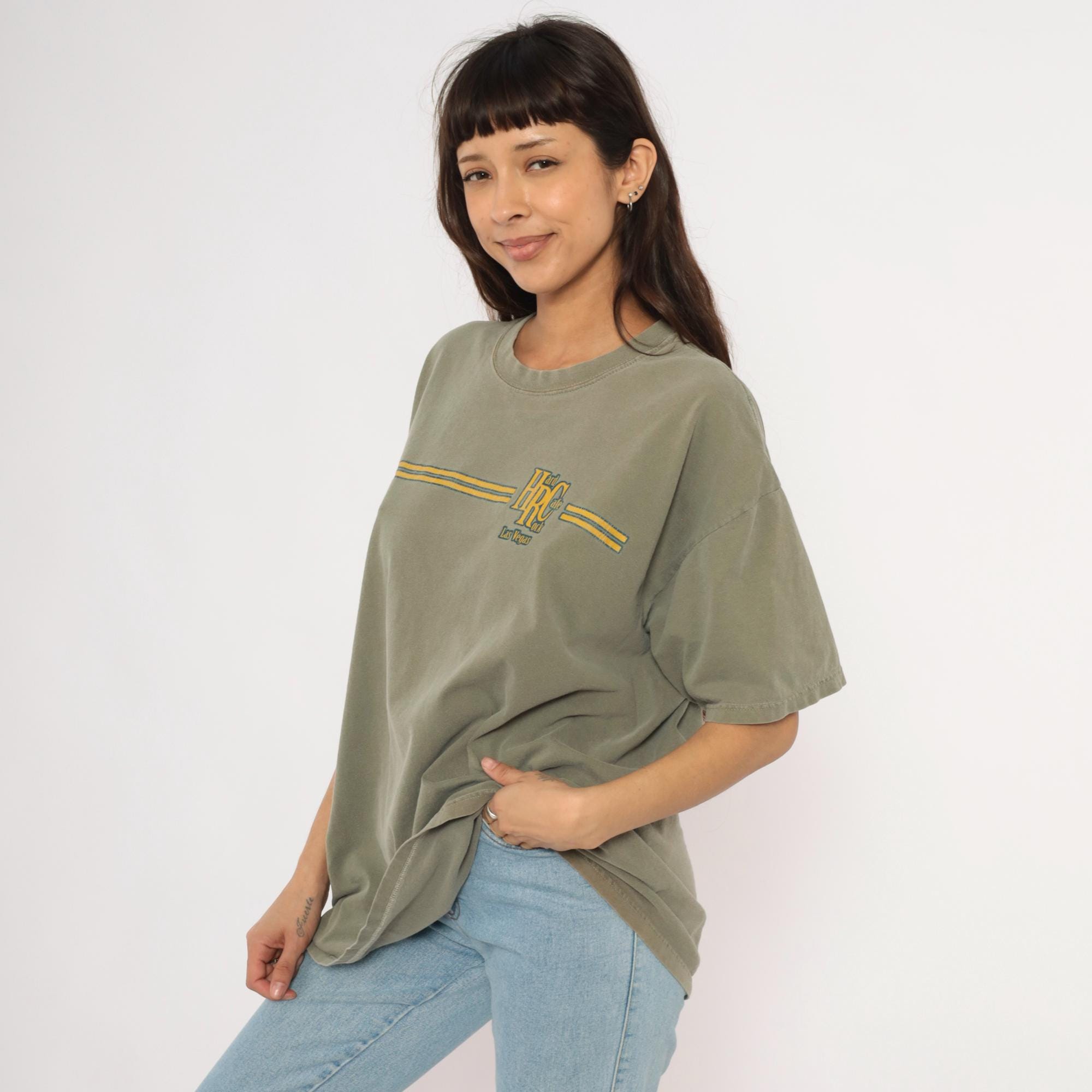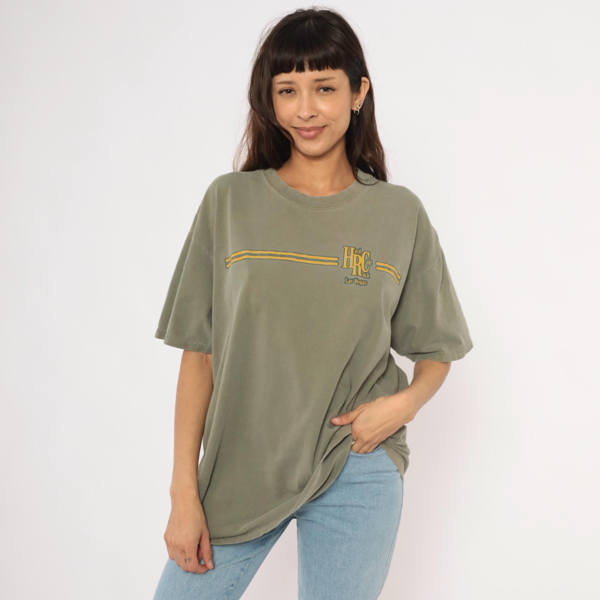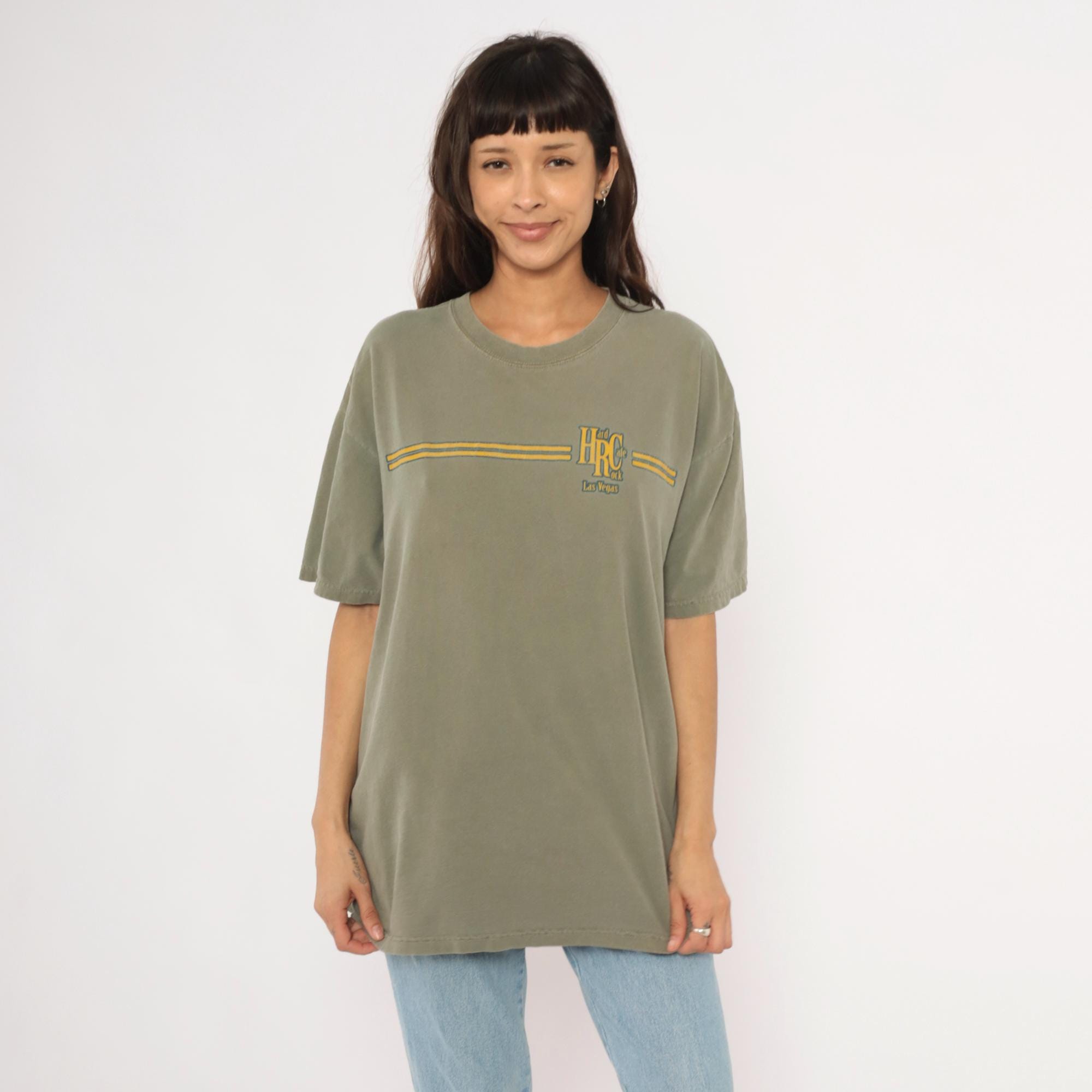 90s Hard Rock Cafe Las Vegas tee in an olive green with gold and dark green HRC graphic across the chest, flanked by horizontal racing stripes. Crew neck, short sleeves, and a boxy relaxed silhouette.
