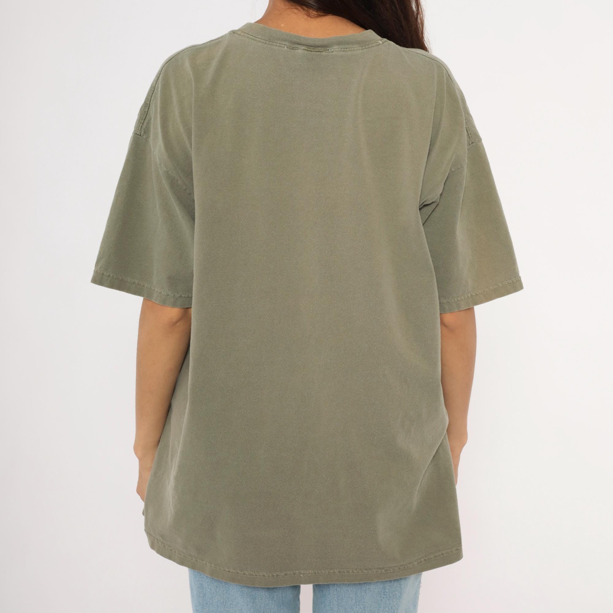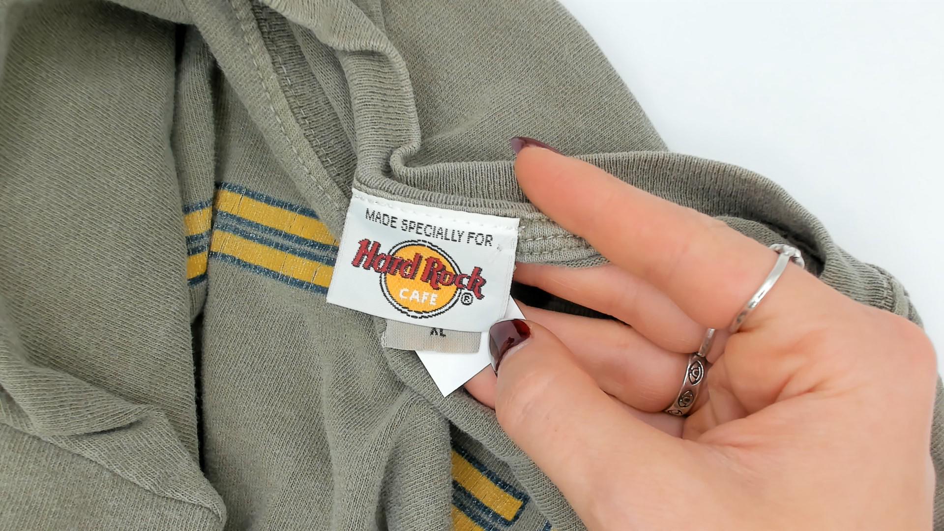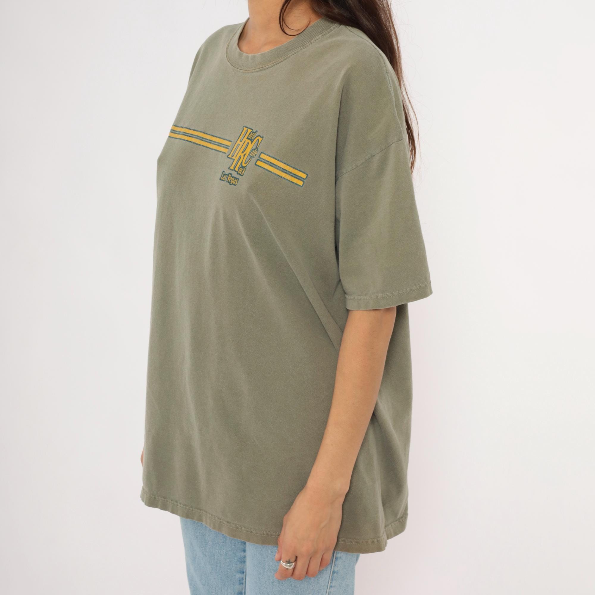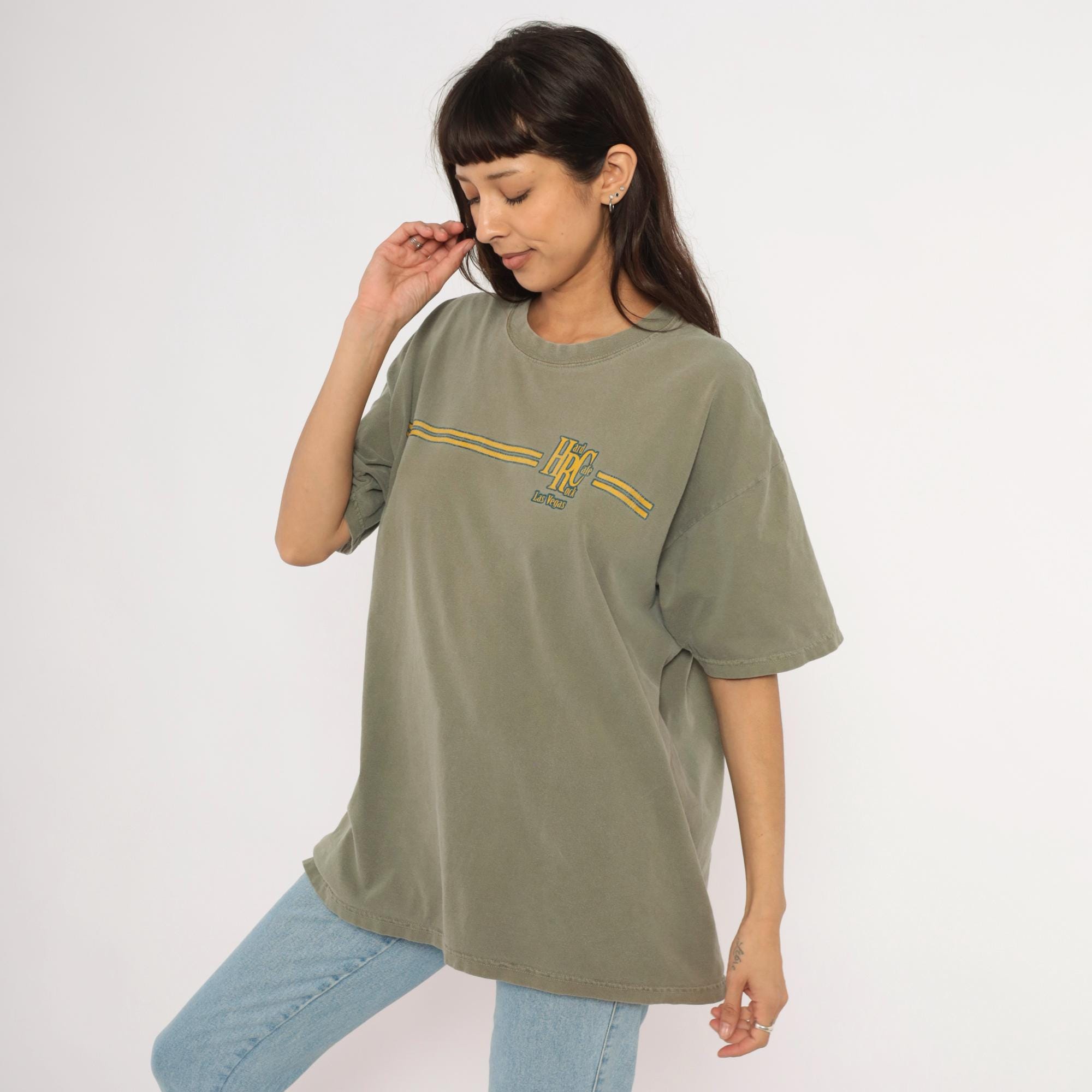 90s Hard Rock Cafe Las Vegas tee in an olive green with gold and dark green HRC graphic across the chest, flanked by horizontal racing stripes. Crew neck, short sleeves, and a boxy relaxed silhouette.