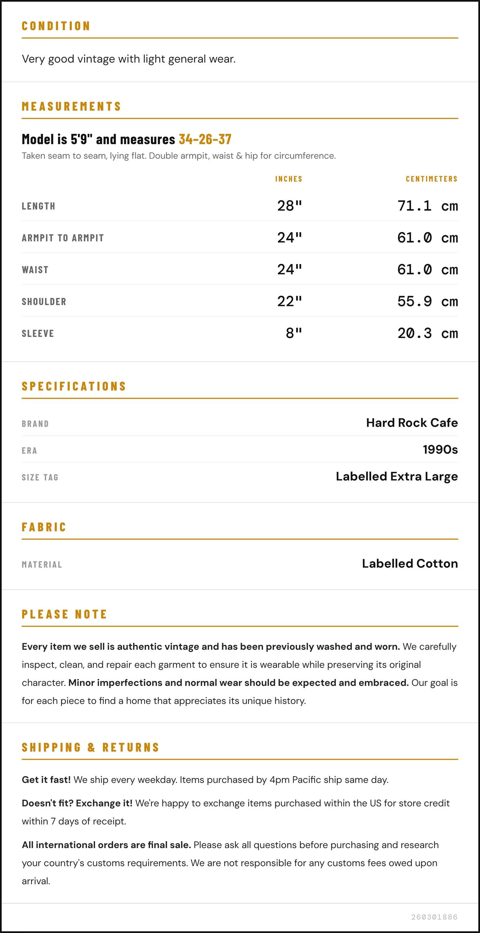 Vintage denim was usually made without any stretch, unlike modern jeans. Check the measurements to ensure proper fit, and remember to give yourself a little wiggle room in the waist and hips, depending on your preferred fit.