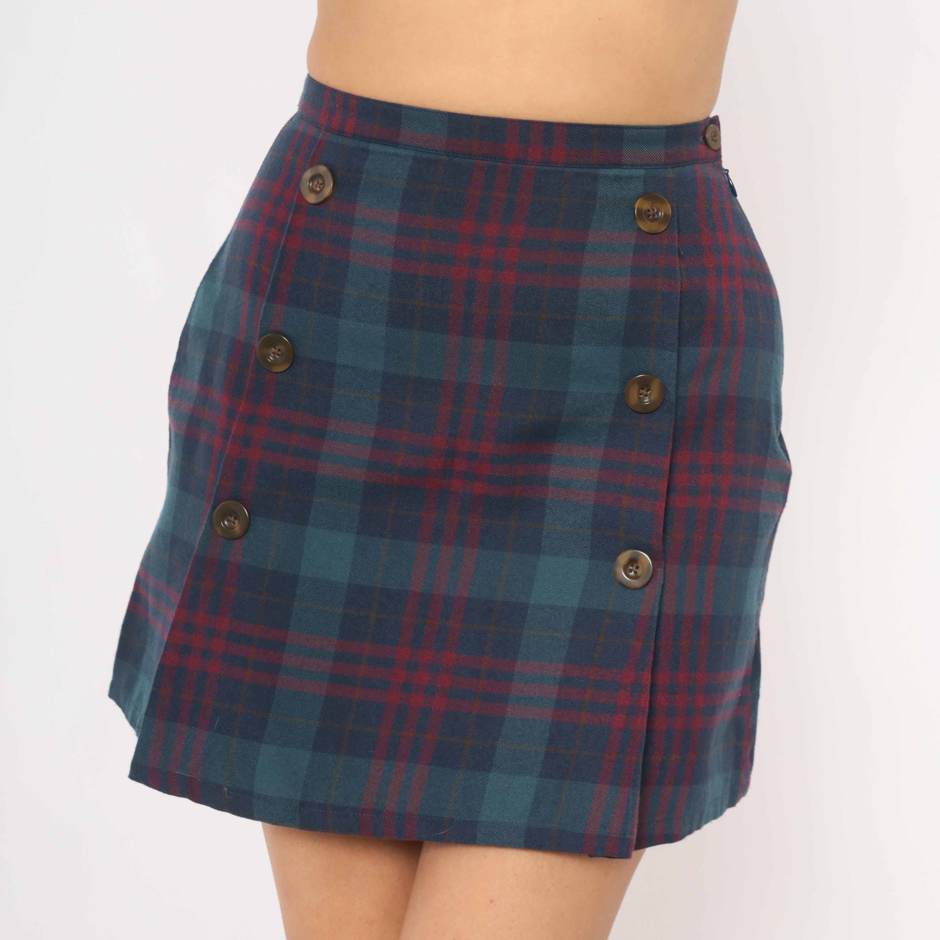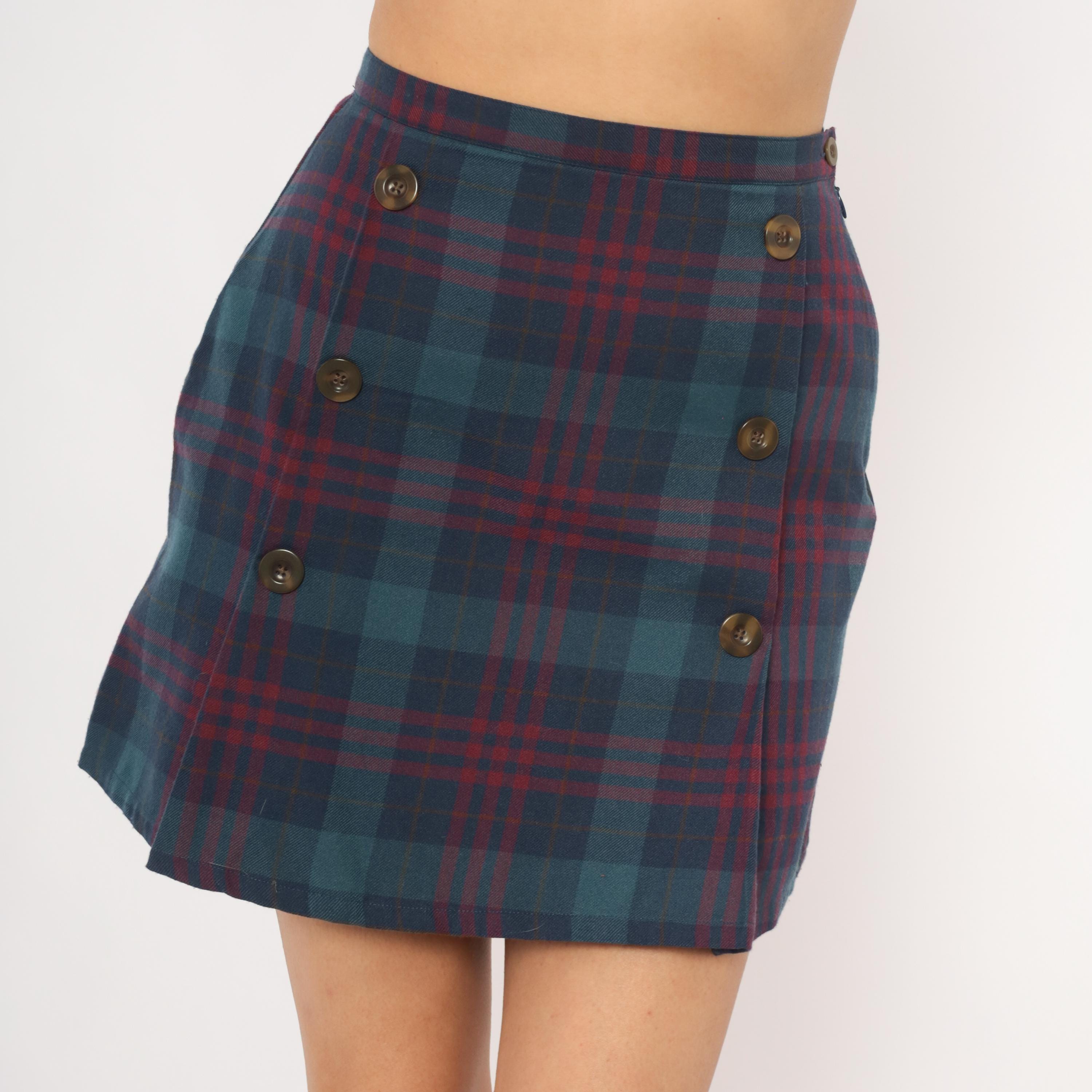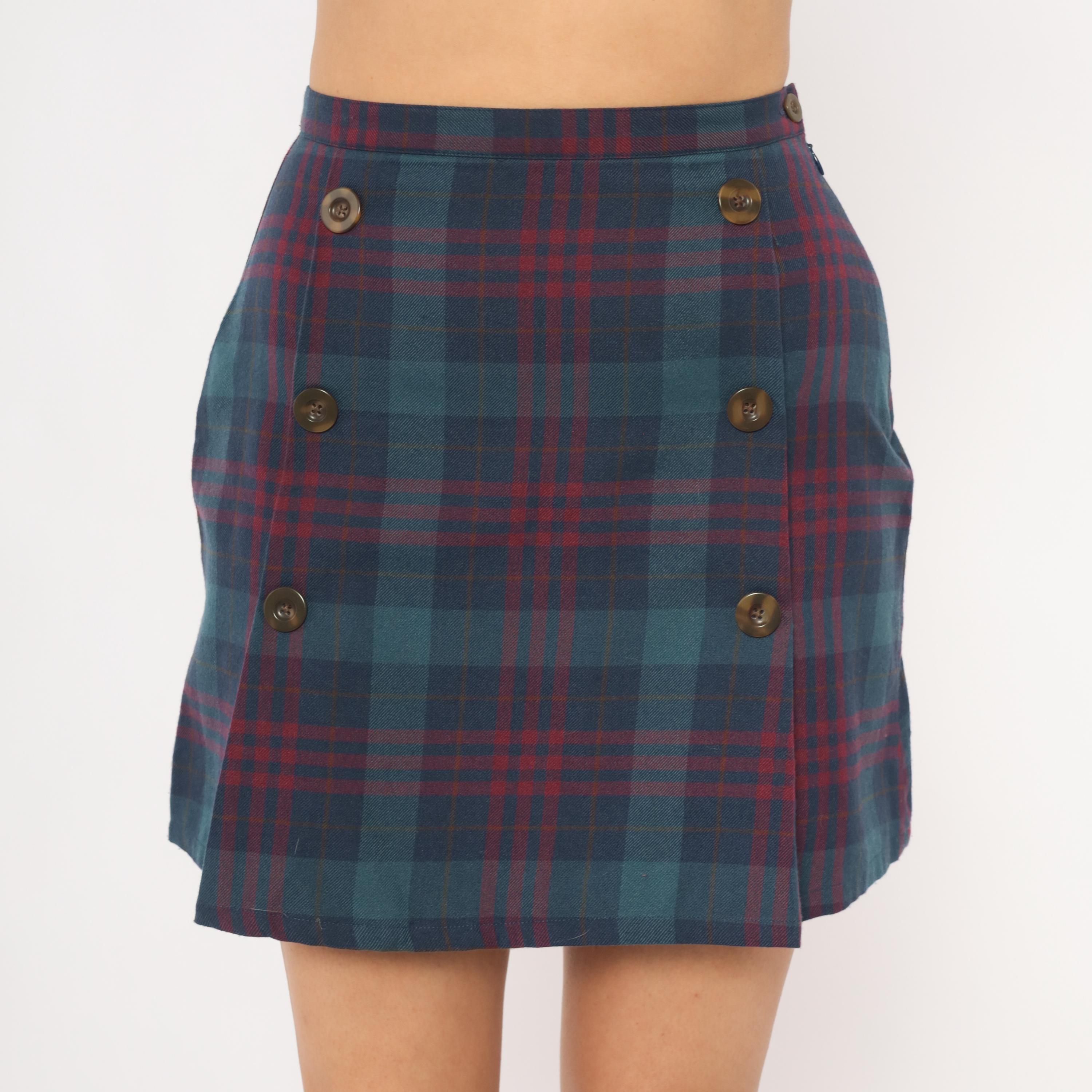 2000s plaid mini skirt from GAP in navy and burgundy tartan with double rows of brown buttons down the front. A-line silhouette with a wrap-style front panel, side zipper closure, and a slight kick pleat at the hem. Teal, wine, and dark blue tones throughout the woven plaid pattern.