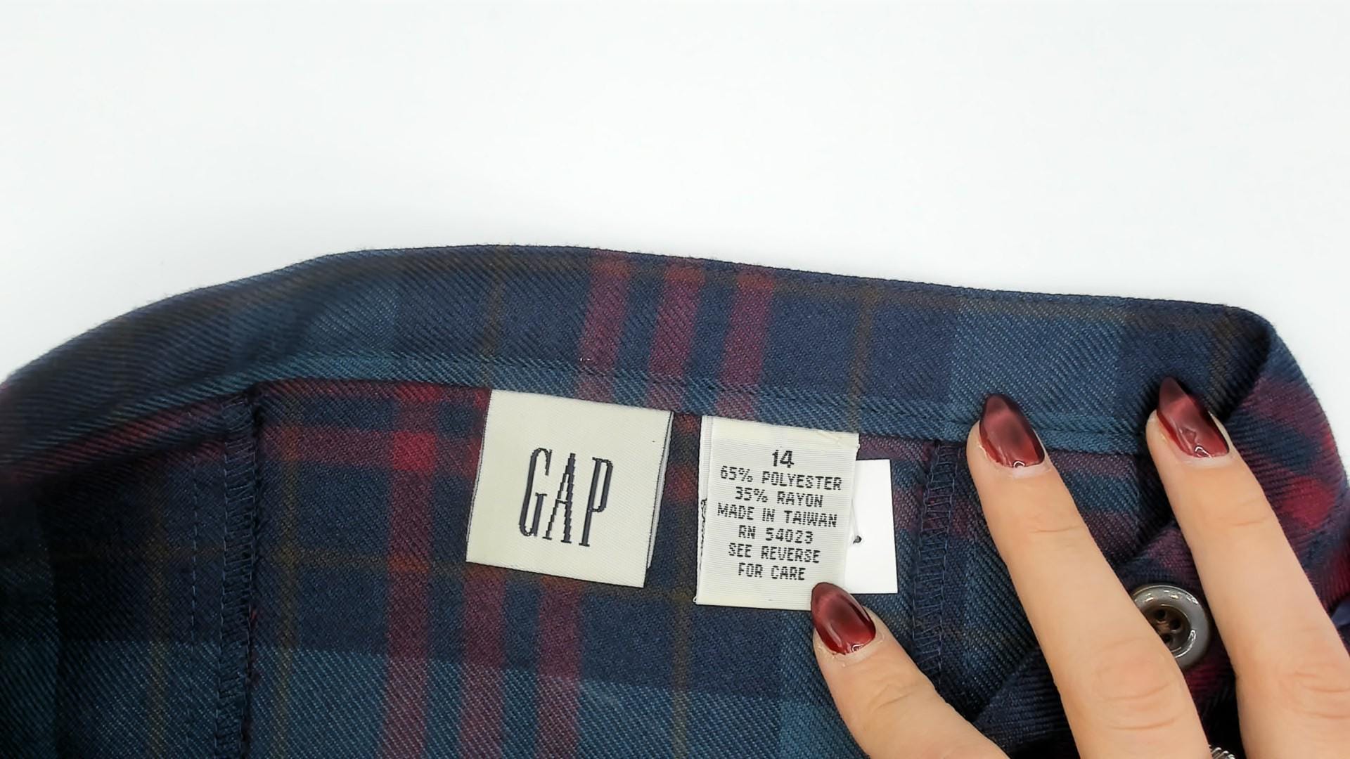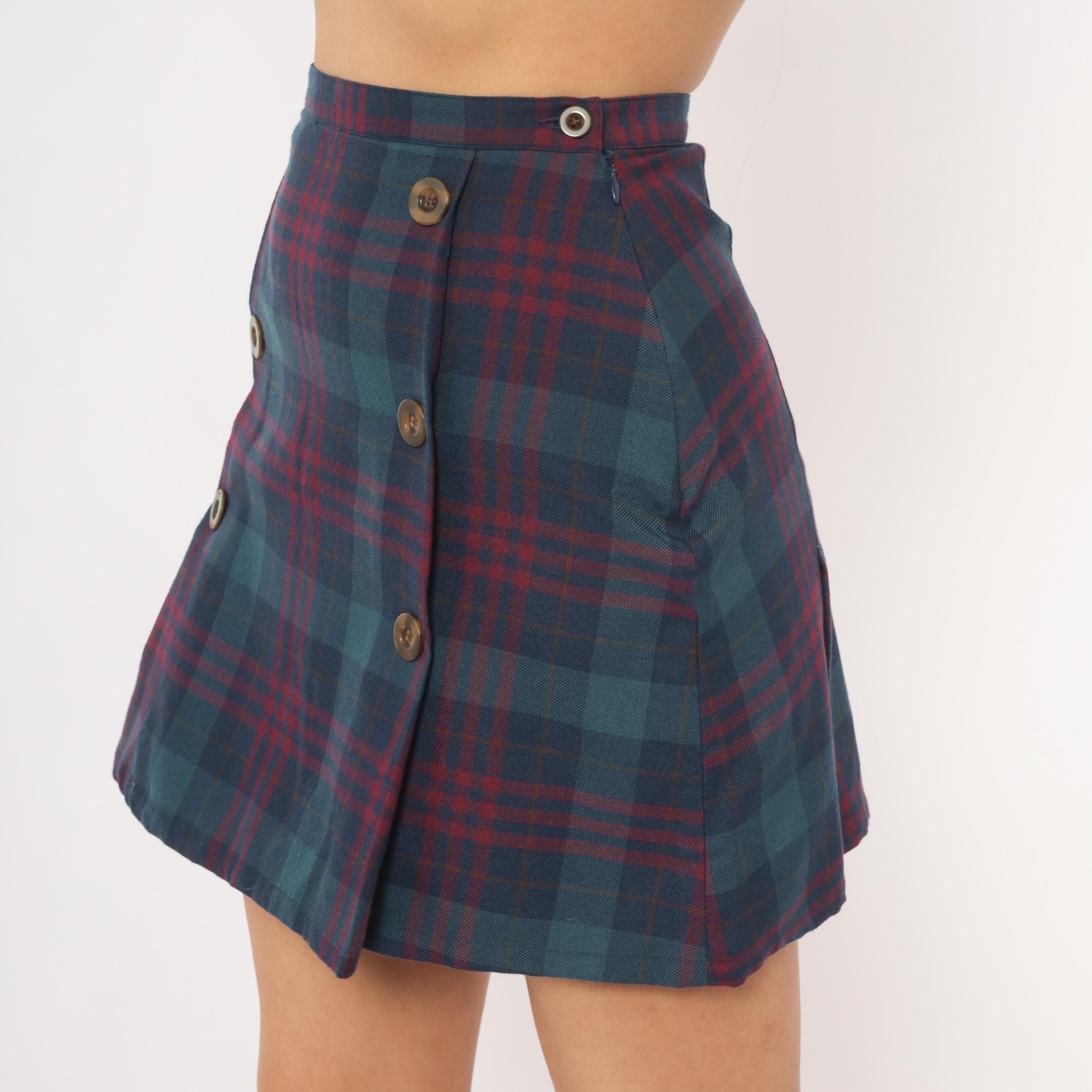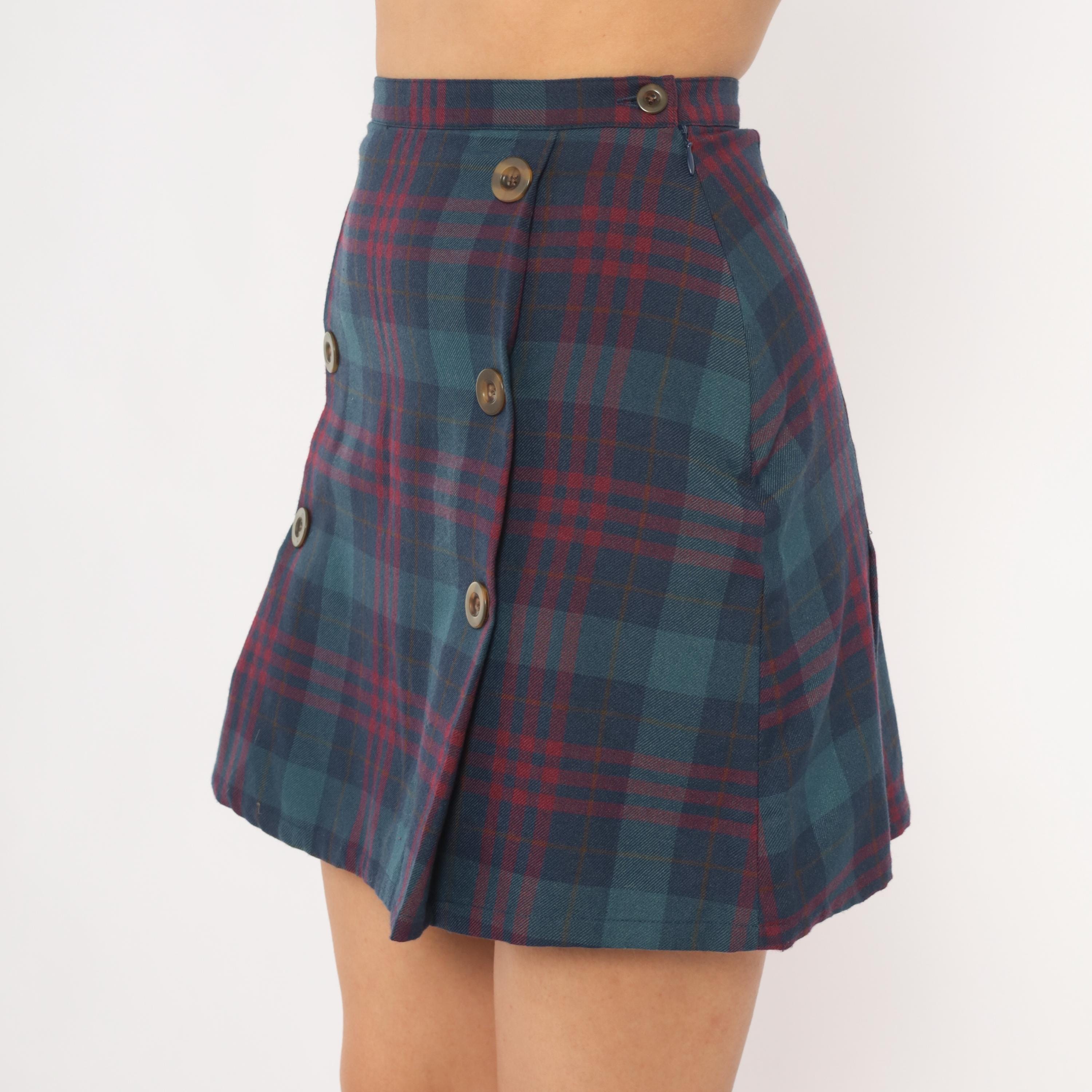 2000s plaid mini skirt from GAP in navy and burgundy tartan with double rows of brown buttons down the front. A-line silhouette with a wrap-style front panel, side zipper closure, and a slight kick pleat at the hem. Teal, wine, and dark blue tones throughout the woven plaid pattern.