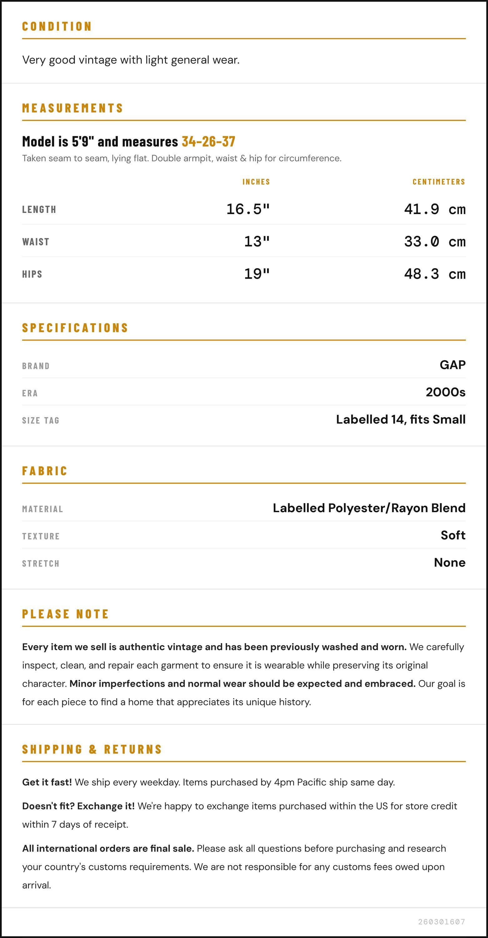 Vintage denim was usually made without any stretch, unlike modern jeans. Check the measurements to ensure proper fit, and remember to give yourself a little wiggle room in the waist and hips, depending on your preferred fit.