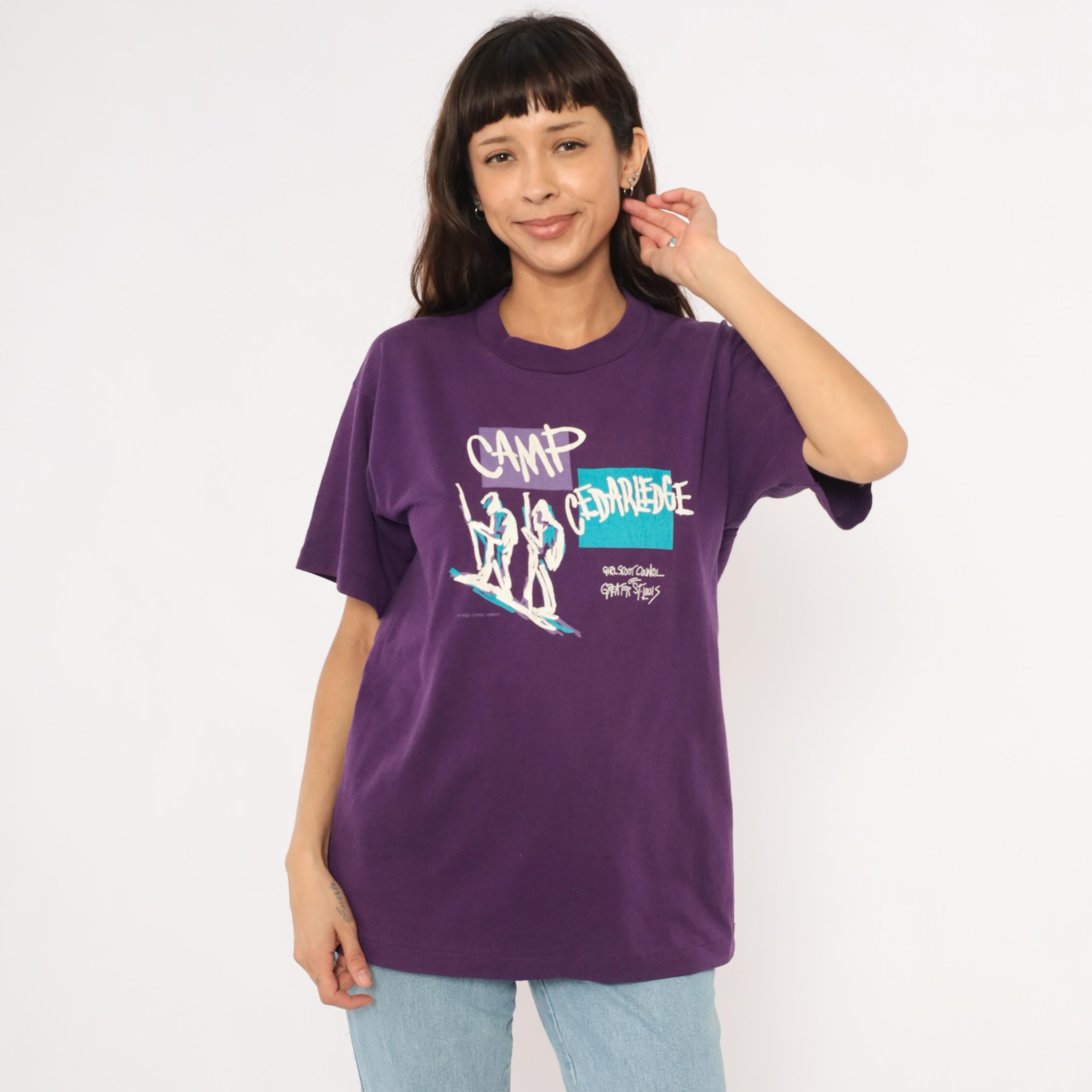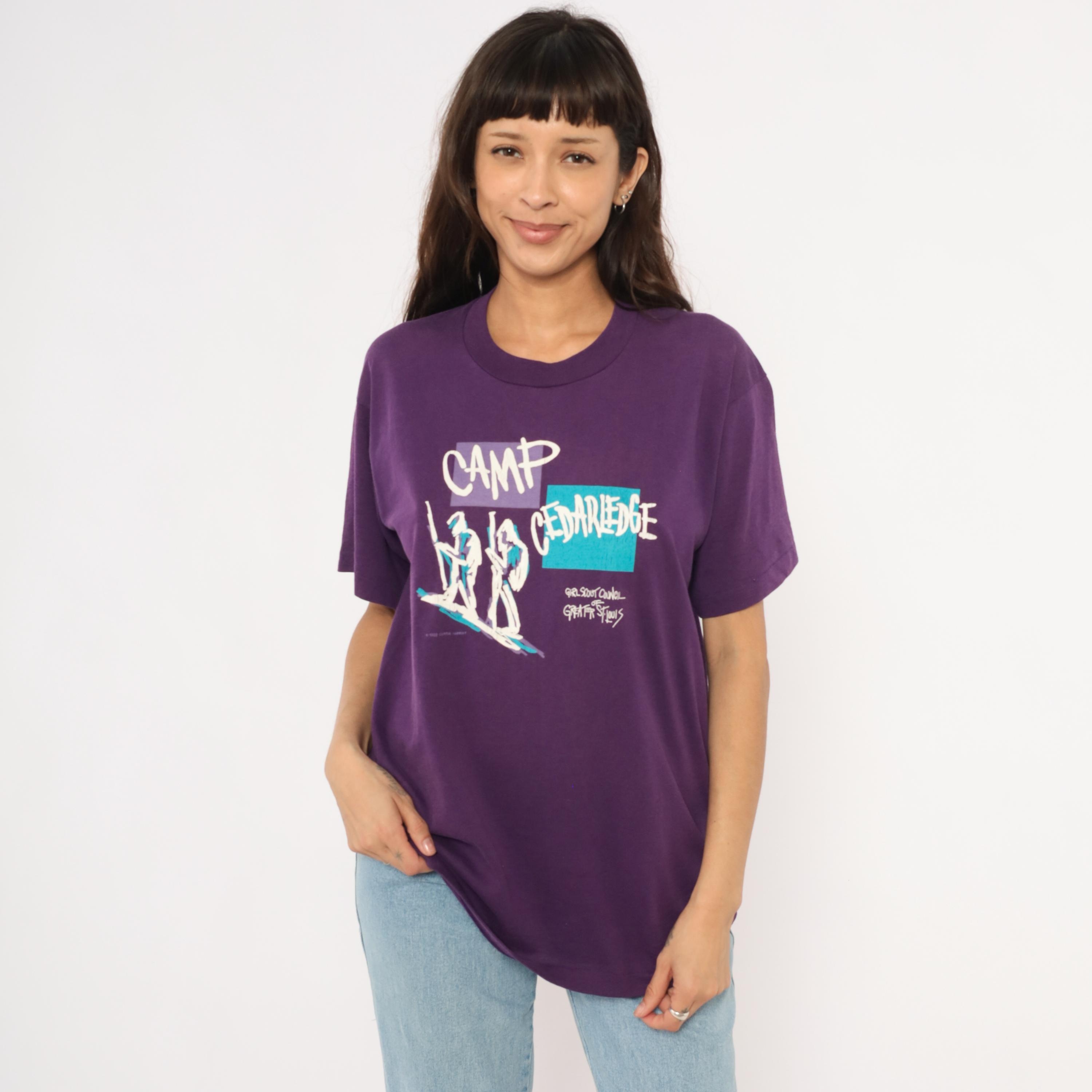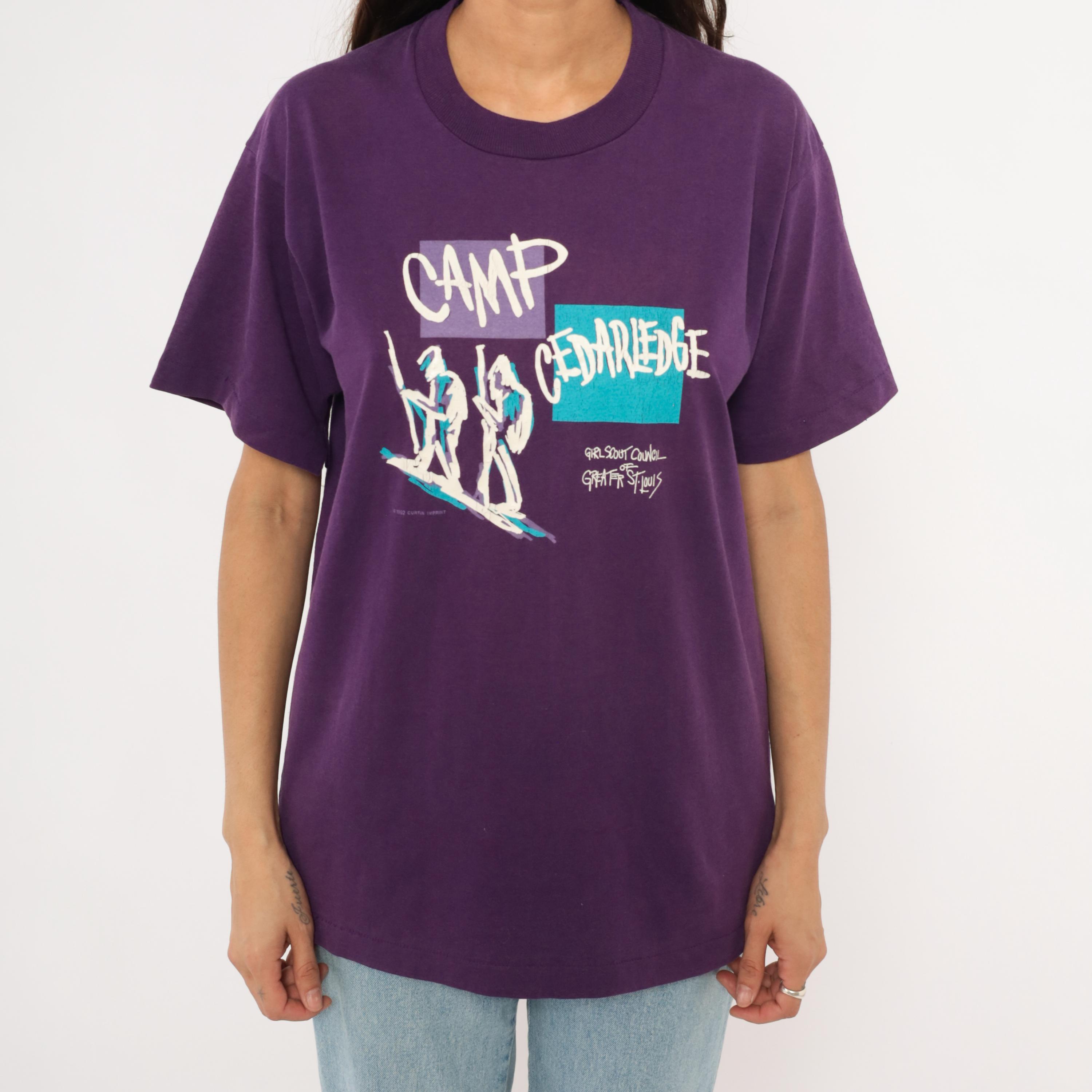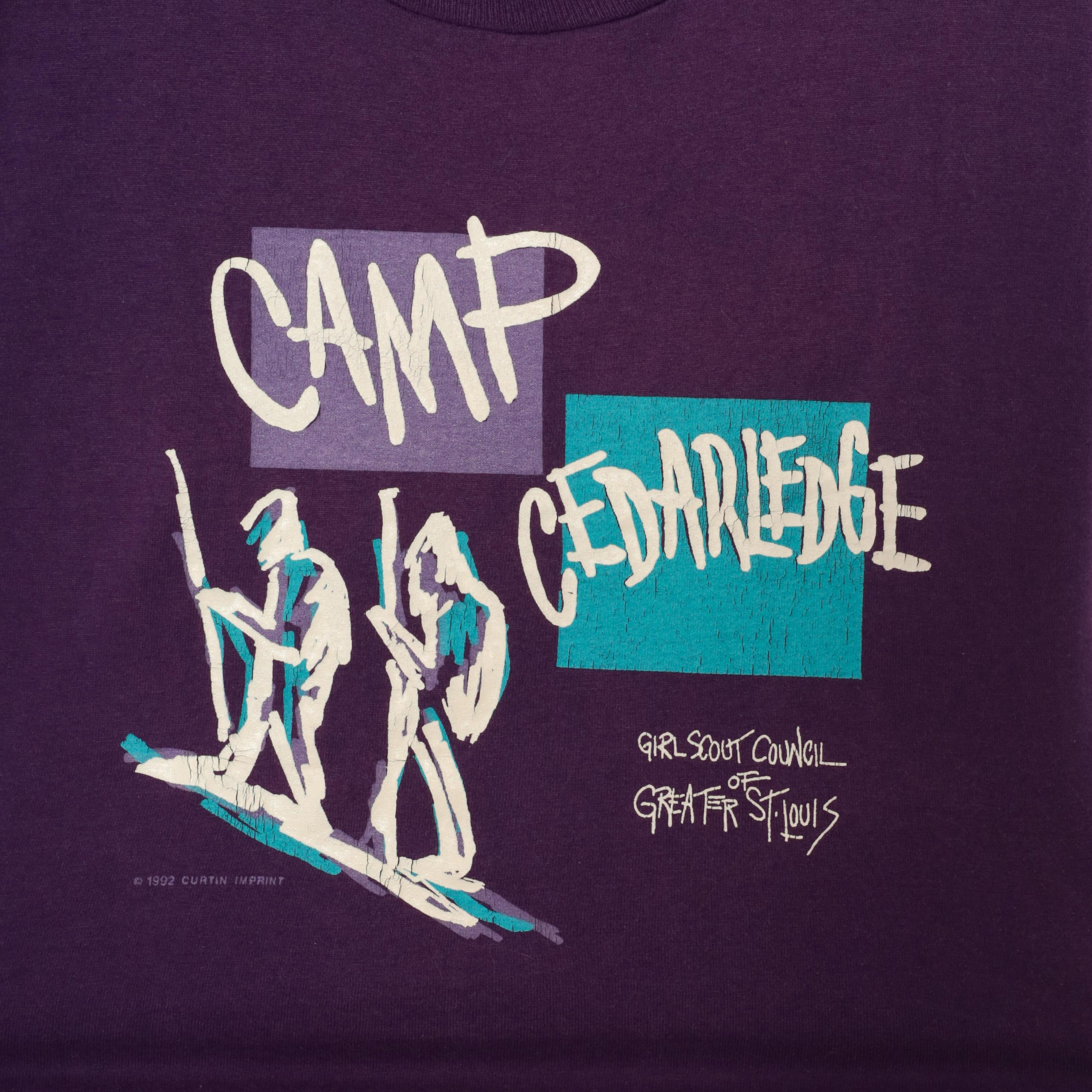 90s purple graphic tee from Screen Stars Best printed with "Camp Cedarledge" and the Girl Scout Council of Greater St. Louis, dated 1992. White, teal, and lavender screen print depicting two hikers with walking sticks against color-blocked rectangles.