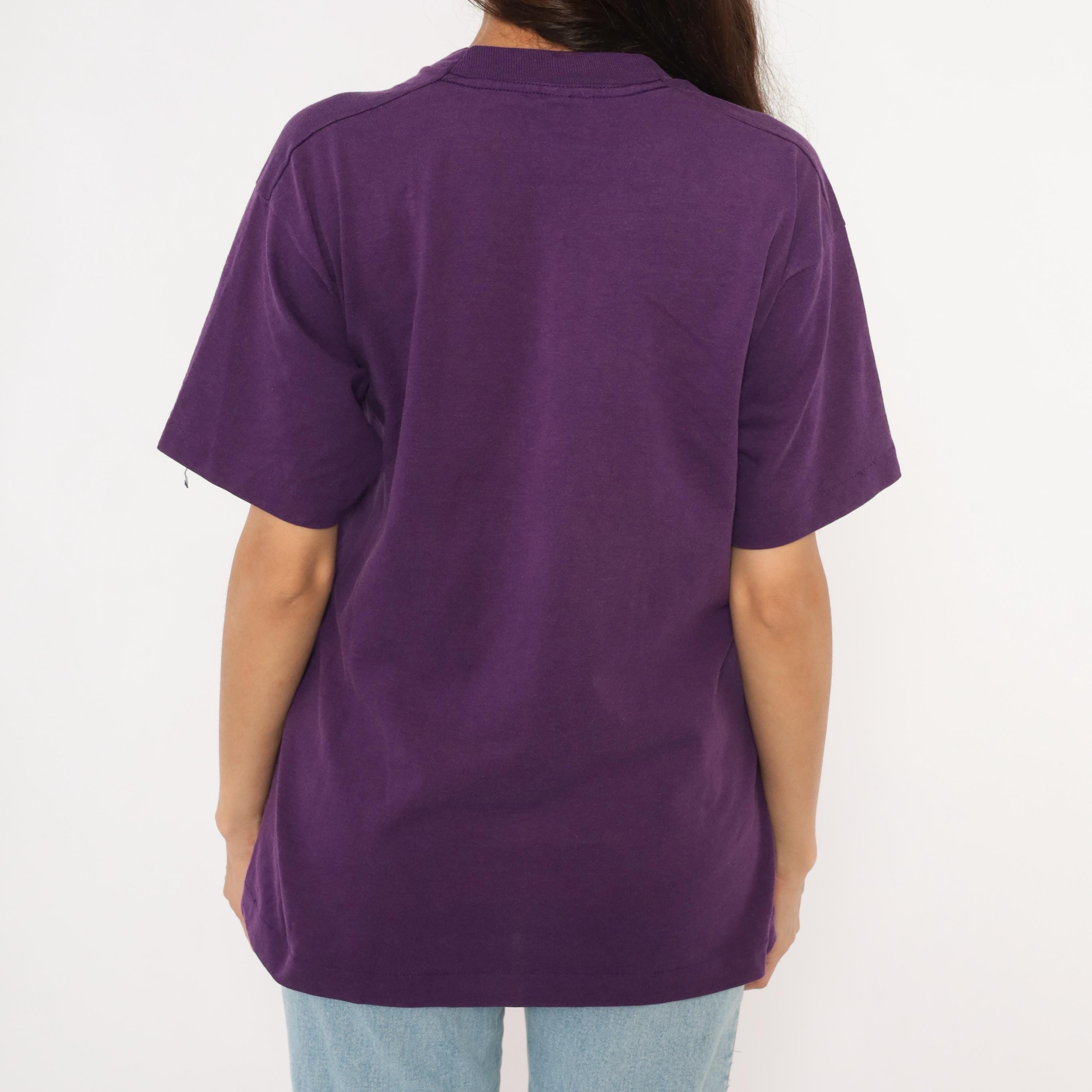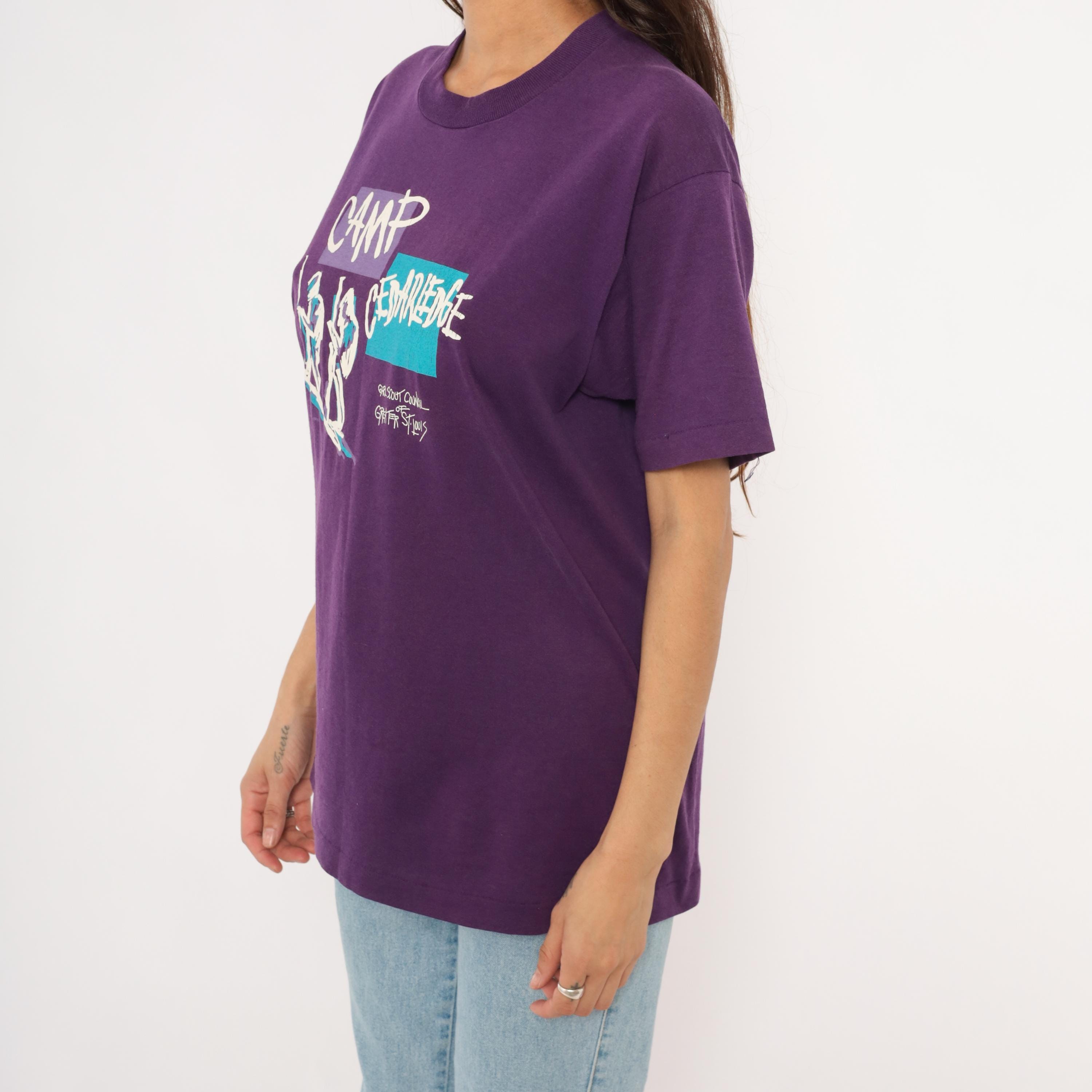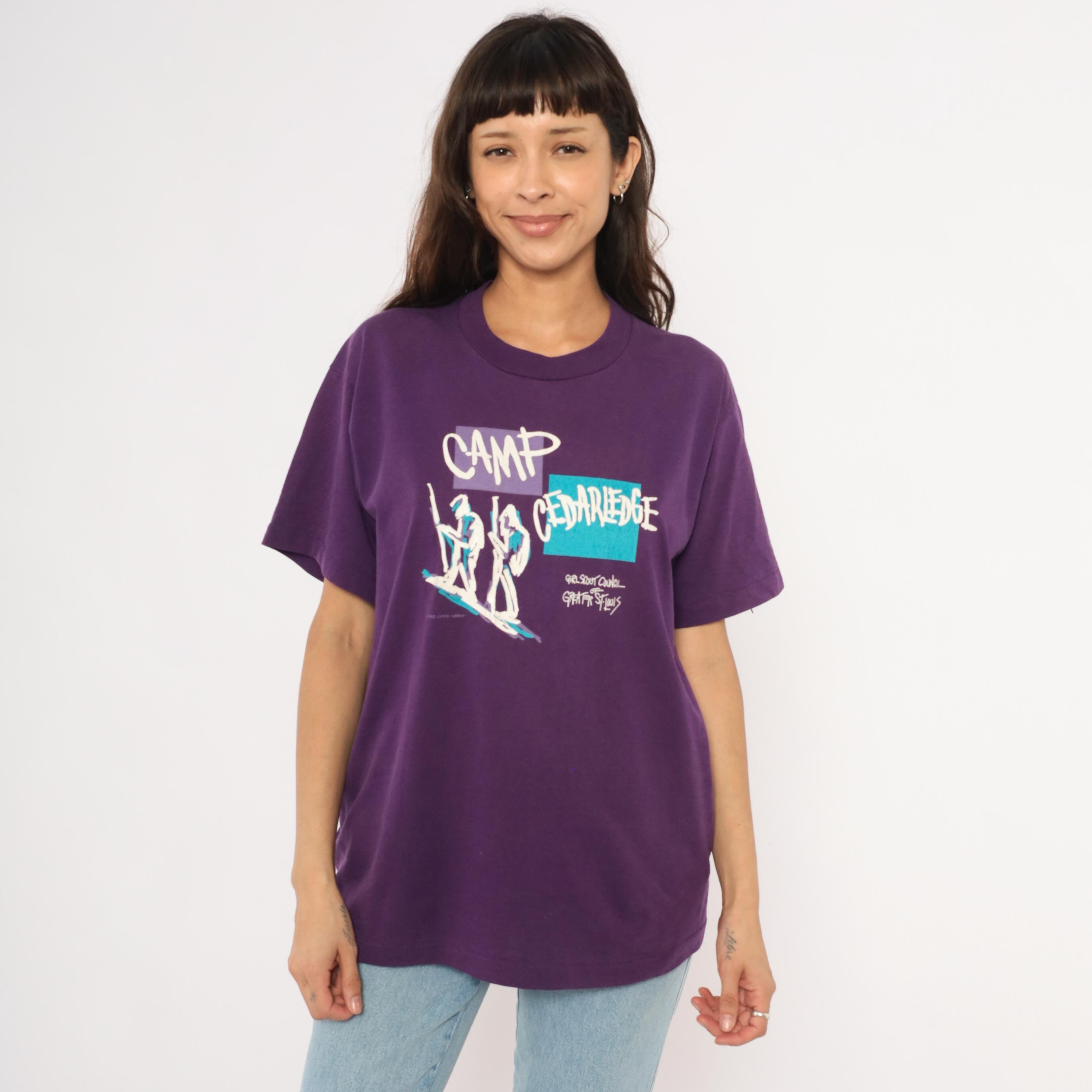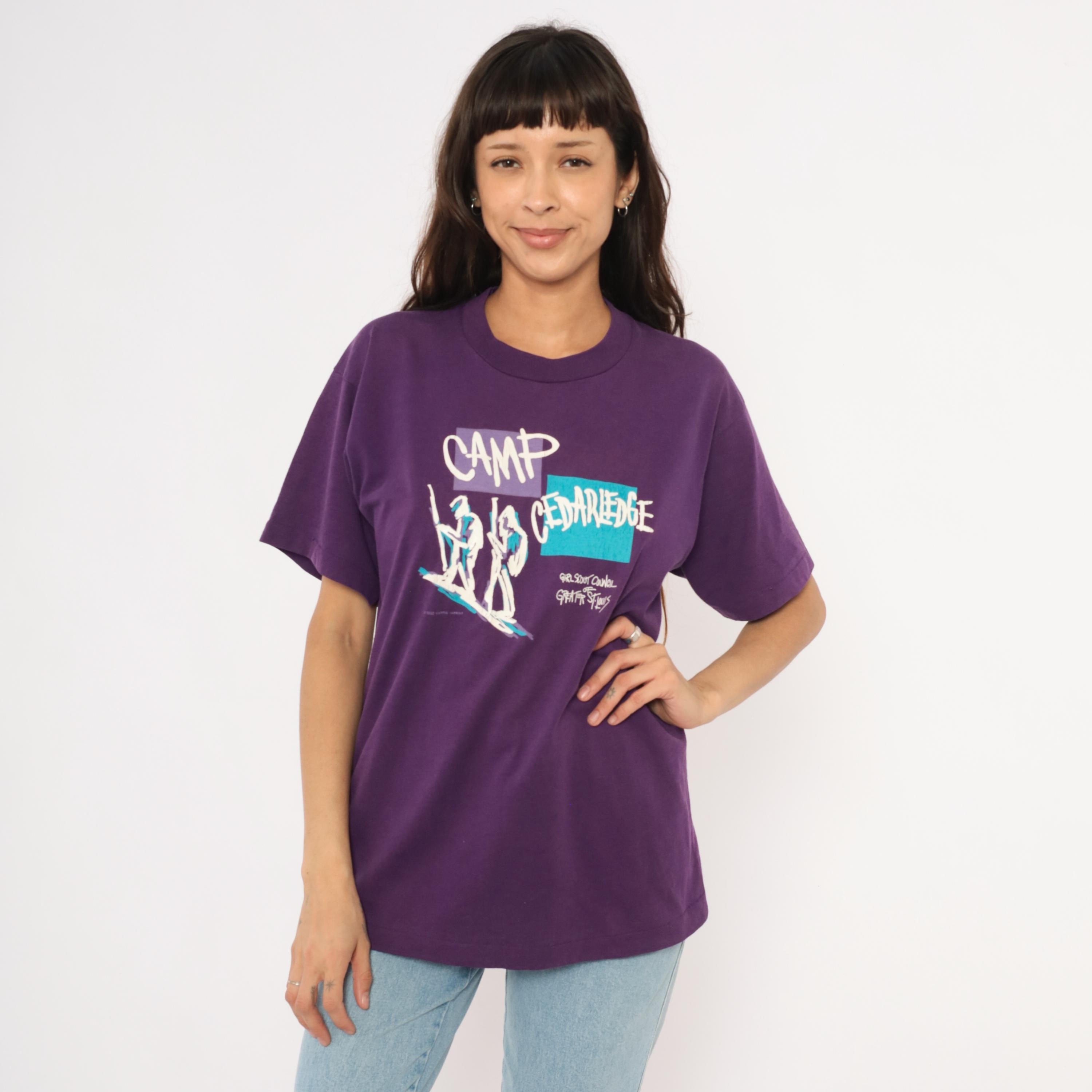 90s purple graphic tee from Screen Stars Best printed with "Camp Cedarledge" and the Girl Scout Council of Greater St. Louis, dated 1992. White, teal, and lavender screen print depicting two hikers with walking sticks against color-blocked rectangles.