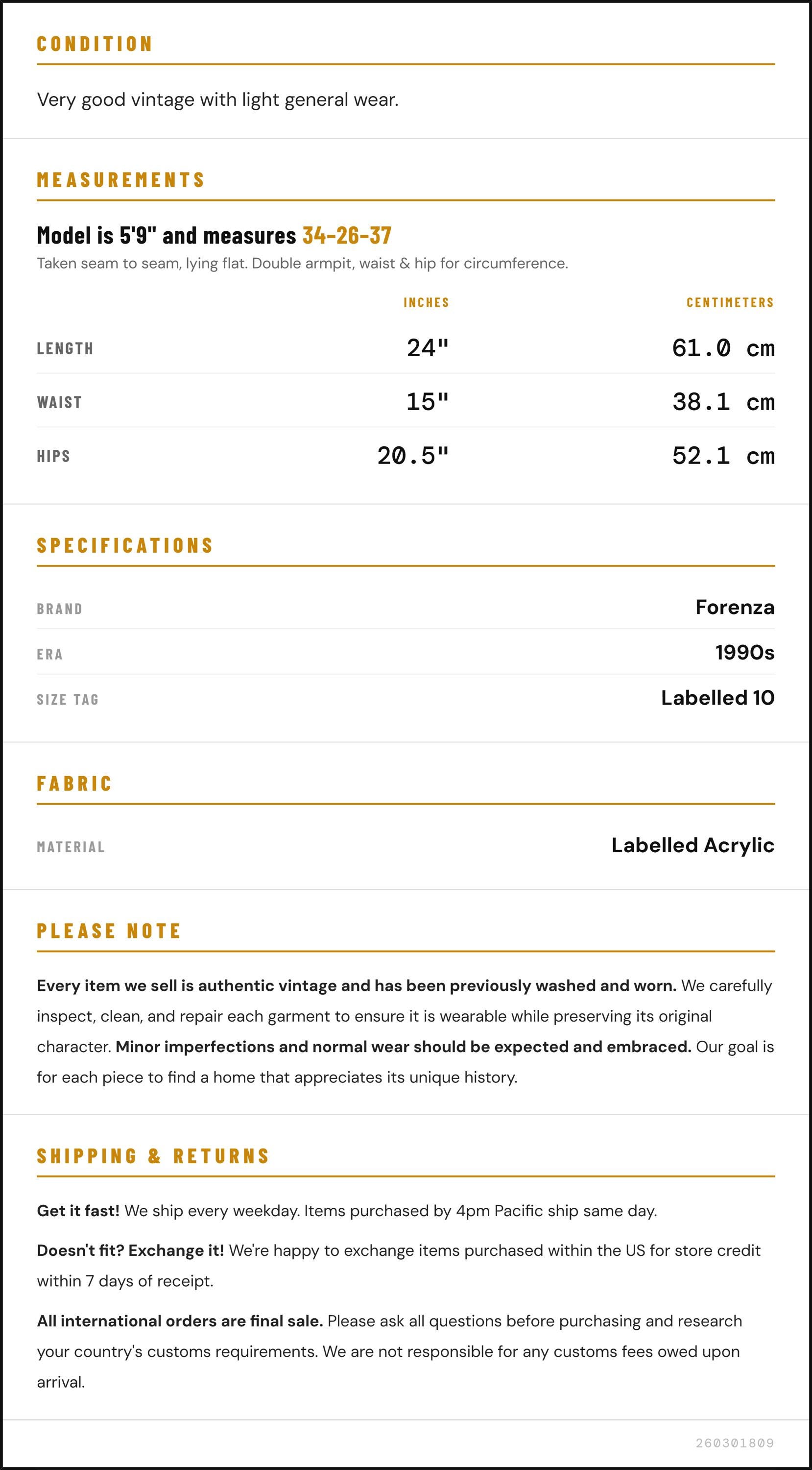 Vintage denim was usually made without any stretch, unlike modern jeans. Check the measurements to ensure proper fit, and remember to give yourself a little wiggle room in the waist and hips, depending on your preferred fit.
