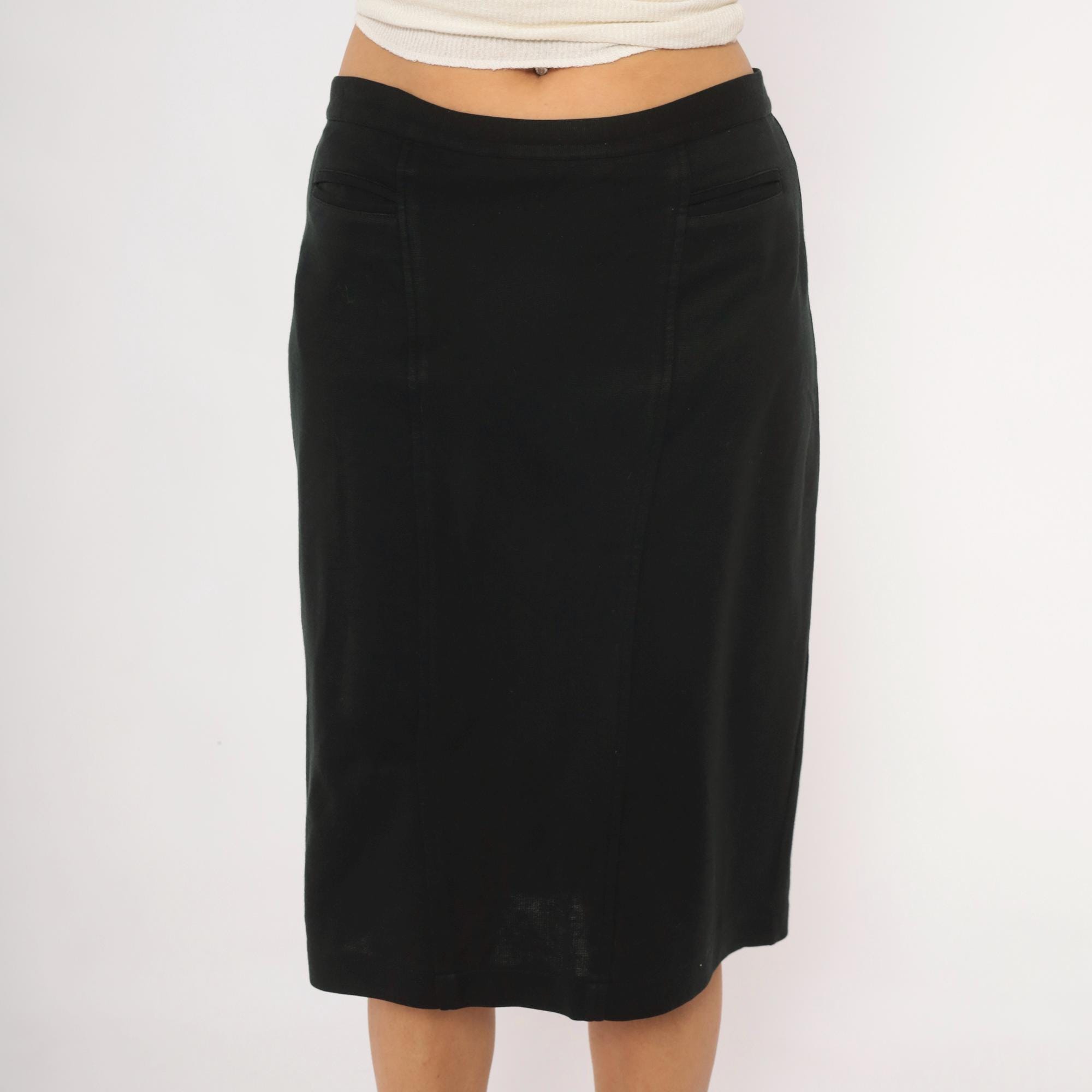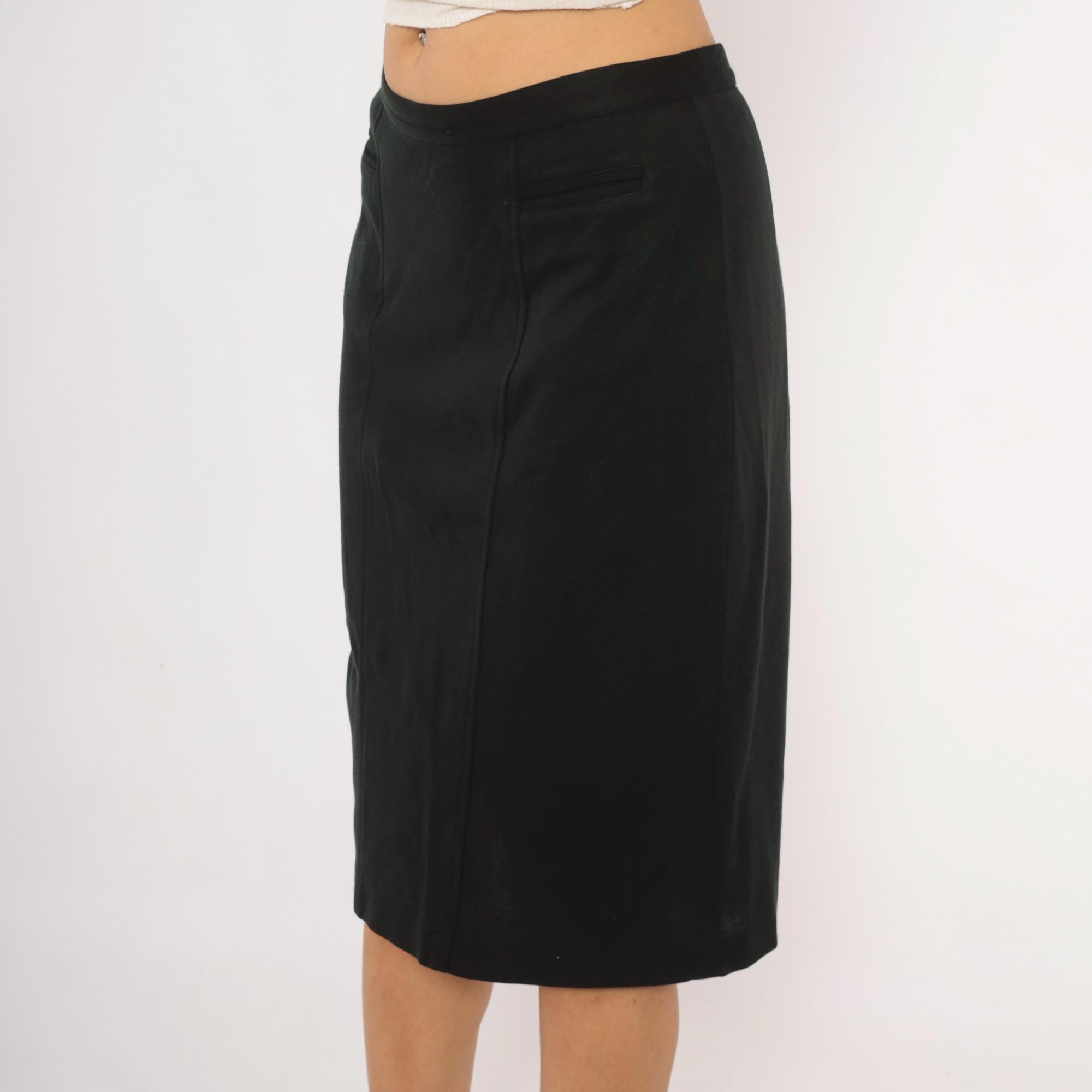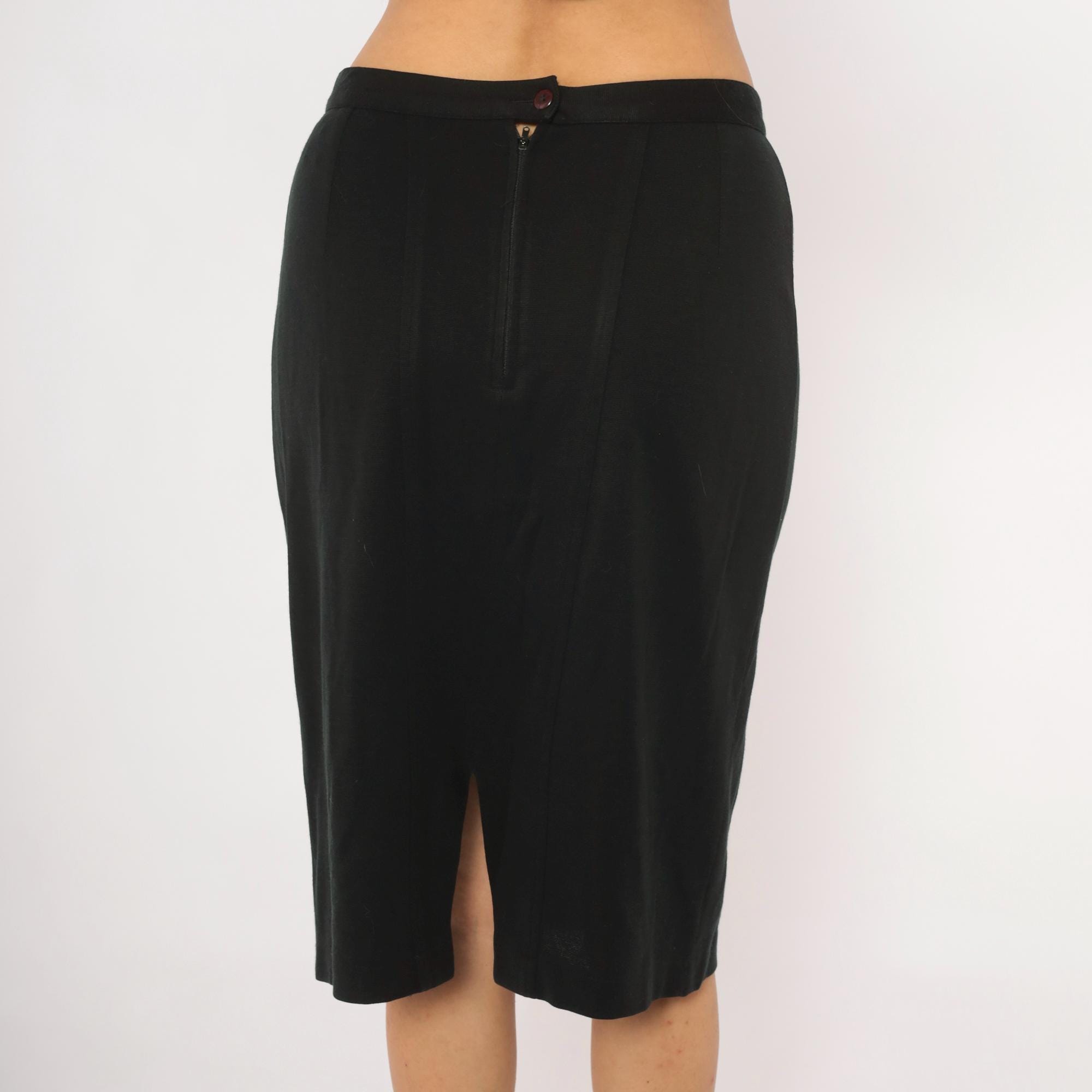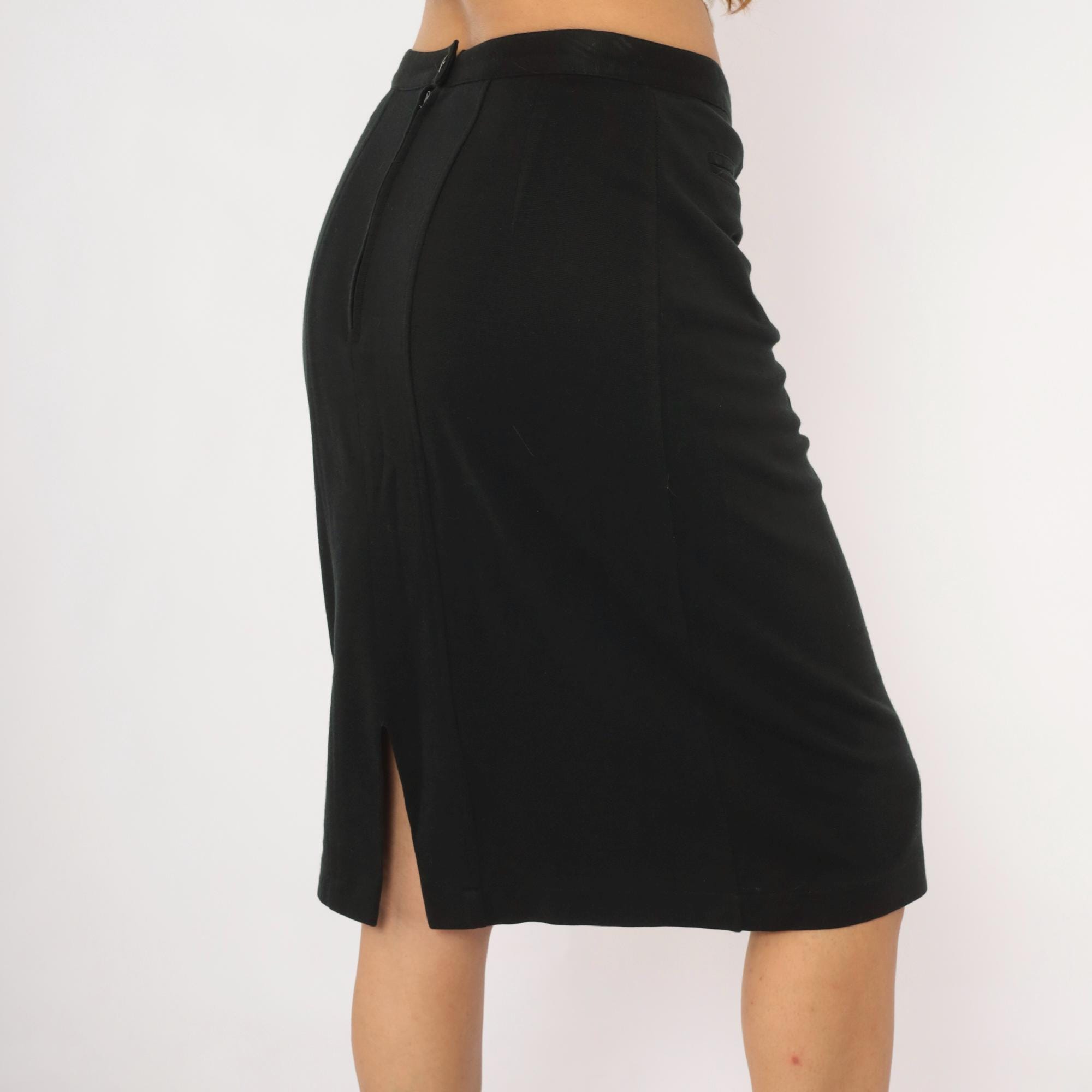90s black pencil skirt from Forenza with a fitted waist and knee-length hem. Back zipper closure with single button at the waistband, and a center back slit. Two welt pockets at the front waist, with panel seaming down the front and back.