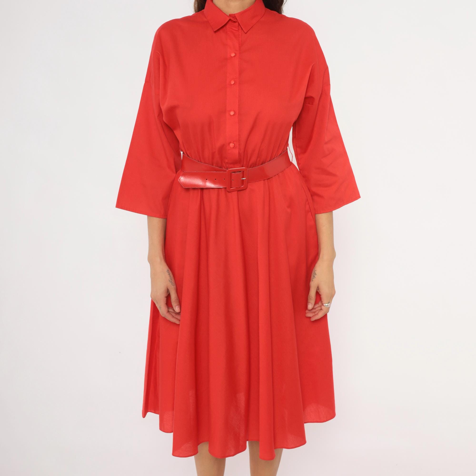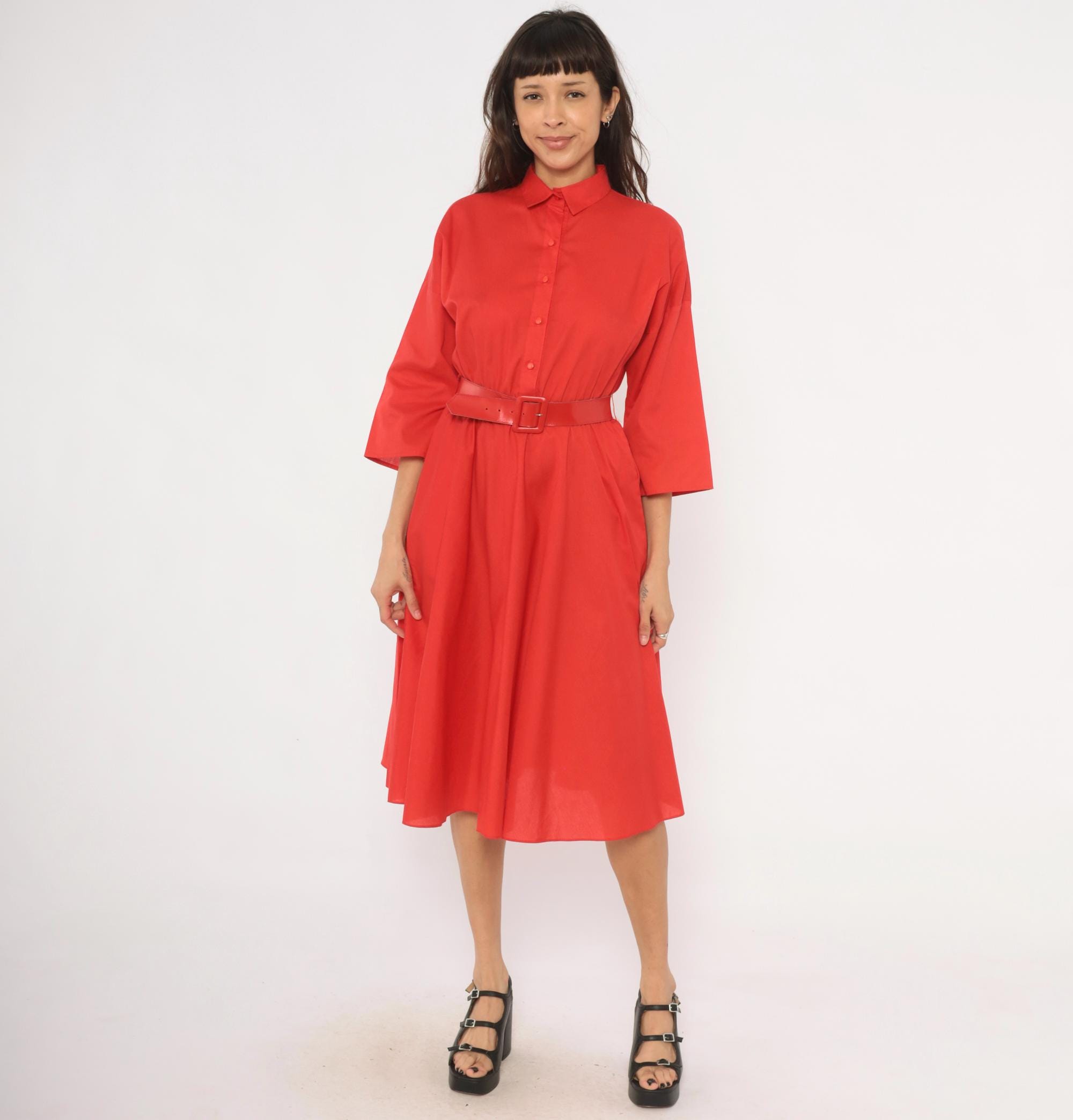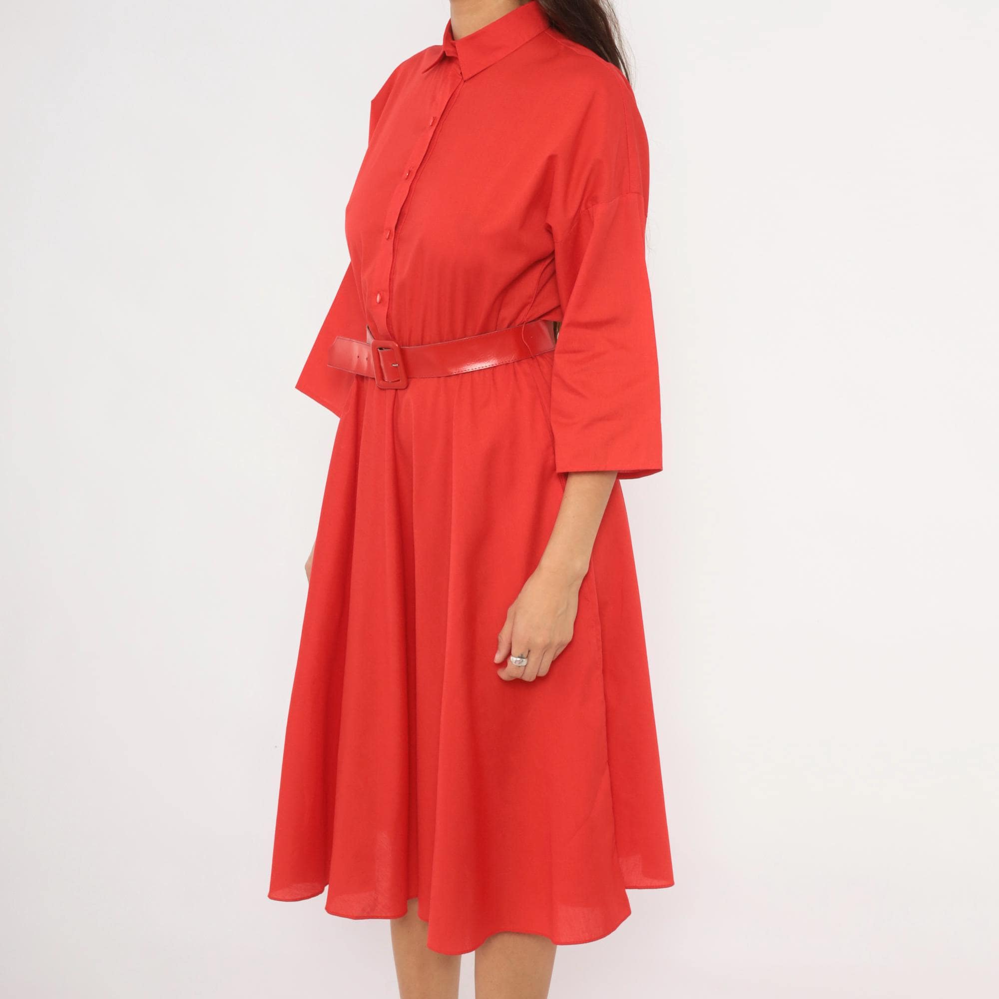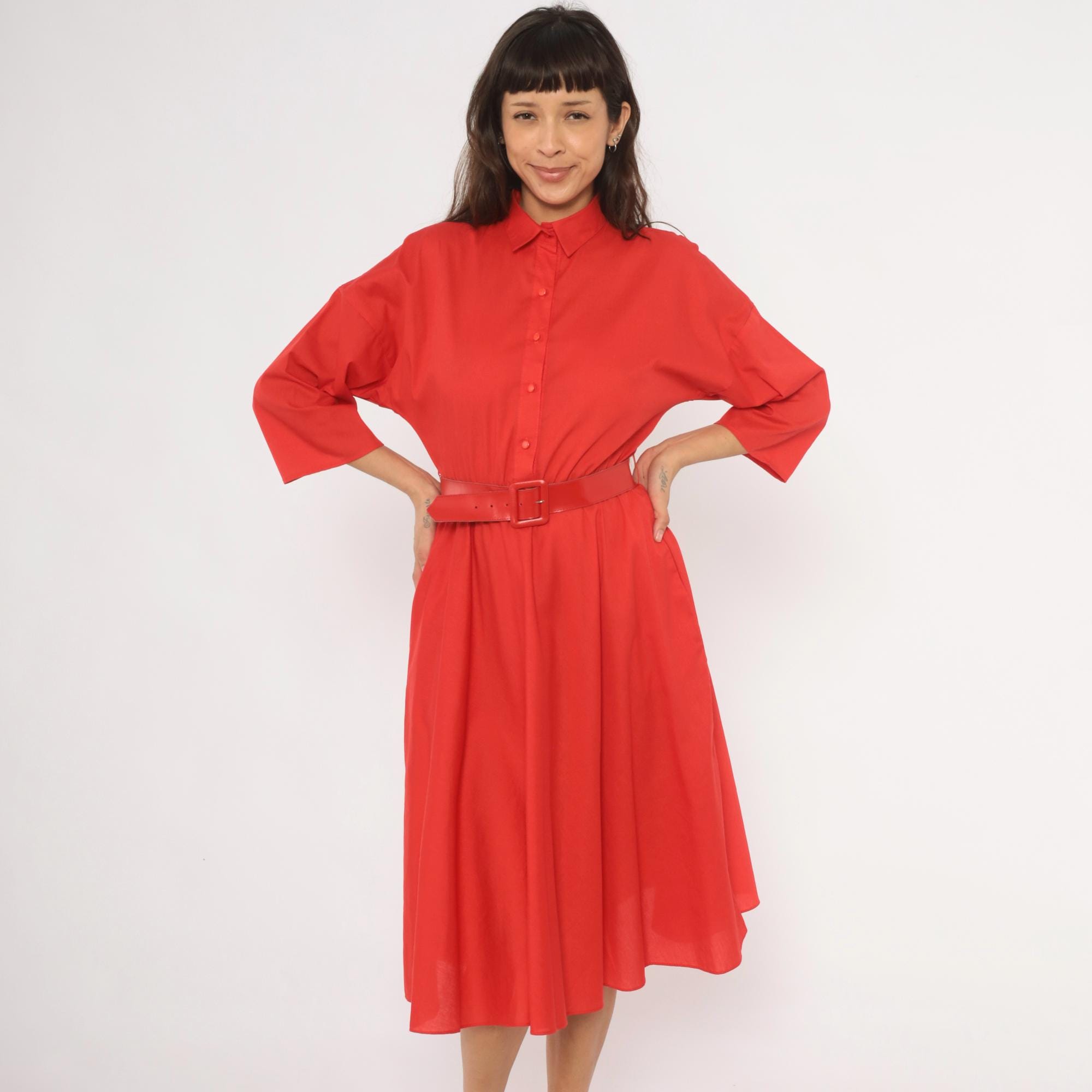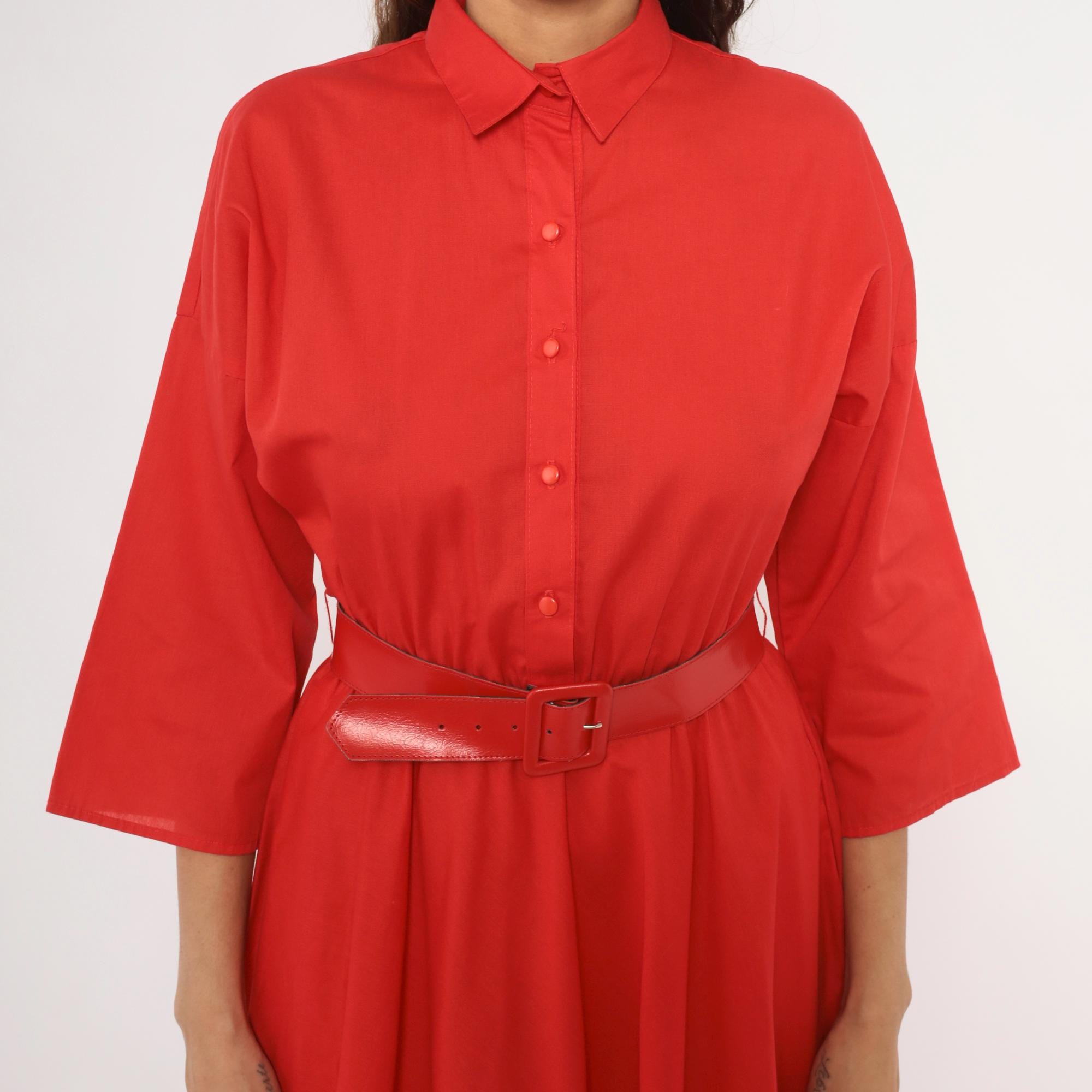 80s red shirt dress from The American Shirt Dress with a pointed collar and front button closure down the bodice. Three-quarter length bell sleeves, gathered waist with a matching red leather belt and square buckle.