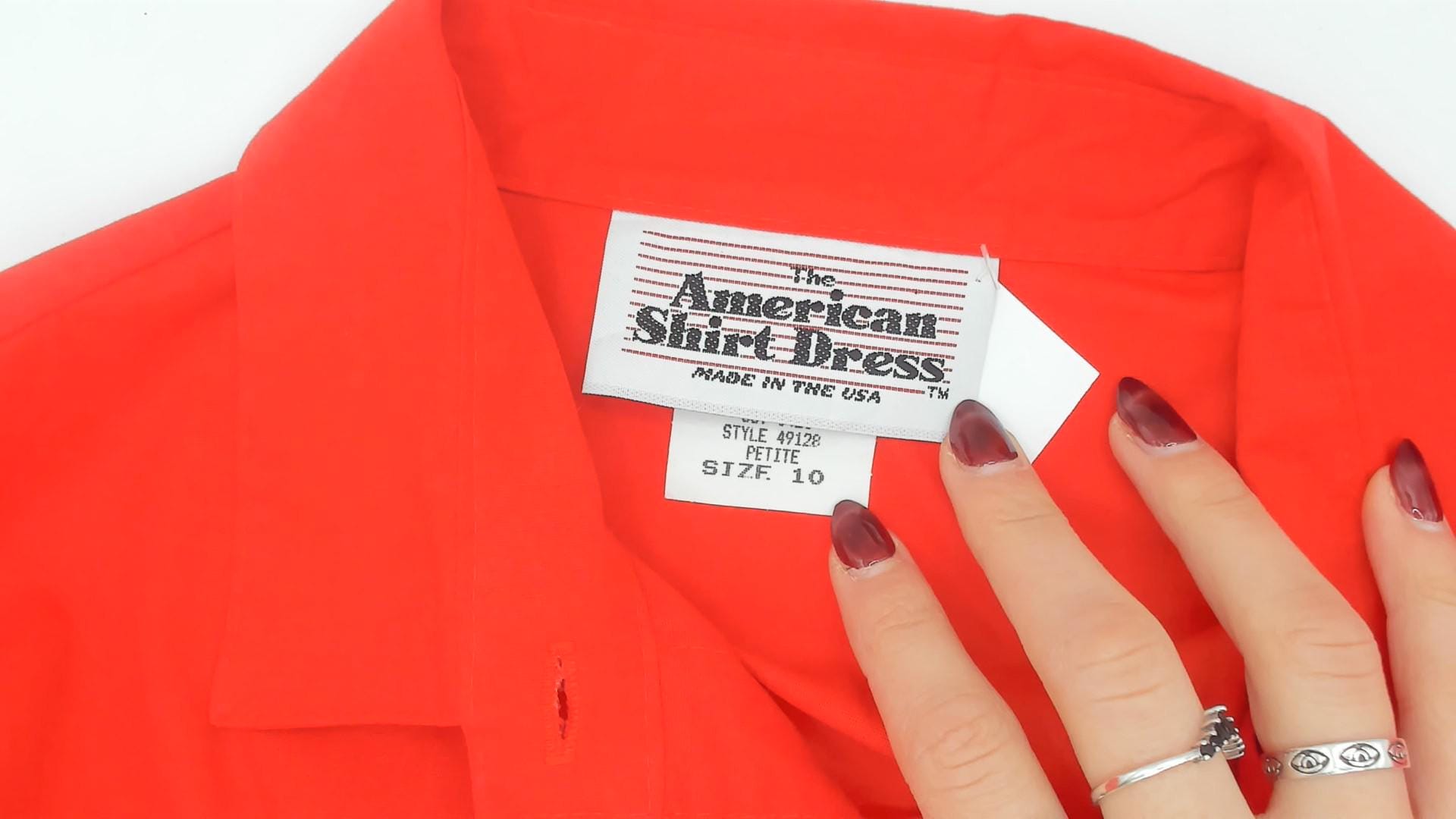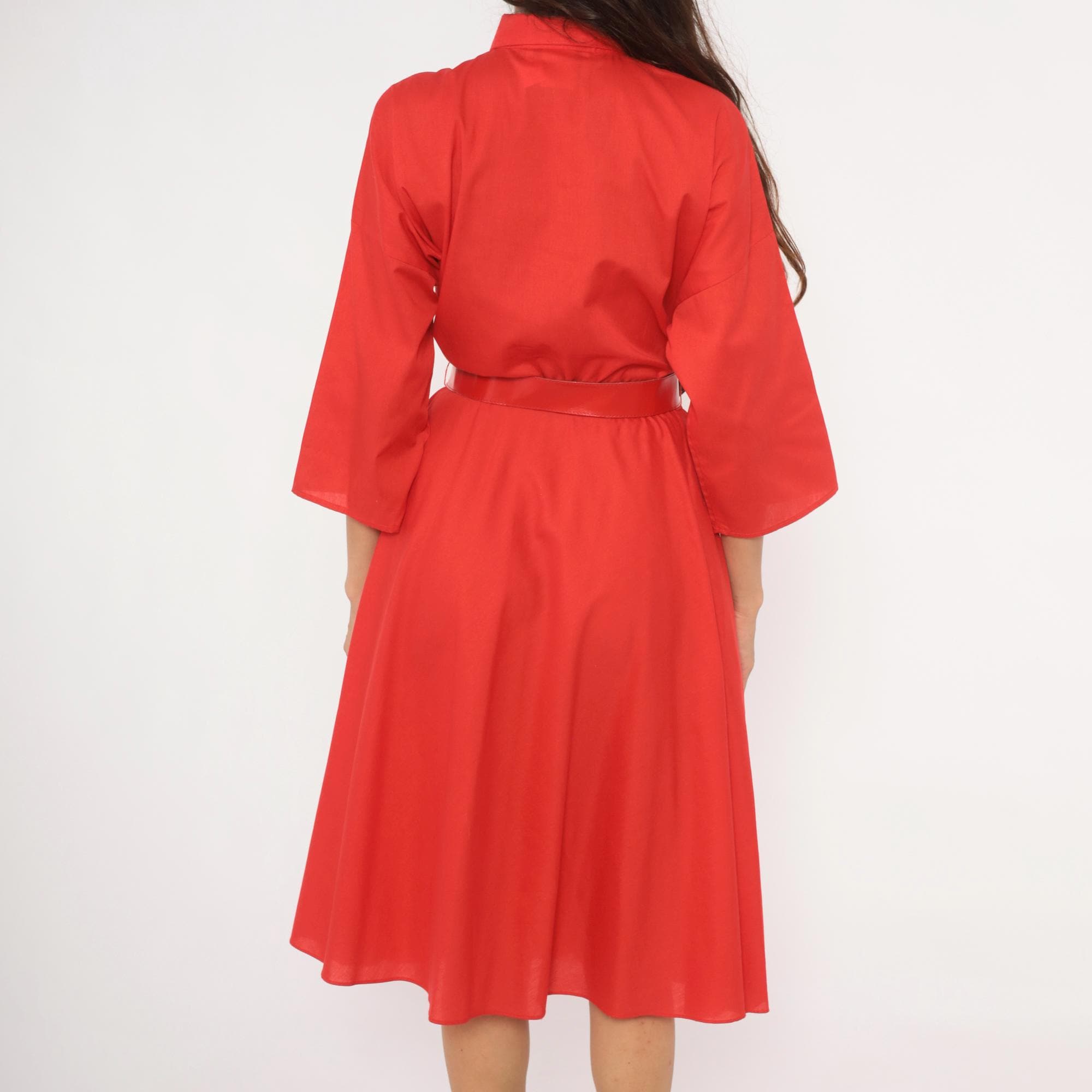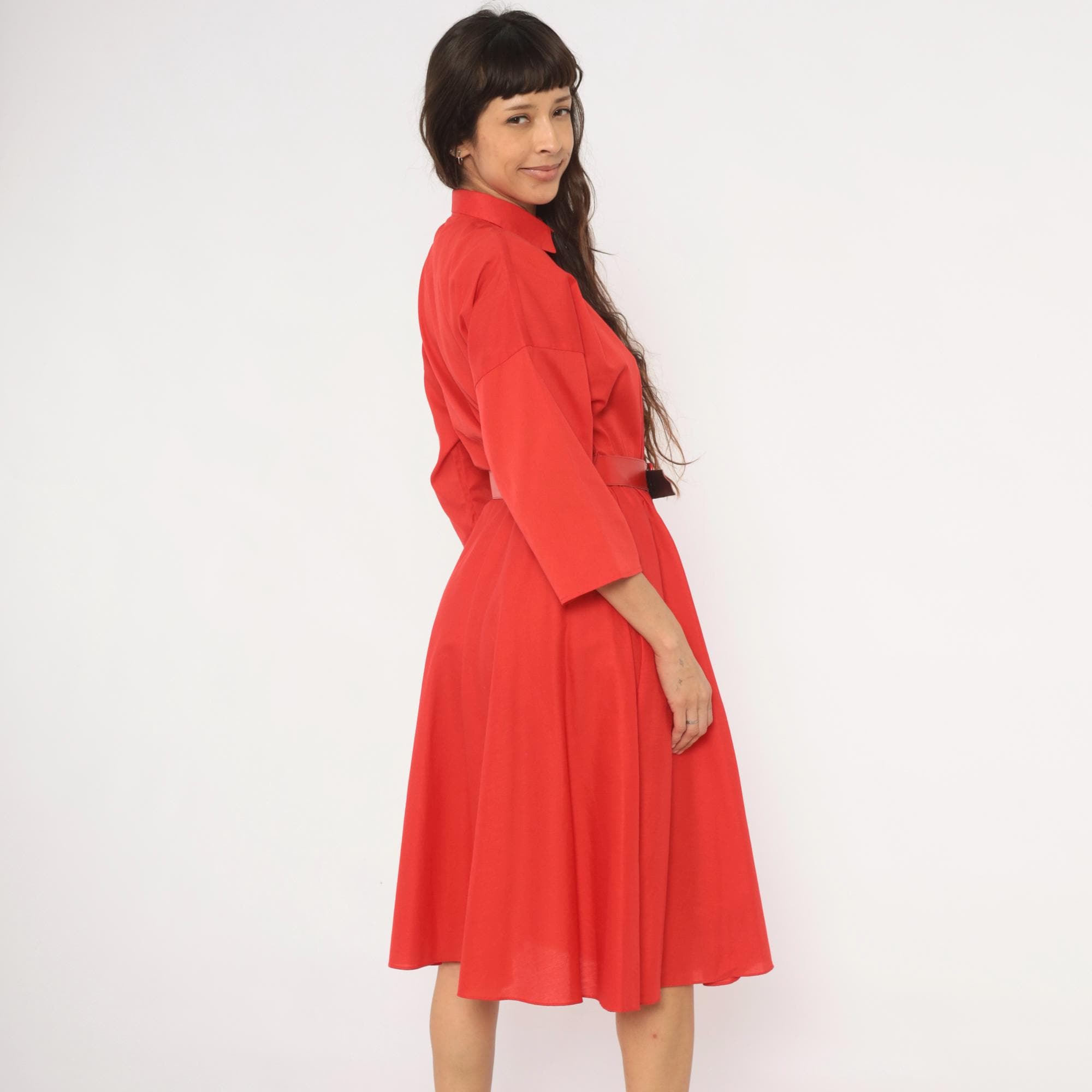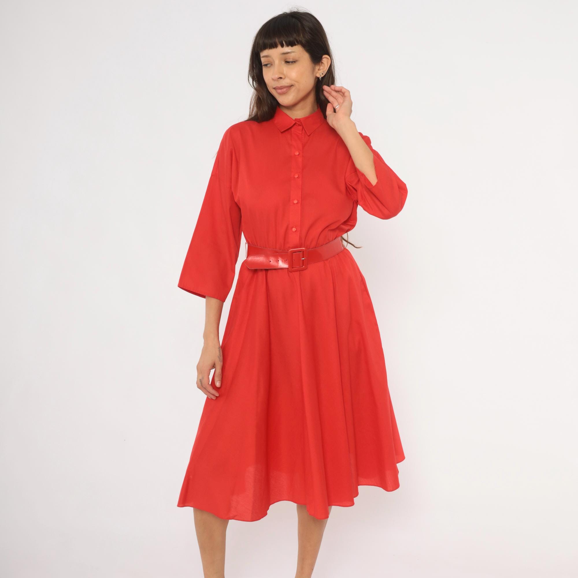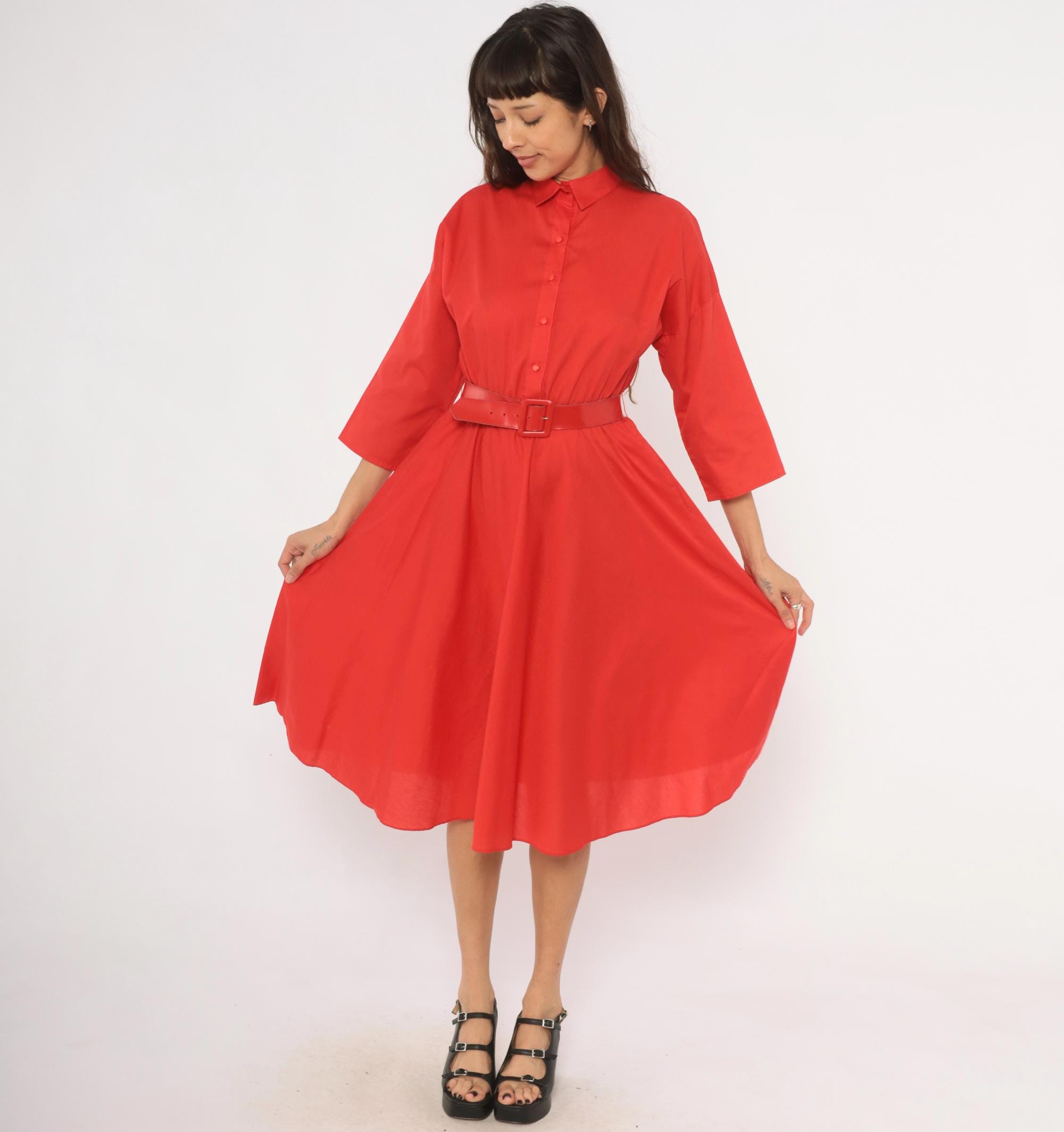 80s red shirt dress from The American Shirt Dress with a pointed collar and front button closure down the bodice. Three-quarter length bell sleeves, gathered waist with a matching red leather belt and square buckle.