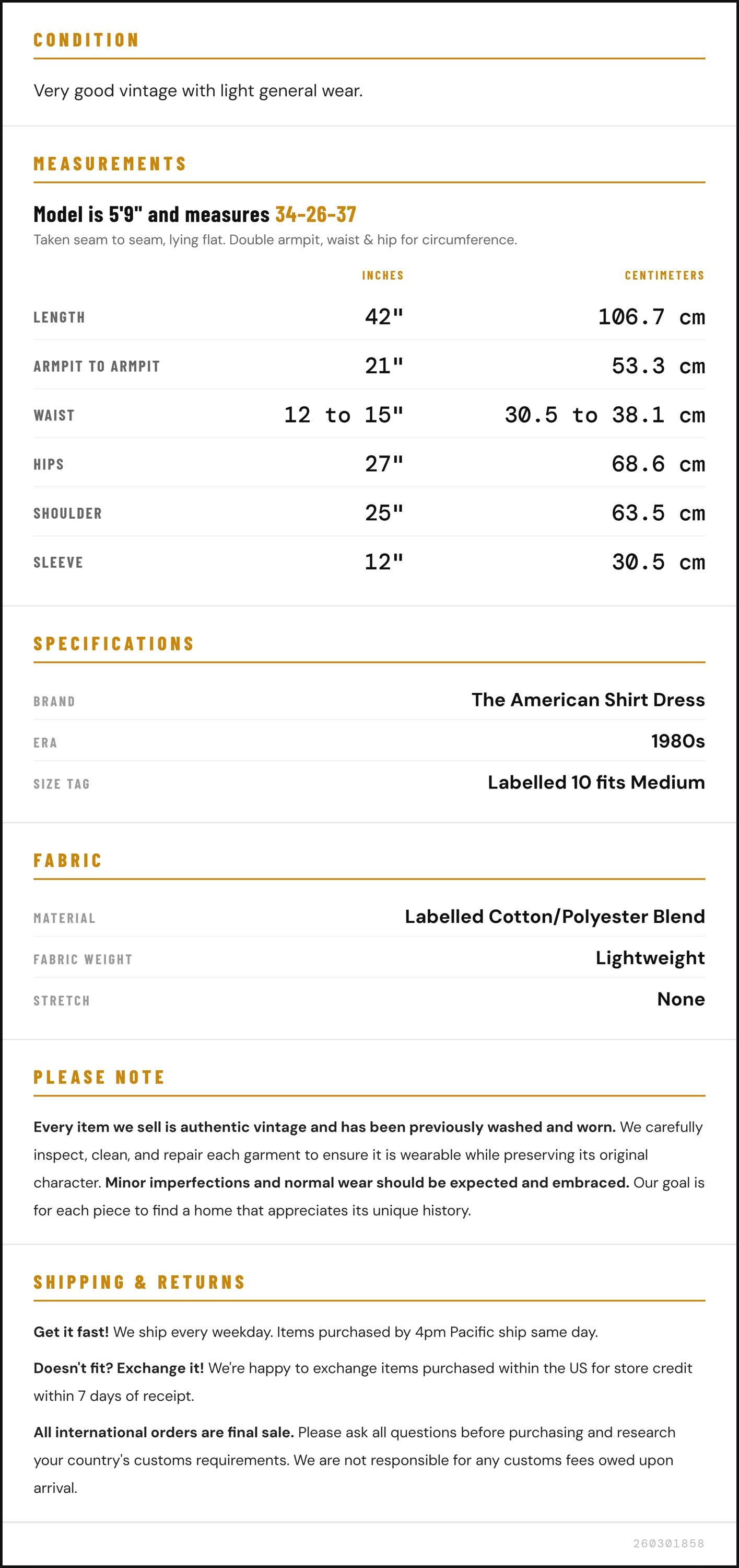 Vintage denim was usually made without any stretch, unlike modern jeans. Check the measurements to ensure proper fit, and remember to give yourself a little wiggle room in the waist and hips, depending on your preferred fit.