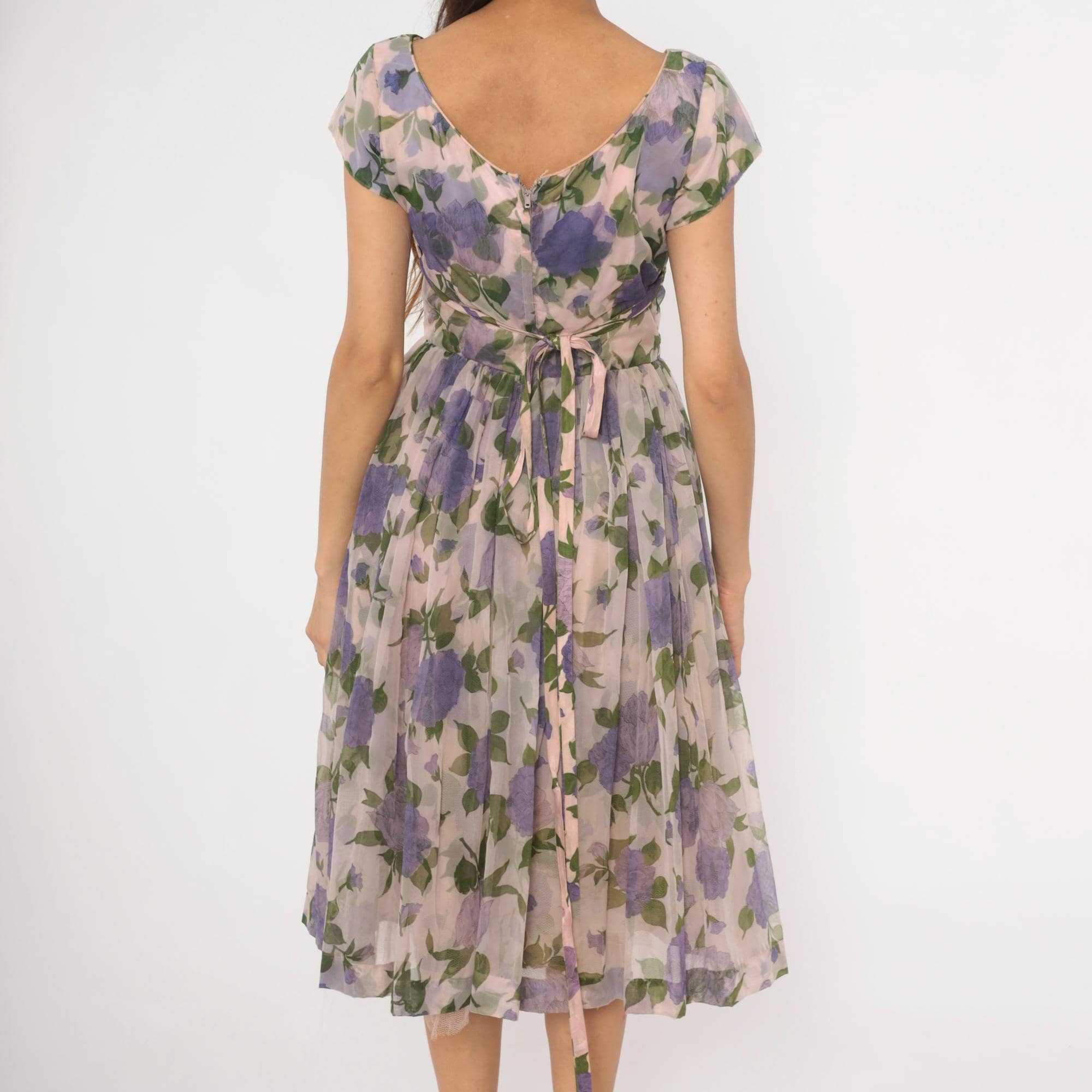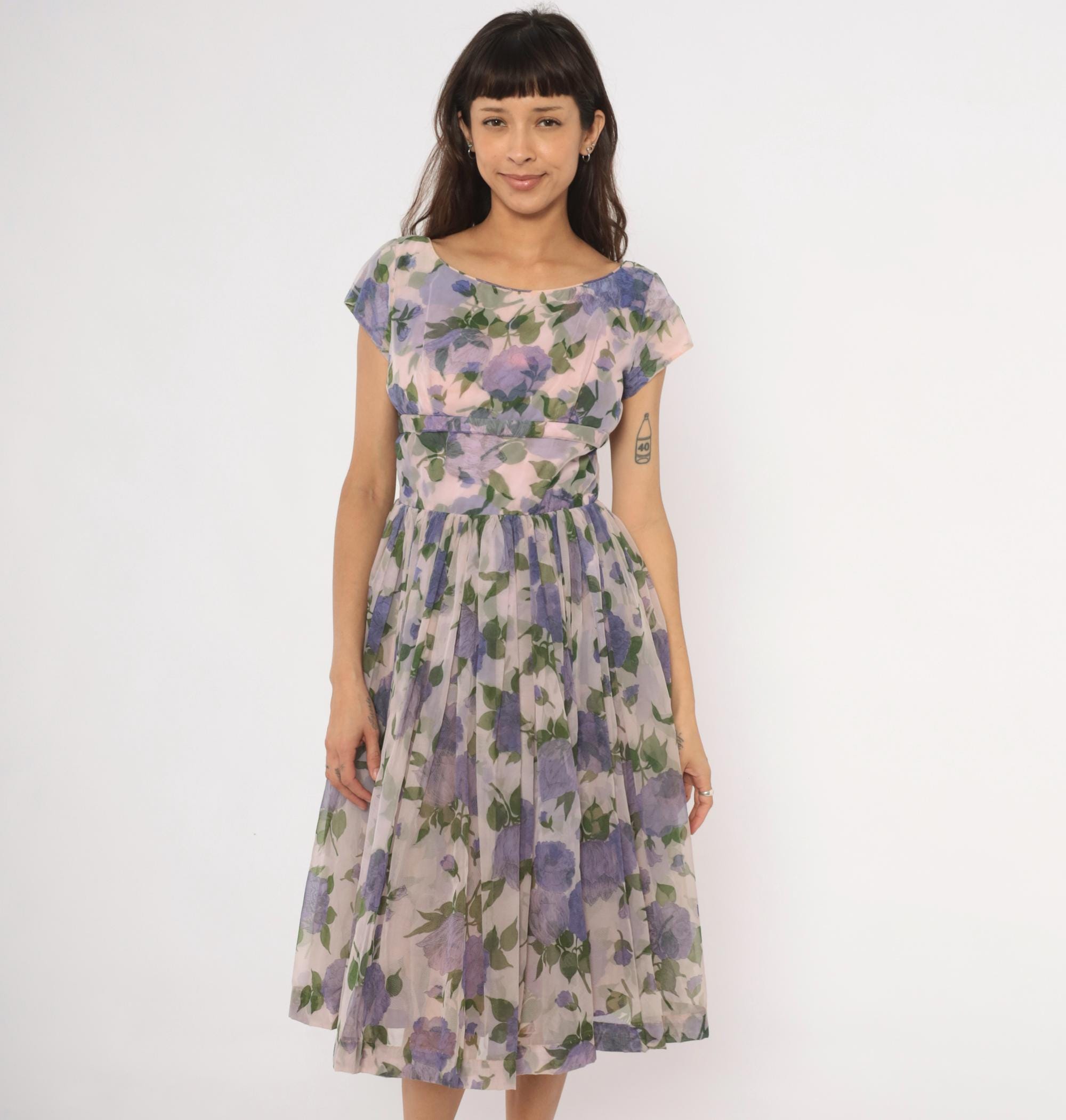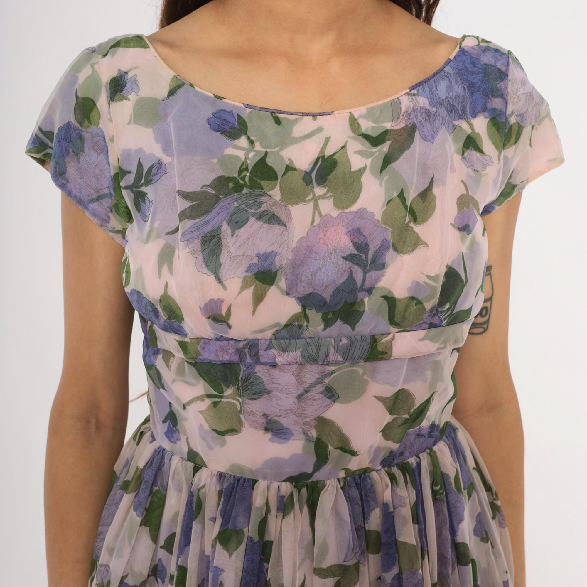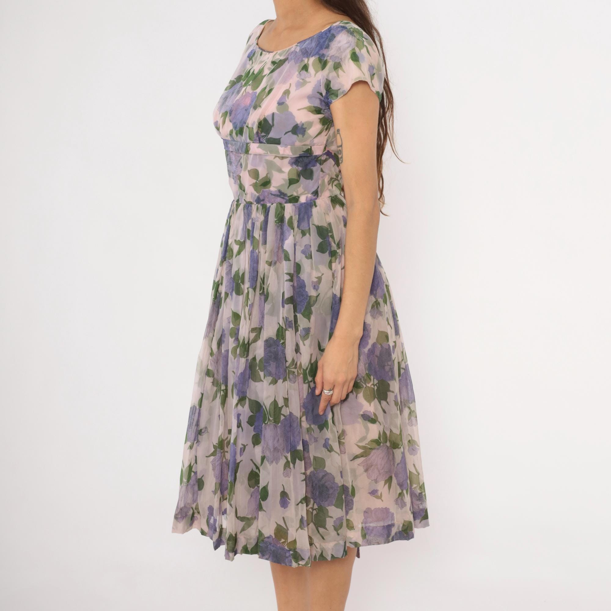 60s lavender and purple floral dress with a rose and green leaf print on a sheer chiffon overlay. Scoop neckline in front with a lower scoop back, cap sleeves, and a fitted bodice with a wide waistband.