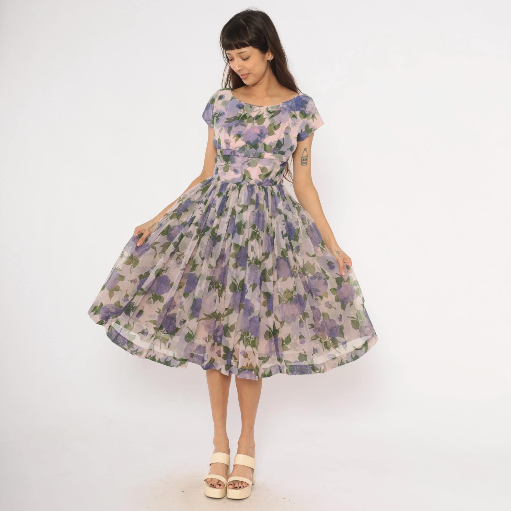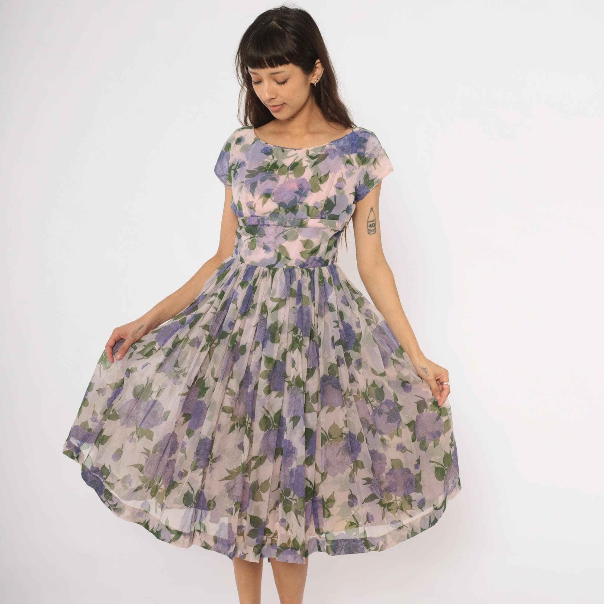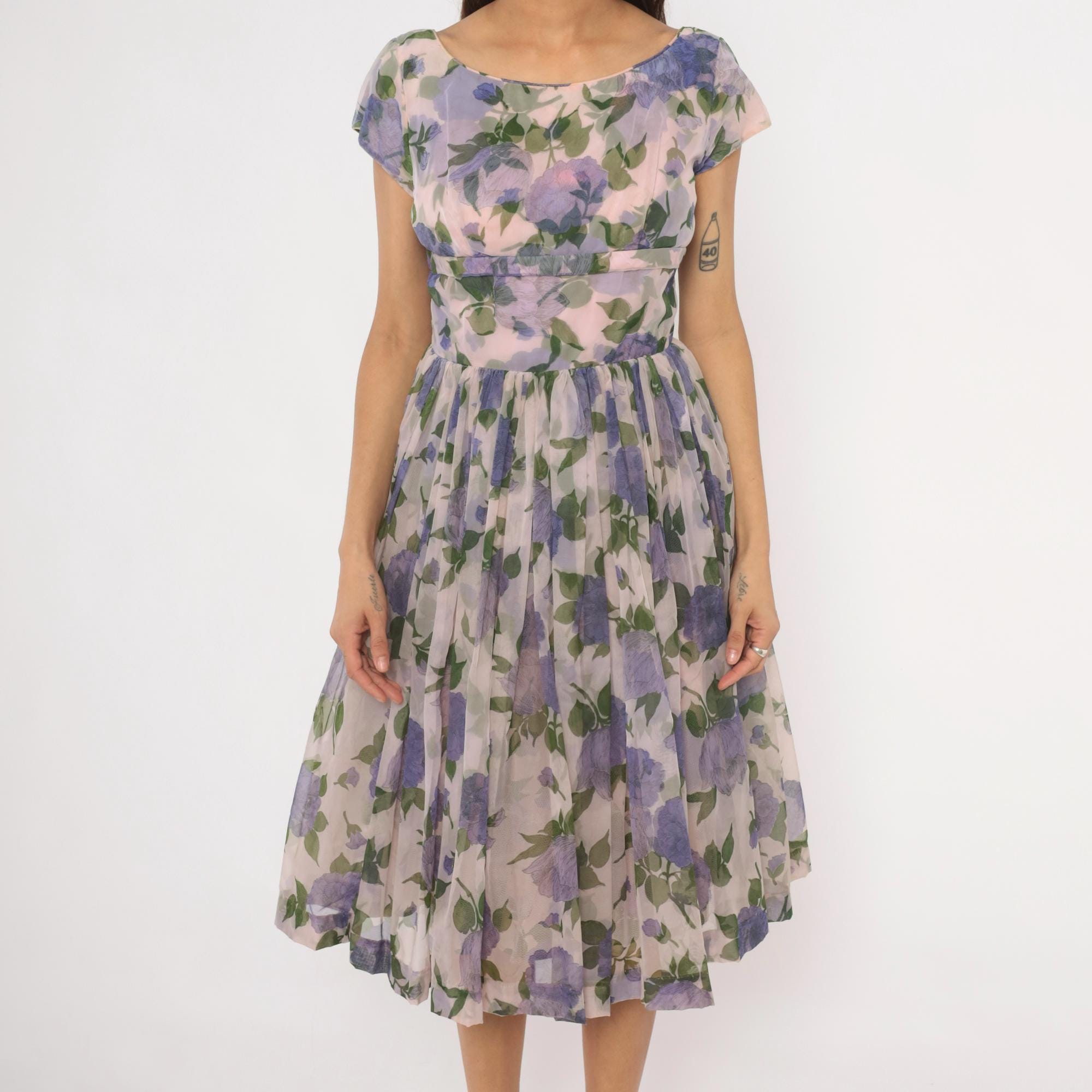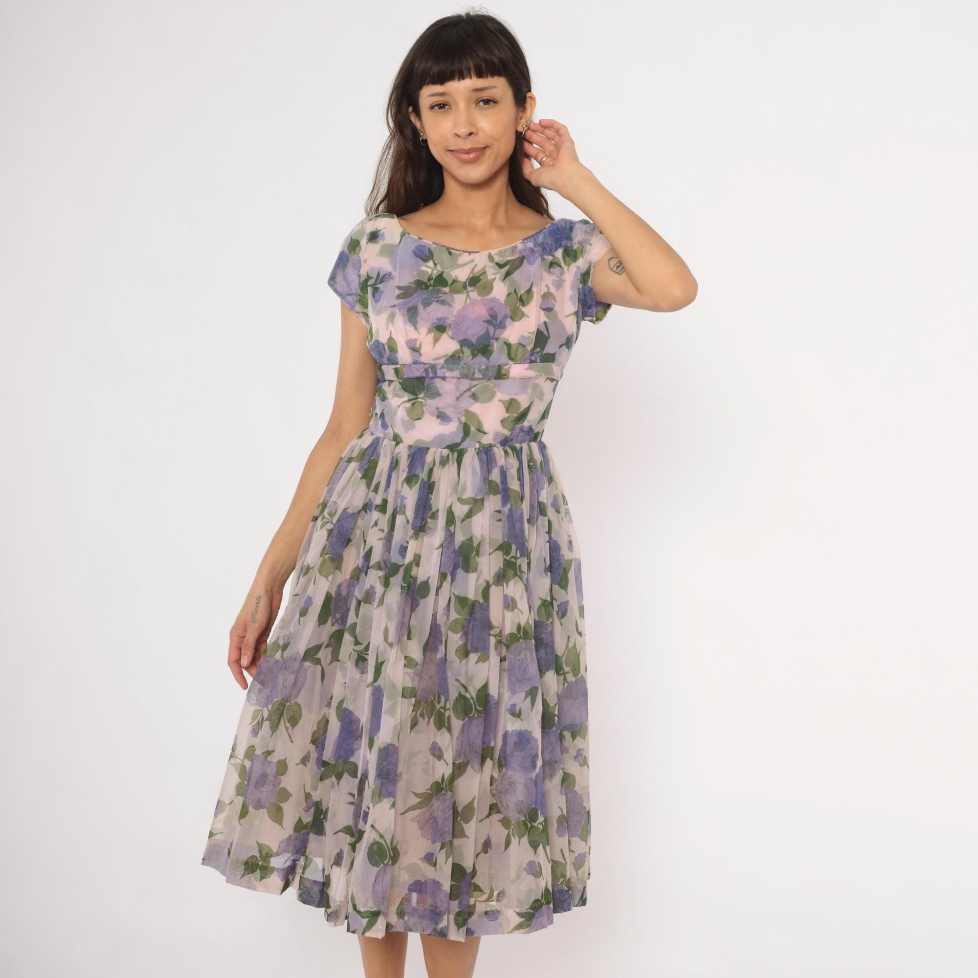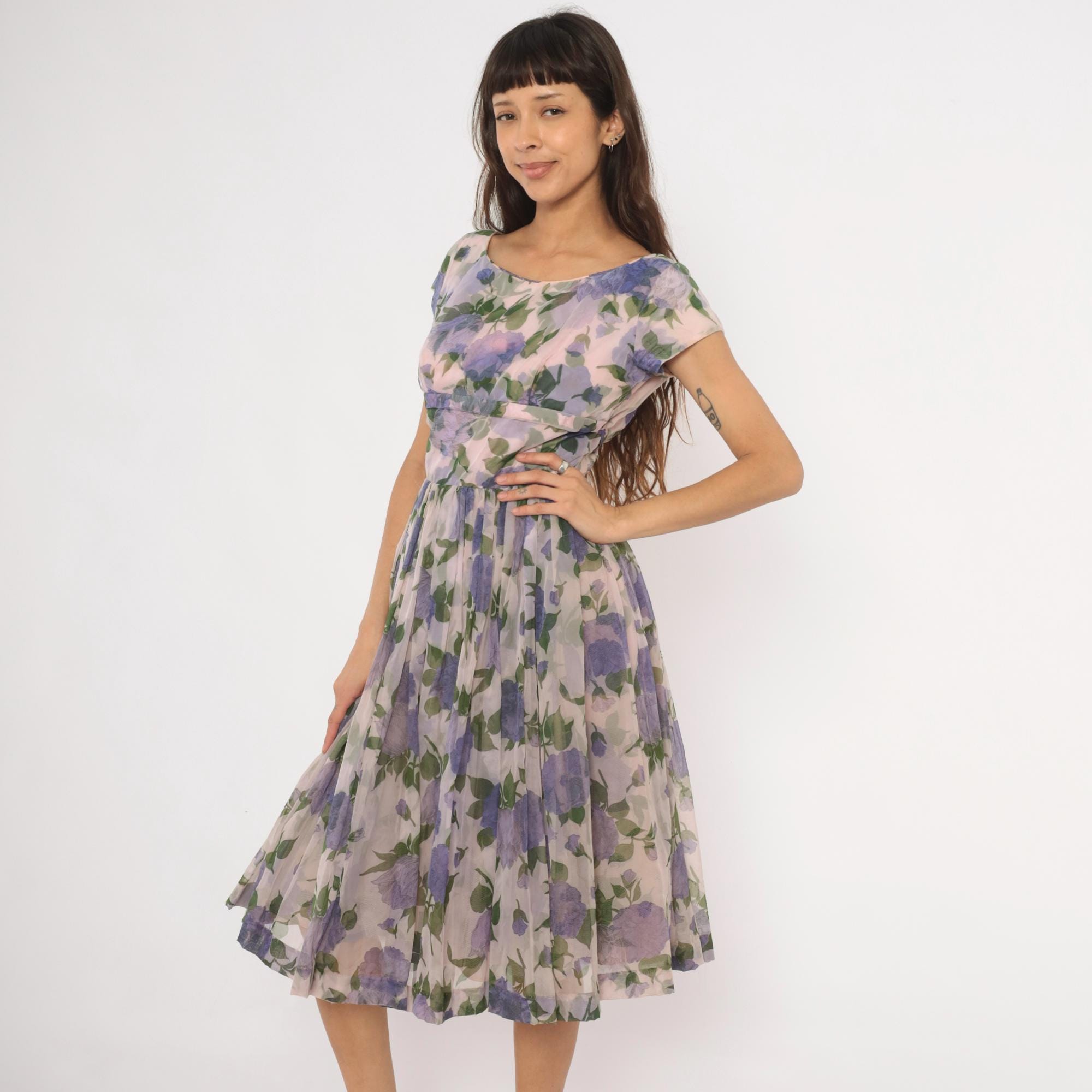 60s lavender and purple floral dress with a rose and green leaf print on a sheer chiffon overlay. Scoop neckline in front with a lower scoop back, cap sleeves, and a fitted bodice with a wide waistband.