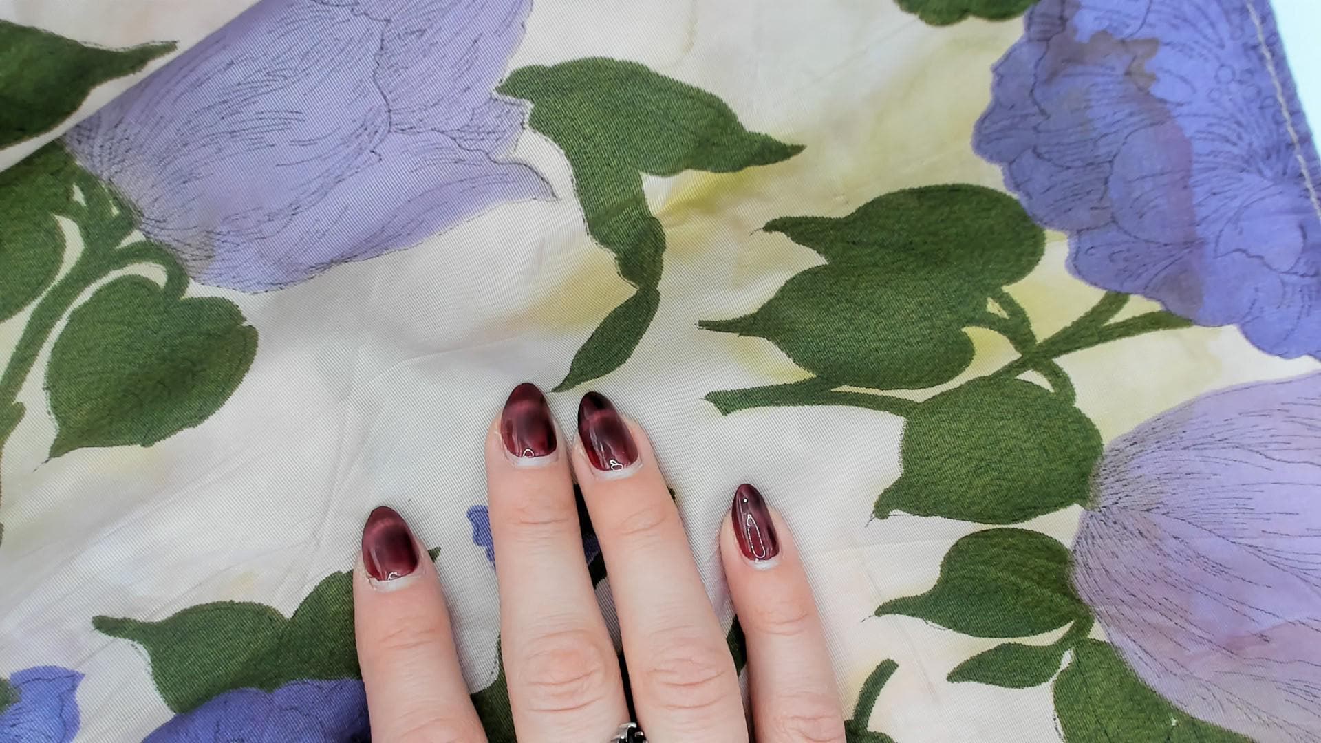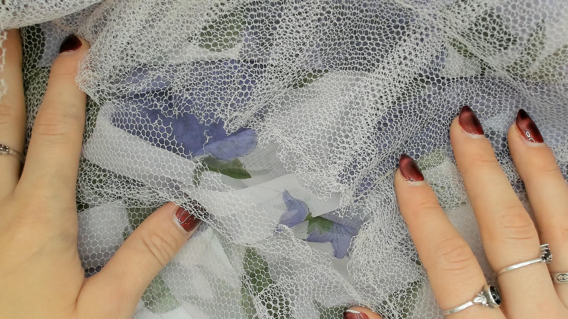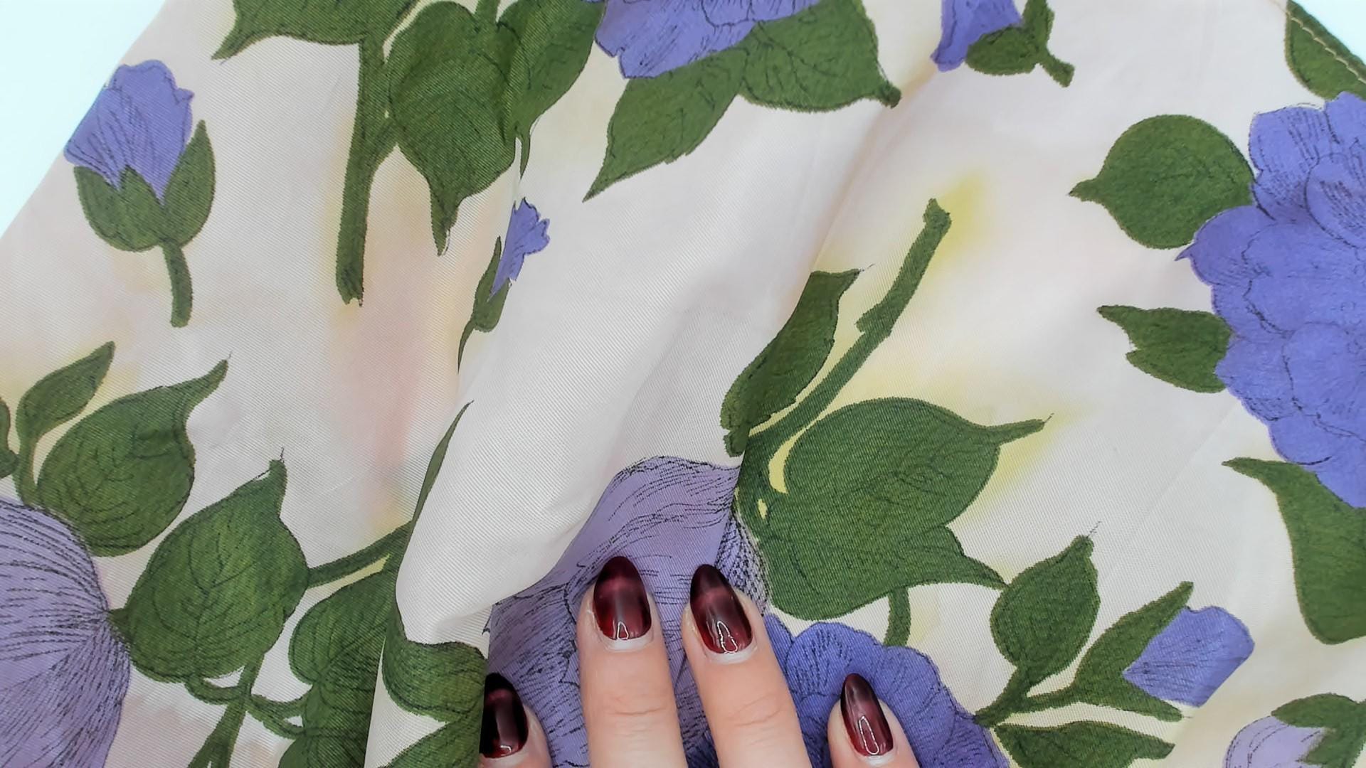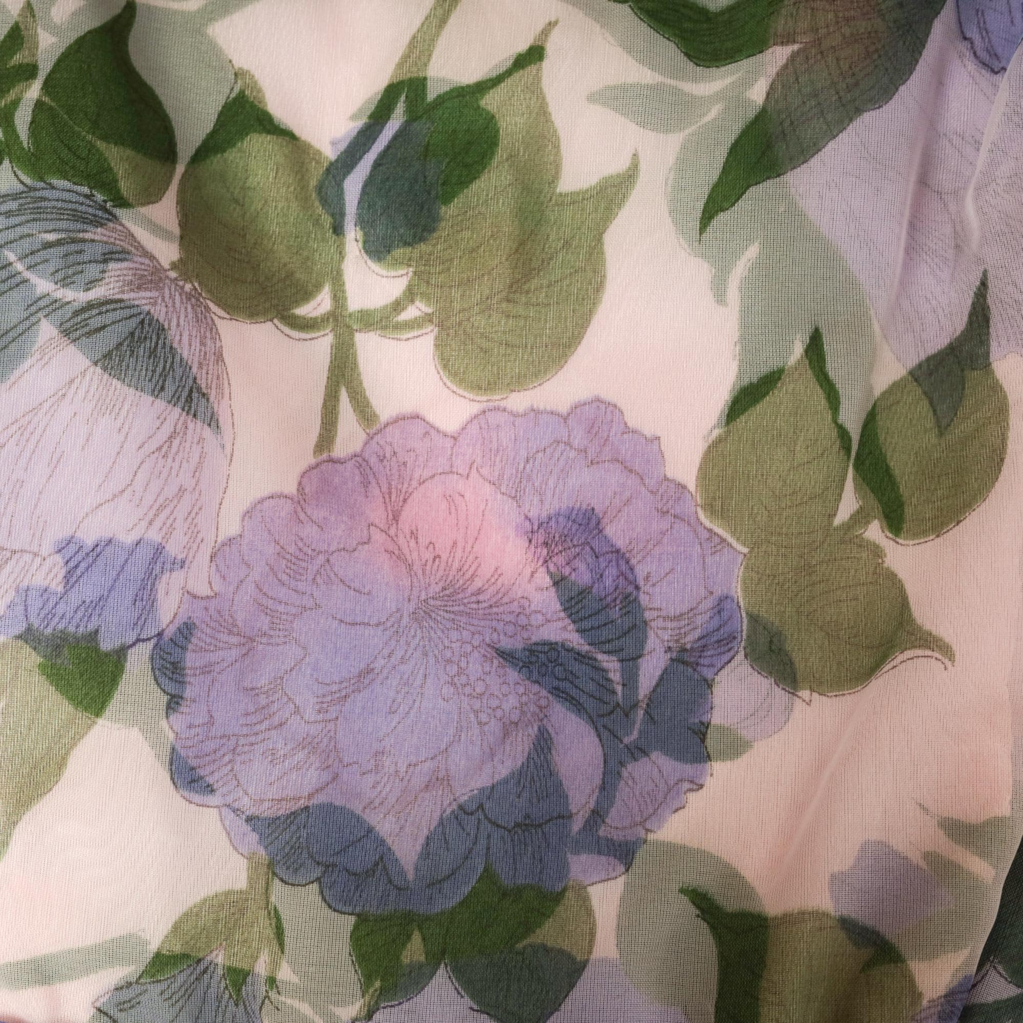 60s lavender and purple floral dress with a rose and green leaf print on a sheer chiffon overlay. Scoop neckline in front with a lower scoop back, cap sleeves, and a fitted bodice with a wide waistband.