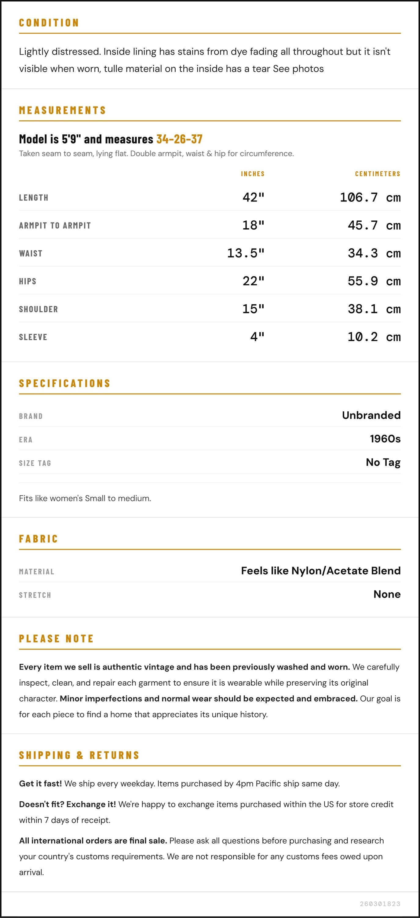Condition: Lightly distressed. Inside lining has stains from dye fading all throughout but it isn't visible when worn, tulle material on the inside has a tear See photos