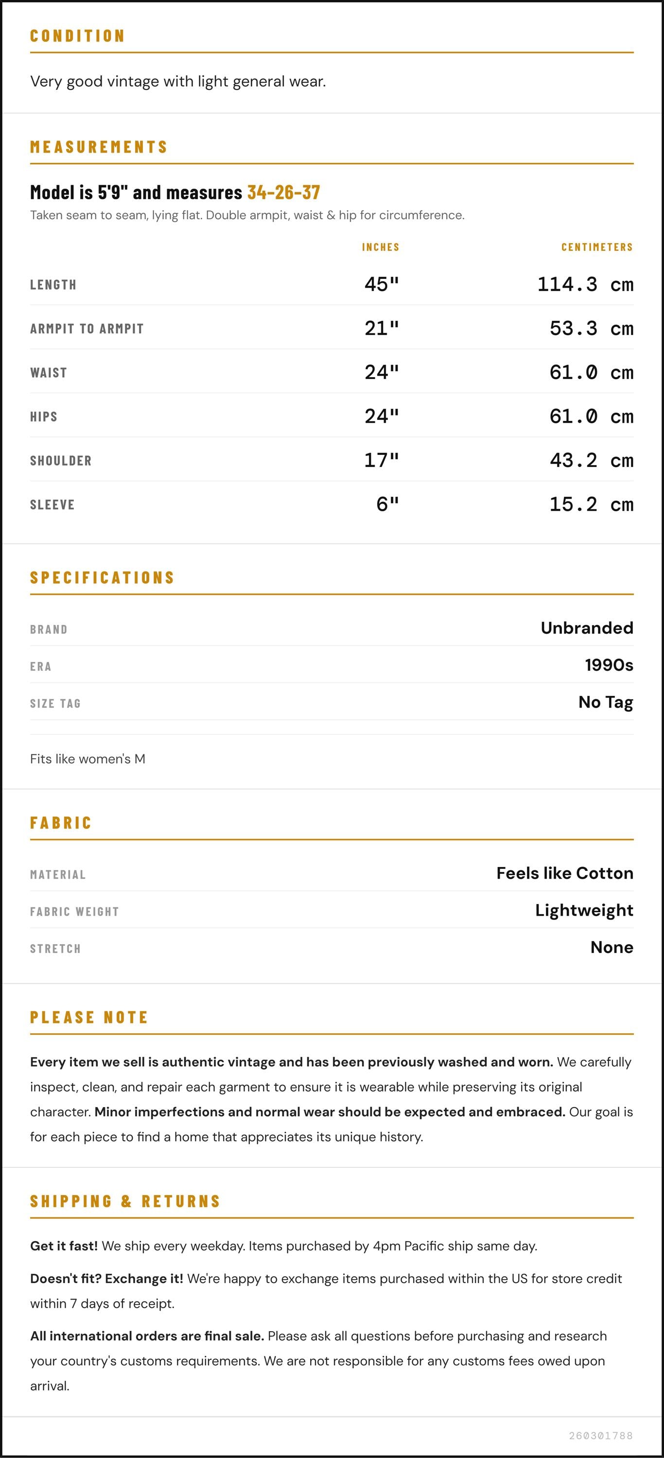 Taken from seam to seam while the garment is lying flat. Double the armpit, waist, and hip measurements.