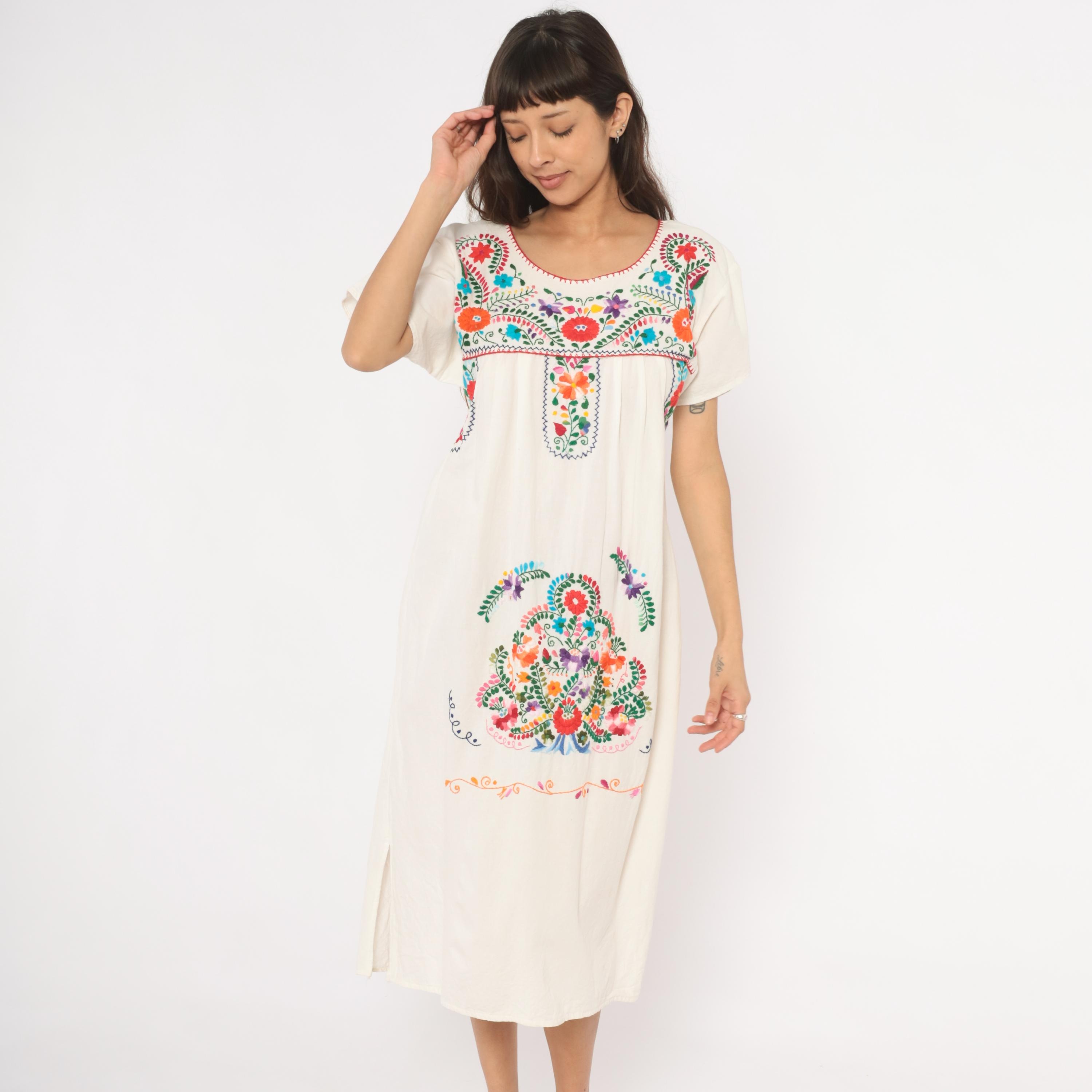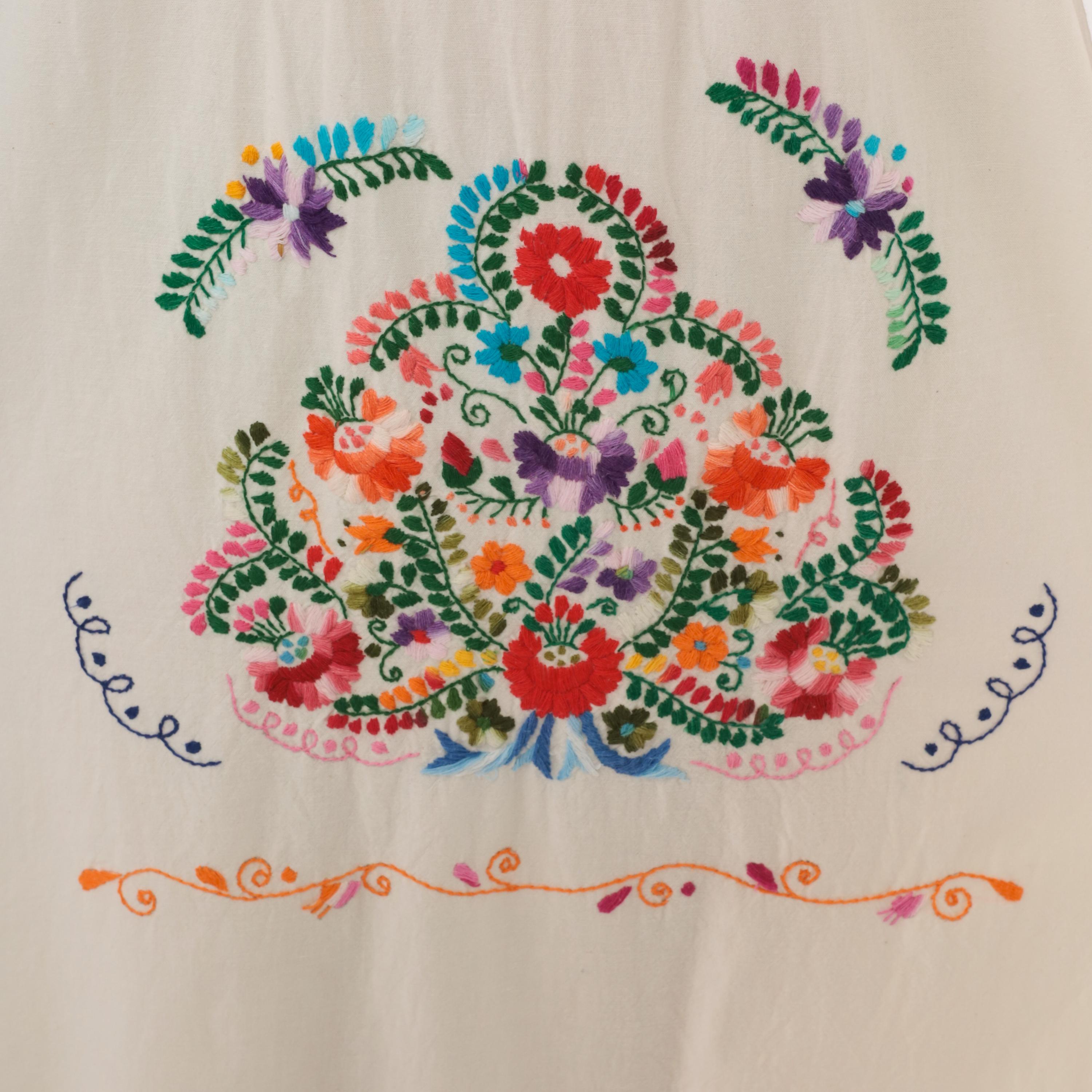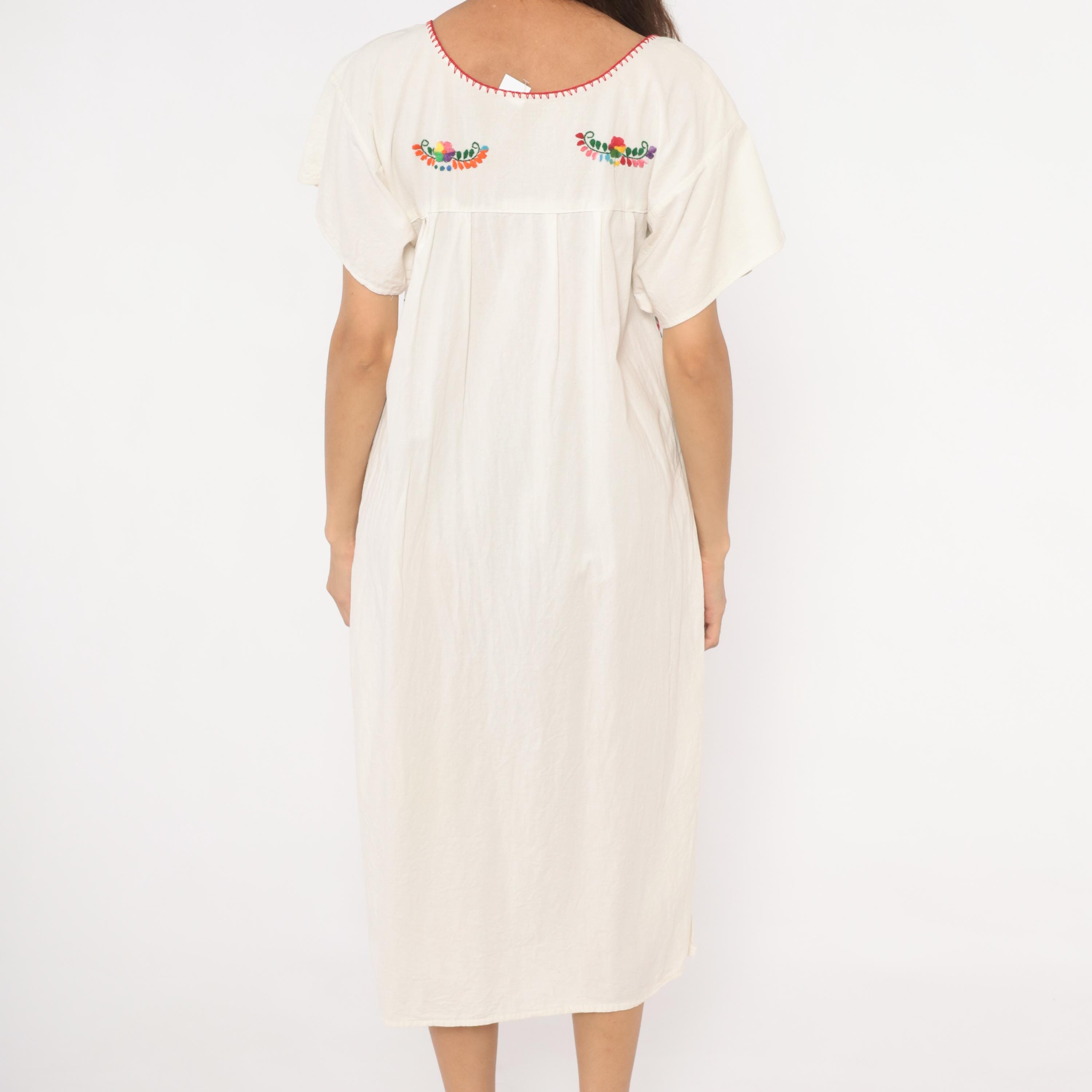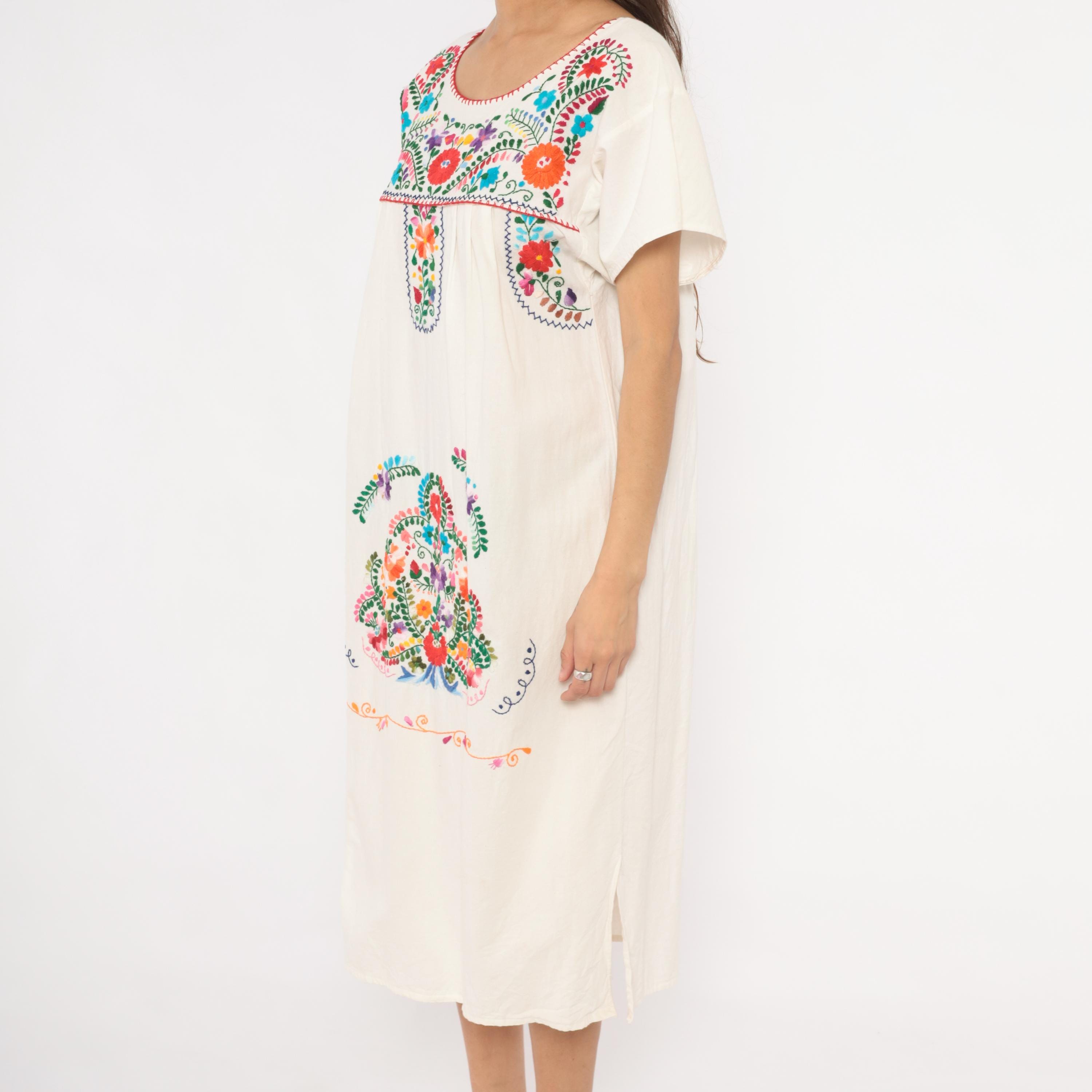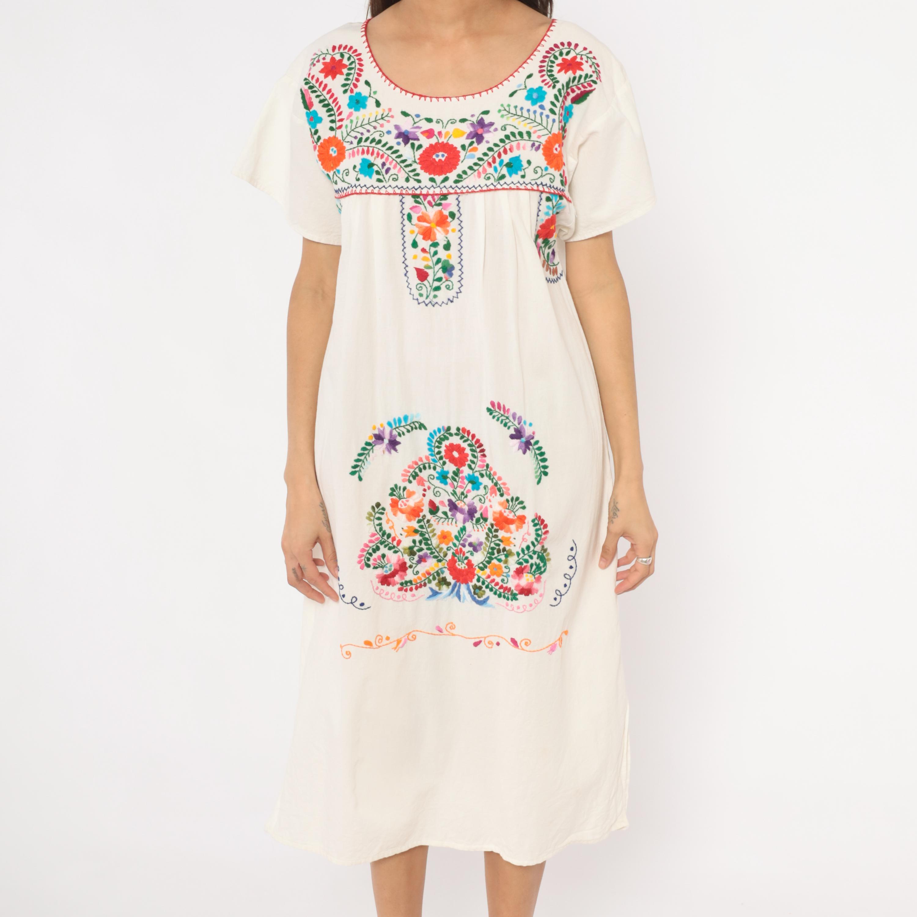 90s white cotton Mexican Puebla dress with hand-embroidered multicolor floral motifs across the yoke, center front panel, and lower skirt. Scoop neckline with red blanket stitch trim, short sleeves, and an empire-style gathered seam below the yoke.