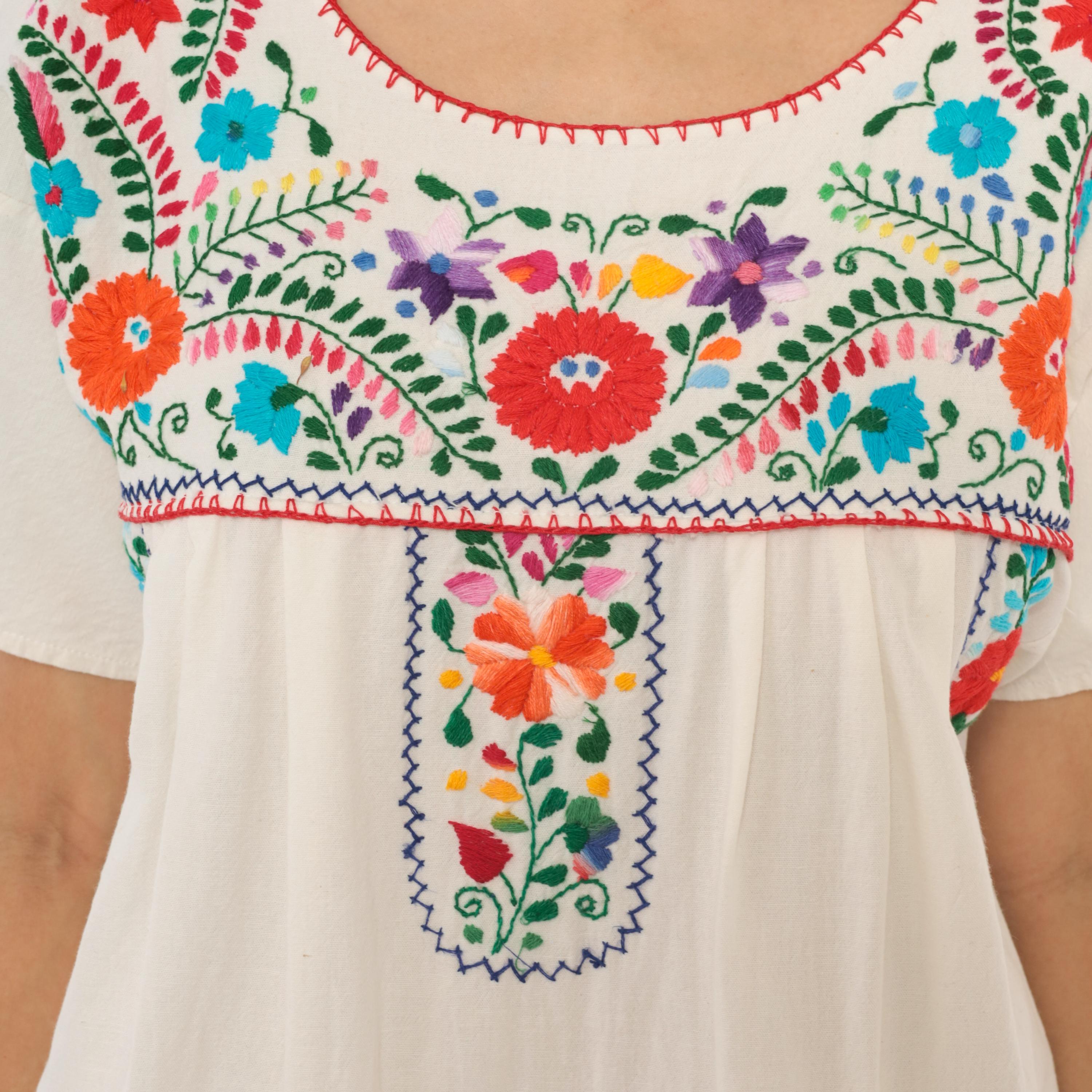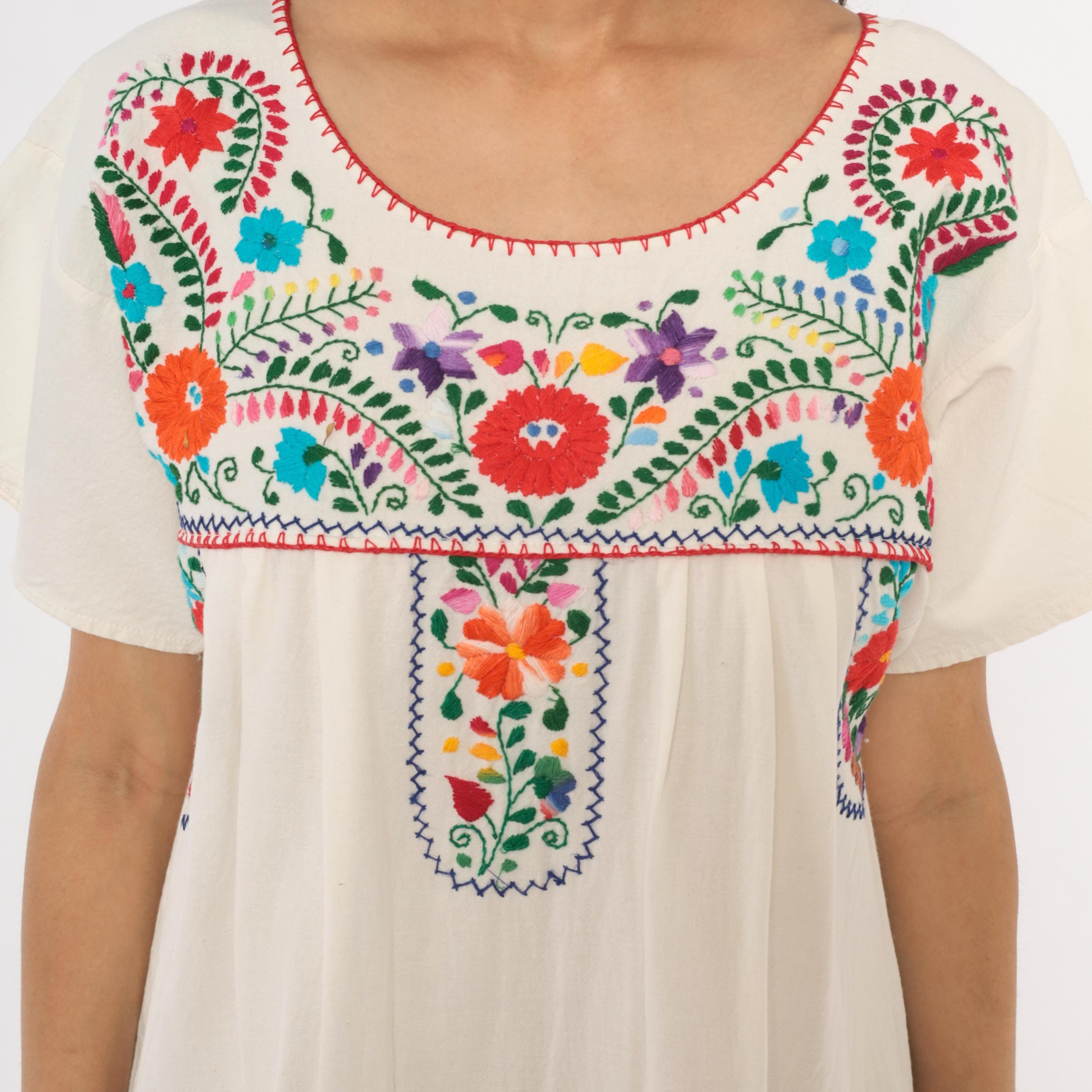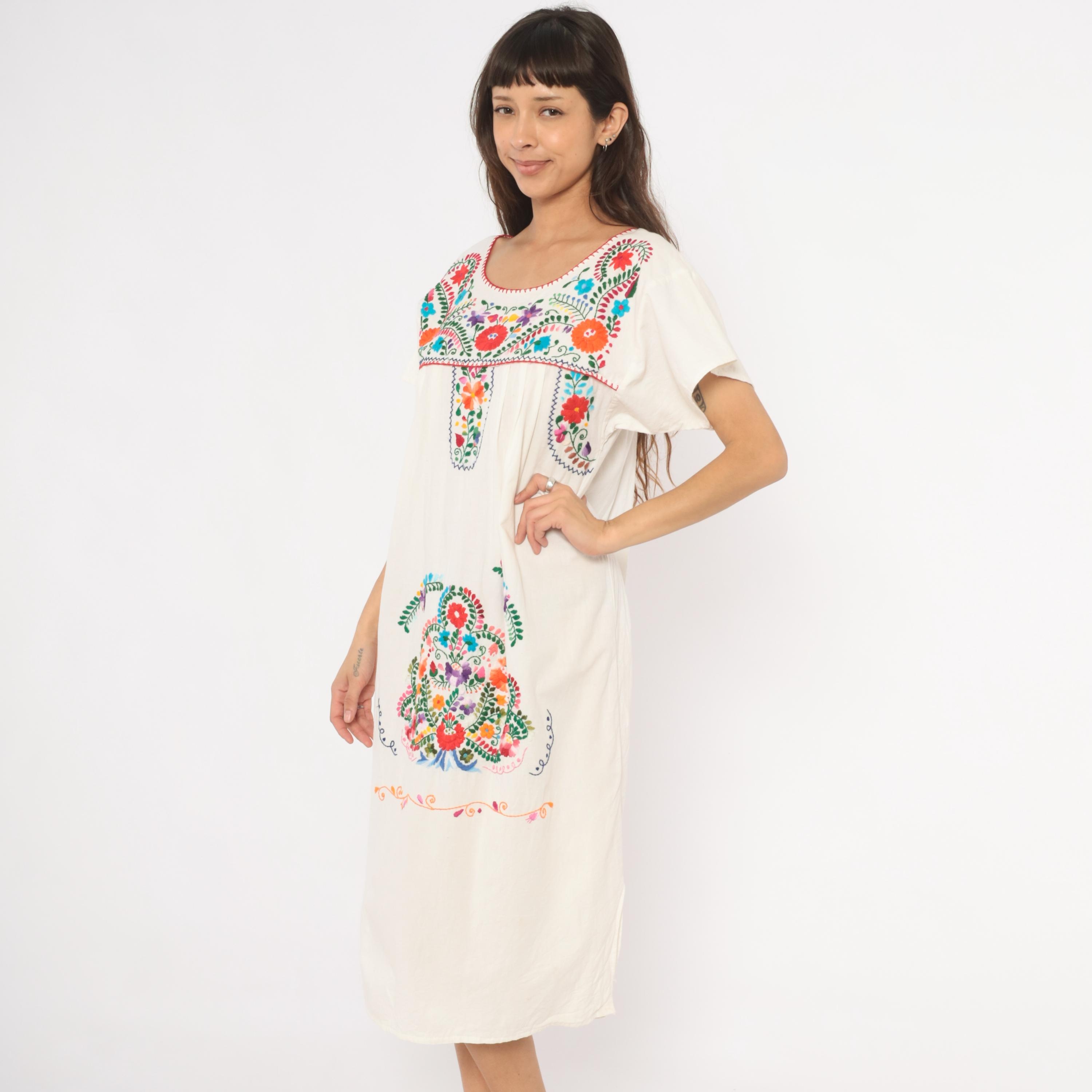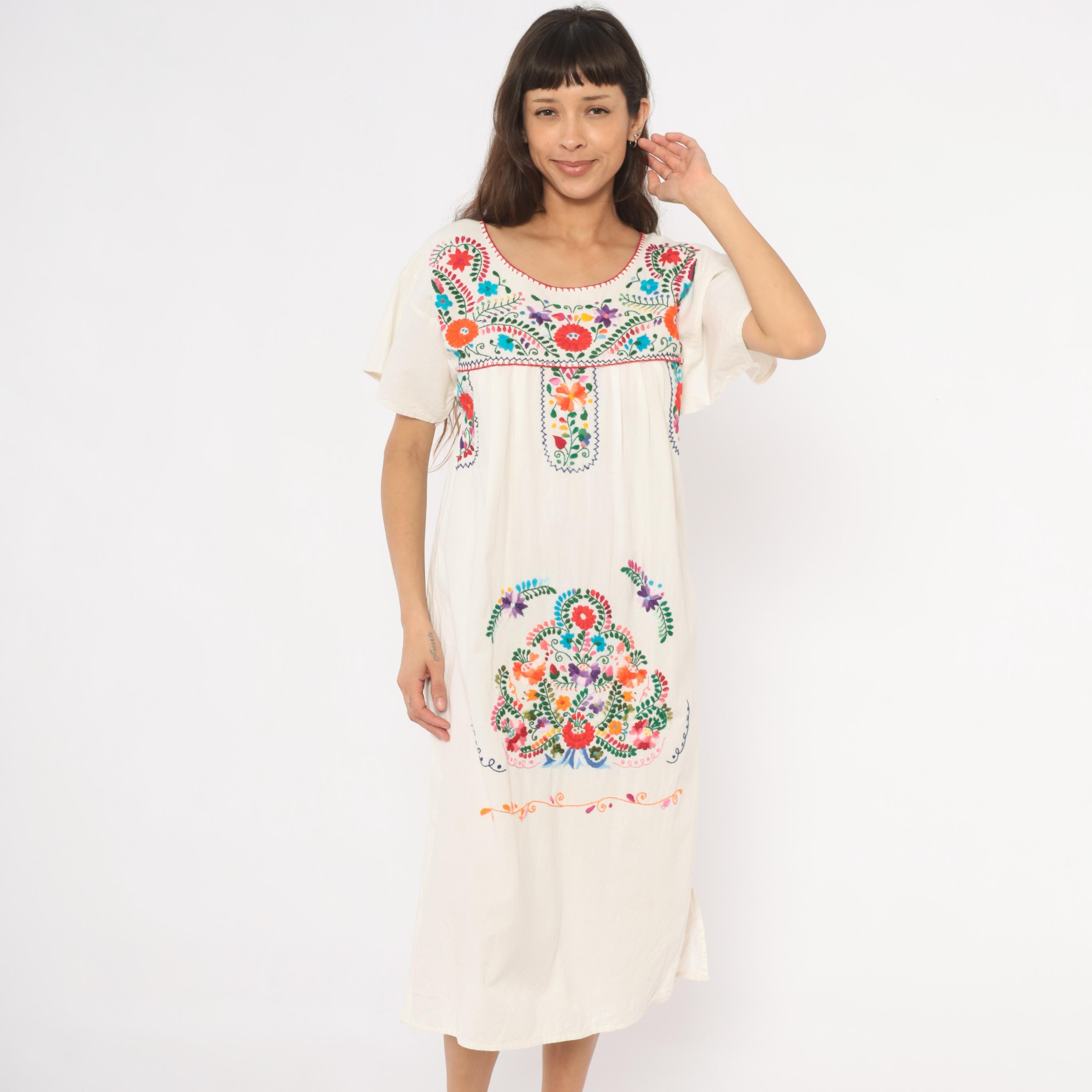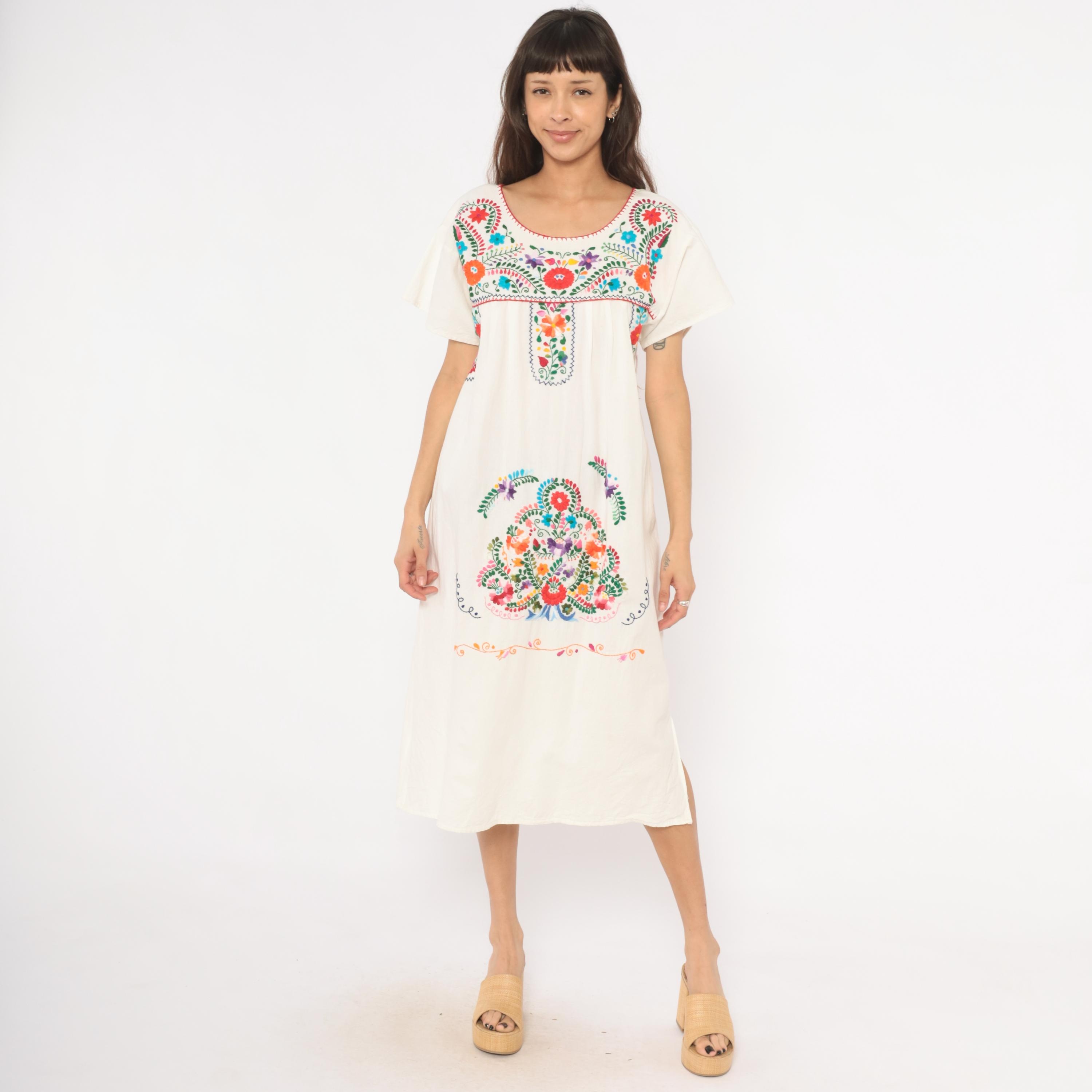 90s white cotton Mexican Puebla dress with hand-embroidered multicolor floral motifs across the yoke, center front panel, and lower skirt. Scoop neckline with red blanket stitch trim, short sleeves, and an empire-style gathered seam below the yoke.