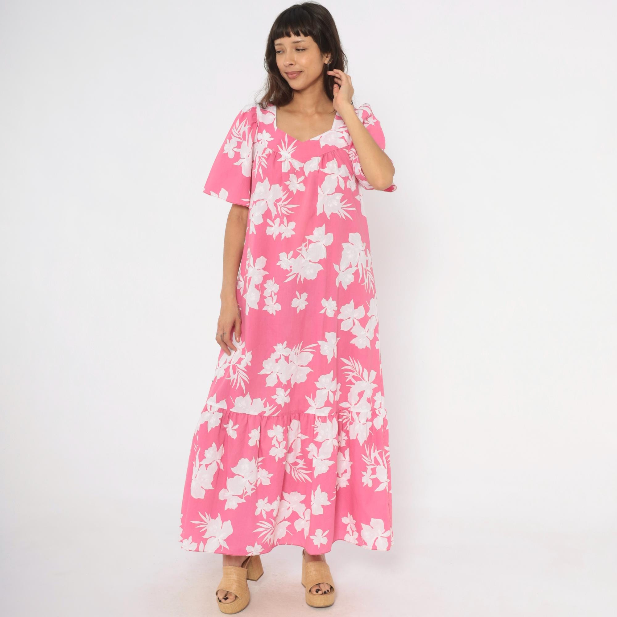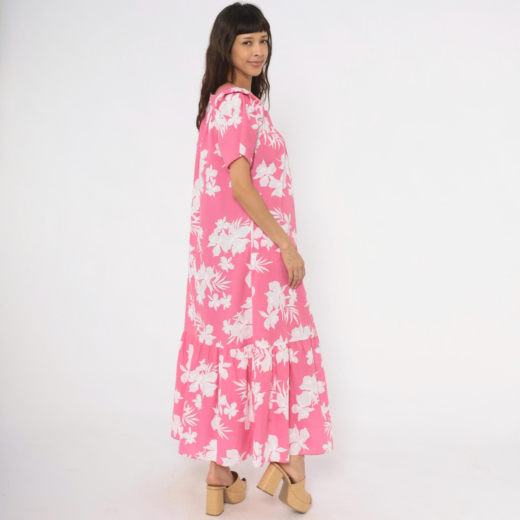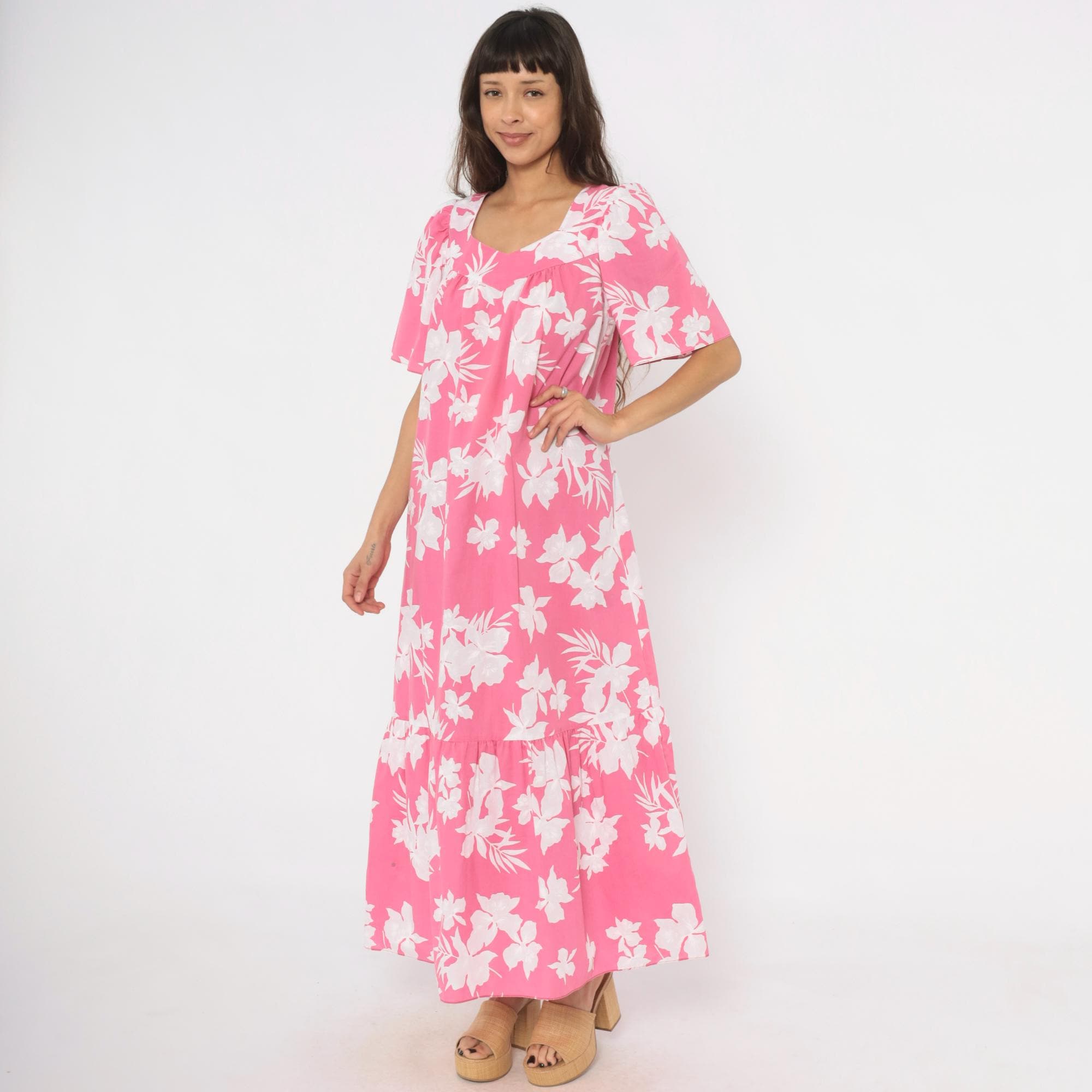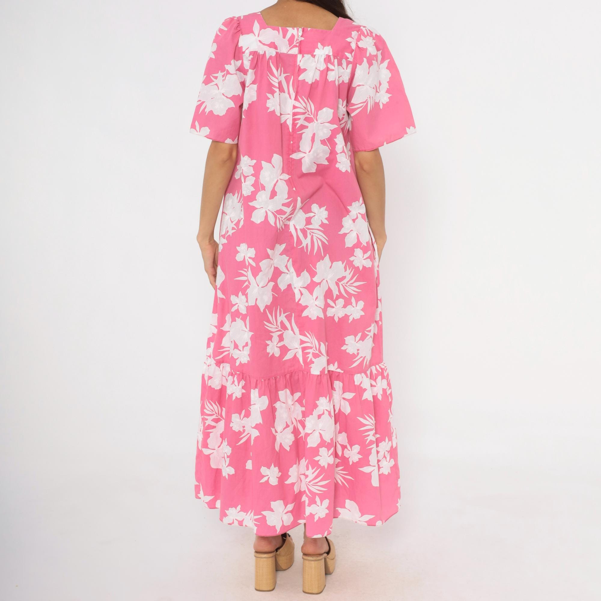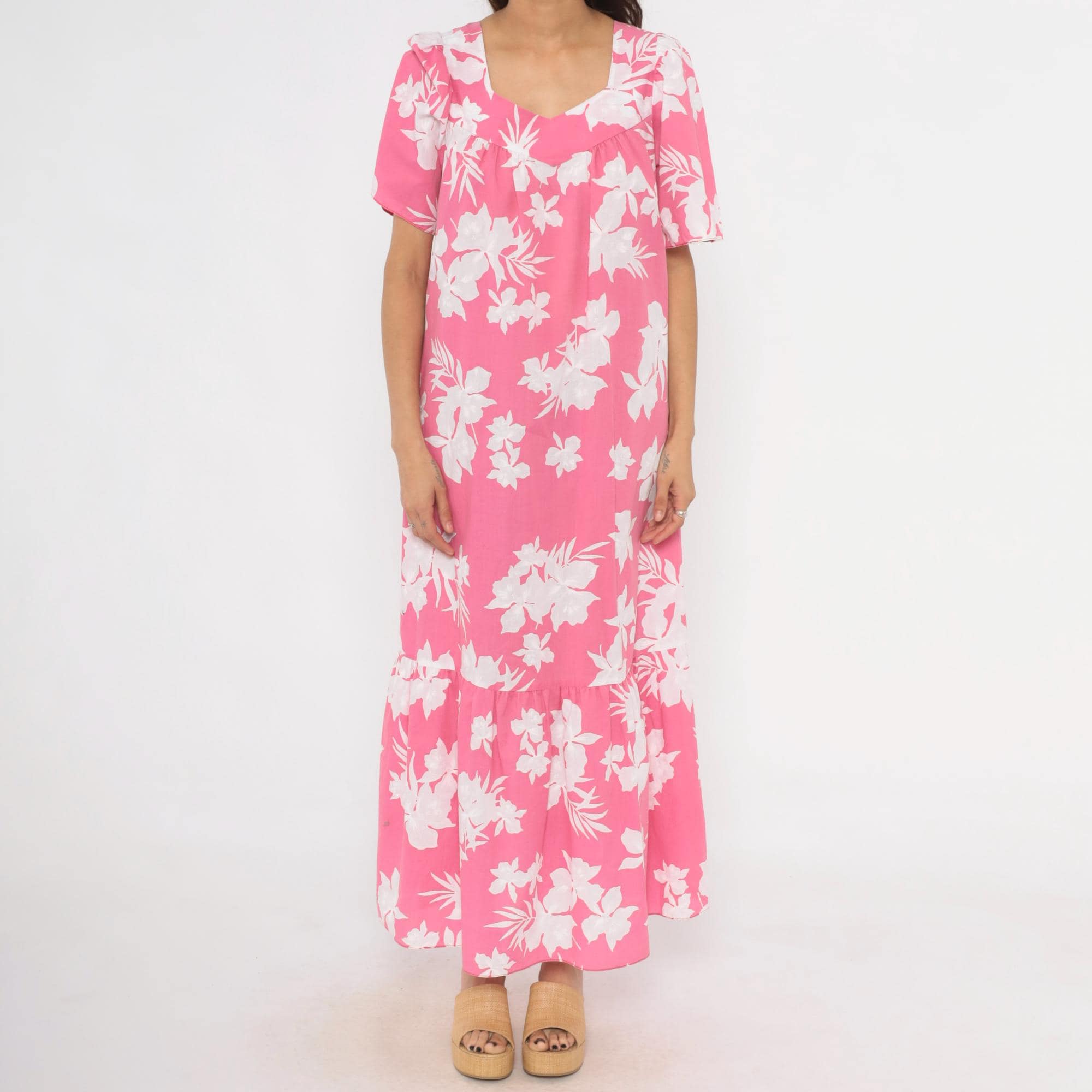 Pink and white tropical floral maxi dress from the 1980s with a sweetheart neckline and gathered bodice. Short puff sleeves, loose straight body, and a tiered ruffle hem at the lower skirt. Back zipper closure and side seam pockets. White hibiscus and palm leaf print across a rose-pink base.