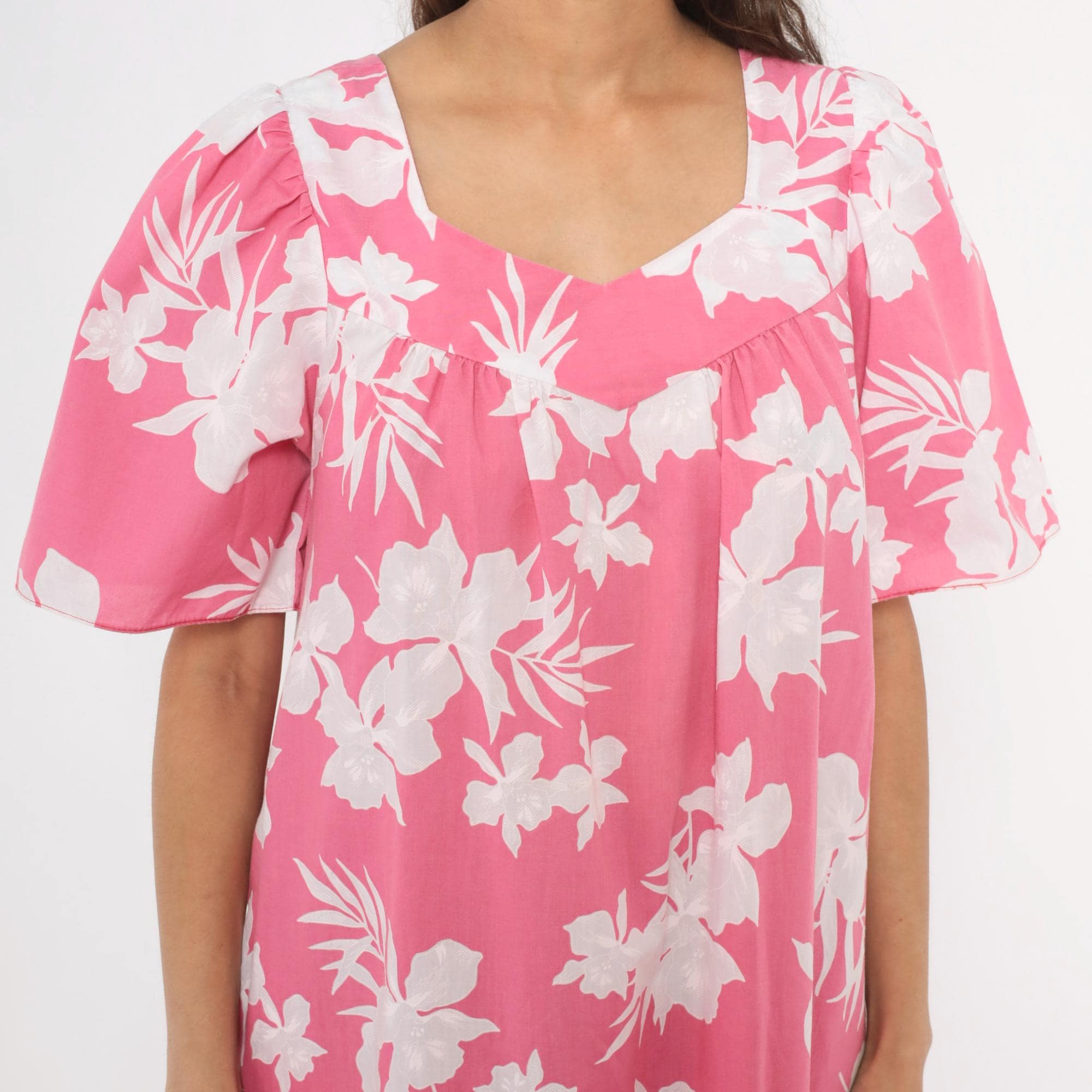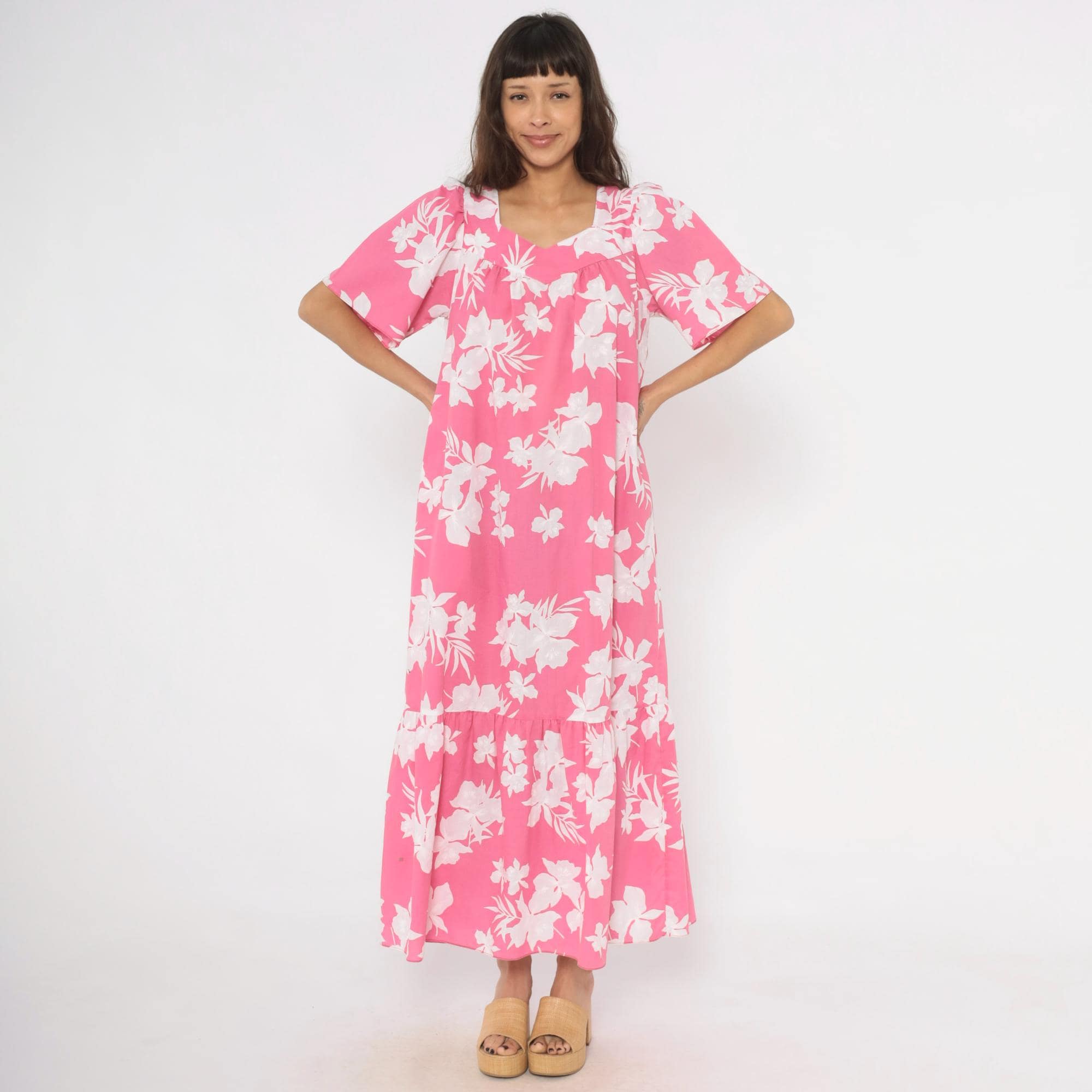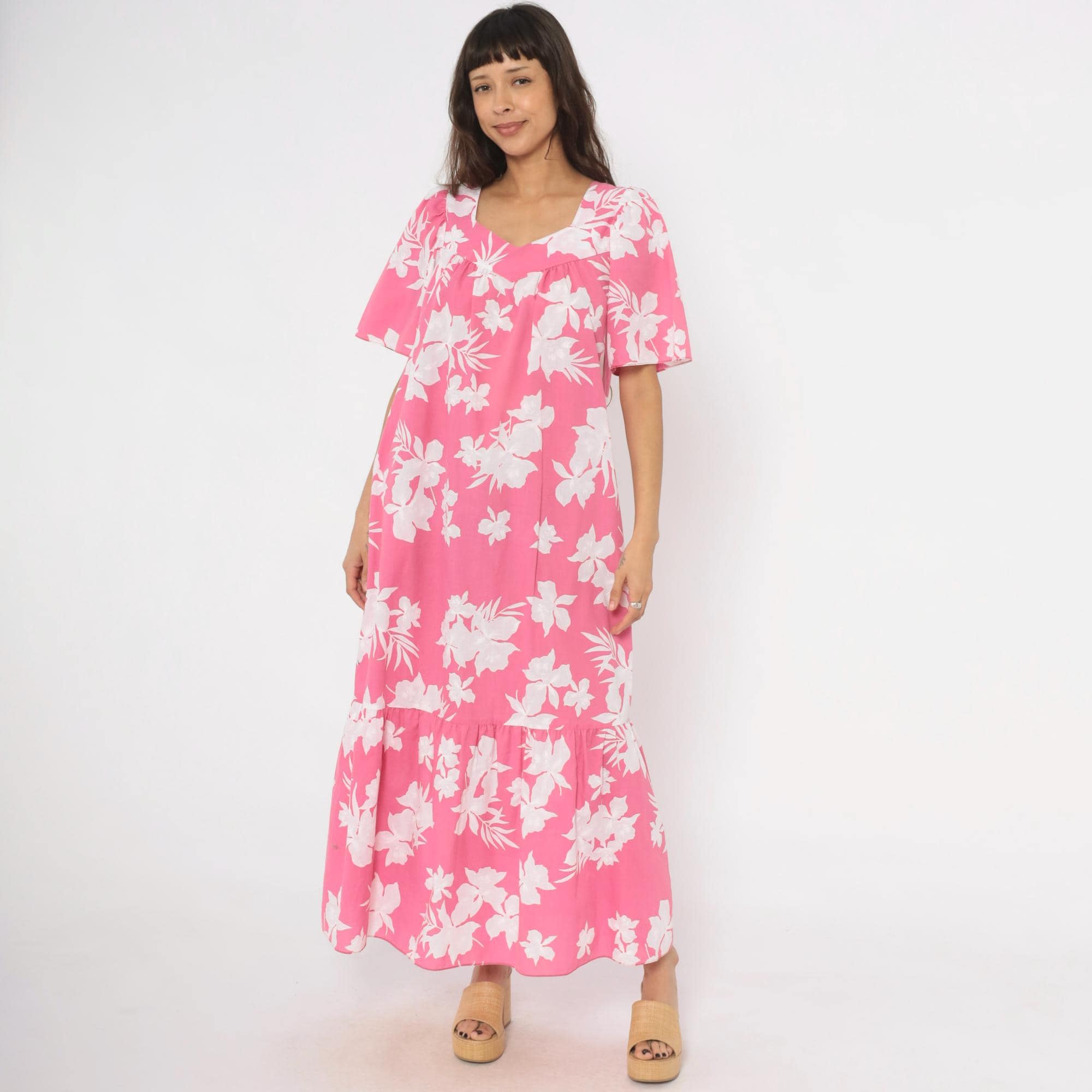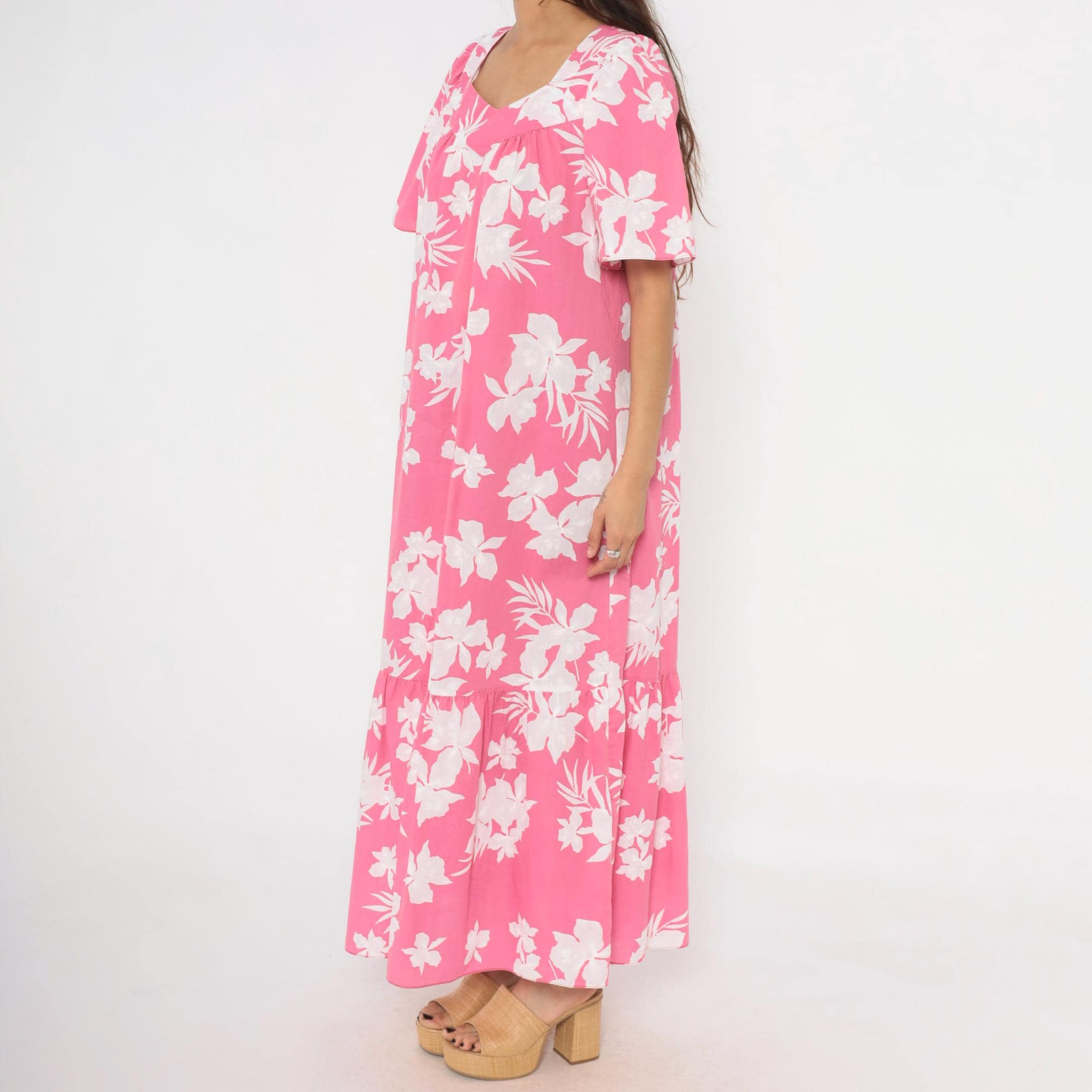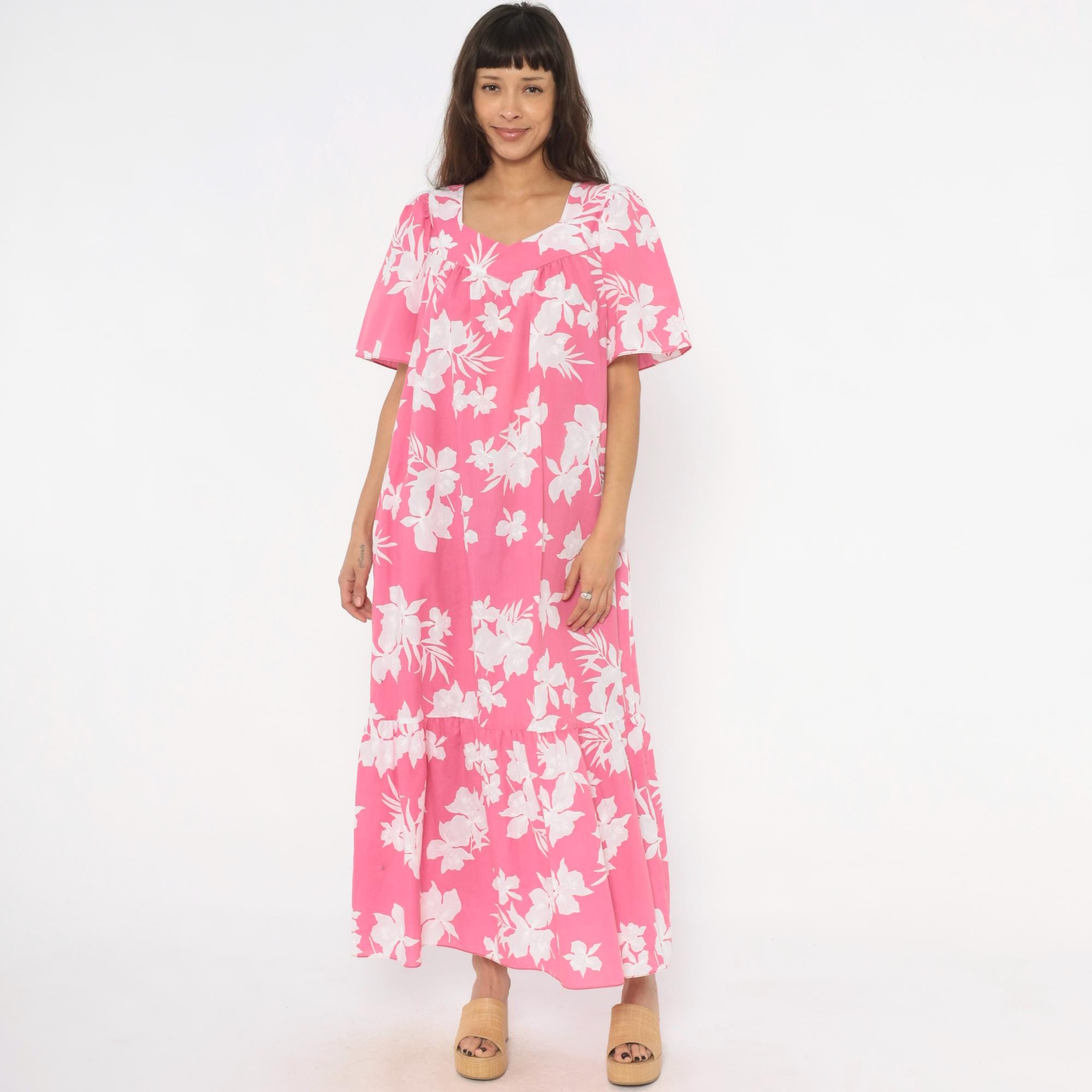 Pink and white tropical floral maxi dress from the 1980s with a sweetheart neckline and gathered bodice. Short puff sleeves, loose straight body, and a tiered ruffle hem at the lower skirt. Back zipper closure and side seam pockets. White hibiscus and palm leaf print across a rose-pink base.