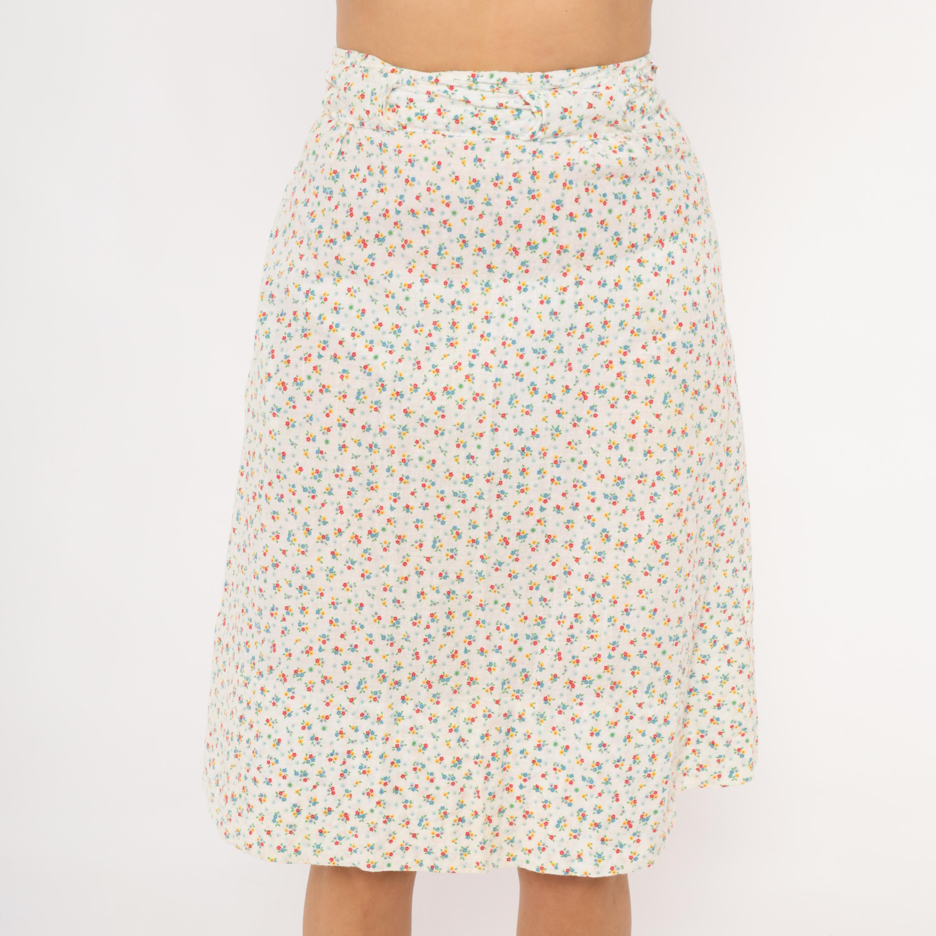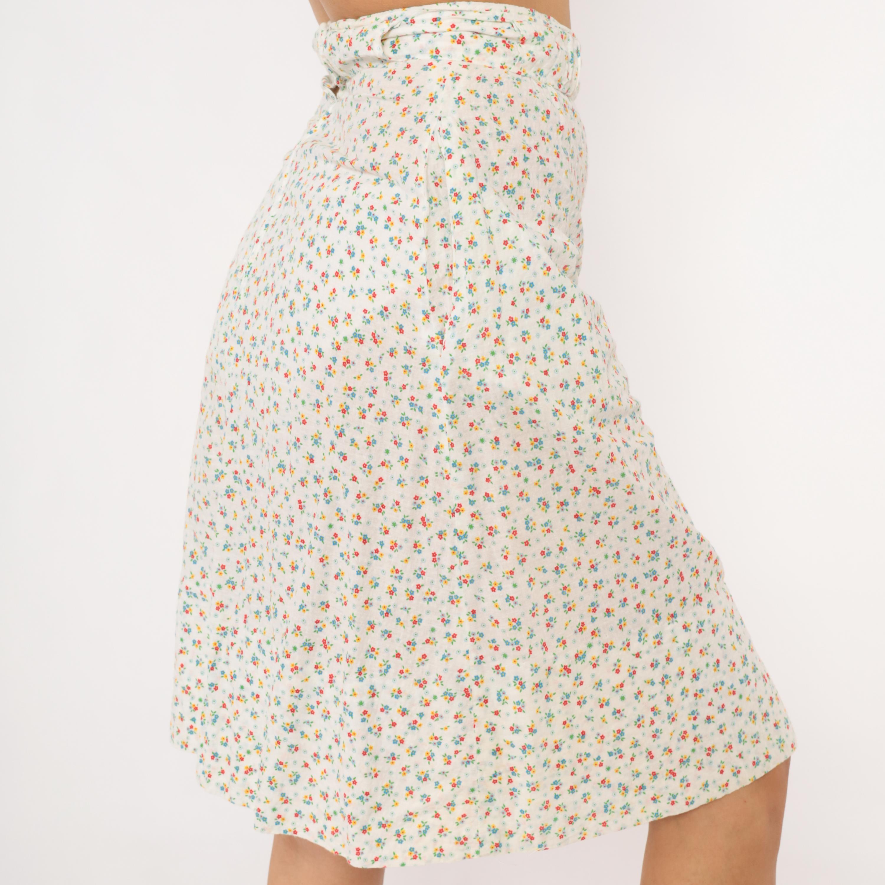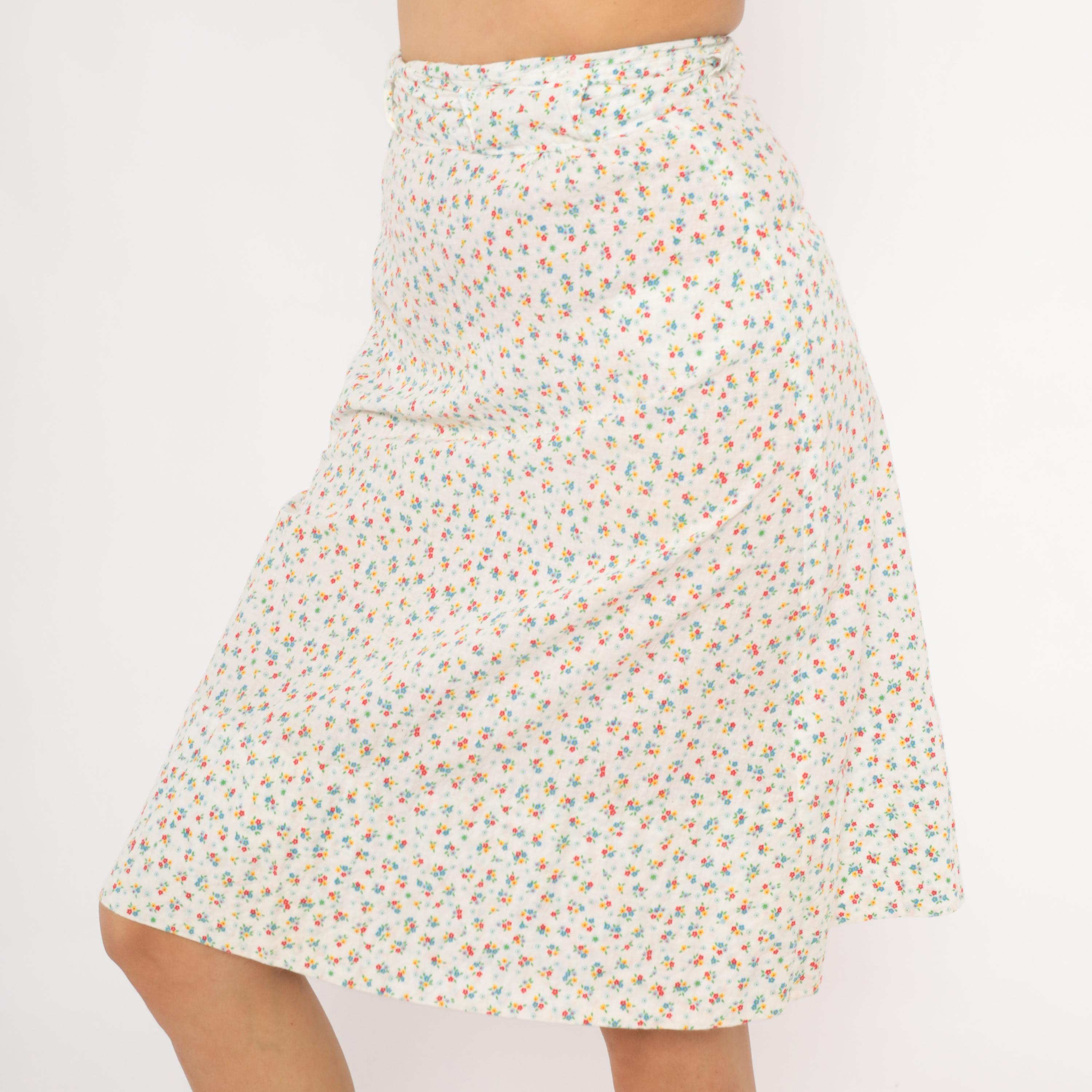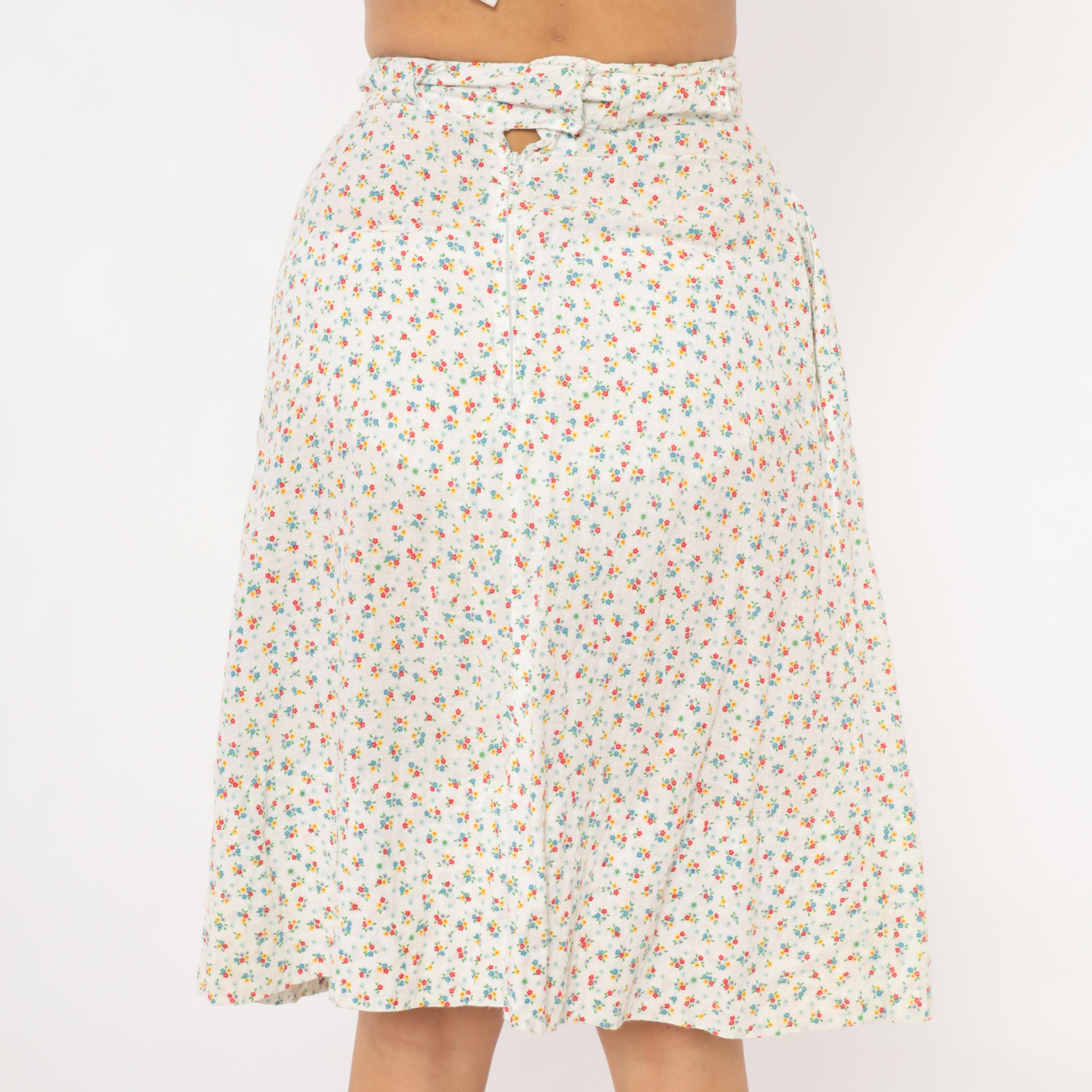 White A-line skirt with an allover ditsy calico floral print in red, blue, yellow, and green scattered across the fabric. Back zipper with snap closure and a self-fabric tie belt at the waistband. Side seam pockets and a knee-length hem with a slight flare.