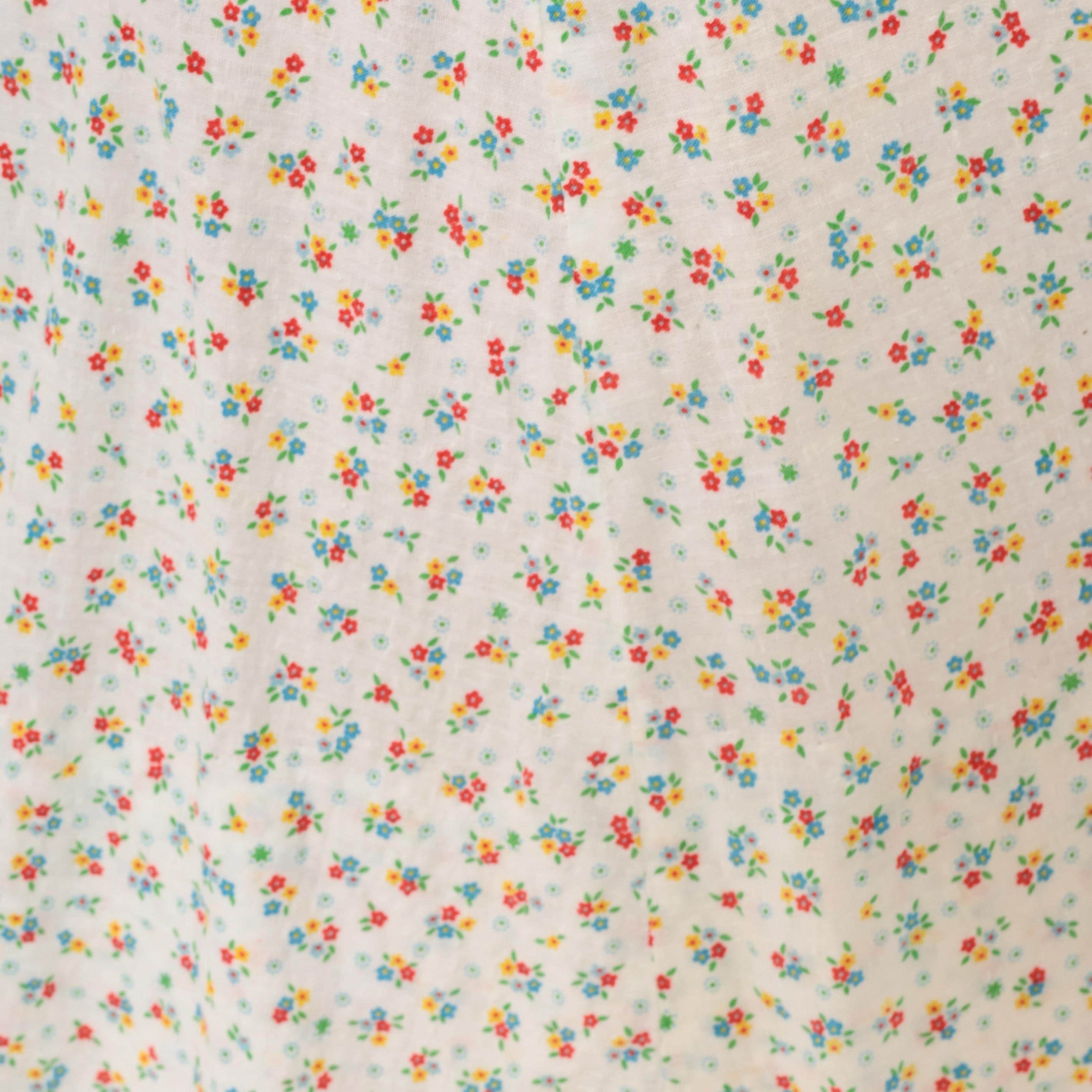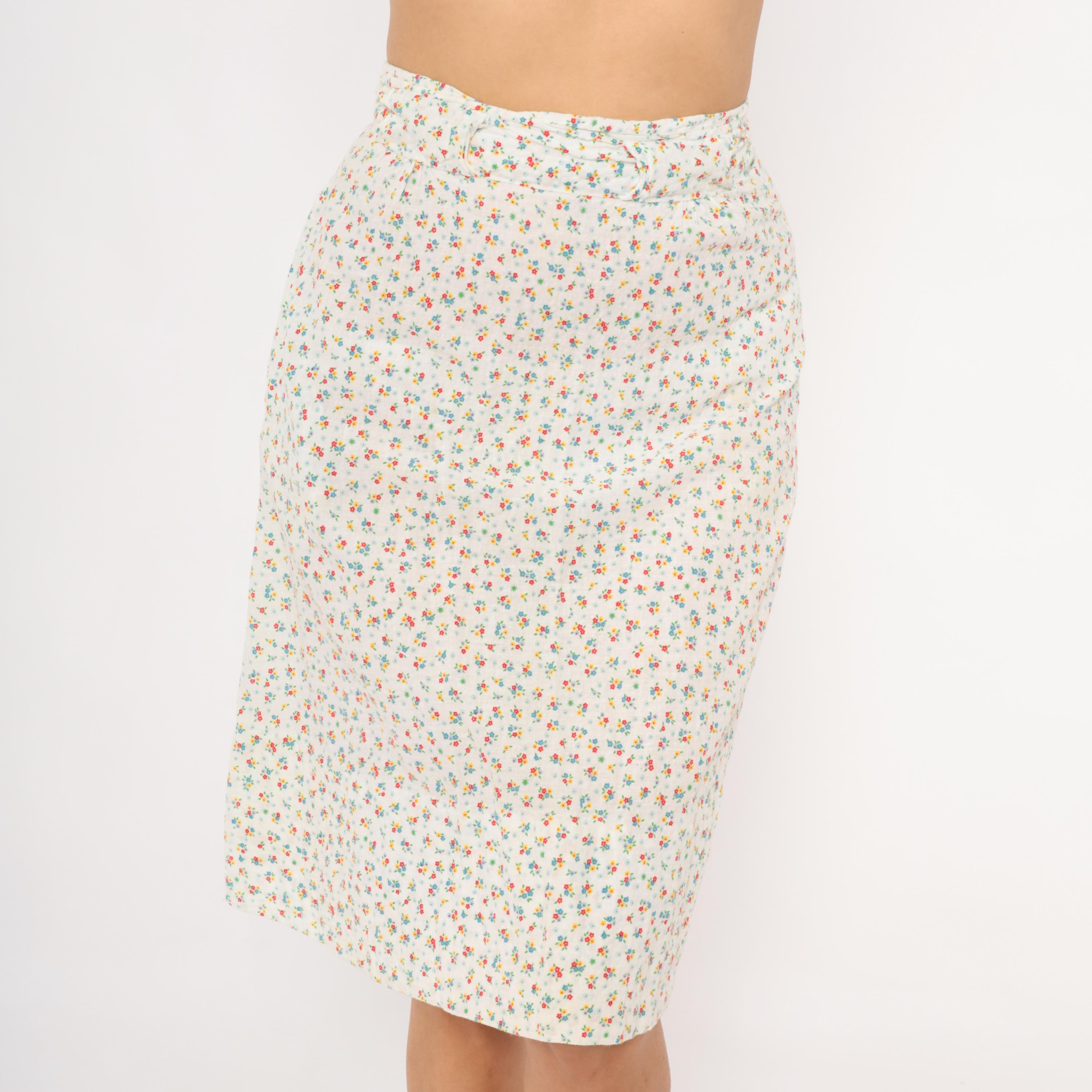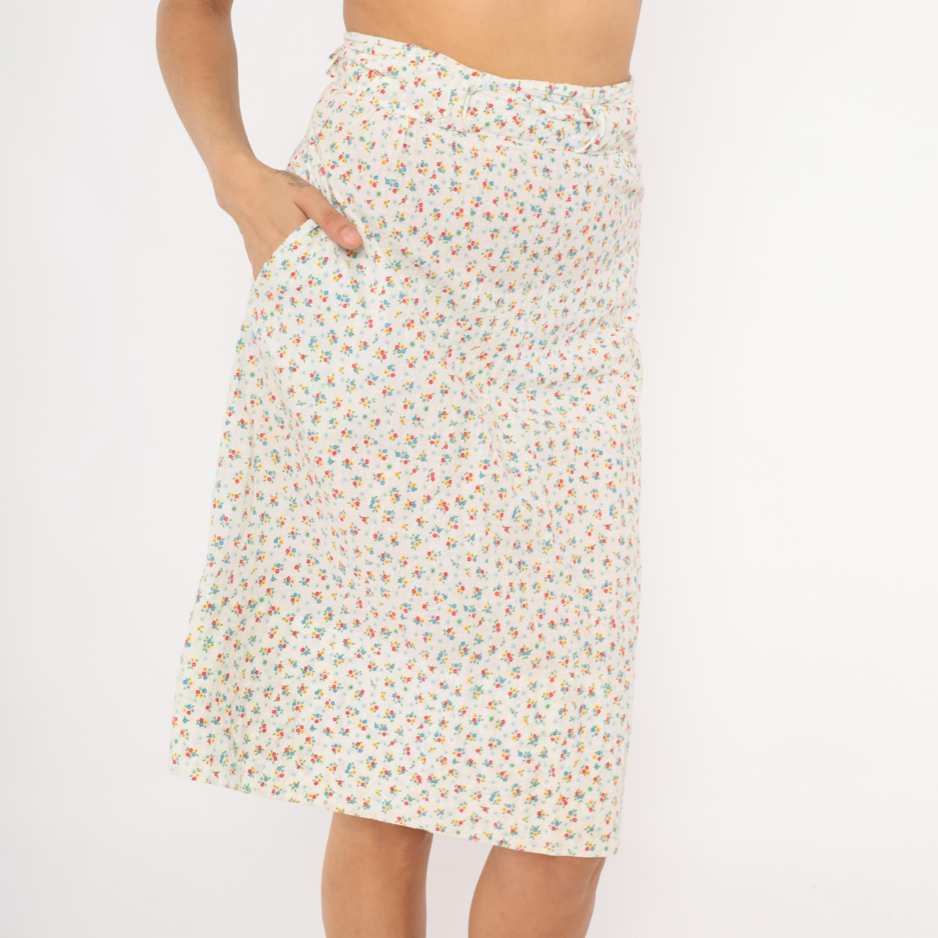 White A-line skirt with an allover ditsy calico floral print in red, blue, yellow, and green scattered across the fabric. Back zipper with snap closure and a self-fabric tie belt at the waistband. Side seam pockets and a knee-length hem with a slight flare.