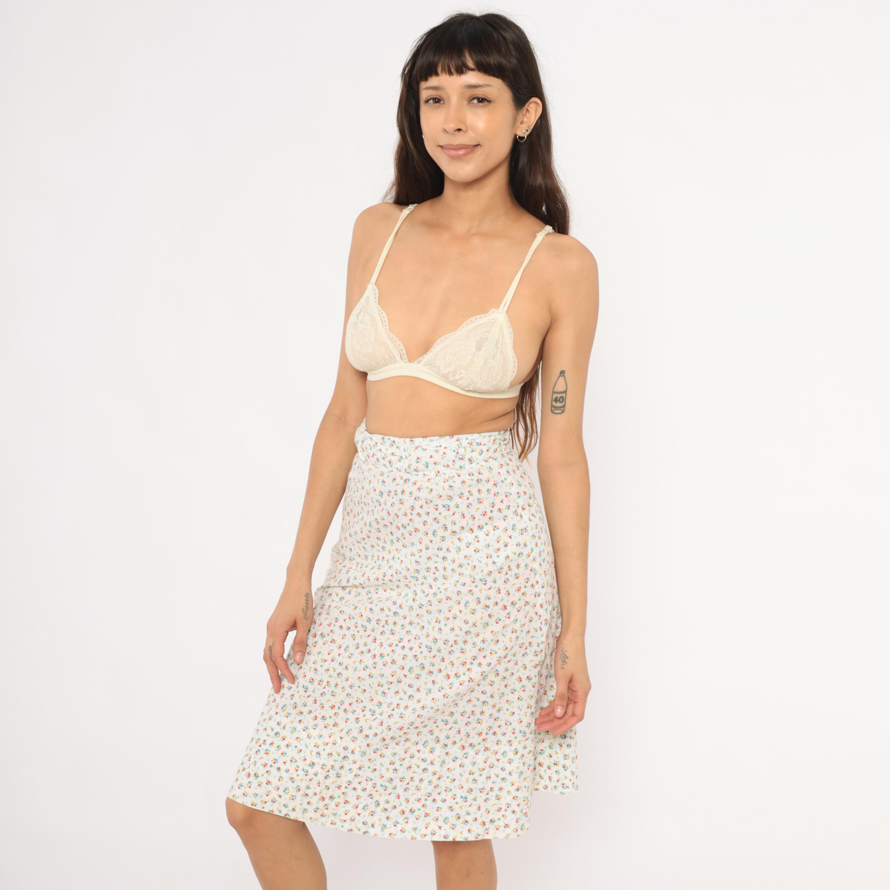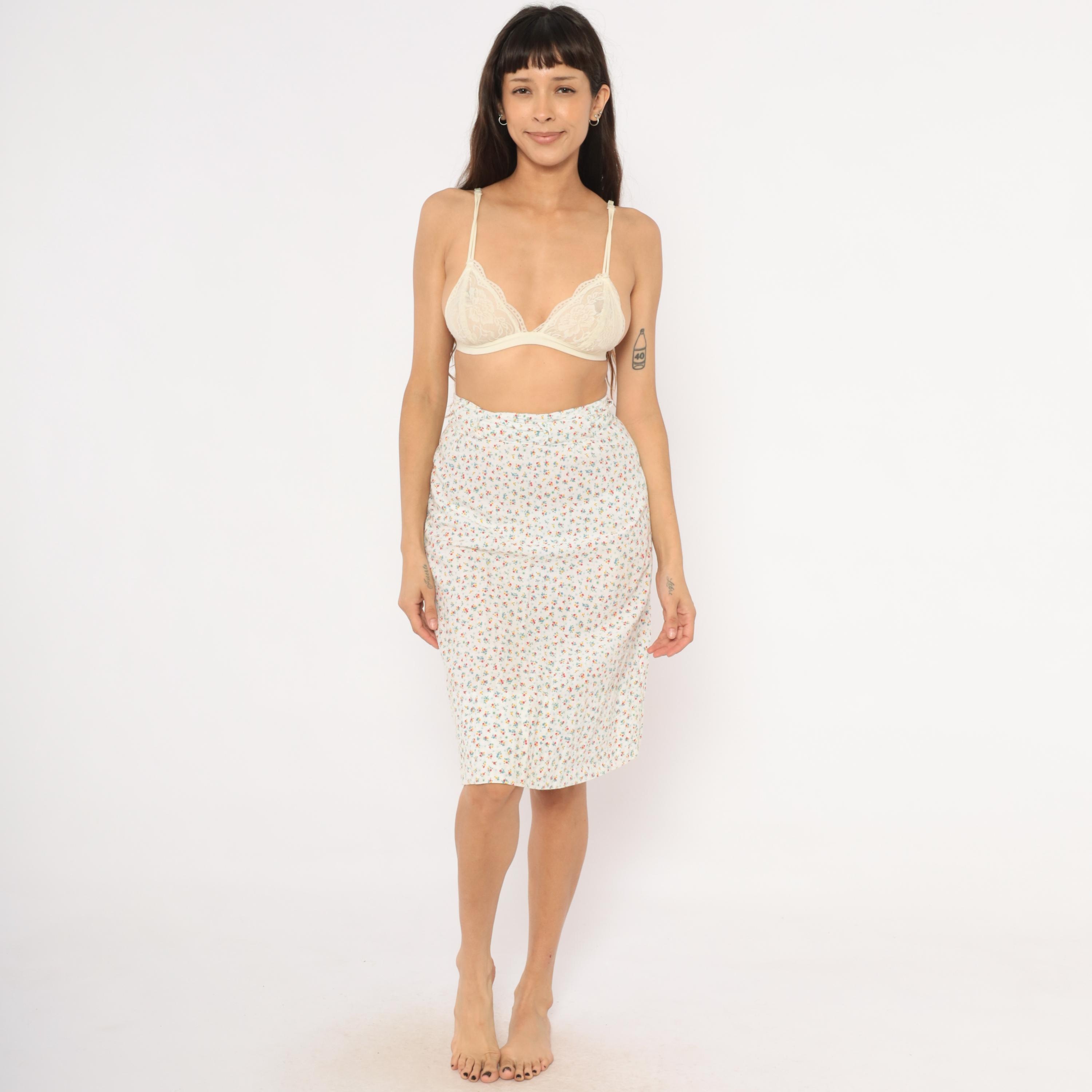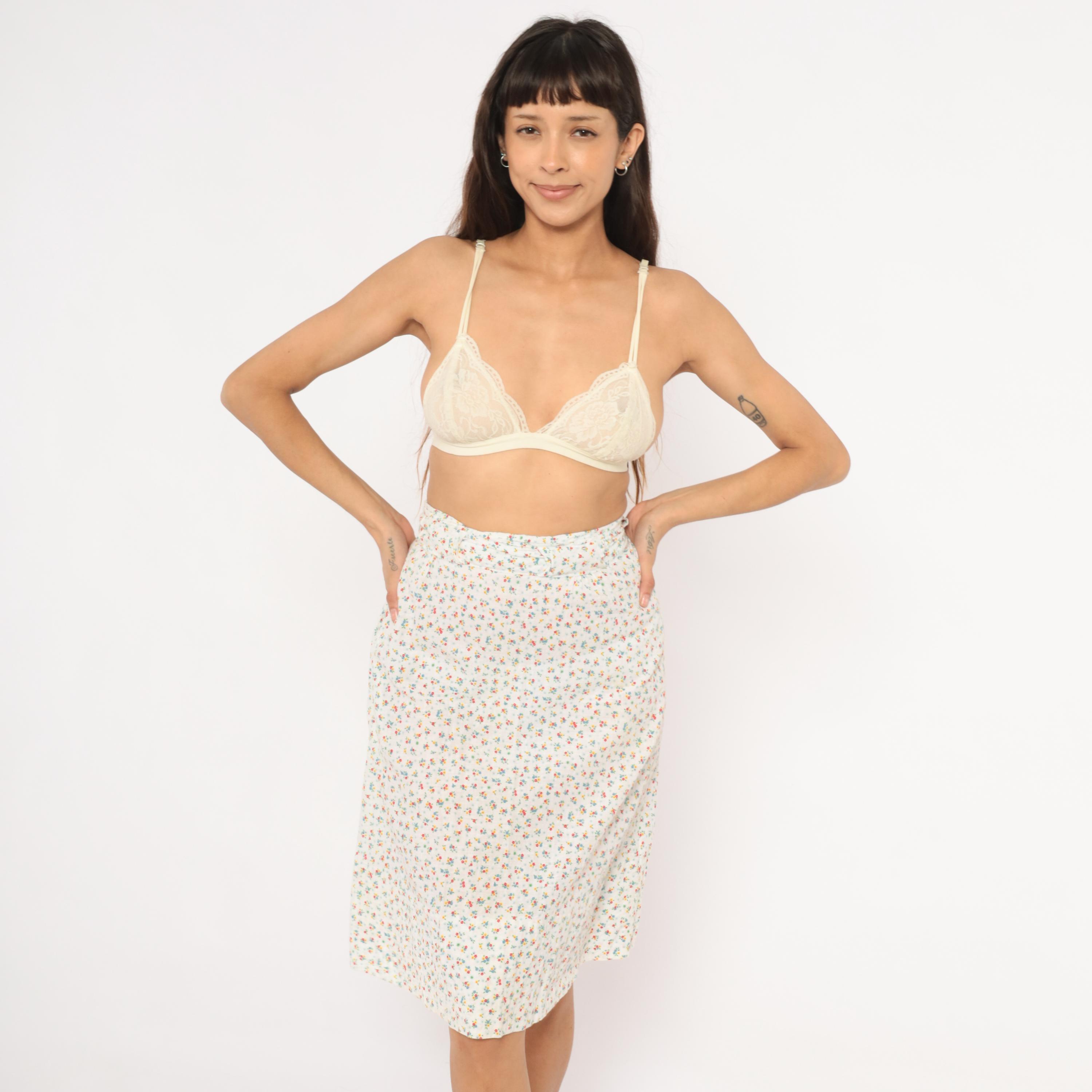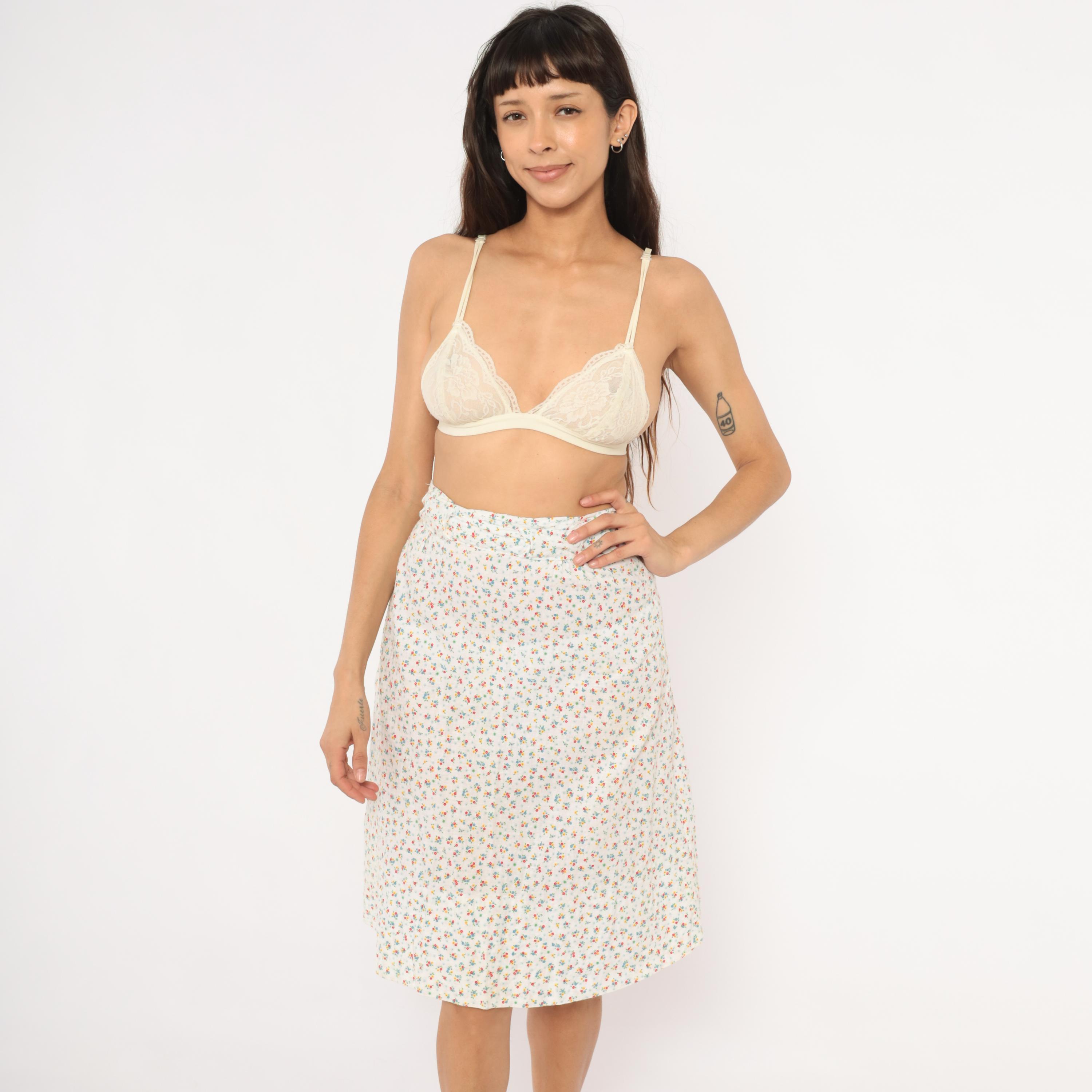 White A-line skirt with an allover ditsy calico floral print in red, blue, yellow, and green scattered across the fabric. Back zipper with snap closure and a self-fabric tie belt at the waistband. Side seam pockets and a knee-length hem with a slight flare.