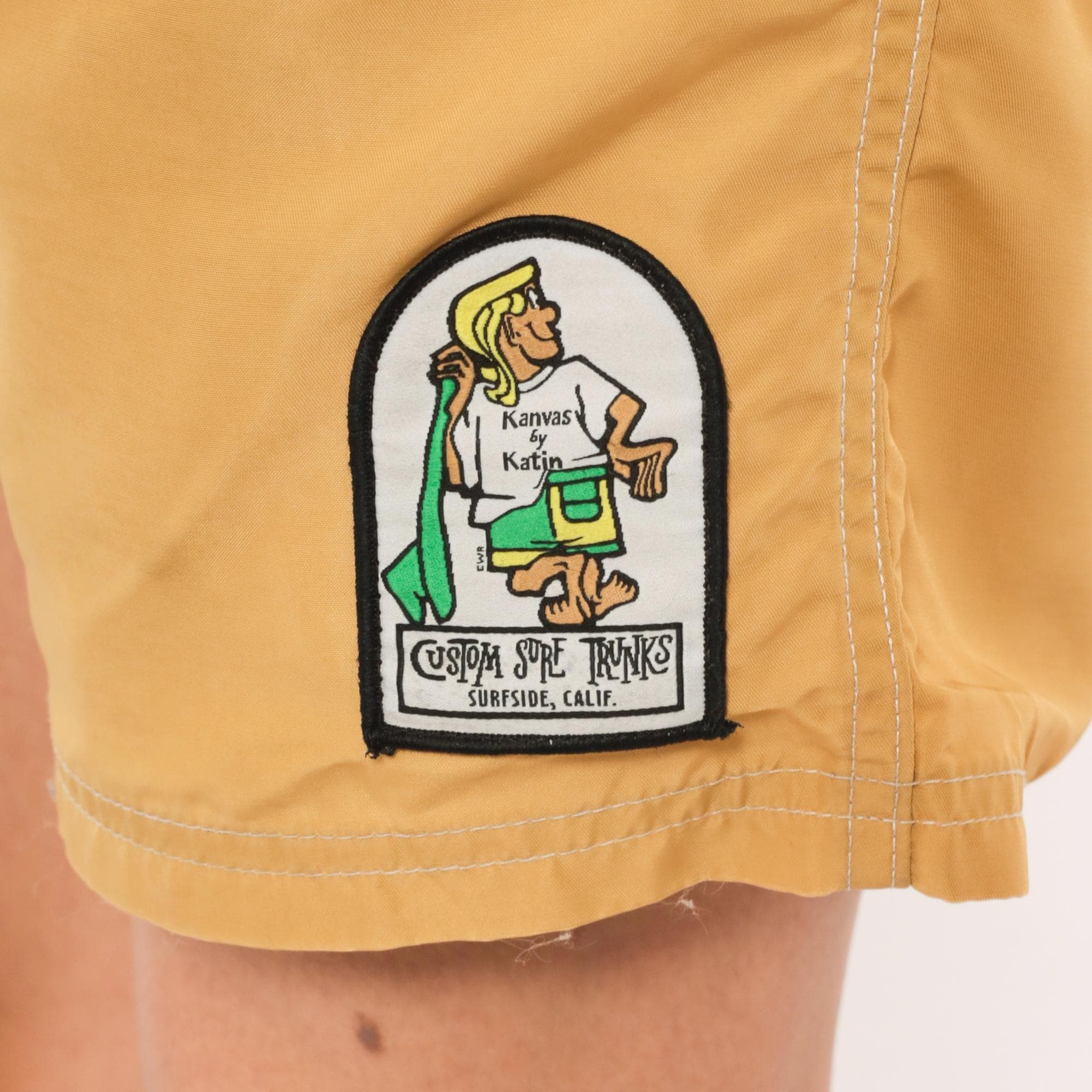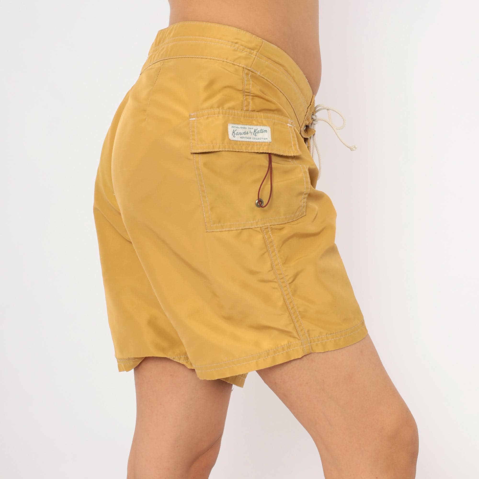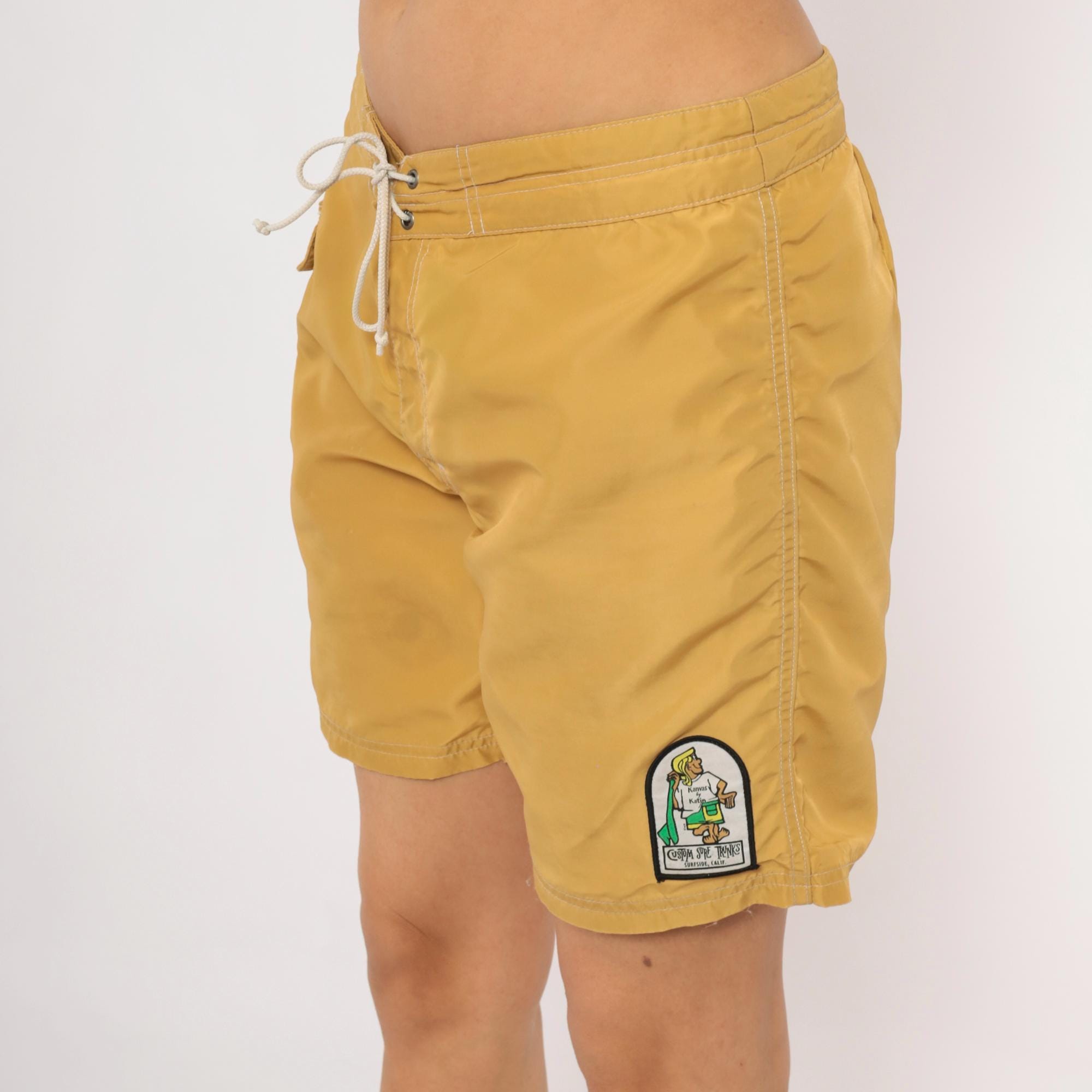 Mustard gold board shorts from Kanvas by Katin with drawstring tie closure at the front and a metal grommet eyelet. Side seam cargo pocket on the right leg with a secondary cord pull. Embroidered patch on the lower left leg depicting the iconic Katin surfer logo with "Custom Surf Trunks, Surfside, Calif." text beneath.