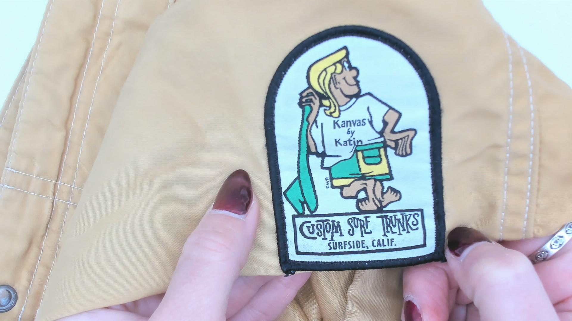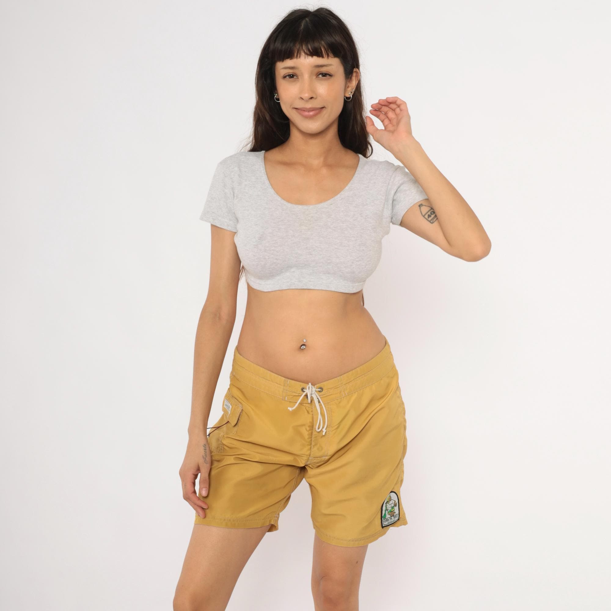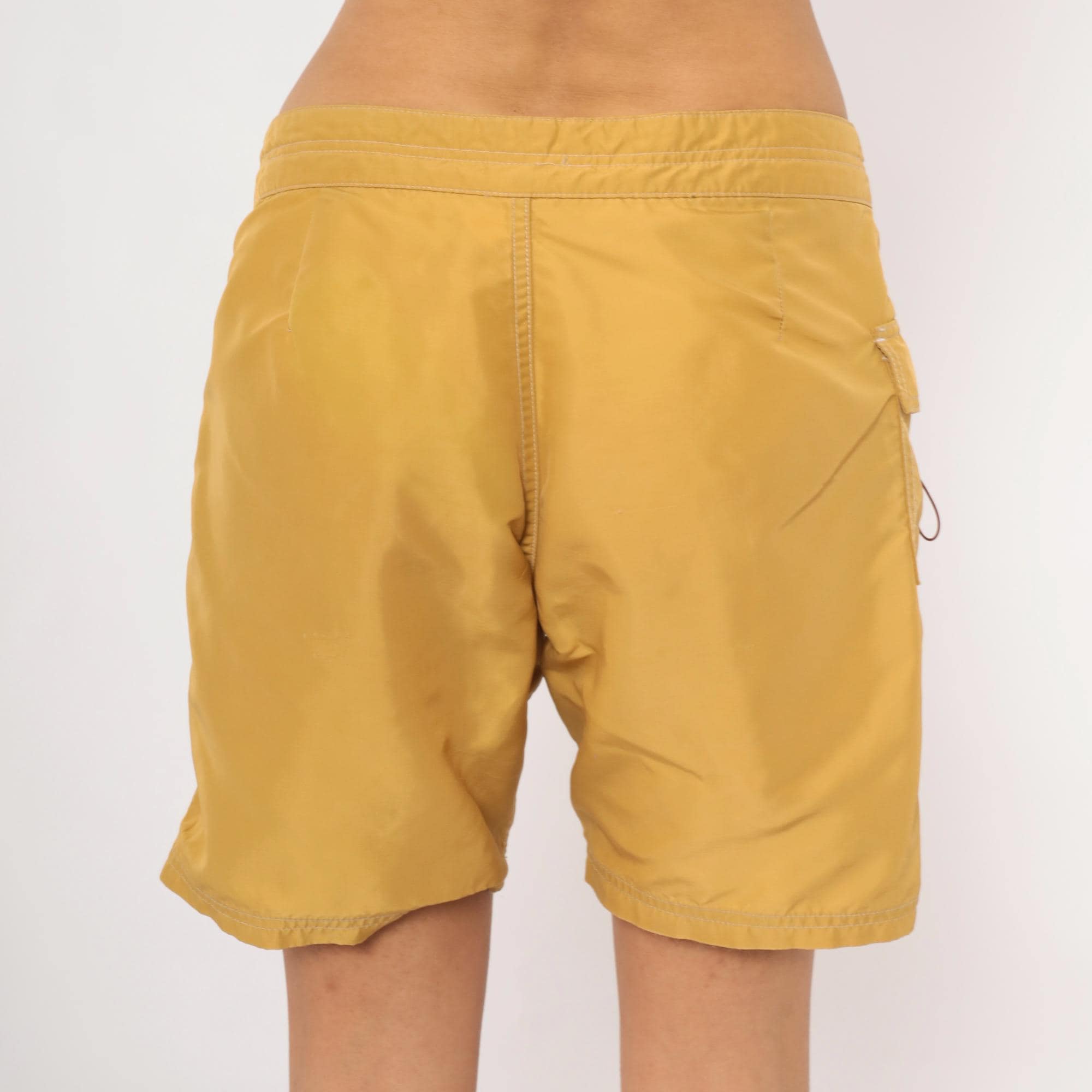 Mustard gold board shorts from Kanvas by Katin with drawstring tie closure at the front and a metal grommet eyelet. Side seam cargo pocket on the right leg with a secondary cord pull. Embroidered patch on the lower left leg depicting the iconic Katin surfer logo with "Custom Surf Trunks, Surfside, Calif." text beneath.