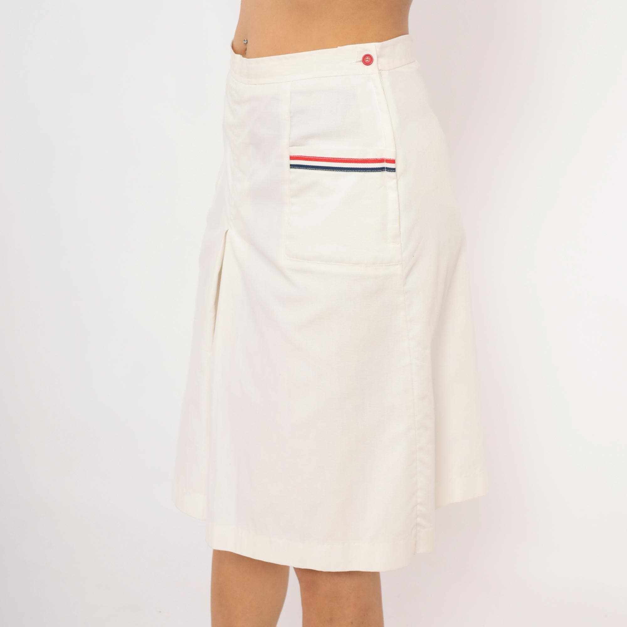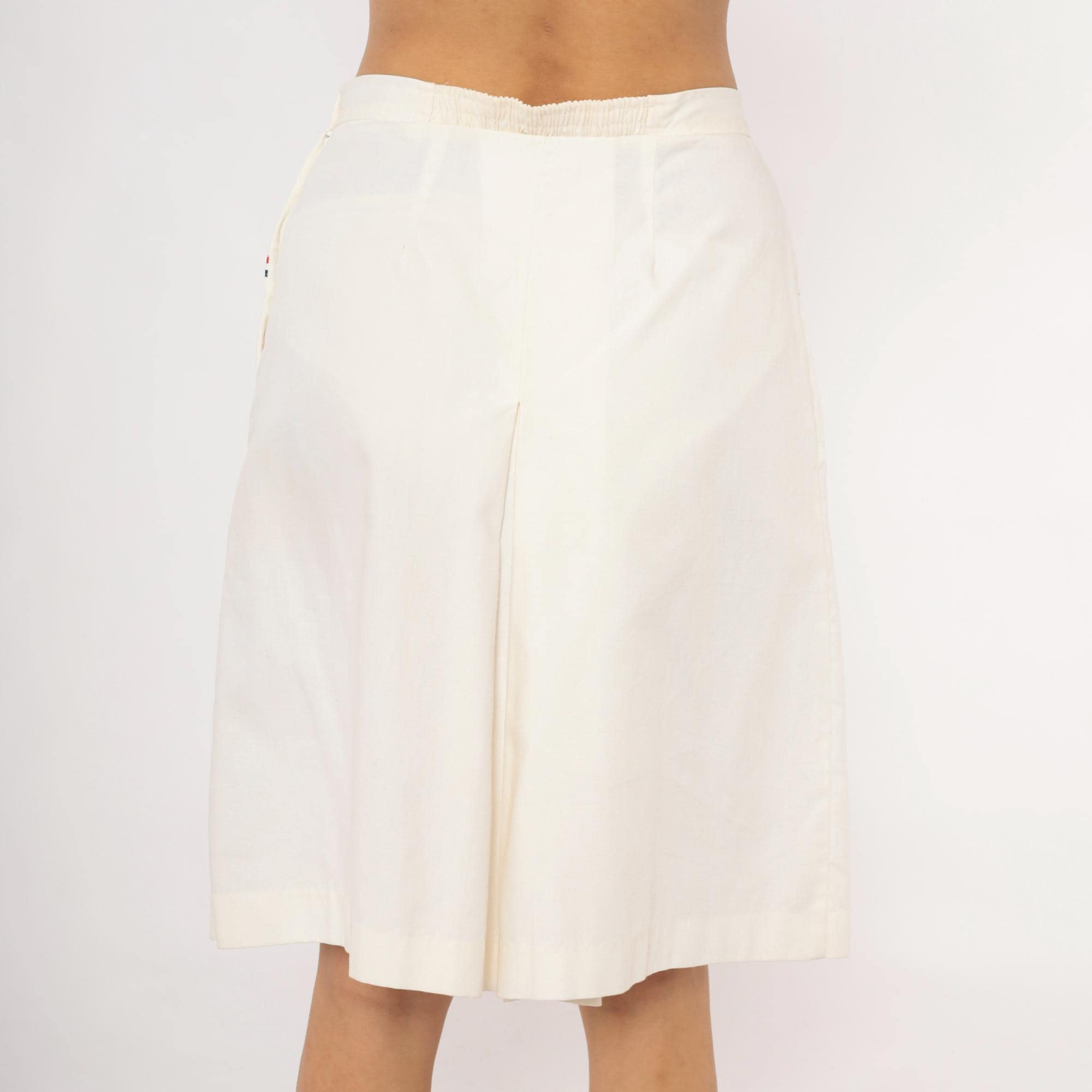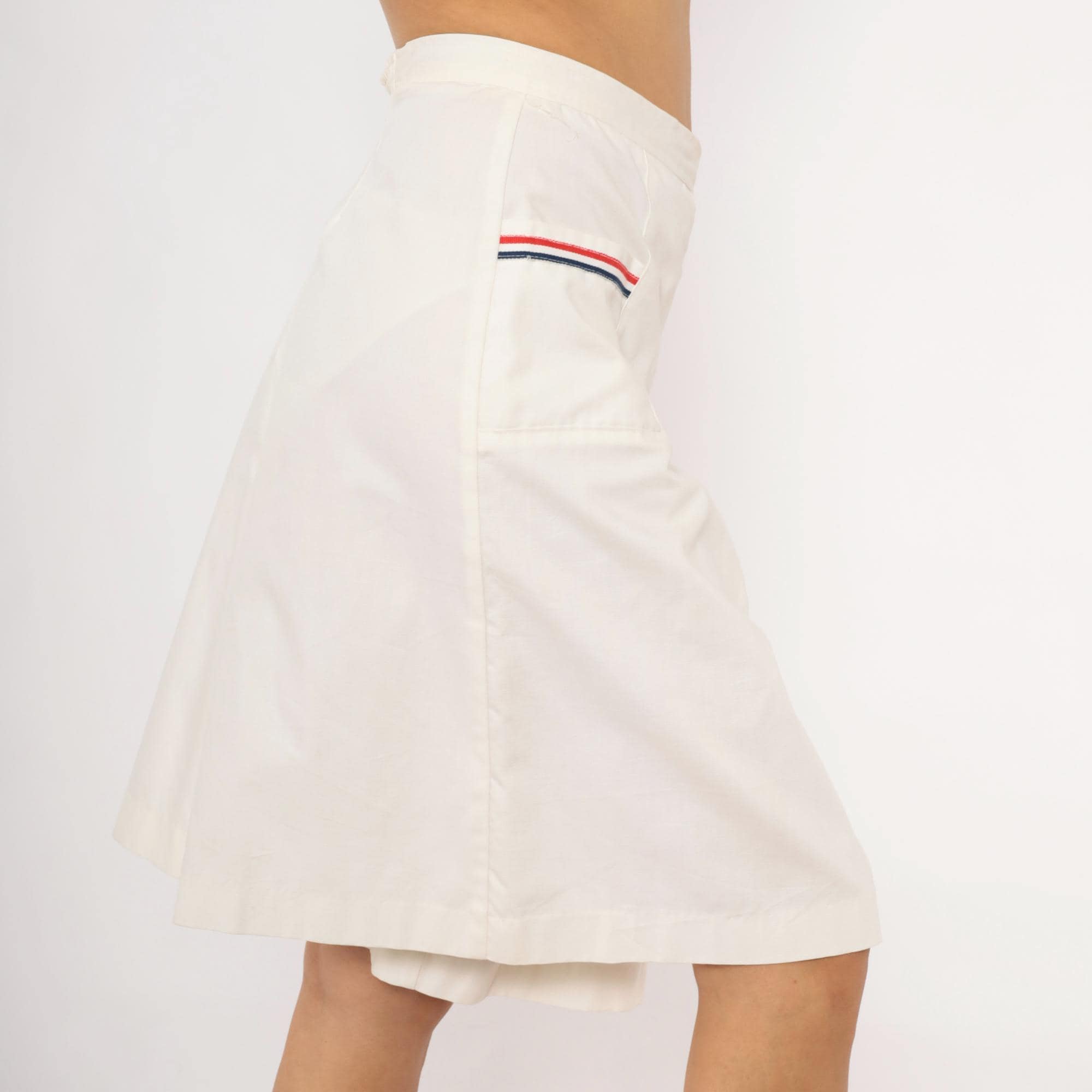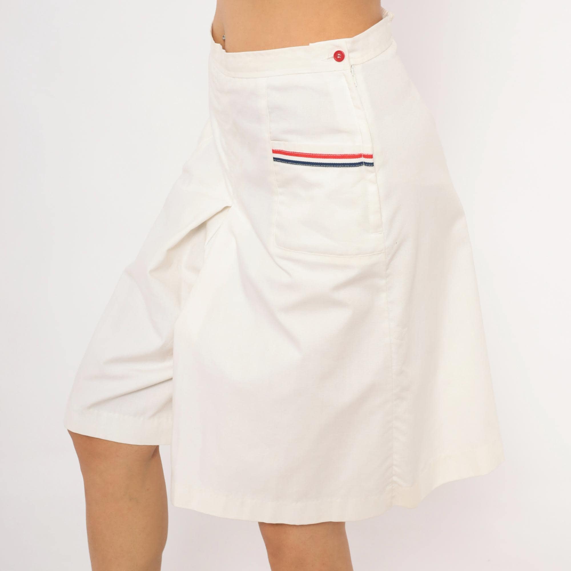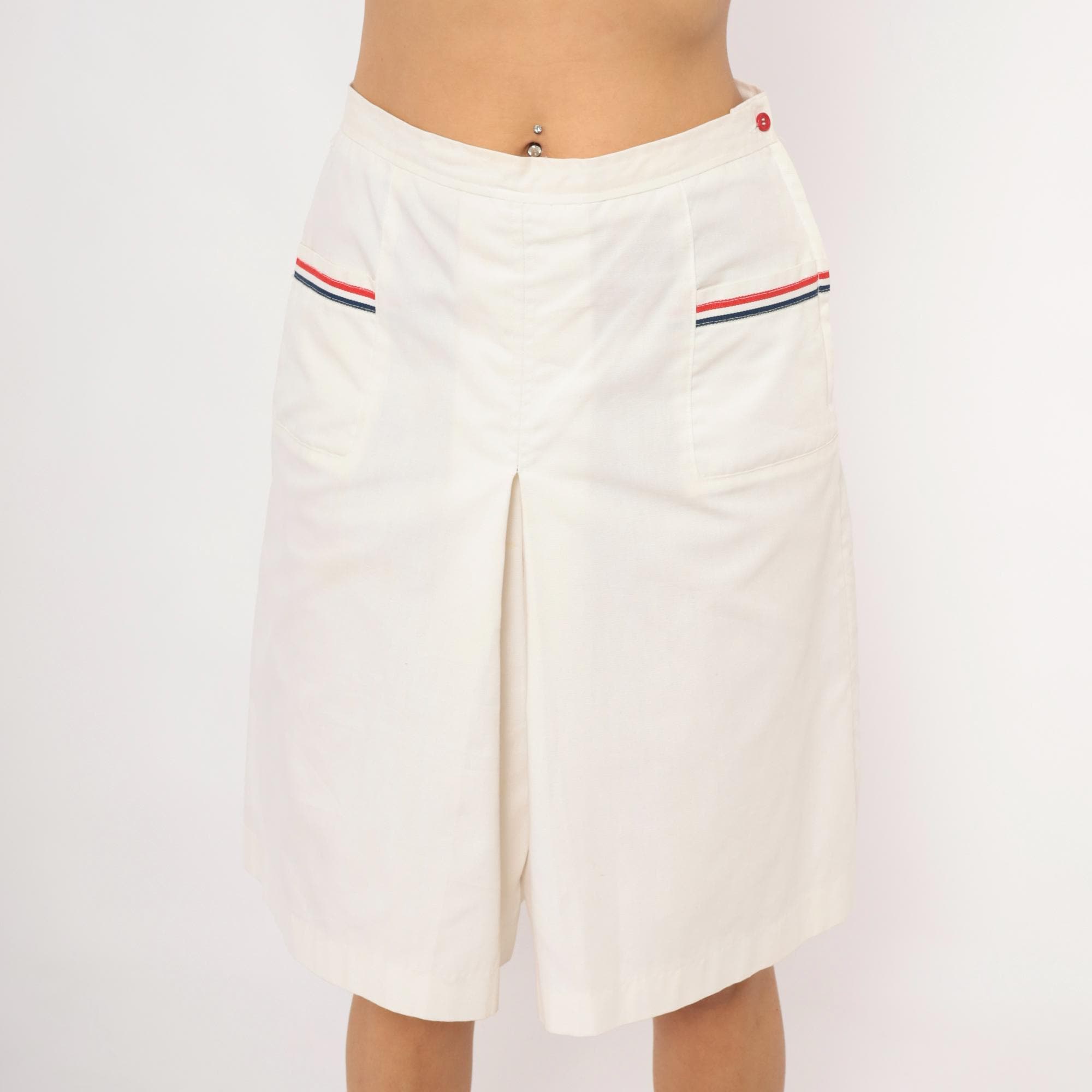 White culottes with a center front box pleat and two front patch pockets, each trimmed with red and navy ribbon striping. Side button and zipper closure at the left hip with a single red button, and elasticized back waistband.