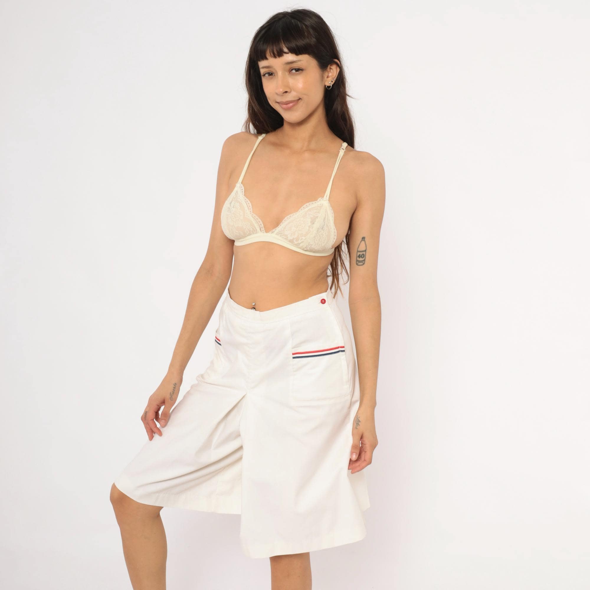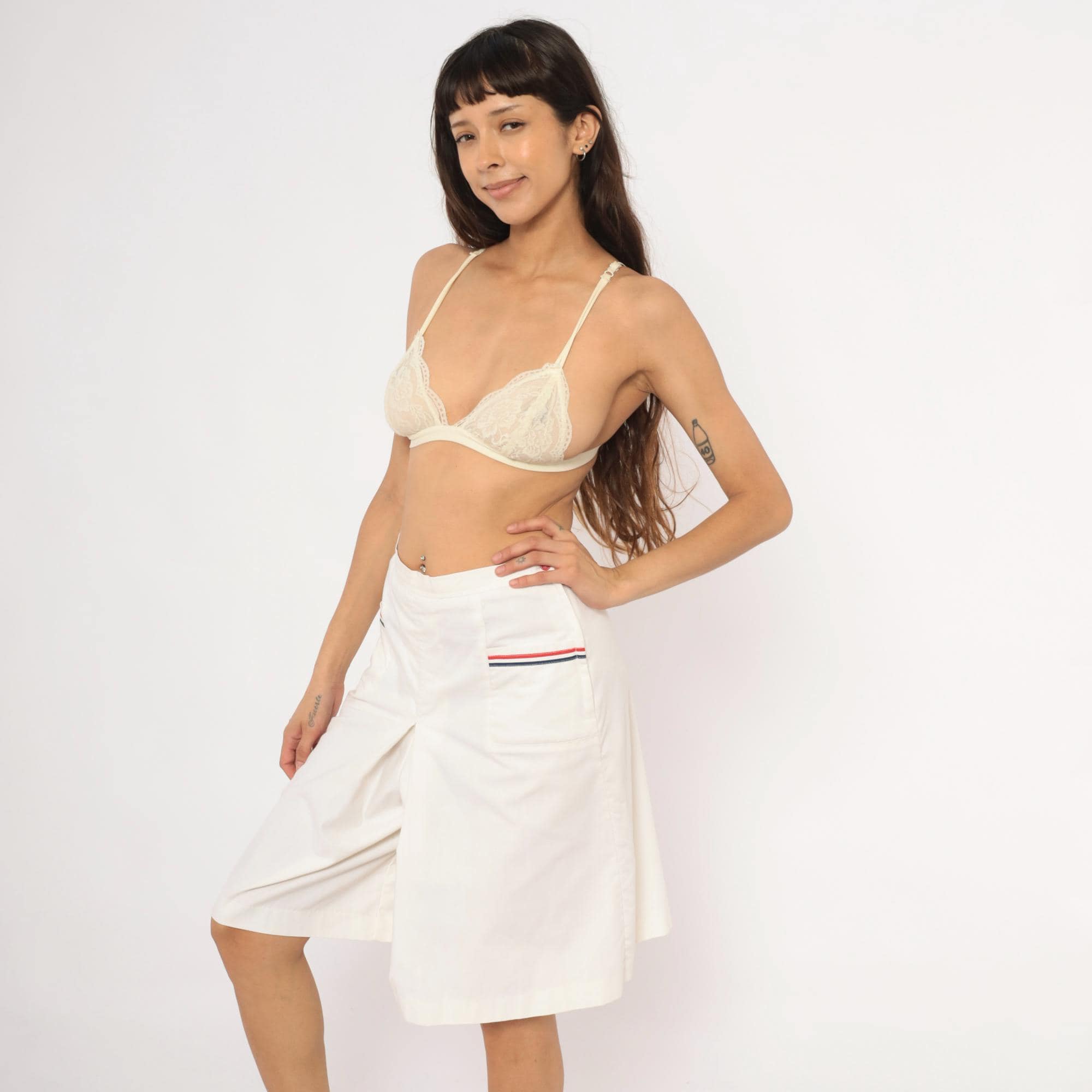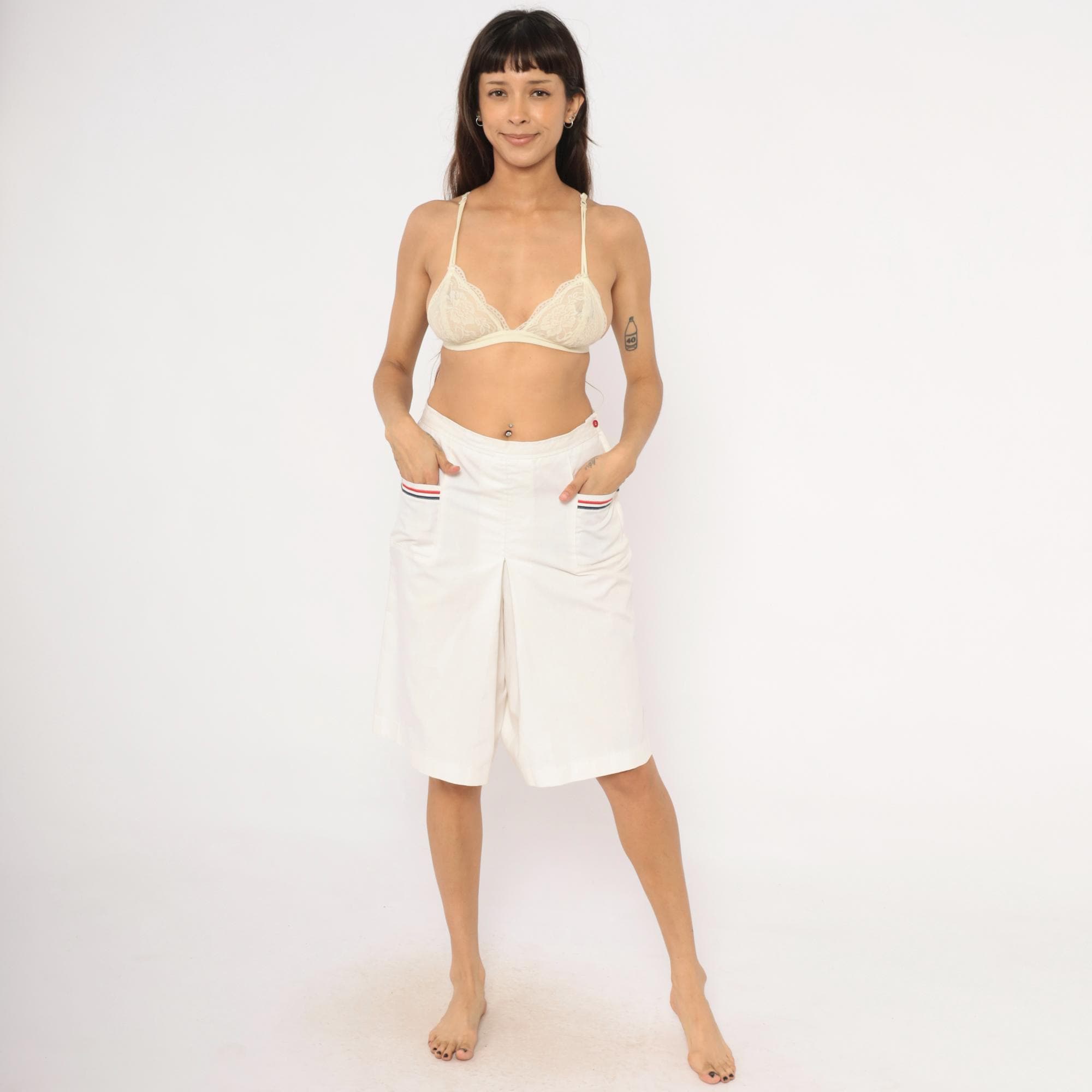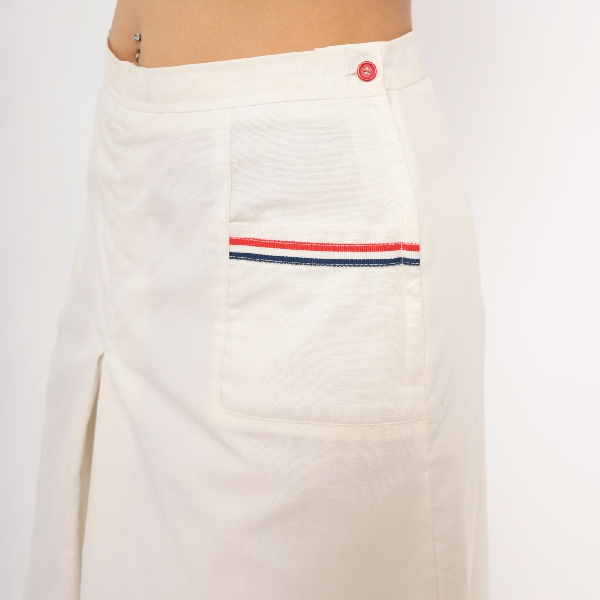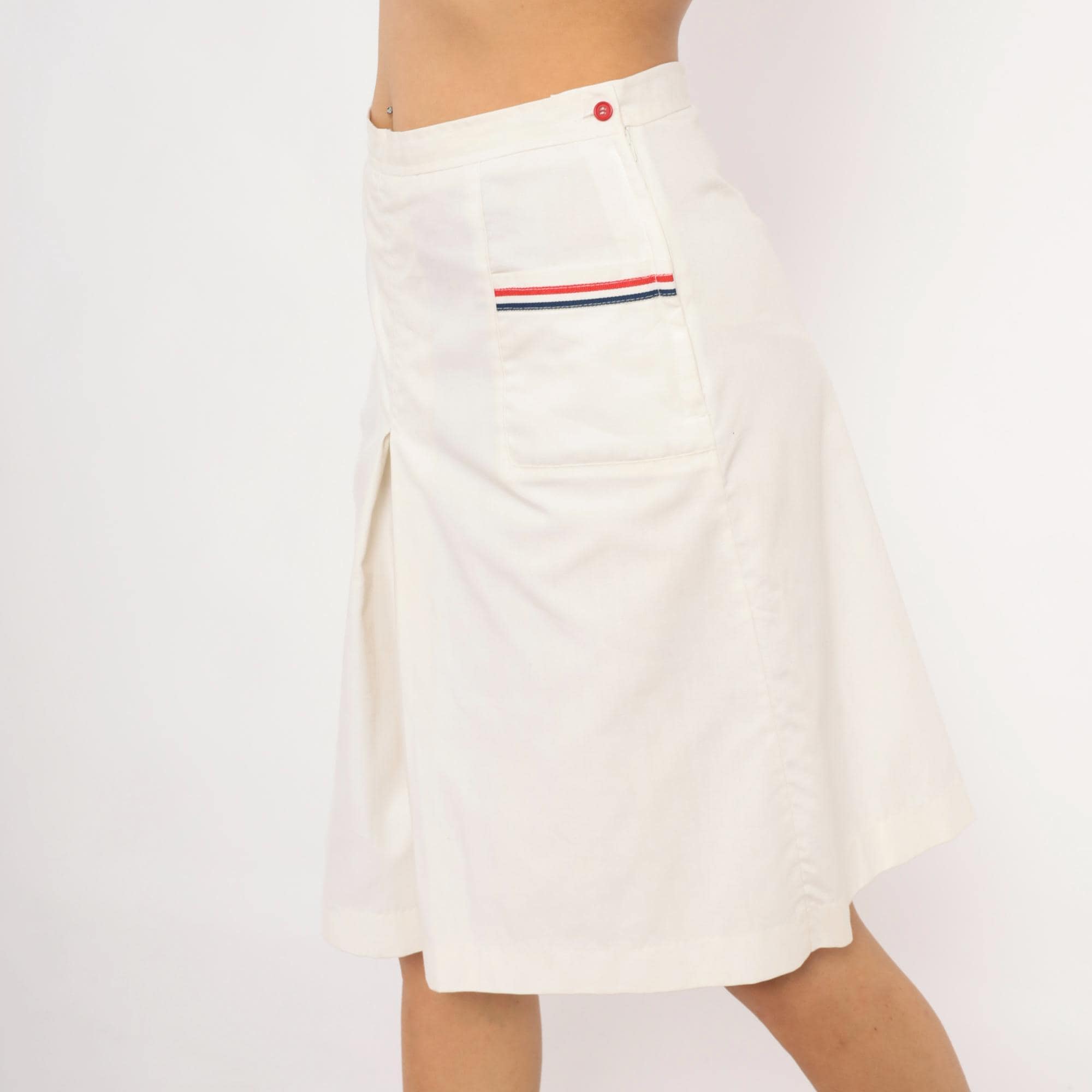 White culottes with a center front box pleat and two front patch pockets, each trimmed with red and navy ribbon striping. Side button and zipper closure at the left hip with a single red button, and elasticized back waistband.