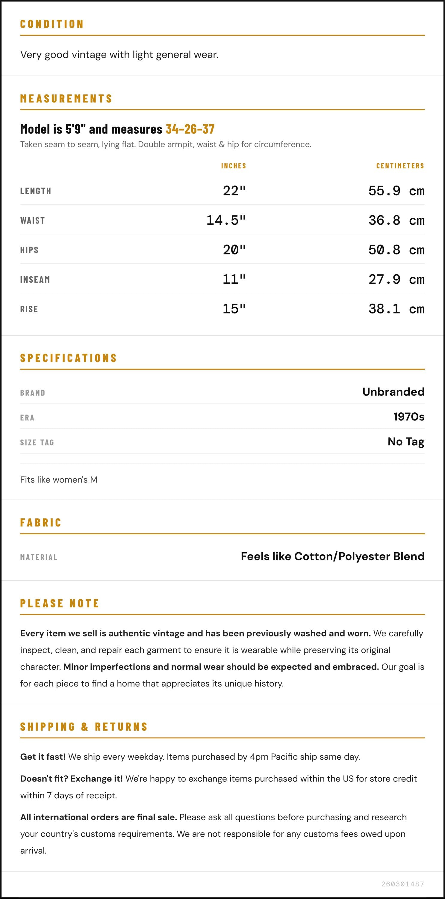 Vintage denim was usually made without any stretch, unlike modern jeans. Check the measurements to ensure proper fit, and remember to give yourself a little wiggle room in the waist and hips, depending on your preferred fit.
