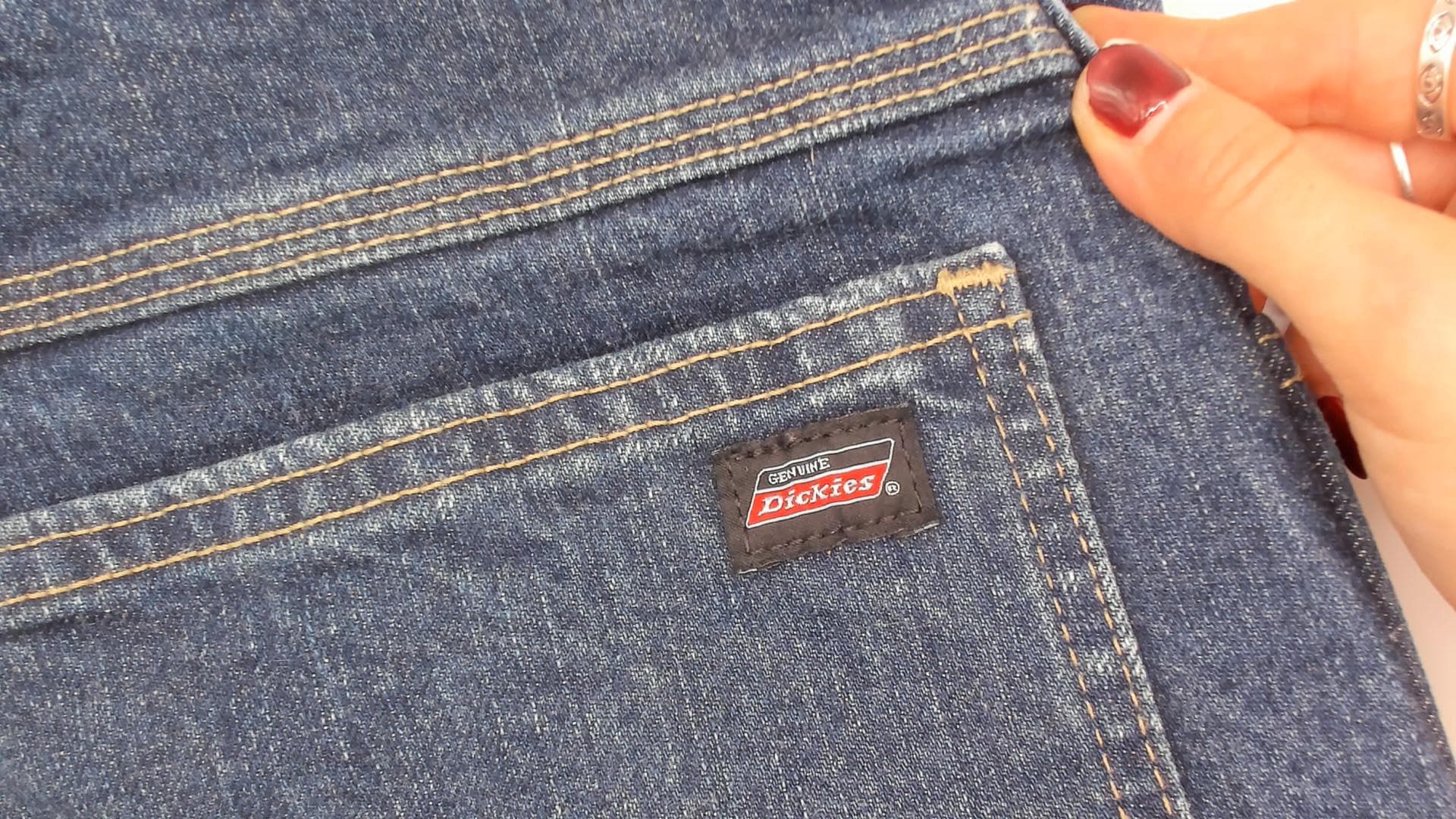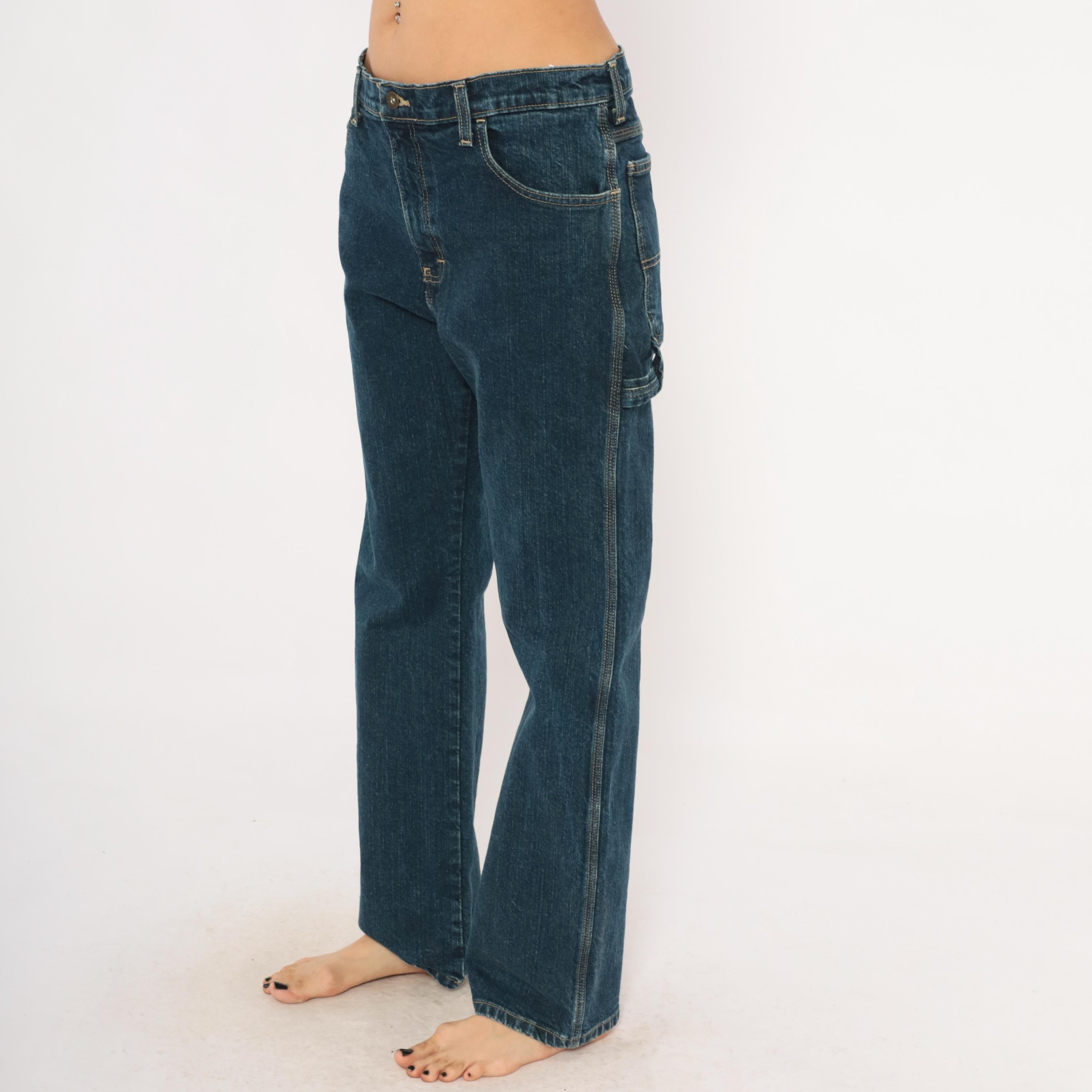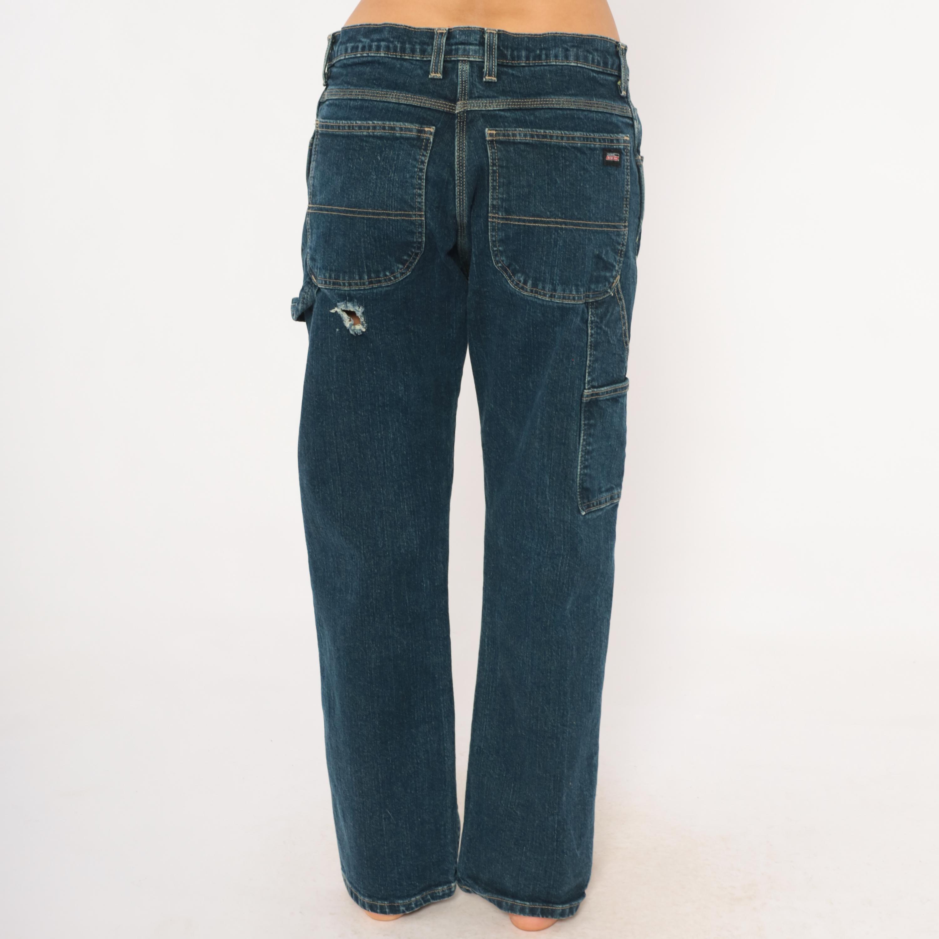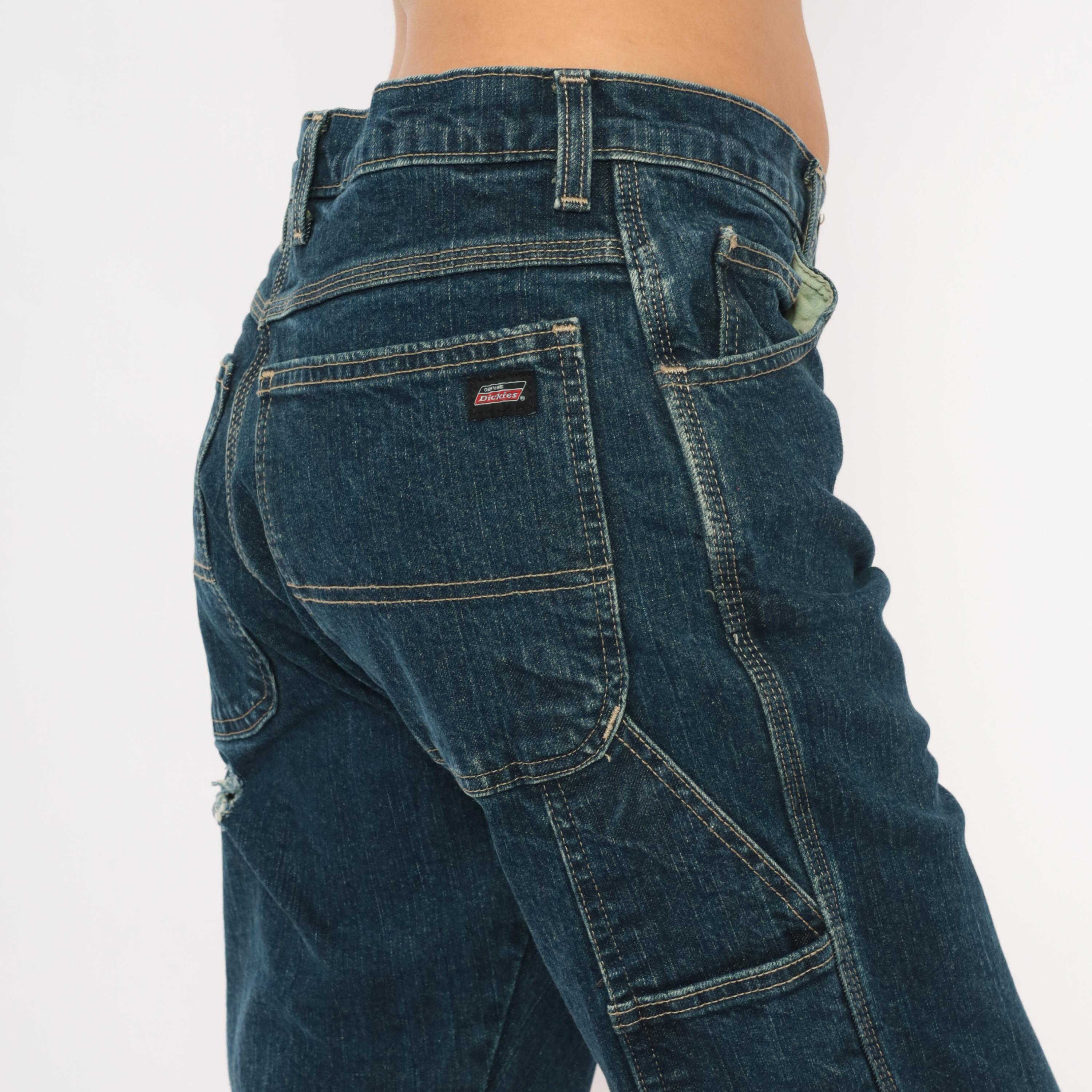 Dark wash Dickies carpenter jeans with straight leg cut and contrast gold topstitching throughout. Front zipper closure, traditional five-pocket configuration plus a side cargo pocket on the left leg and a hammer loop. Two back pockets with a small distressed hole below the right pocket, and a small Dickies logo tab on the back left pocket.