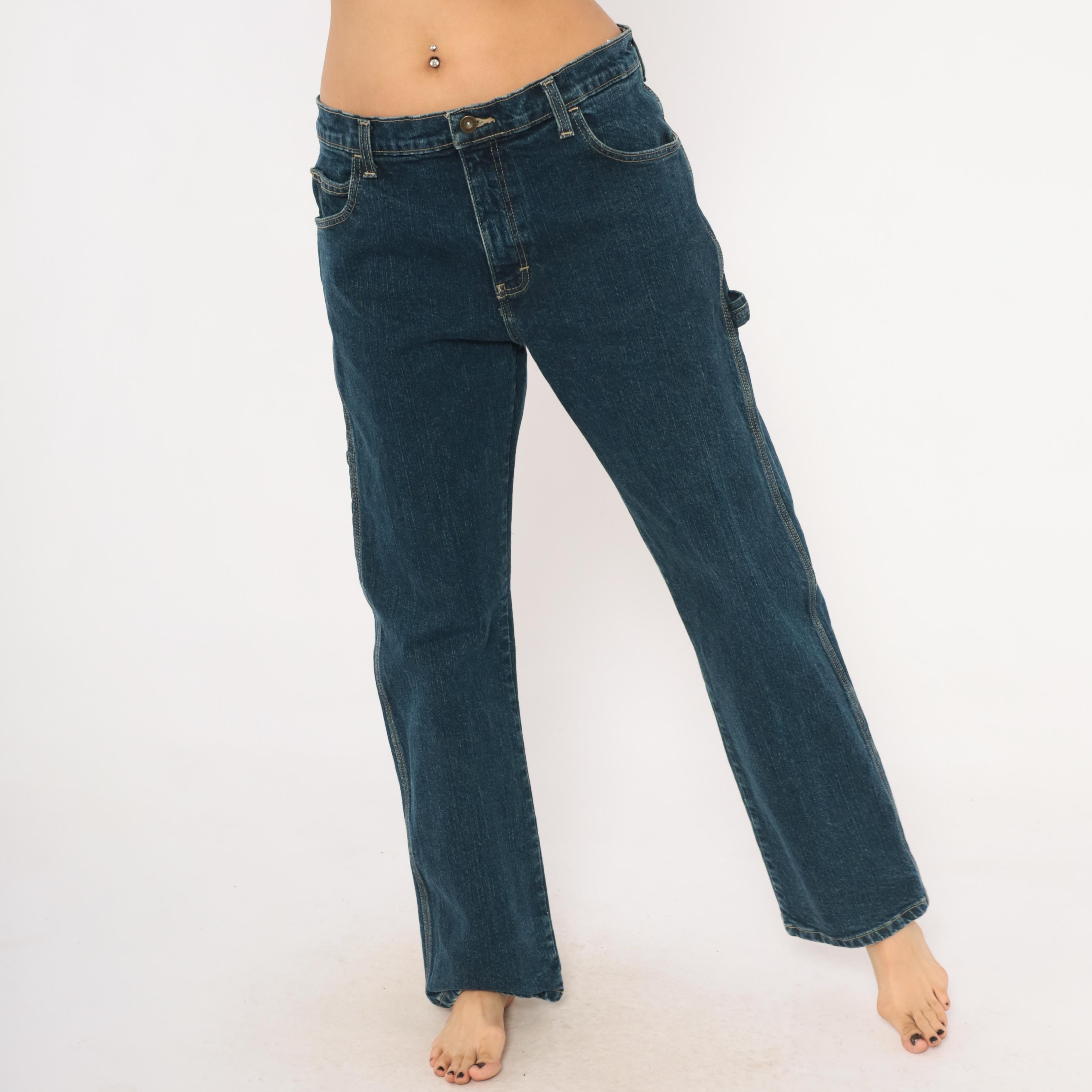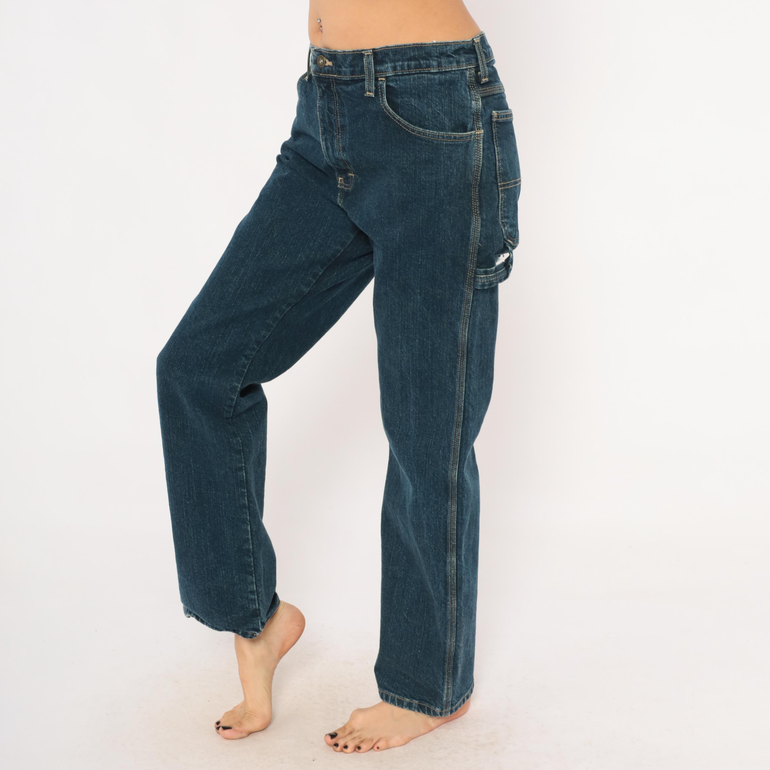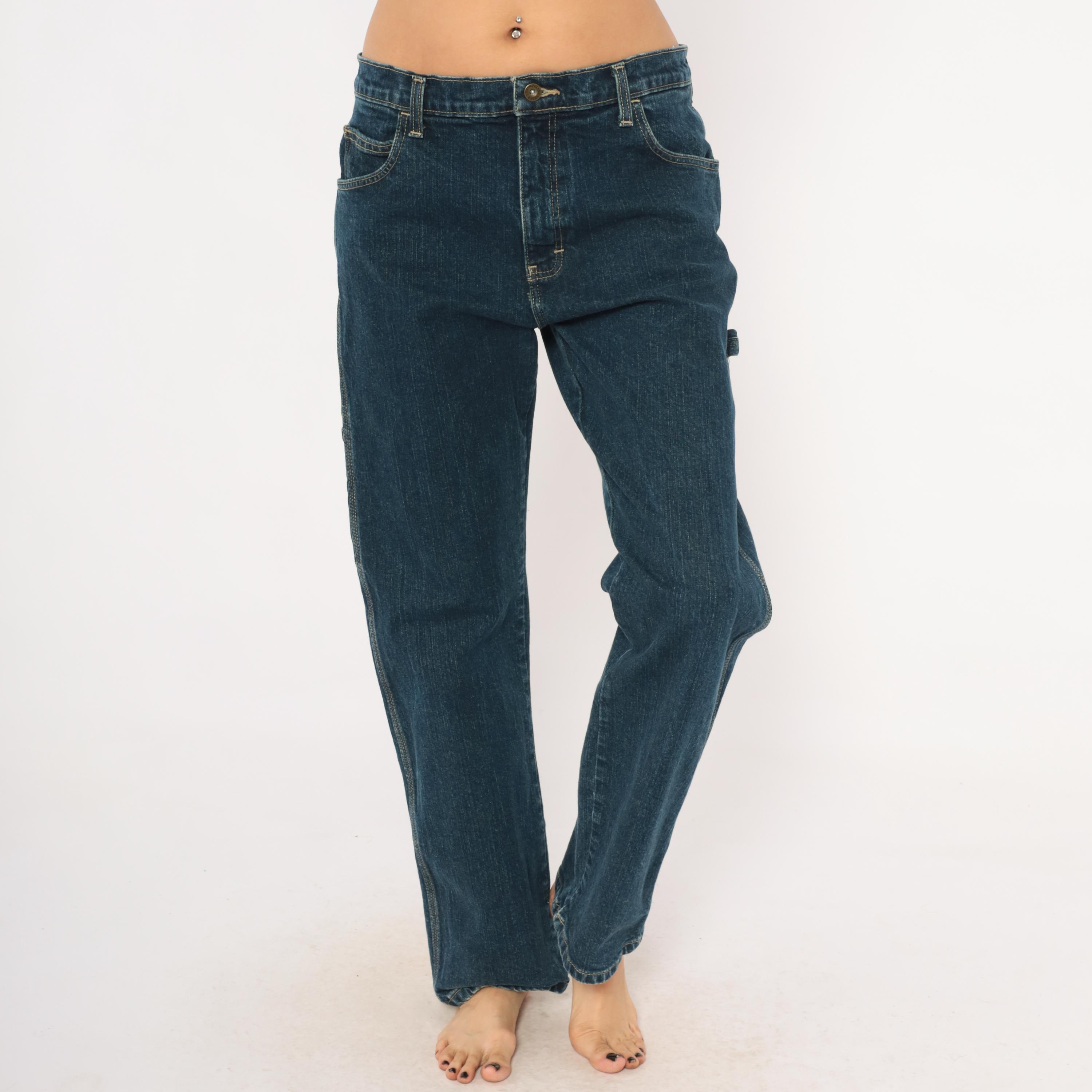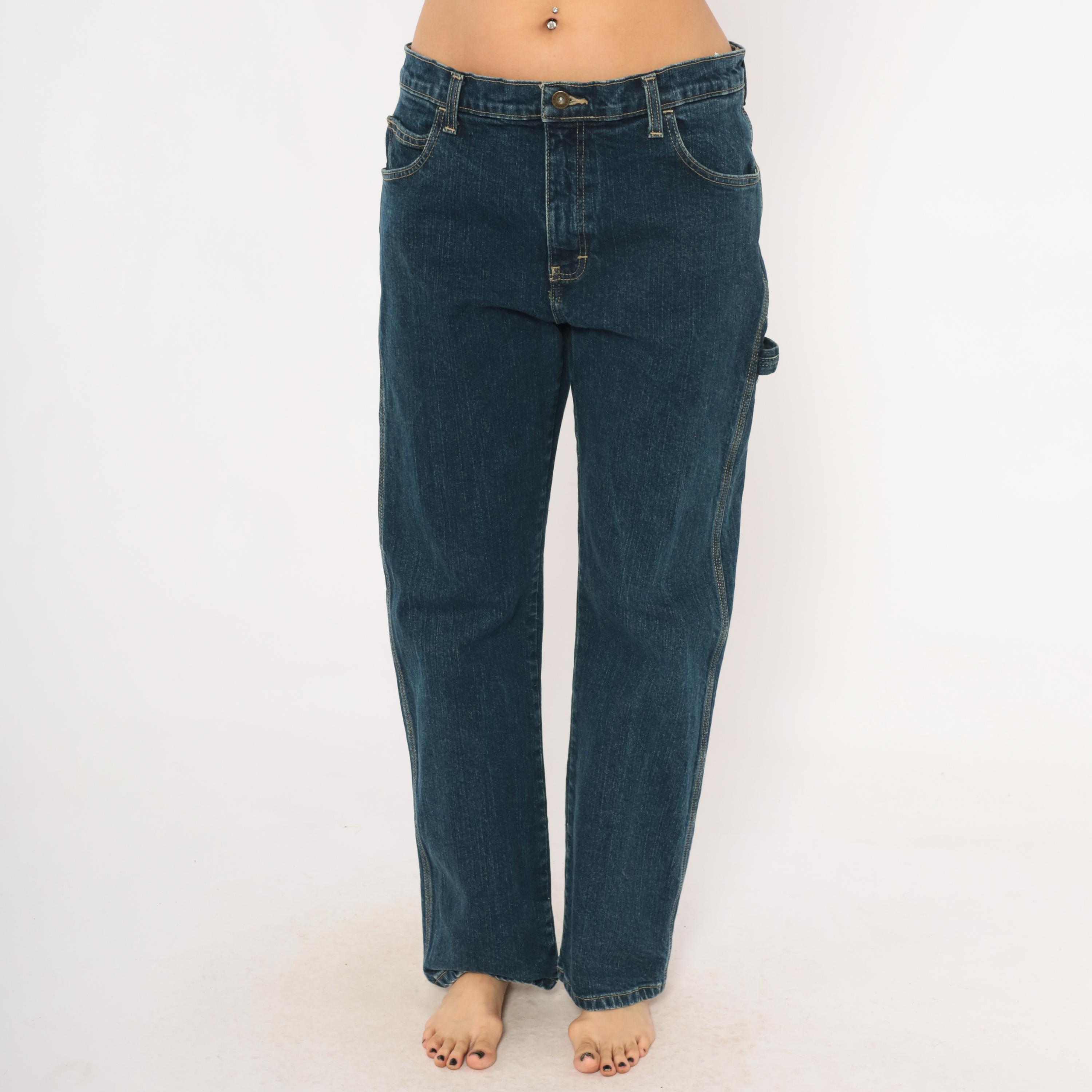 Dark wash Dickies carpenter jeans with straight leg cut and contrast gold topstitching throughout. Front zipper closure, traditional five-pocket configuration plus a side cargo pocket on the left leg and a hammer loop. Two back pockets with a small distressed hole below the right pocket, and a small Dickies logo tab on the back left pocket.