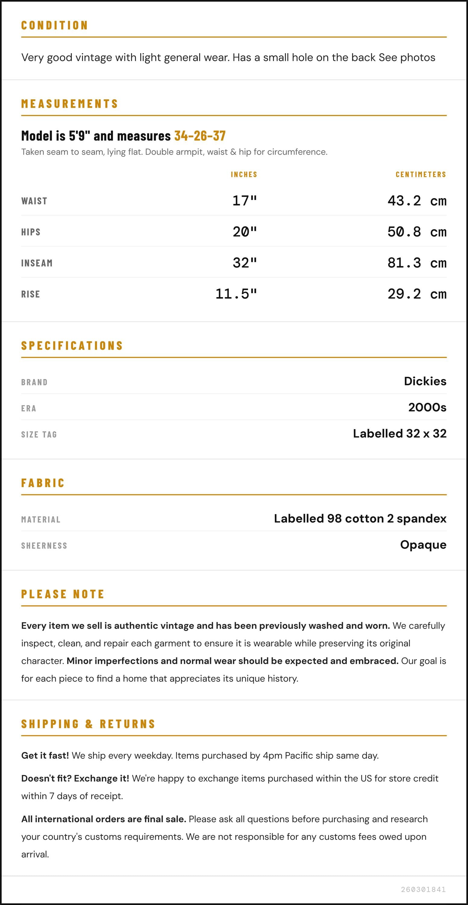 Vintage denim was usually made without any stretch, unlike modern jeans. Check the measurements to ensure proper fit, and remember to give yourself a little wiggle room in the waist and hips, depending on your preferred fit.