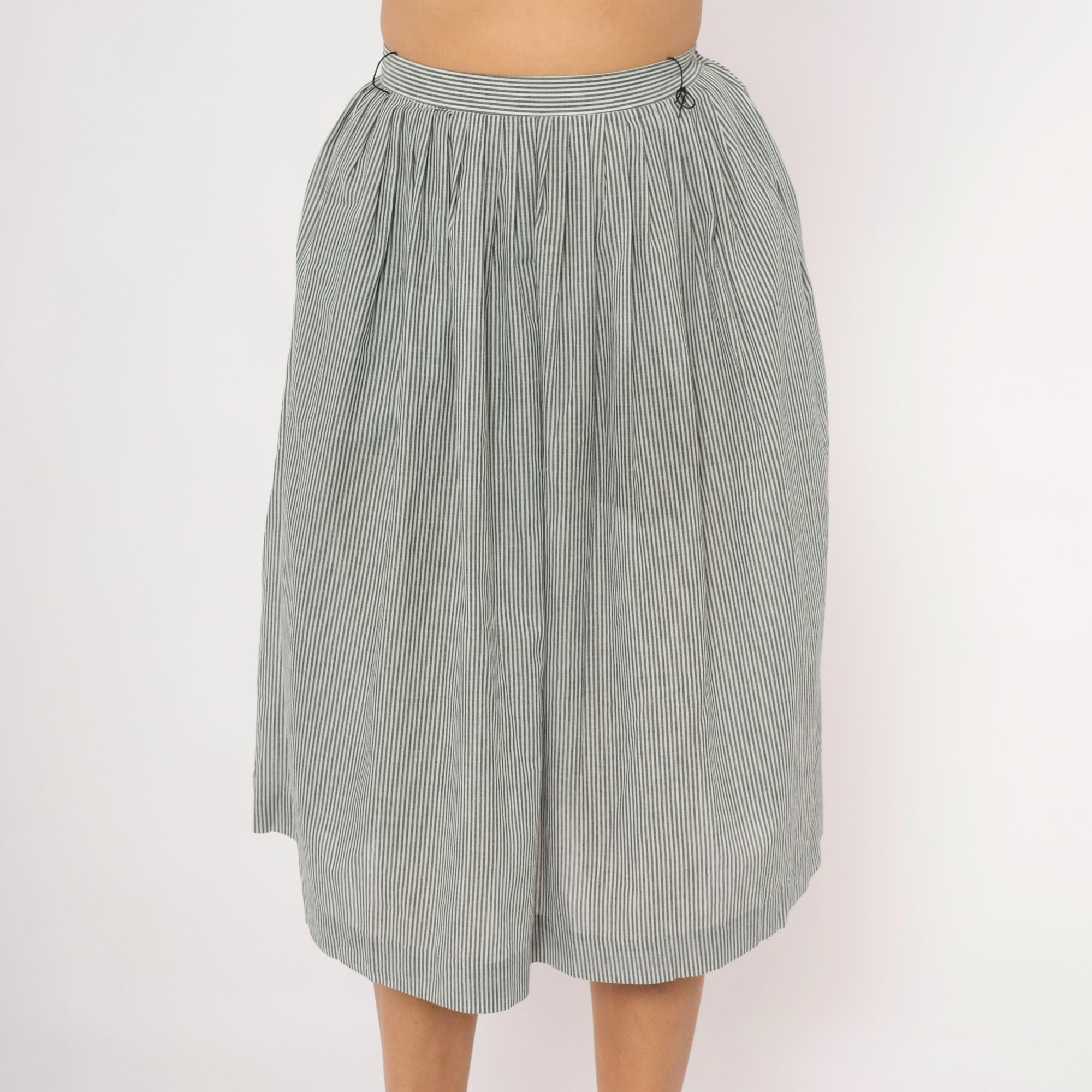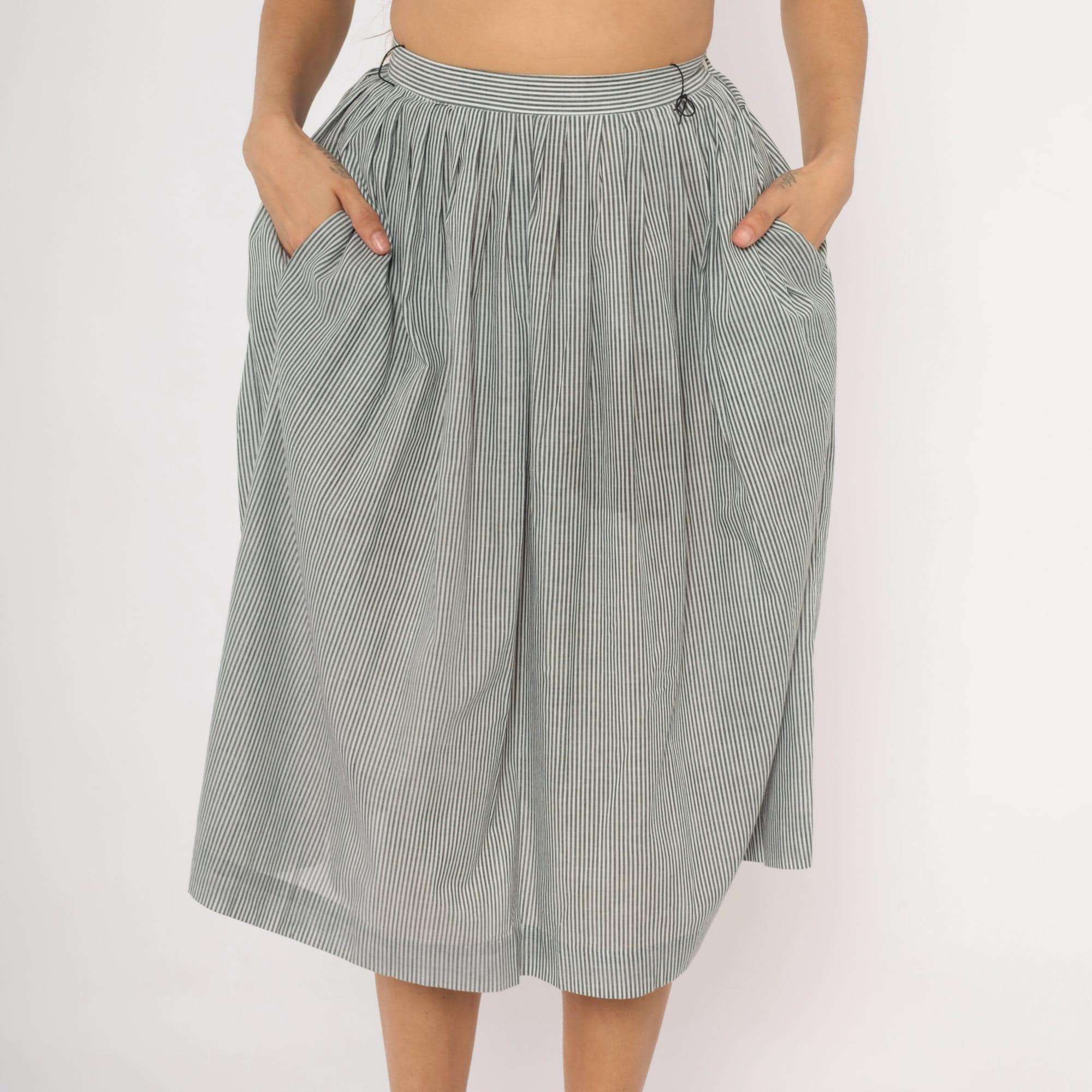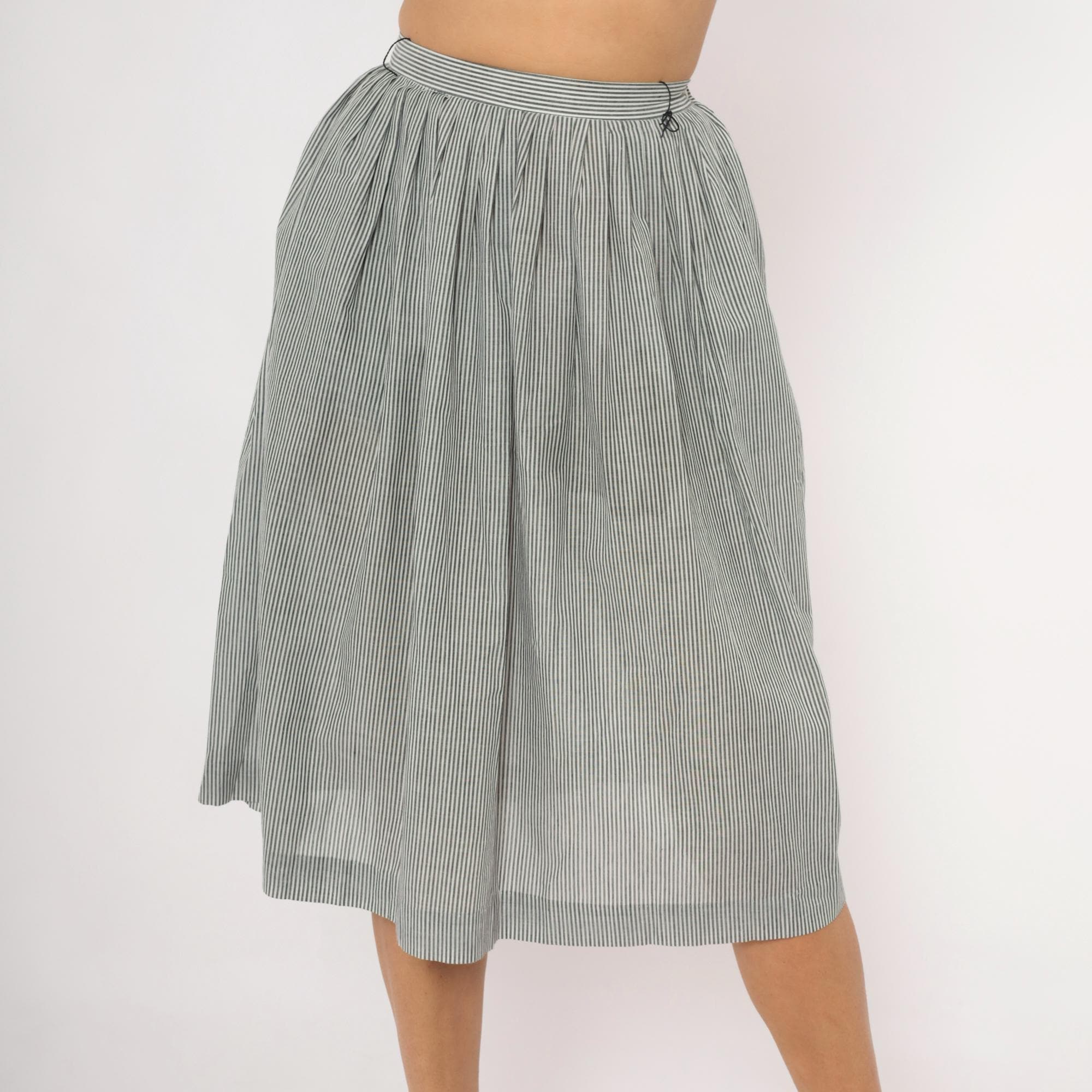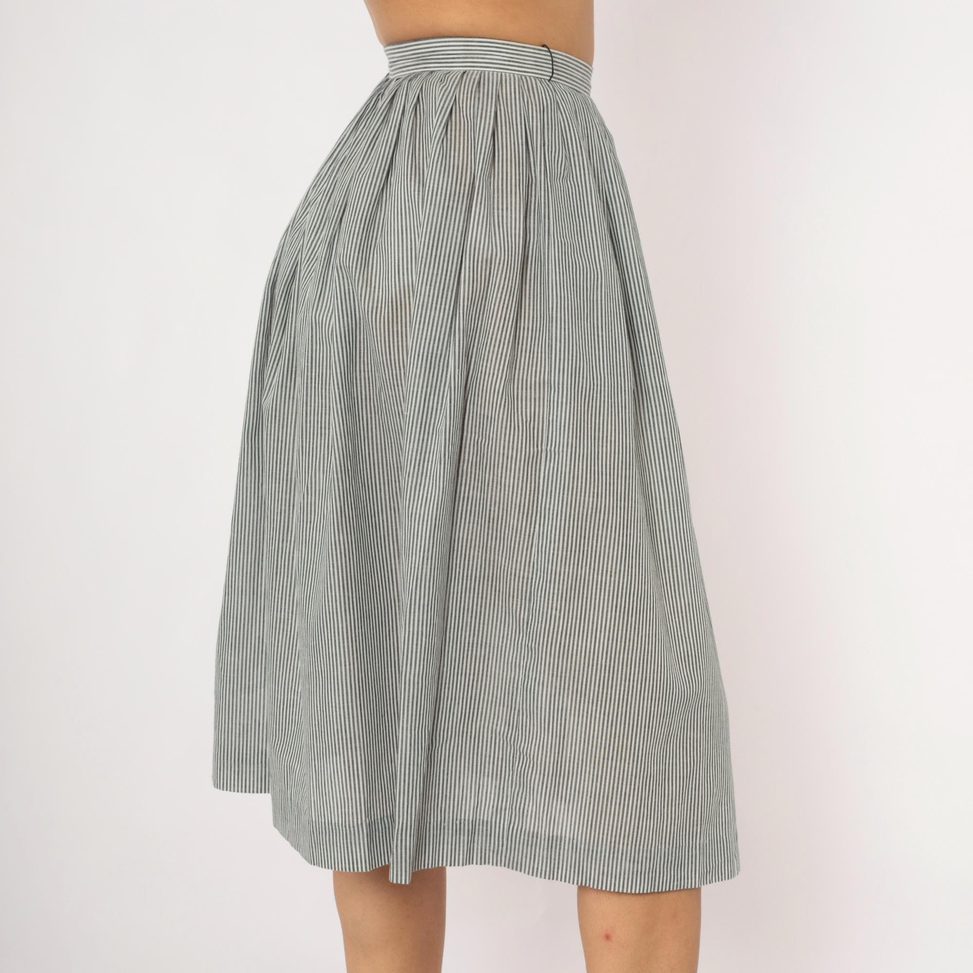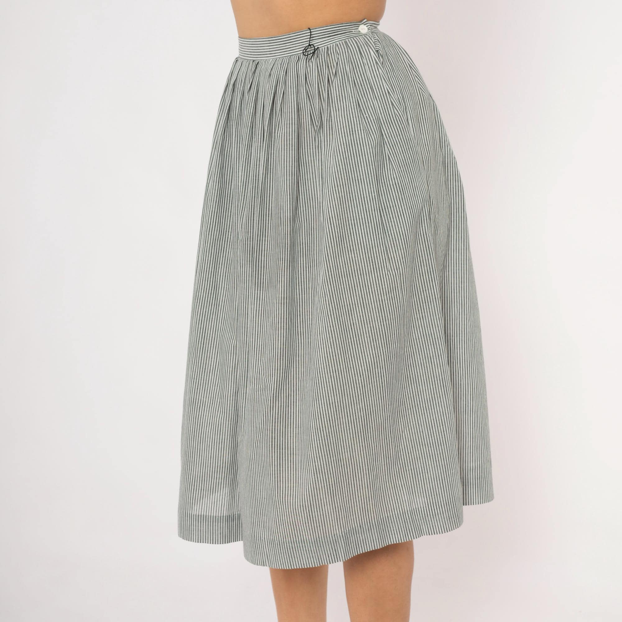 80s grey and white pinstripe gathered skirt from NR1 with a fitted waistband and full, pleated body. Side button closure at the waist with side seam pockets. Vertical narrow stripes run throughout, with the waistband cut on the horizontal grain for contrast.