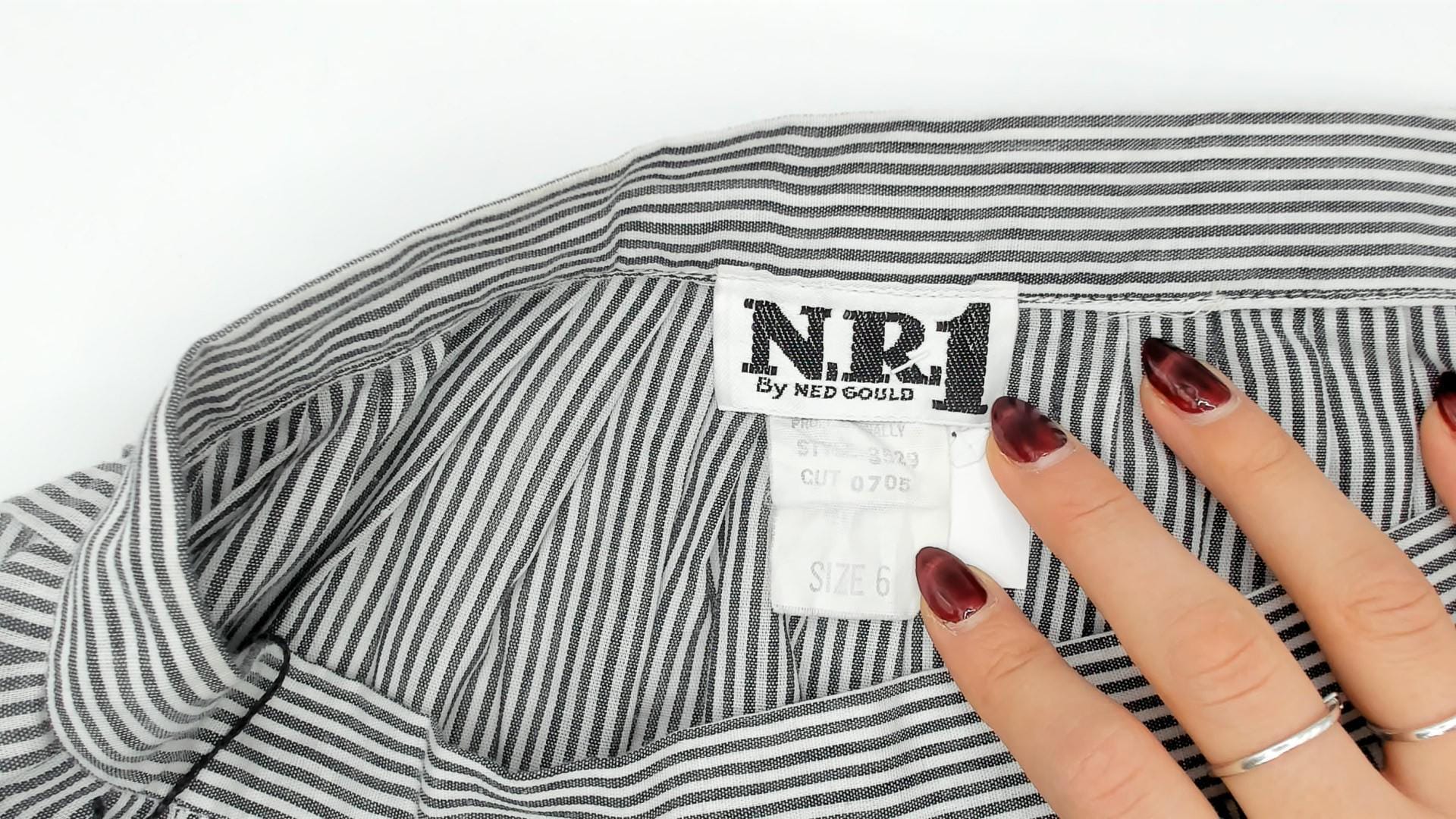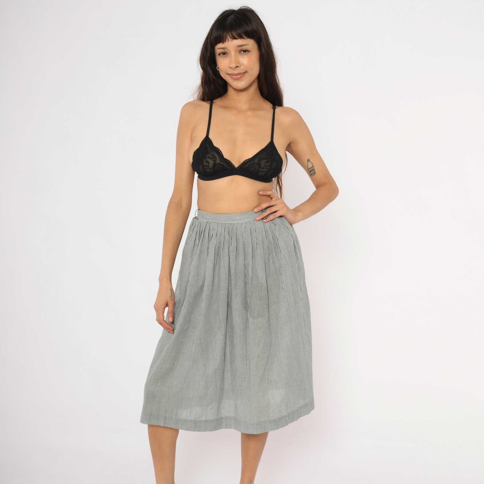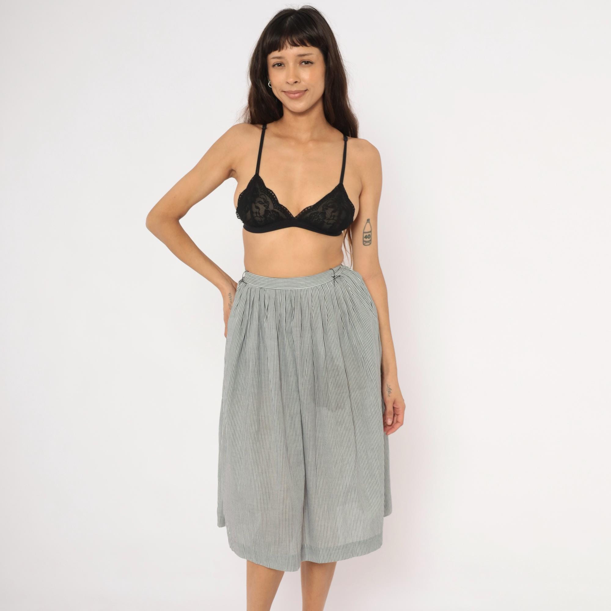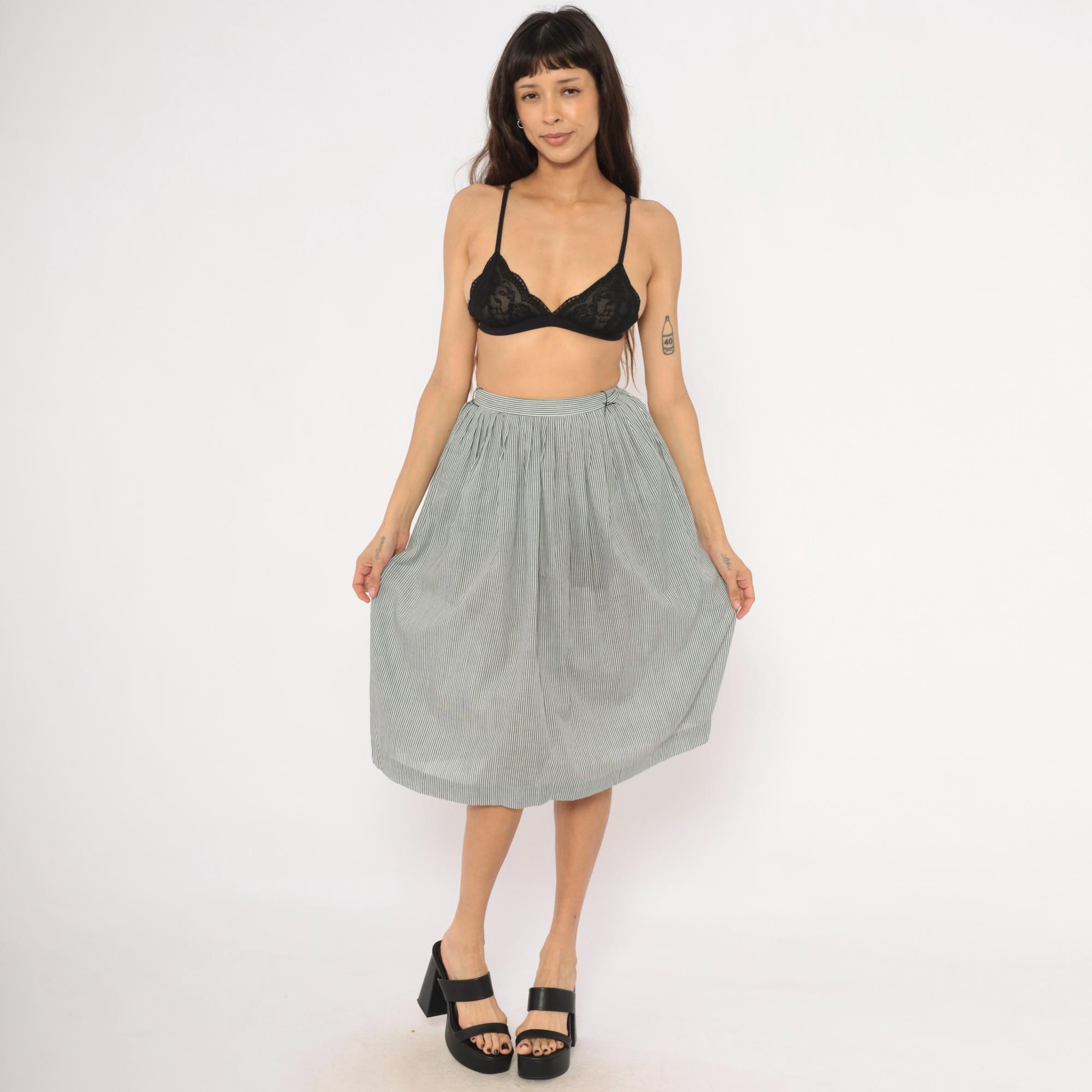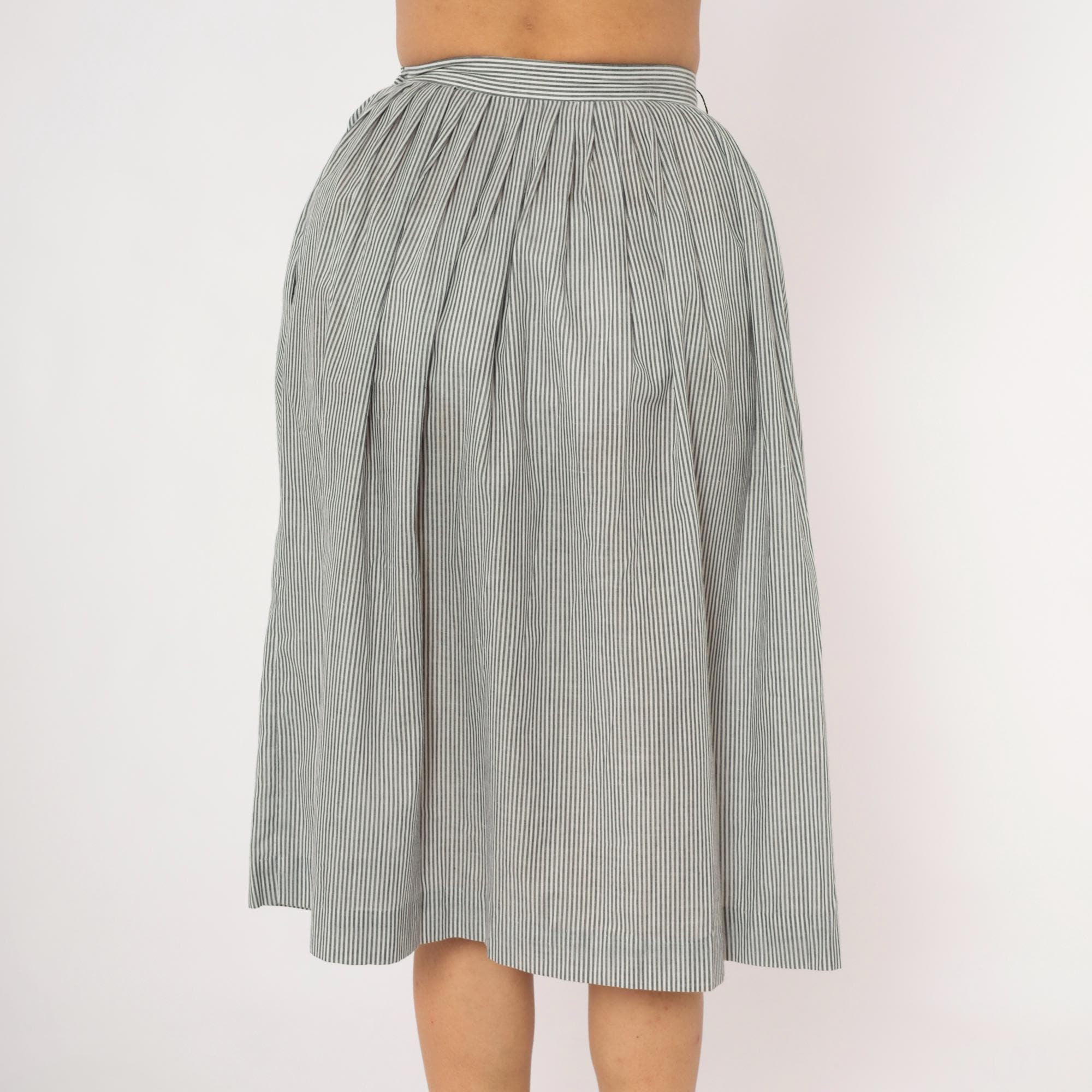 80s grey and white pinstripe gathered skirt from NR1 with a fitted waistband and full, pleated body. Side button closure at the waist with side seam pockets. Vertical narrow stripes run throughout, with the waistband cut on the horizontal grain for contrast.