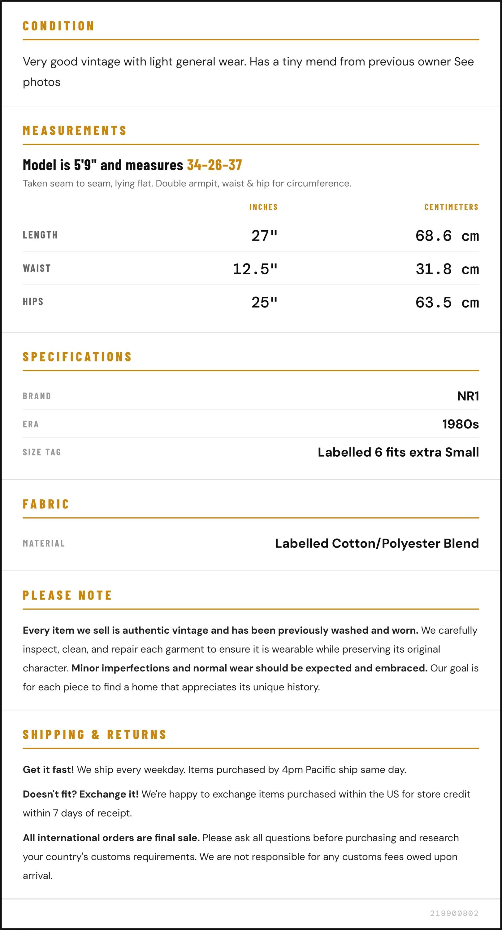 Vintage denim was usually made without any stretch, unlike modern jeans. Check the measurements to ensure proper fit, and remember to give yourself a little wiggle room in the waist and hips, depending on your preferred fit.