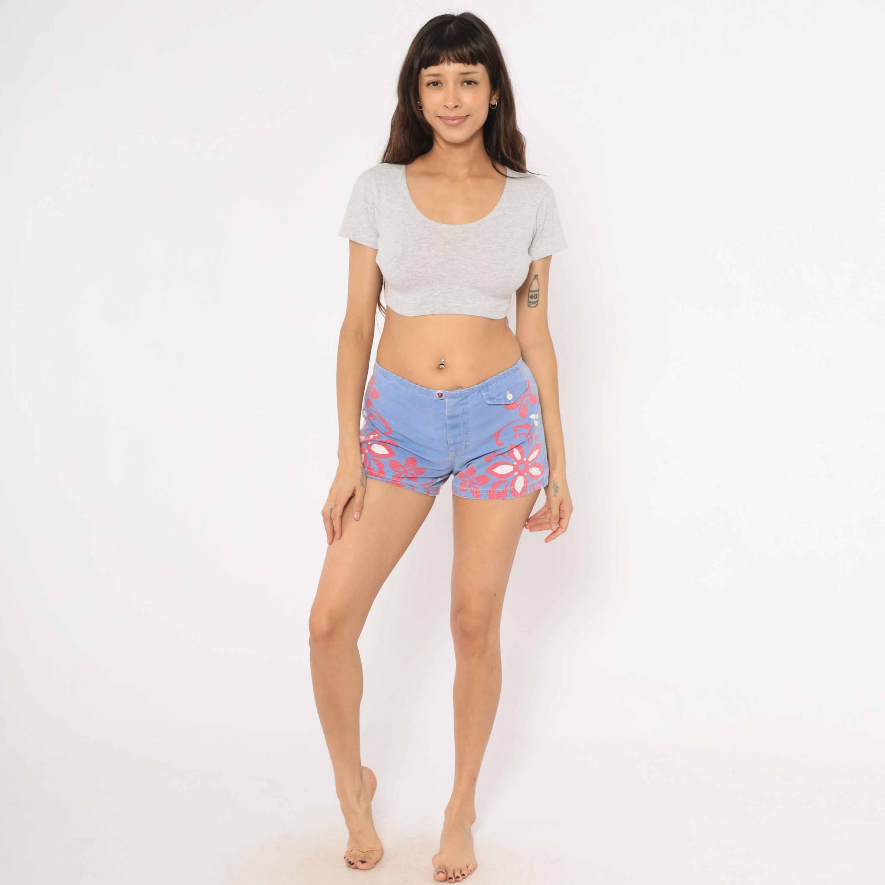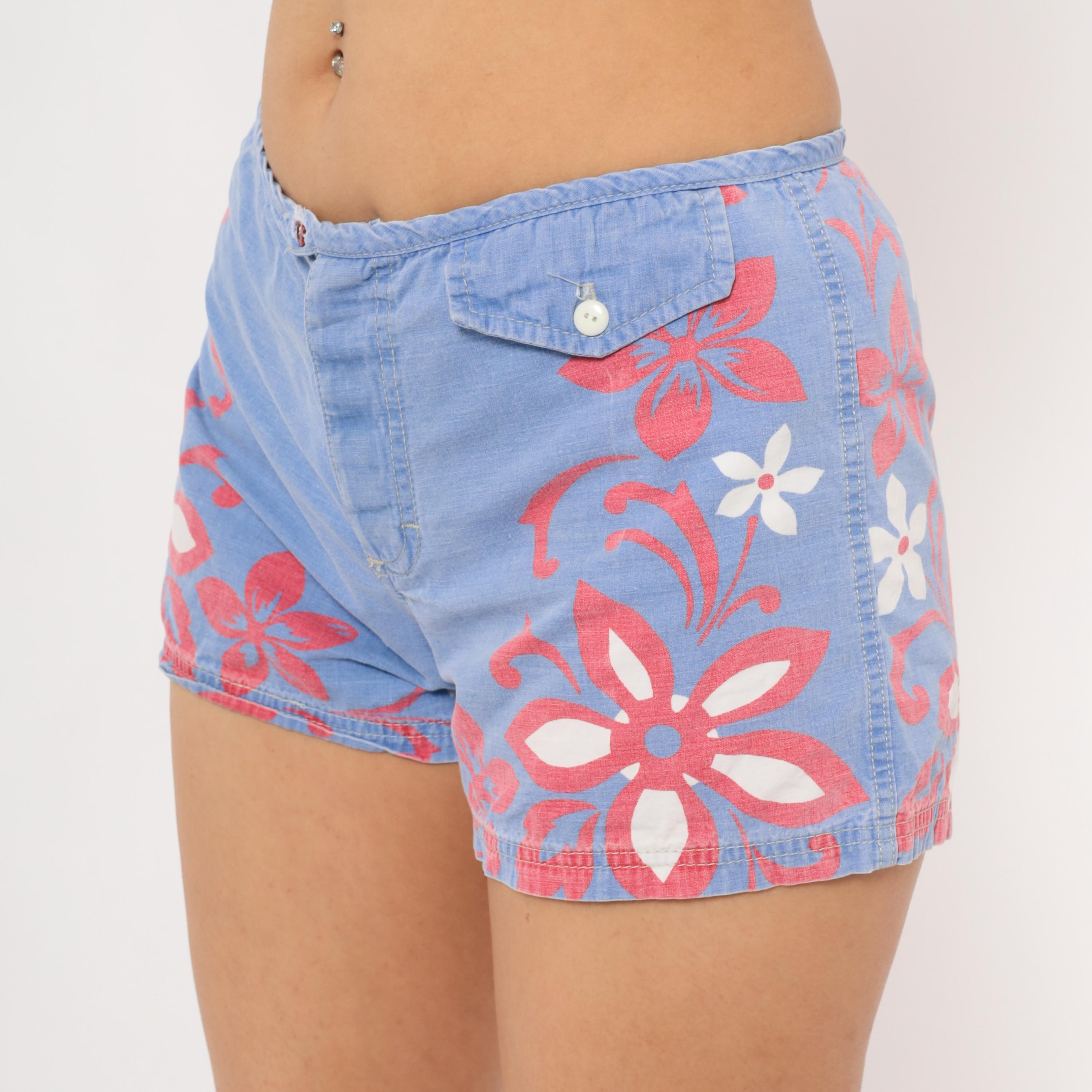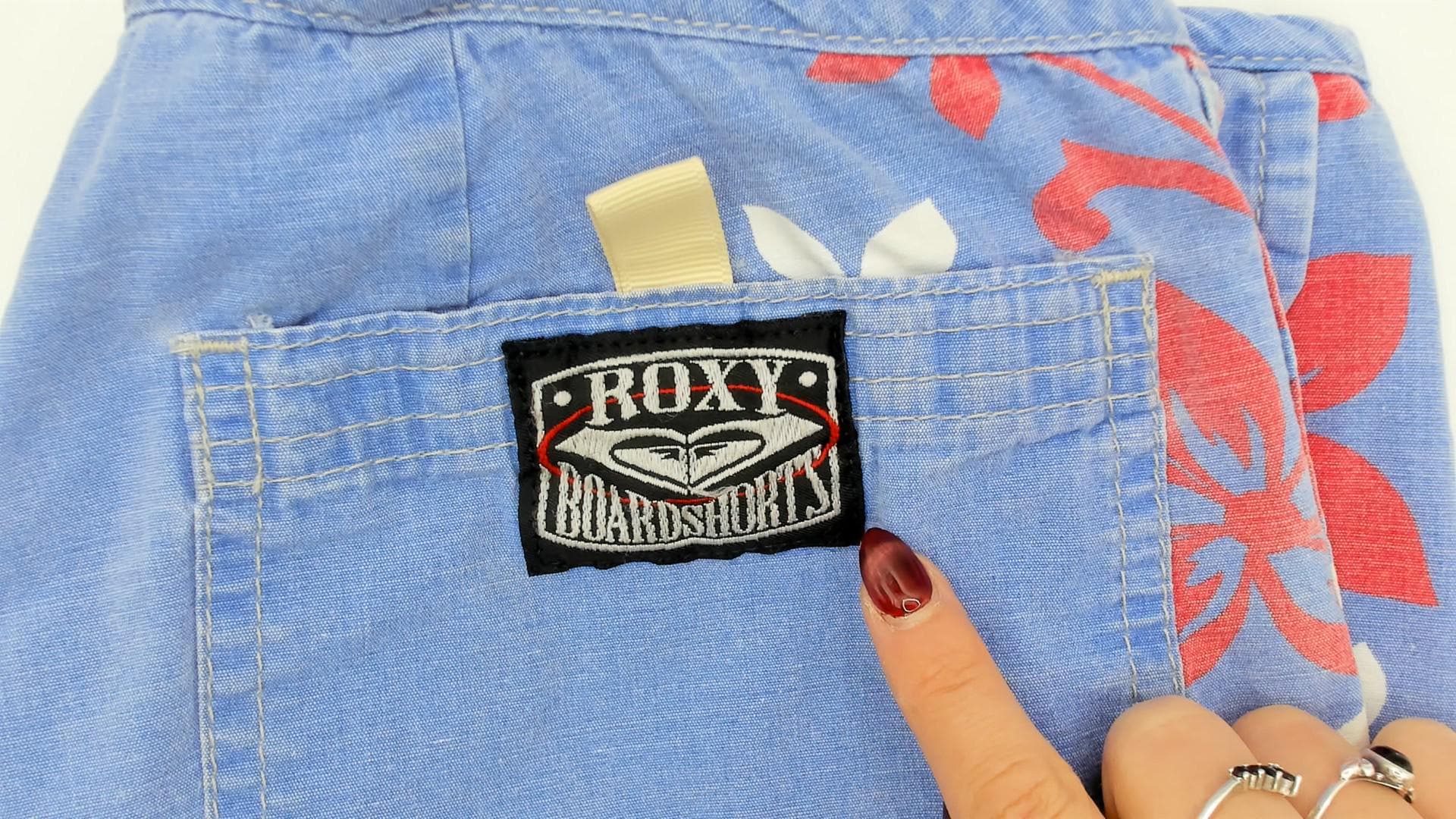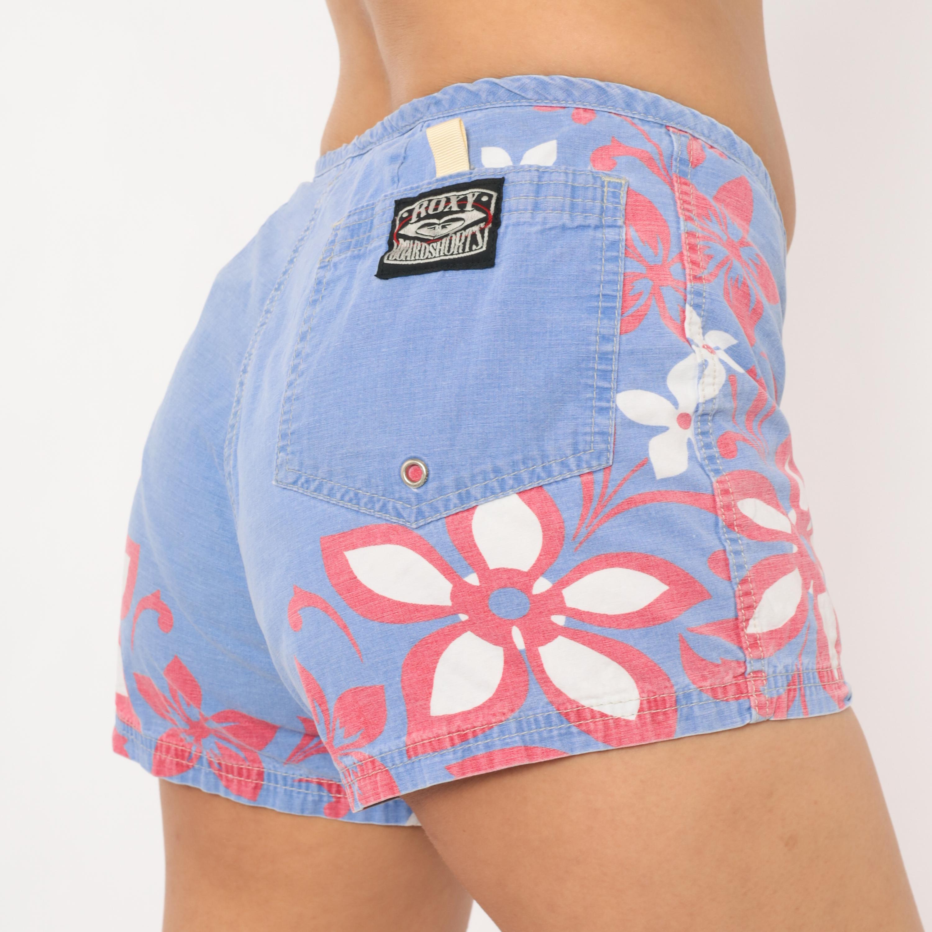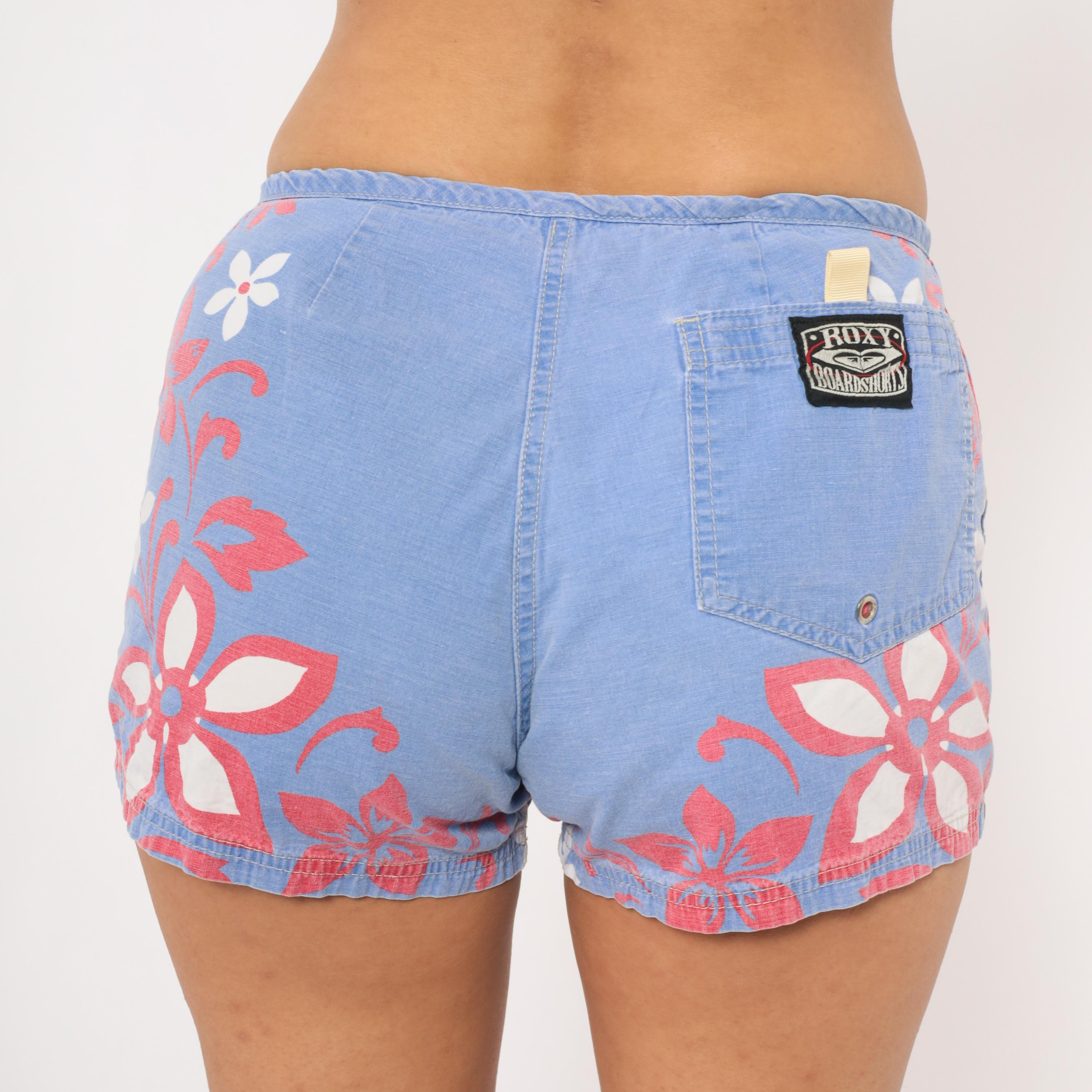 2000s Roxy boardshorts in periwinkle blue with pink and white hibiscus floral print across both legs and back. Button front closure with a small flap pocket on the front right and a patch pocket on the back with the Roxy Boardshorts logo patch.